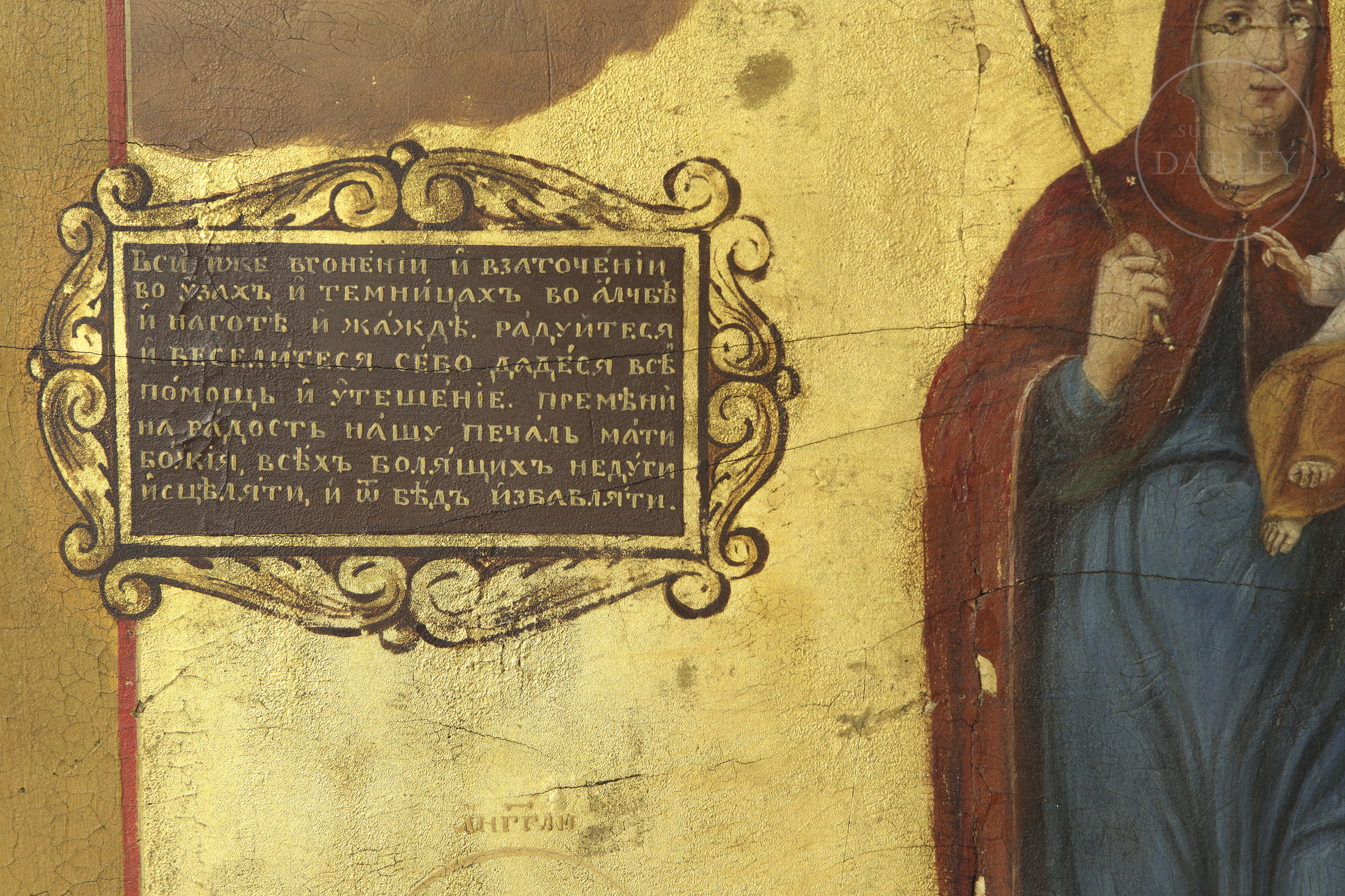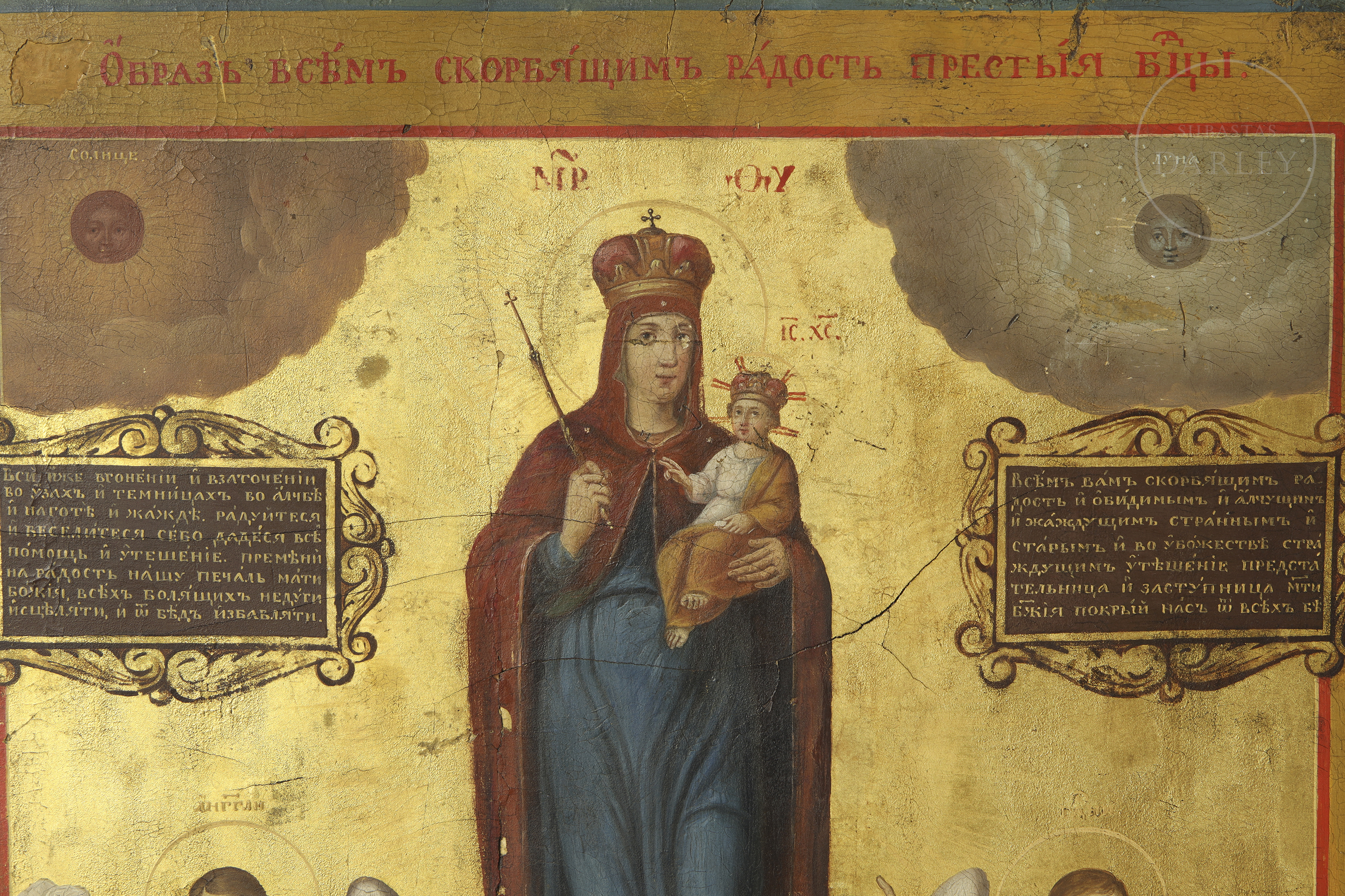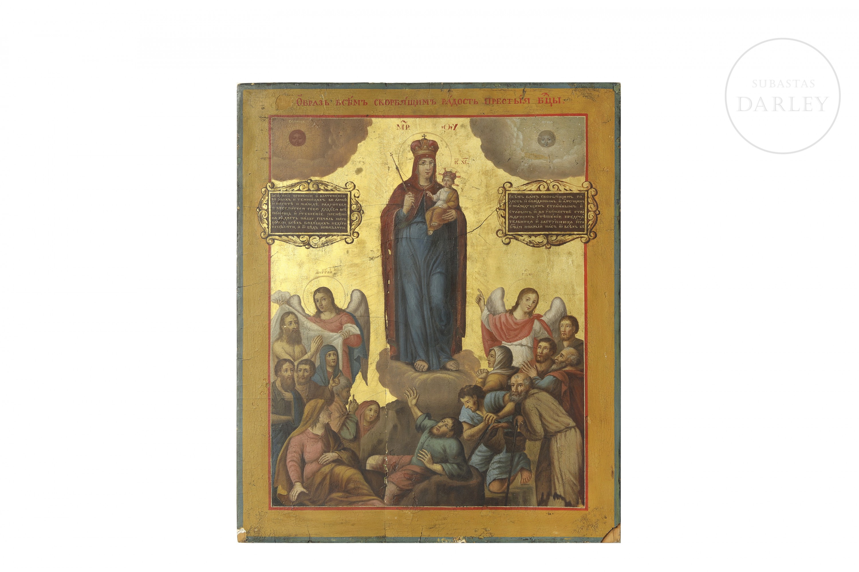 Vertical icon painted in tempera on wood with a gold leaf background. The piece follows the Orthodox iconography of Our Lady of All Who Sorrow. The Virgin is depicted in the center, wearing an ultramarine blue tunic. She holds the infant Jesus, who wears a crown. The Virgin wears a golden imperial crown and a slender scepter. The upper part contains the inscription “Образь всѣхъ скорбящимъ радость престыя бцы.”
