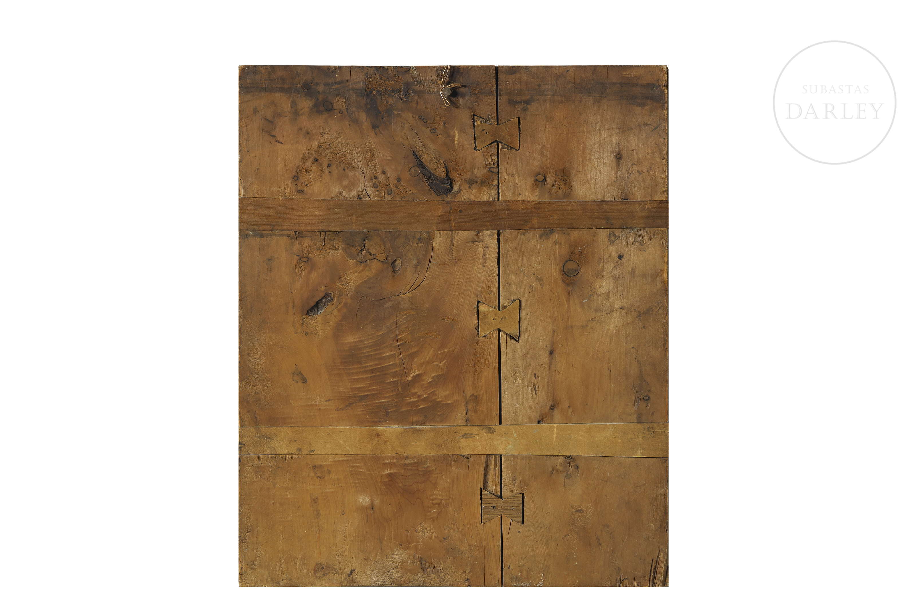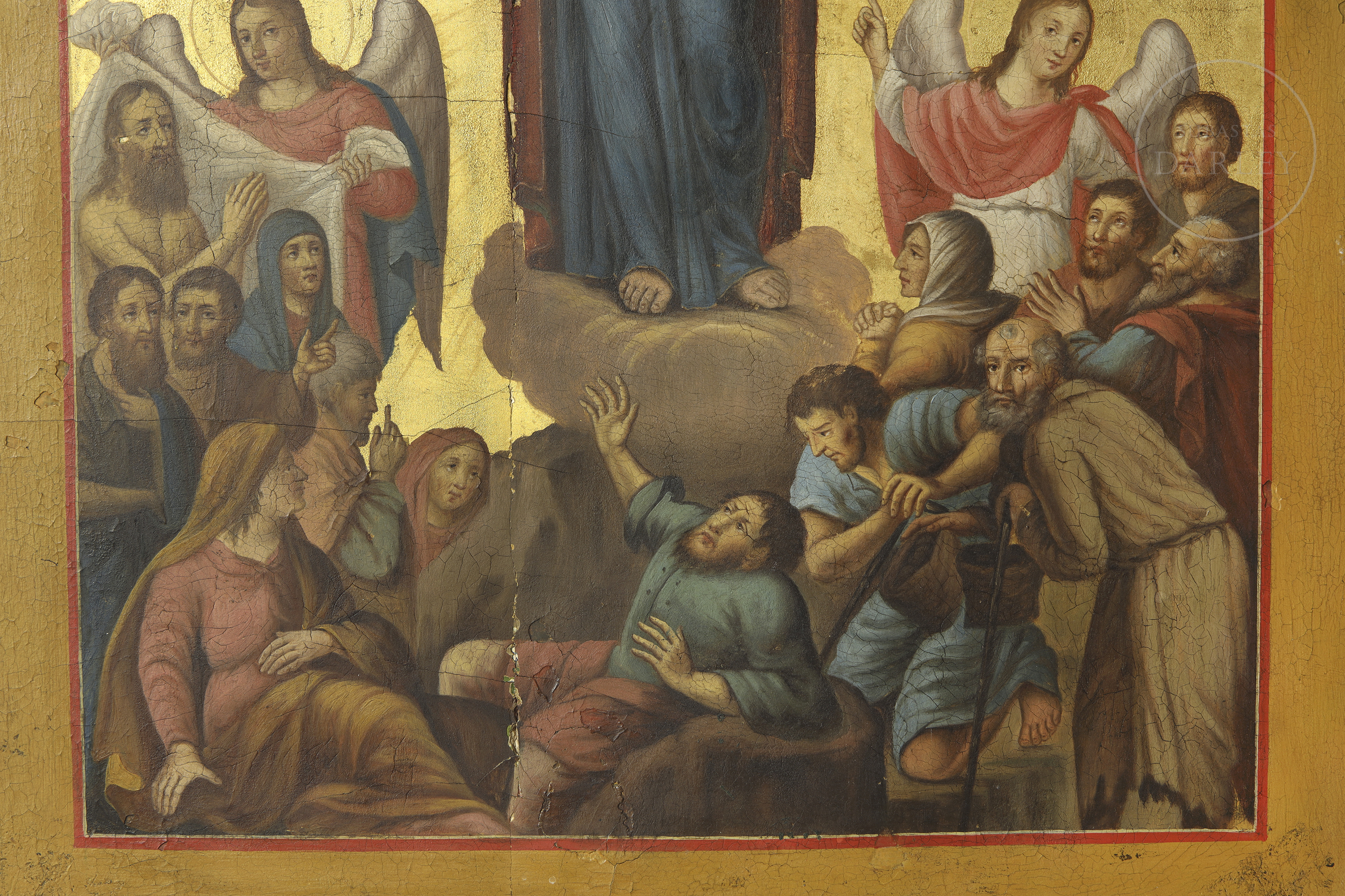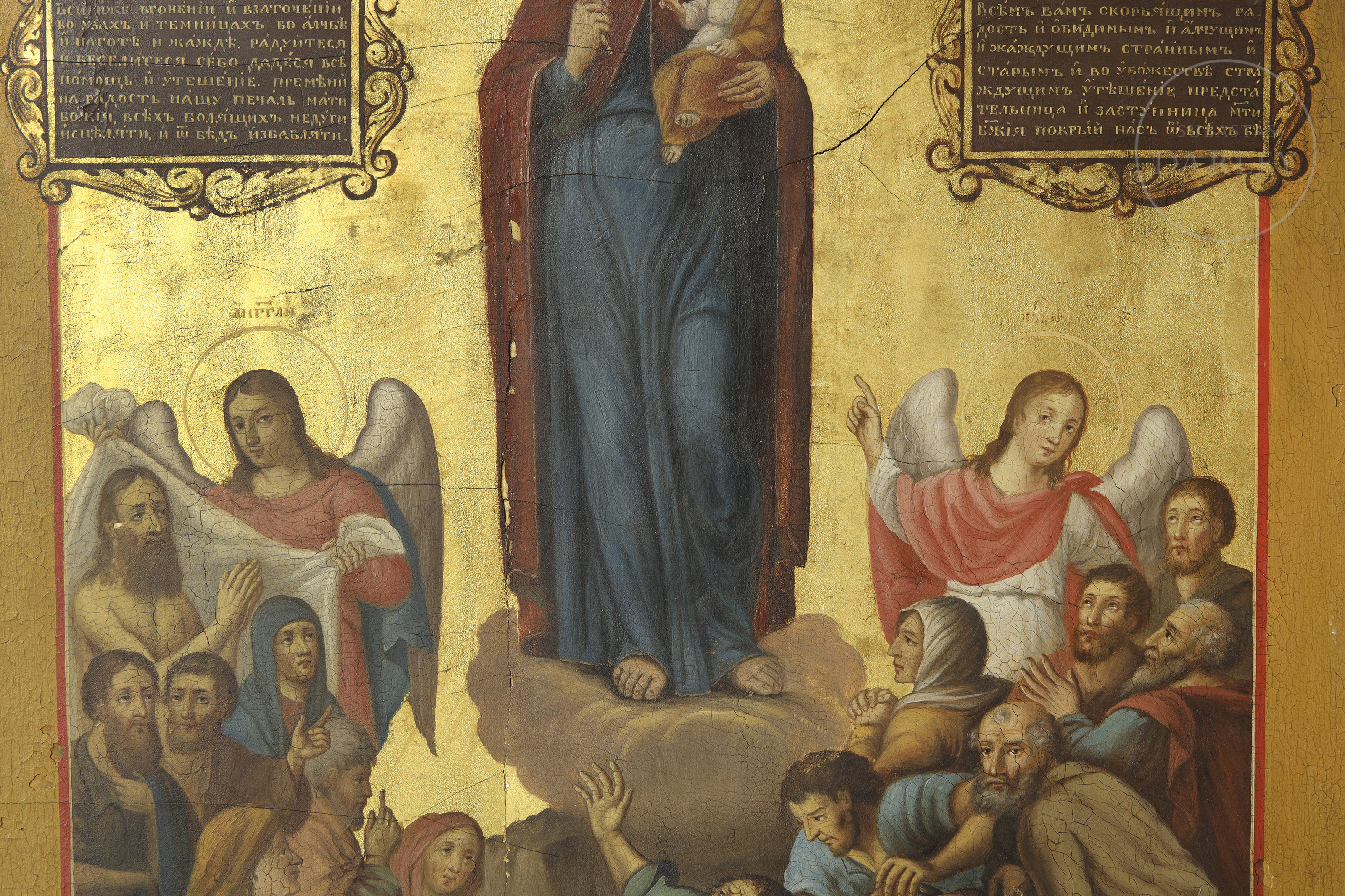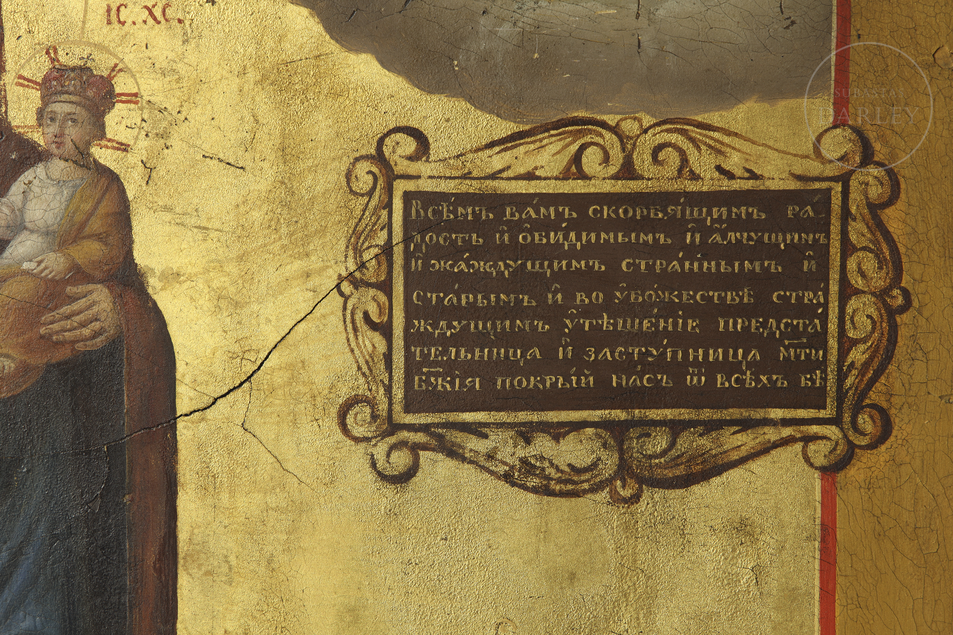 Vertical icon painted in tempera on wood with a gold leaf background. The piece follows the Orthodox iconography of Our Lady of All Who Sorrow. The Virgin is depicted in the center, wearing an ultramarine blue tunic. She holds the infant Jesus, who wears a crown. The Virgin wears a golden imperial crown and a slender scepter. The upper part contains the inscription “Образь всѣхъ скорбящимъ радость престыя бцы.”