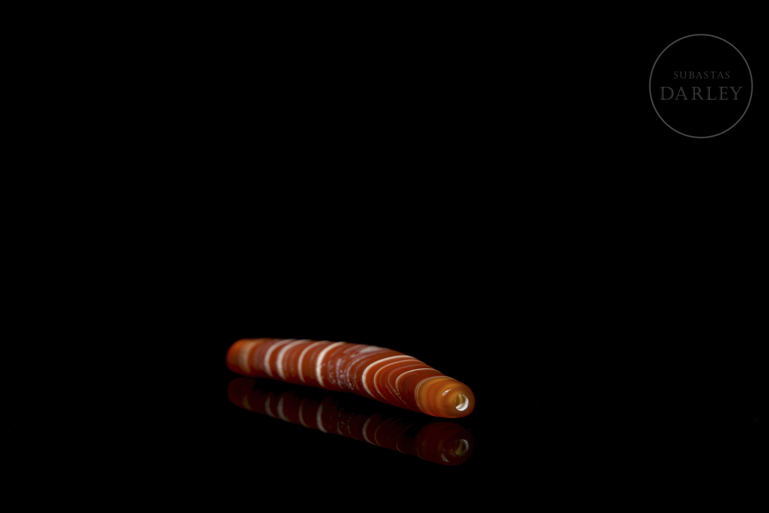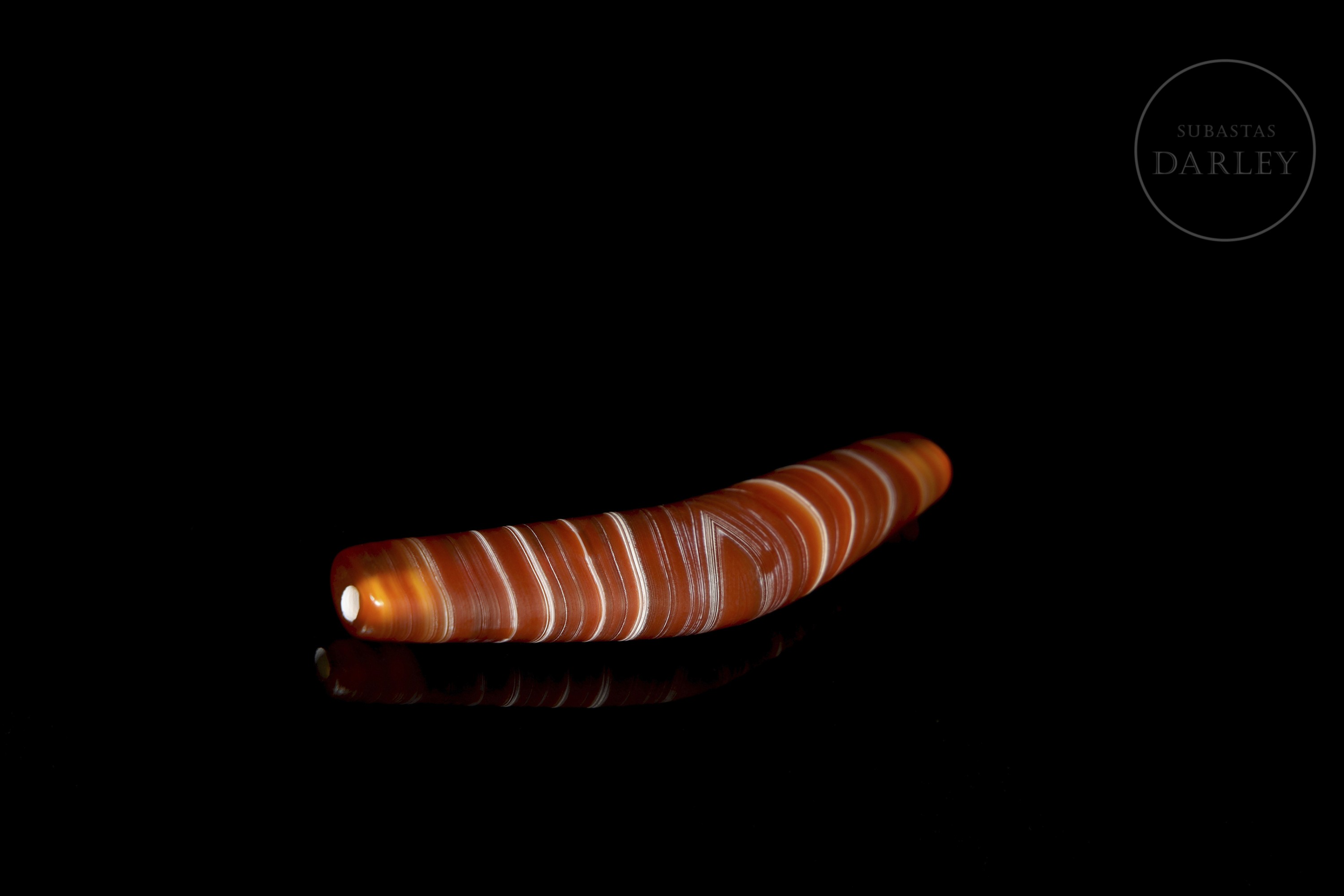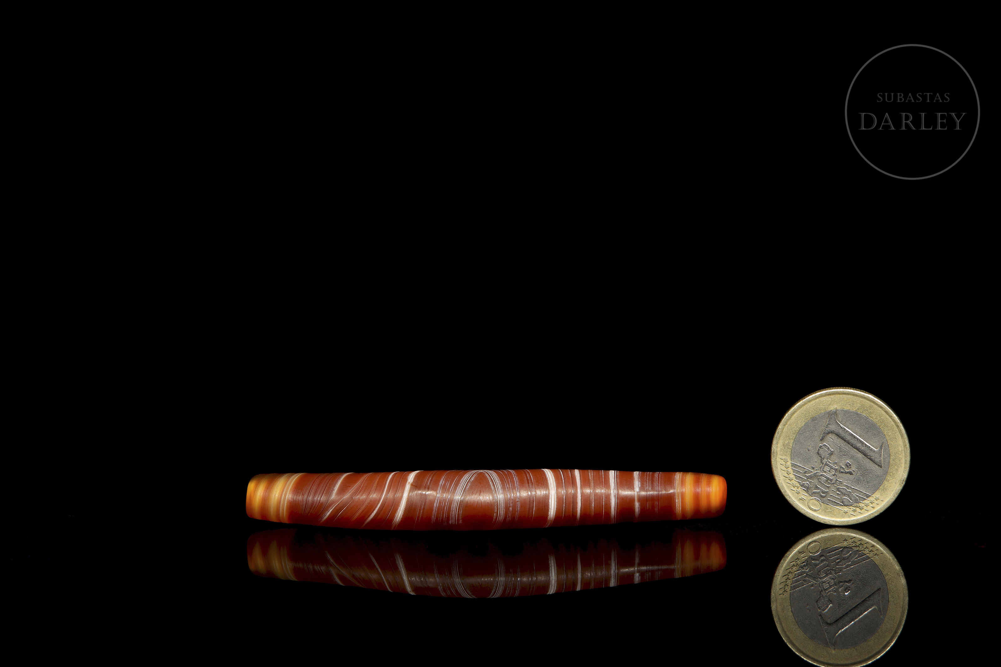 Agate bead with an unusually long tubular shape and flattened profile. Multiple concentric rings of white and grey can be seen on the reddish background, joining together in the centre. The surface shows a rich patina of ageing and signs of wear from continuous use. Tang Dynasty (618-907 AD).