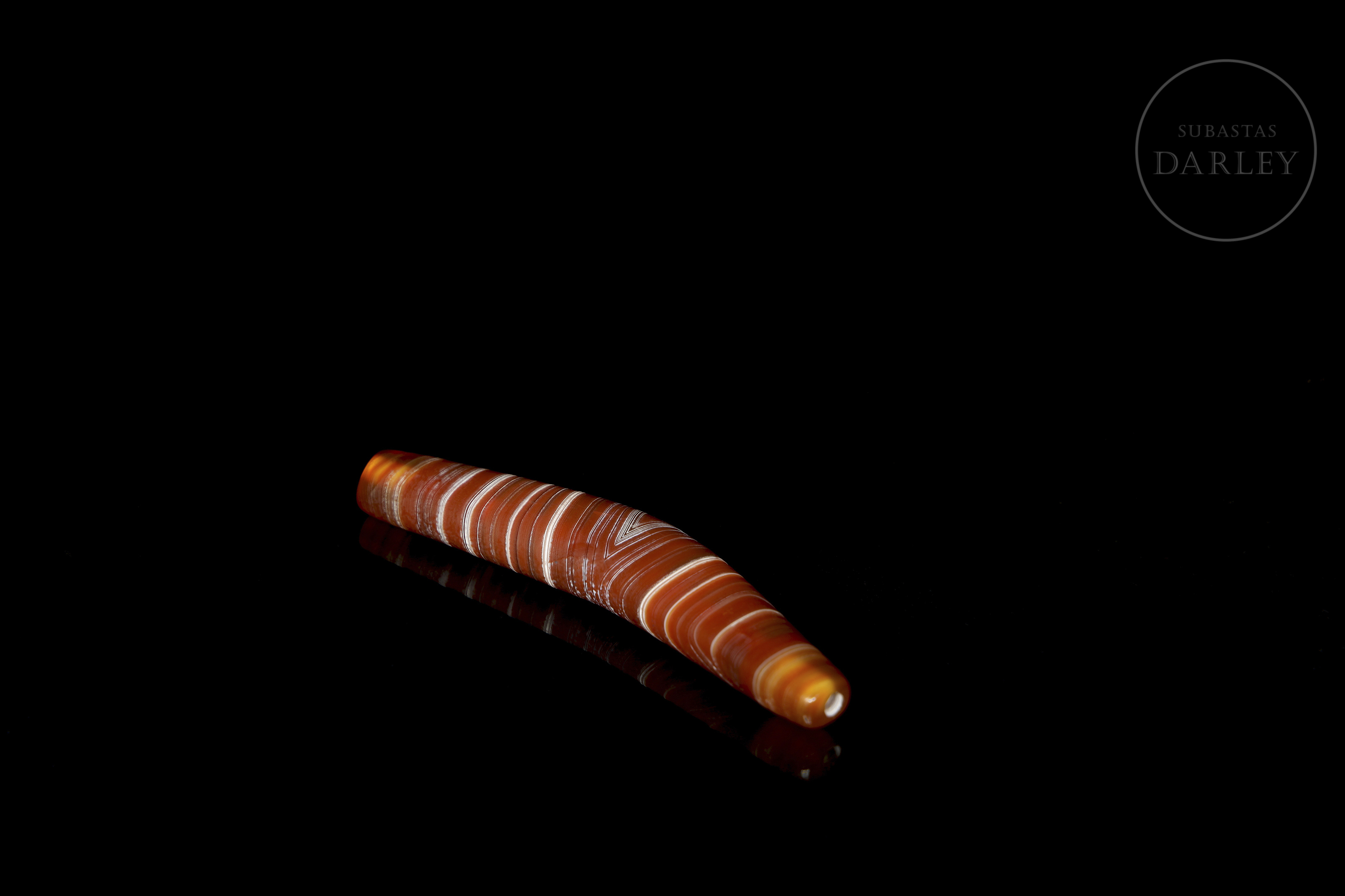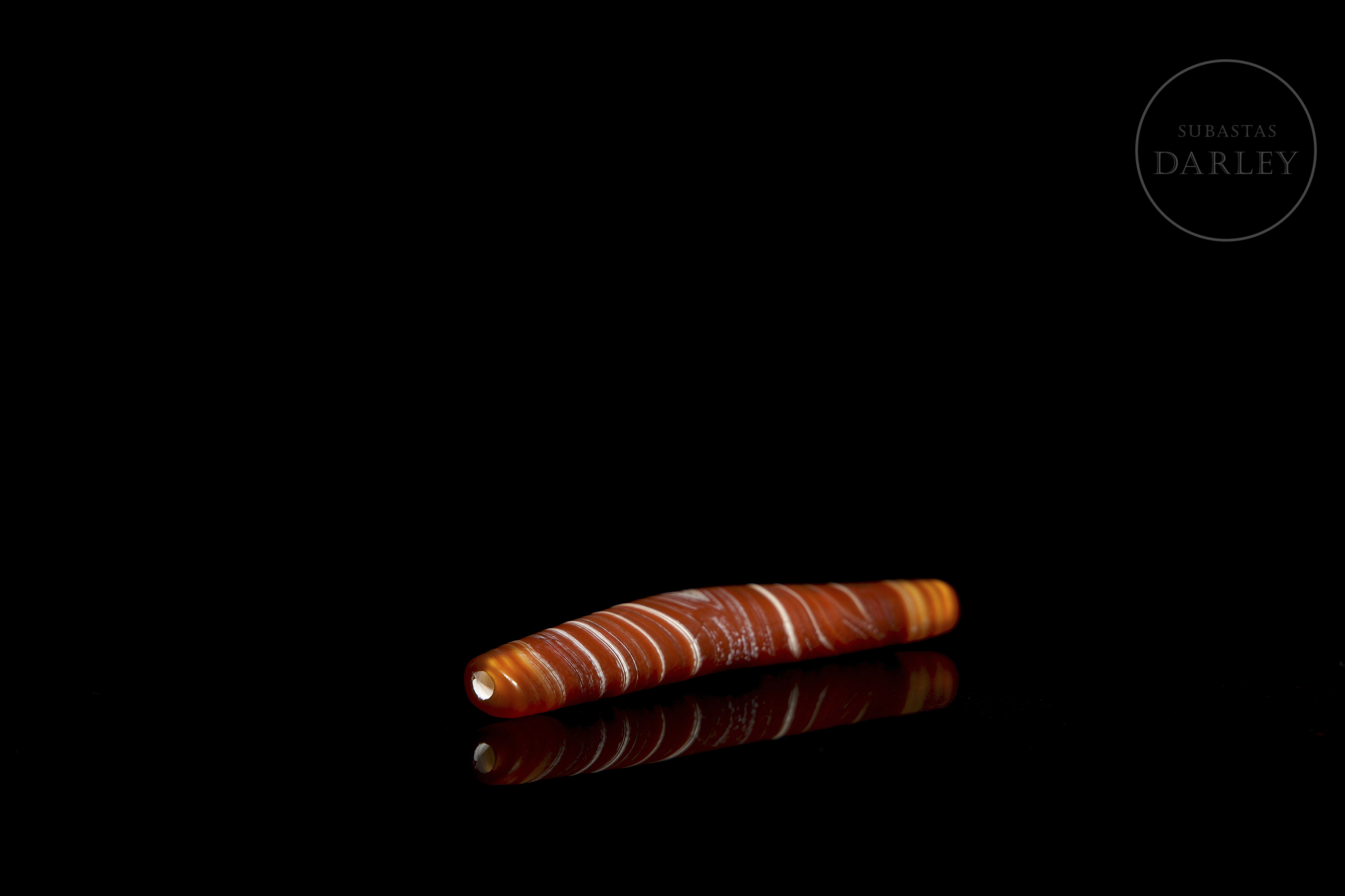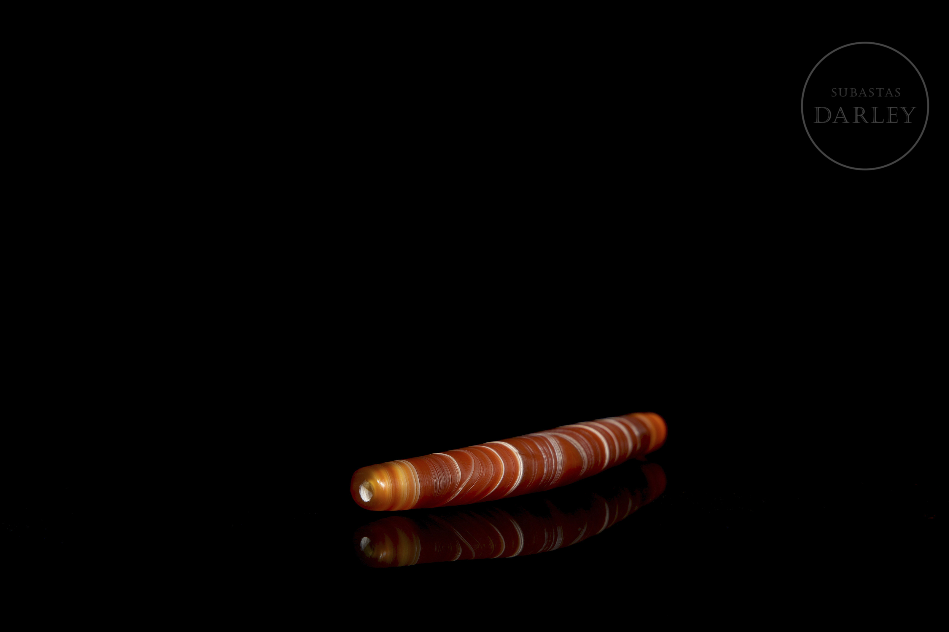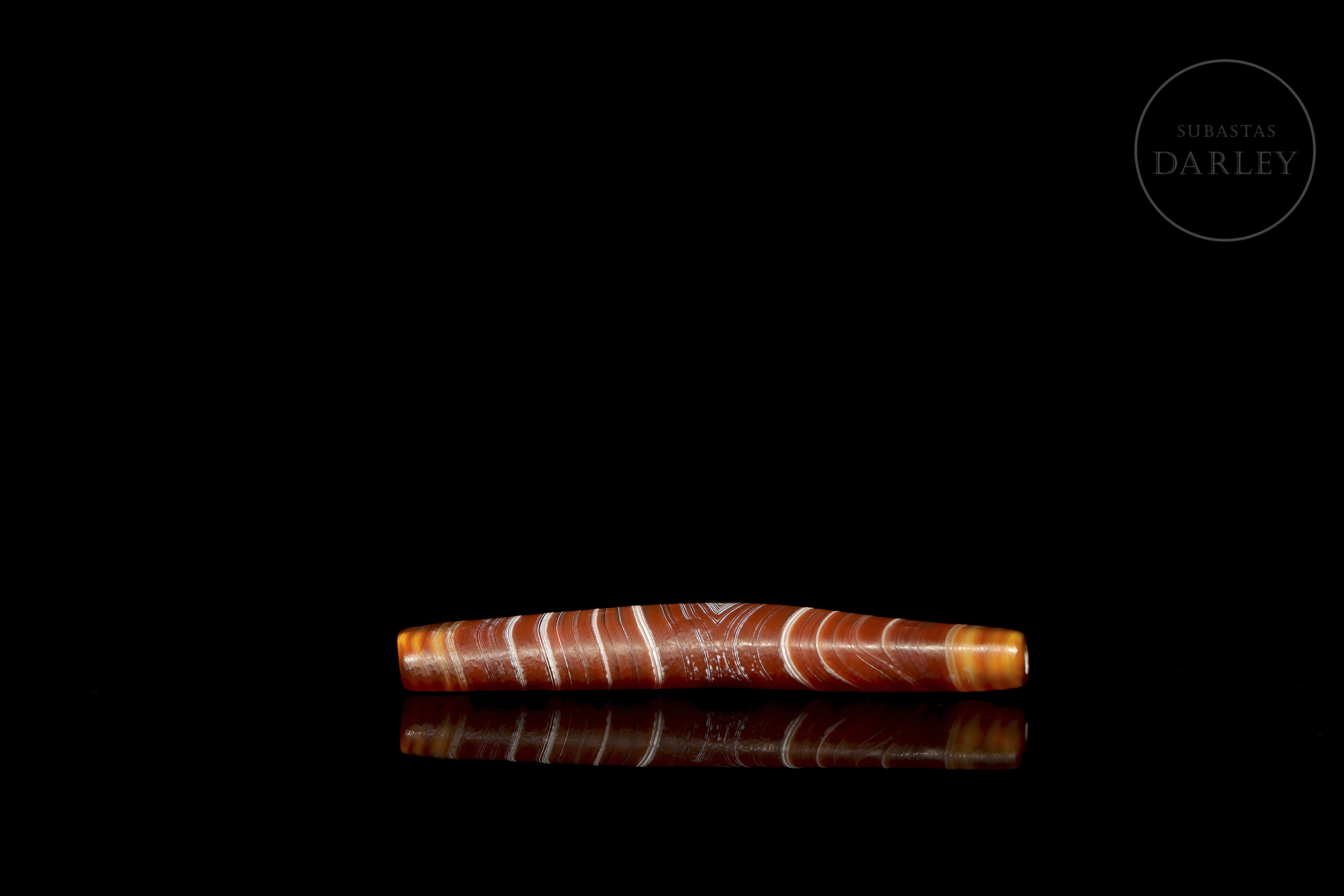Agate bead with an unusually long tubular shape and flattened profile. Multiple concentric rings of white and grey can be seen on the reddish background, joining together in the centre. The surface shows a rich patina of ageing and signs of wear from continuous use. Tang Dynasty (618-907 AD).
