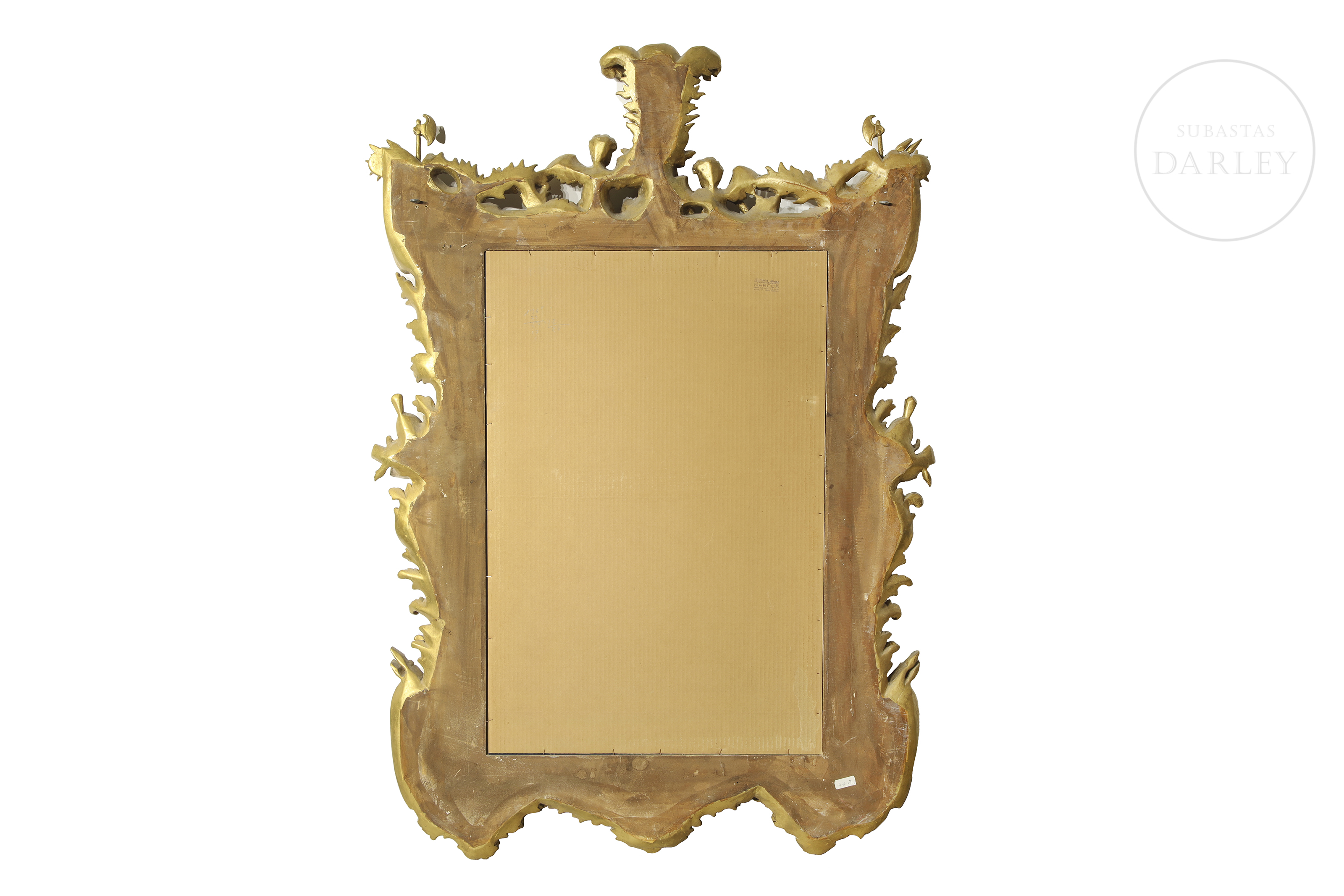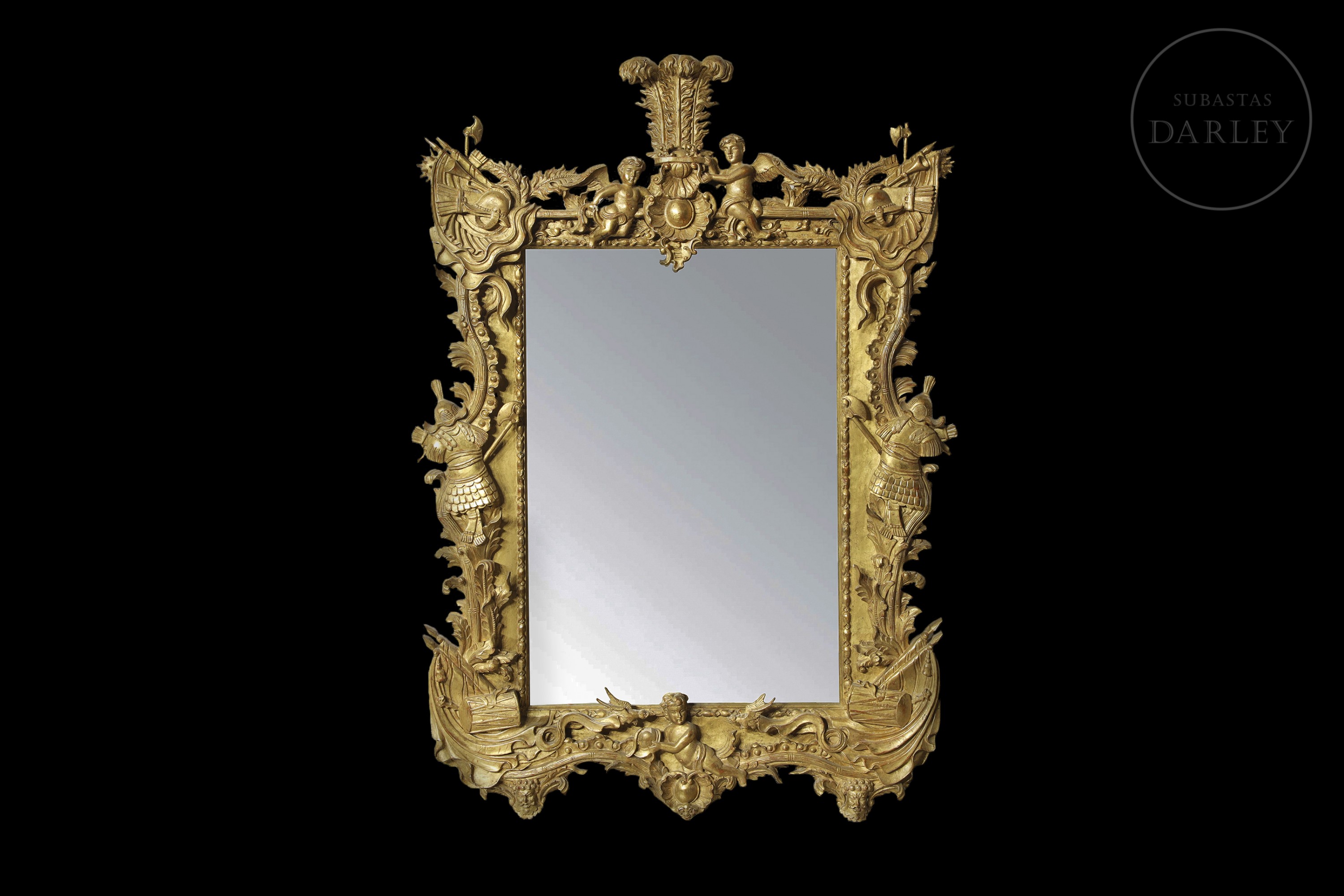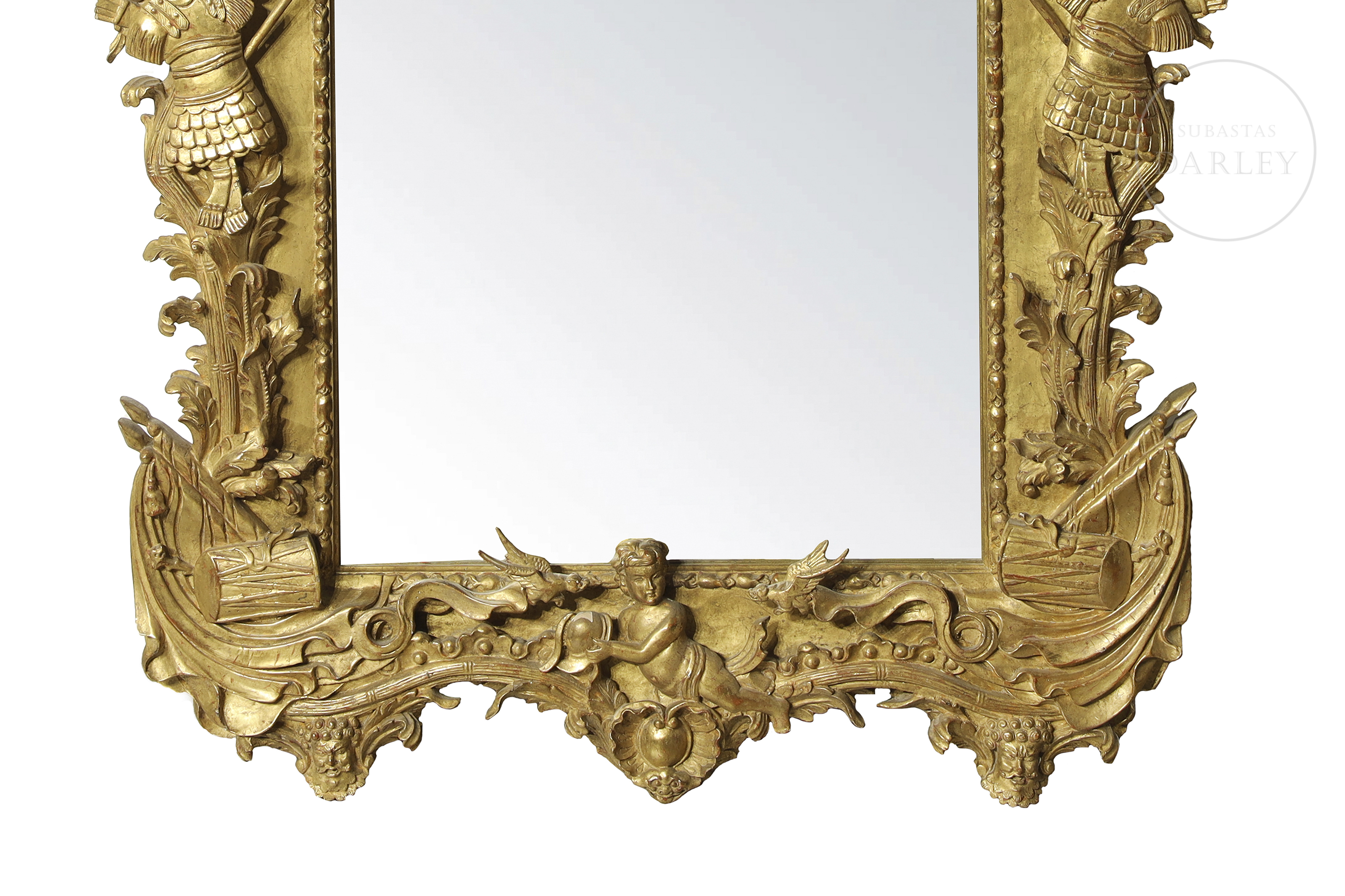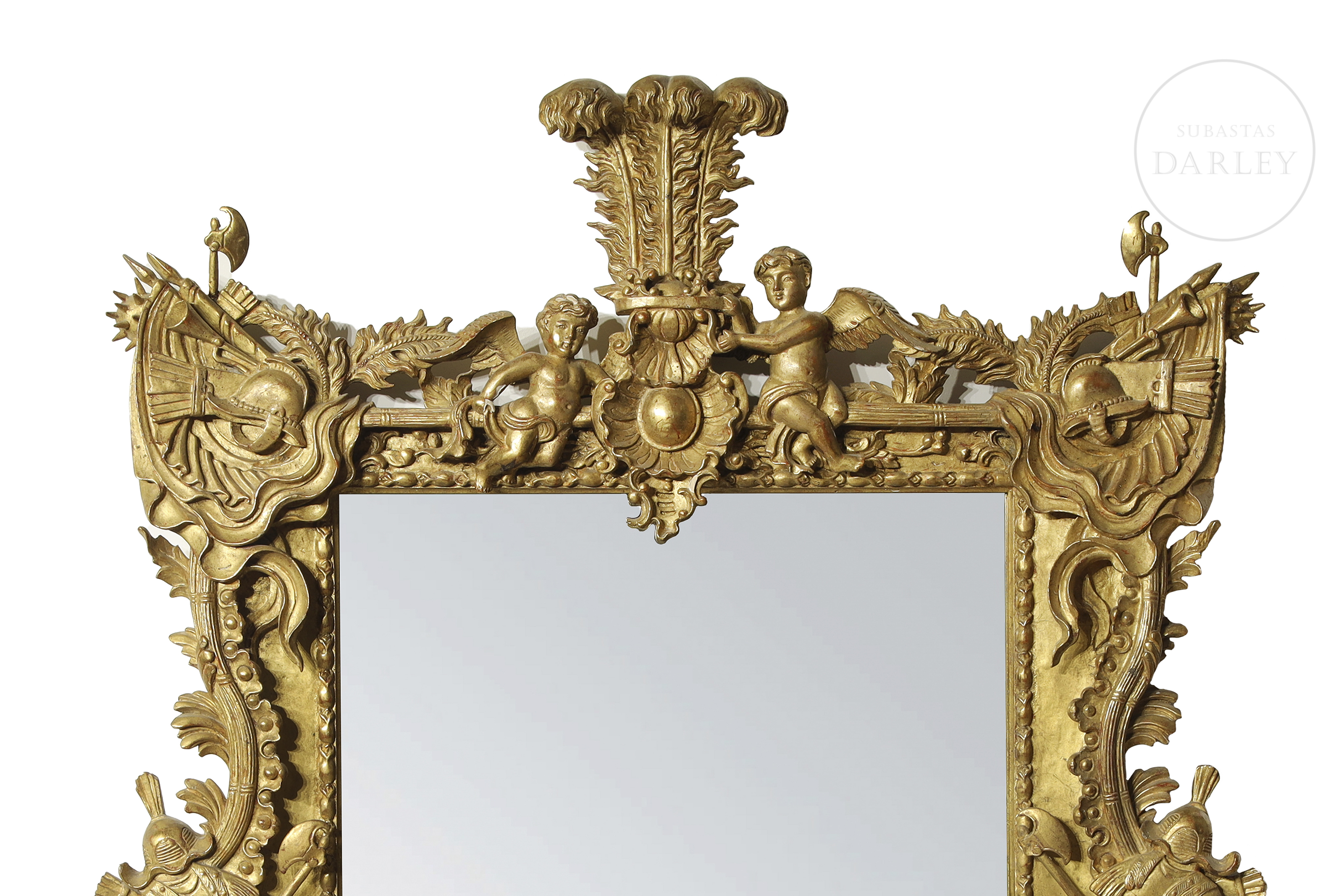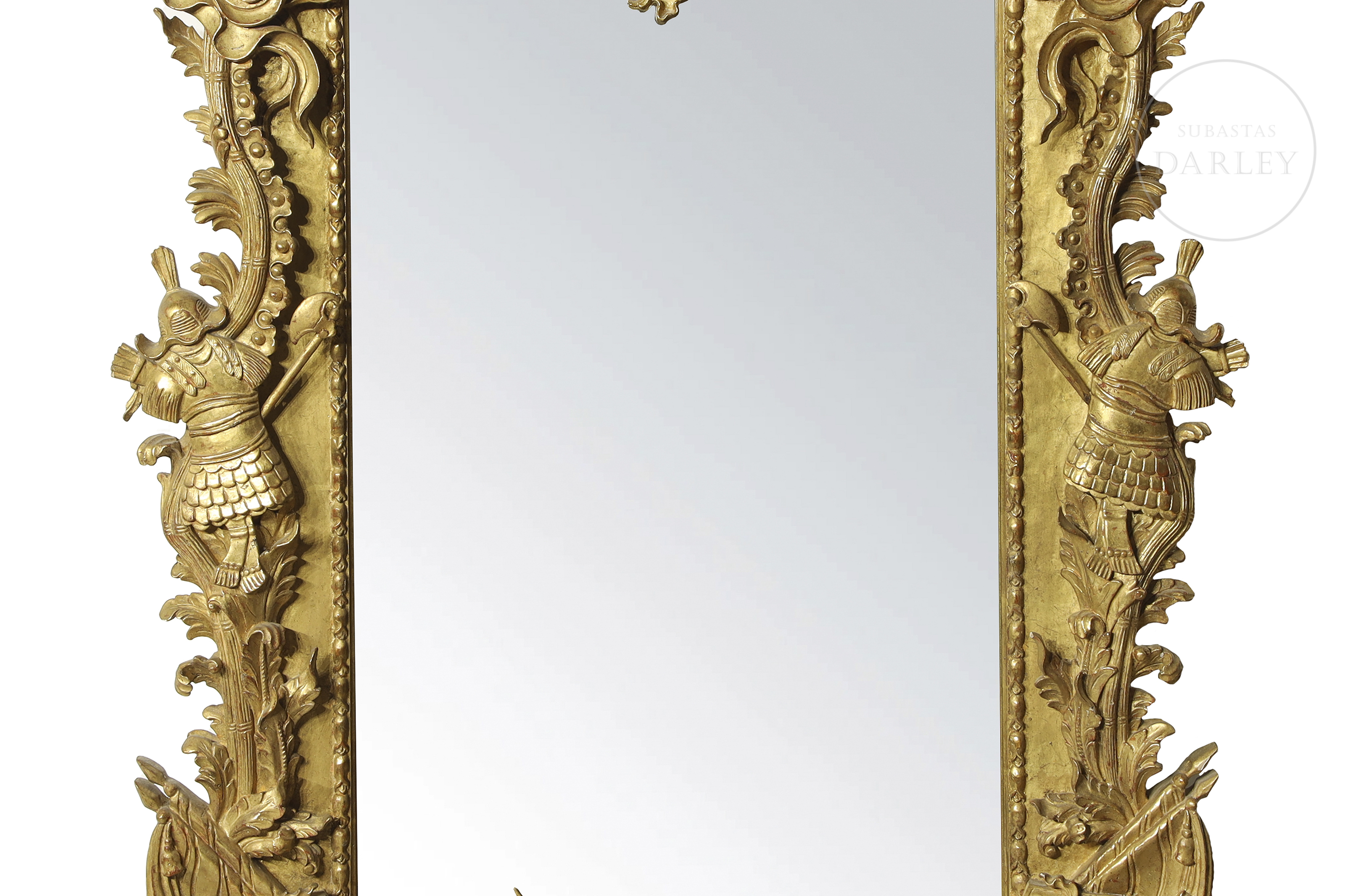 Carved and gilded wood. The upper crest is crowned by a feather flanked by two putti alongside weapons and shields. The sides of the frame are flanked by figures of warriors, cherubs and multiple plant elements intertwined with military ornaments.