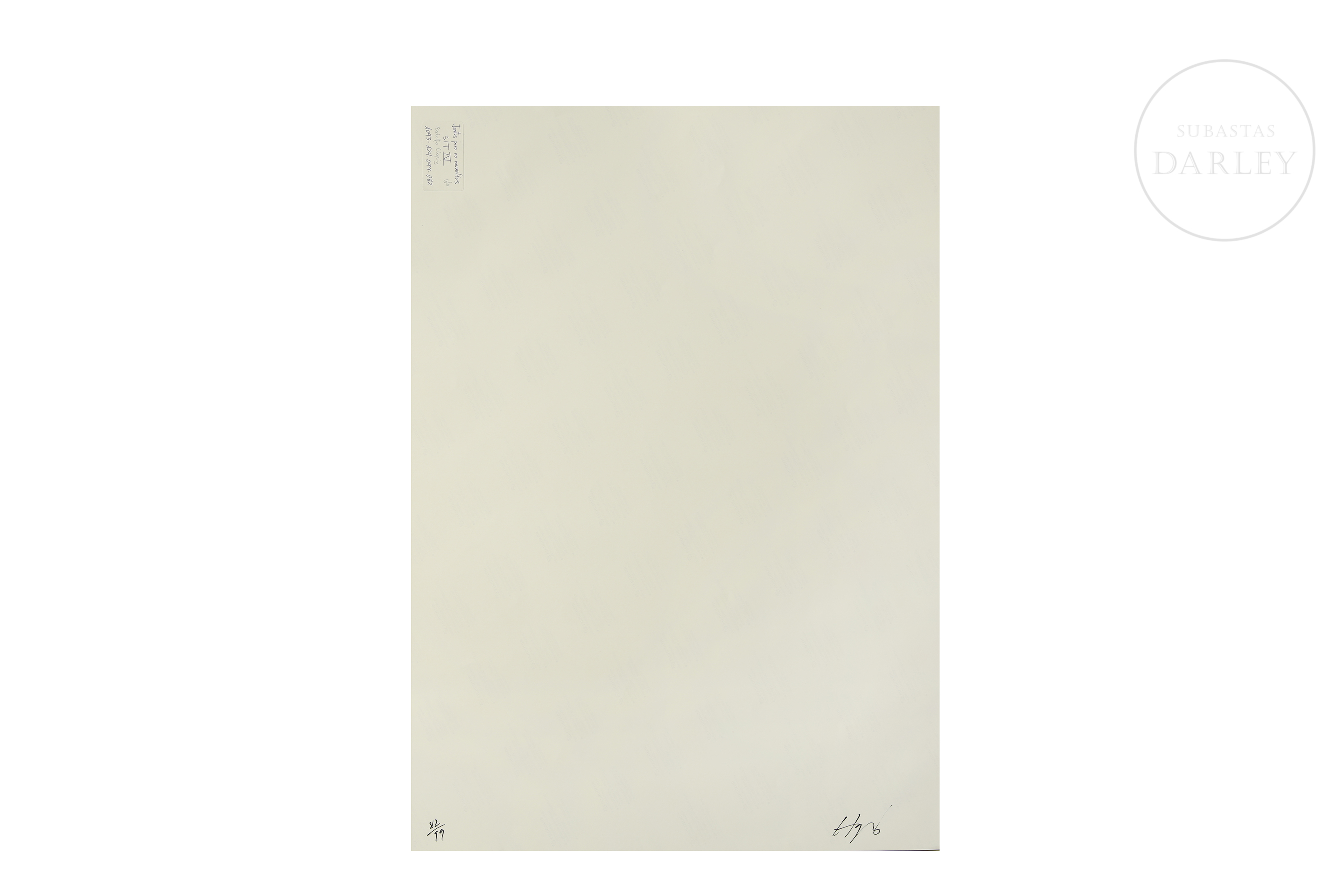 Print on photographic paper. Image developed from a photograph combining text and image in contrasting elements. Signed on the reverse in the lower right-hand corner and numbered on the reverse ‘82/99’ in the lower left-hand corner.