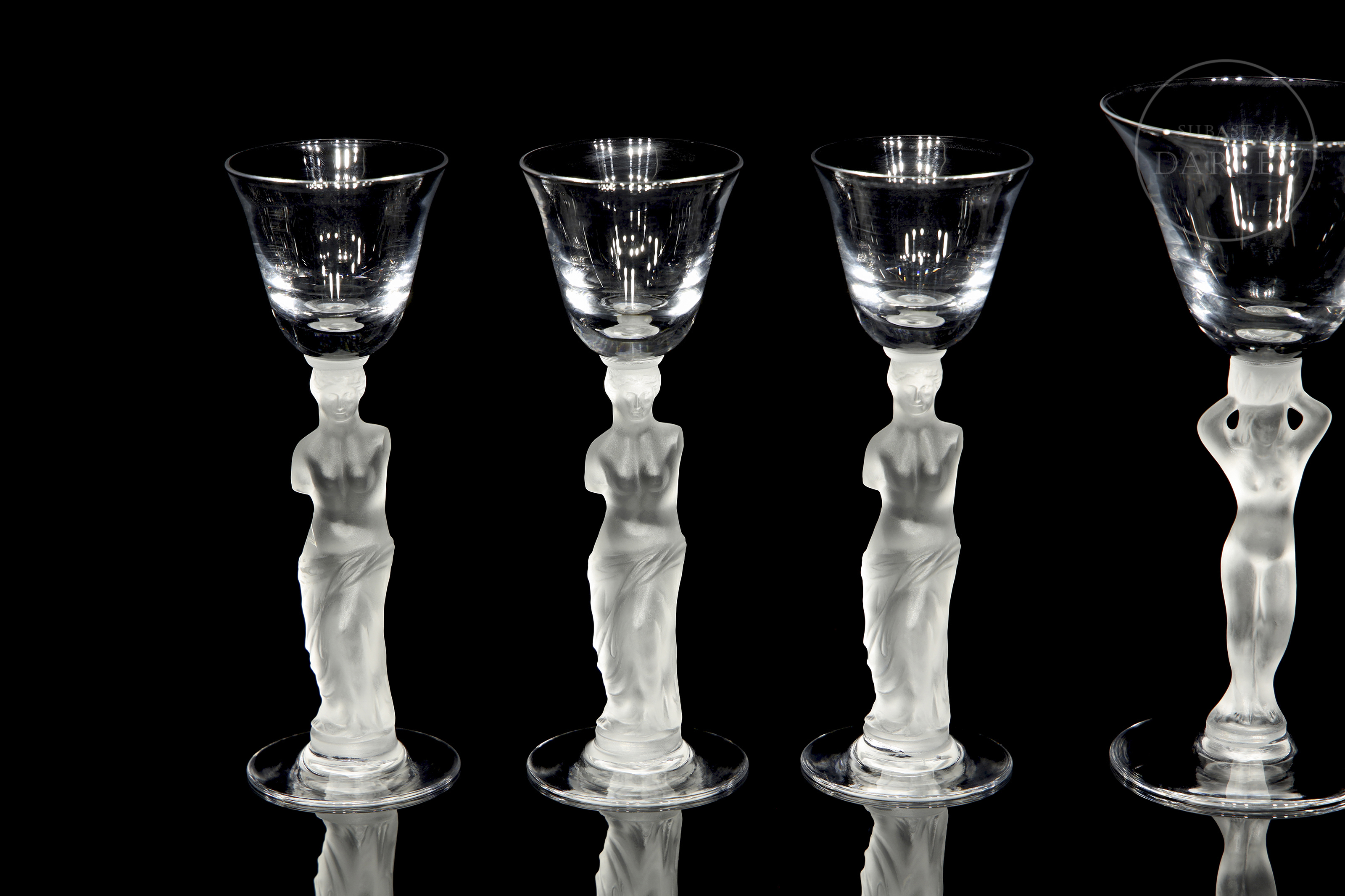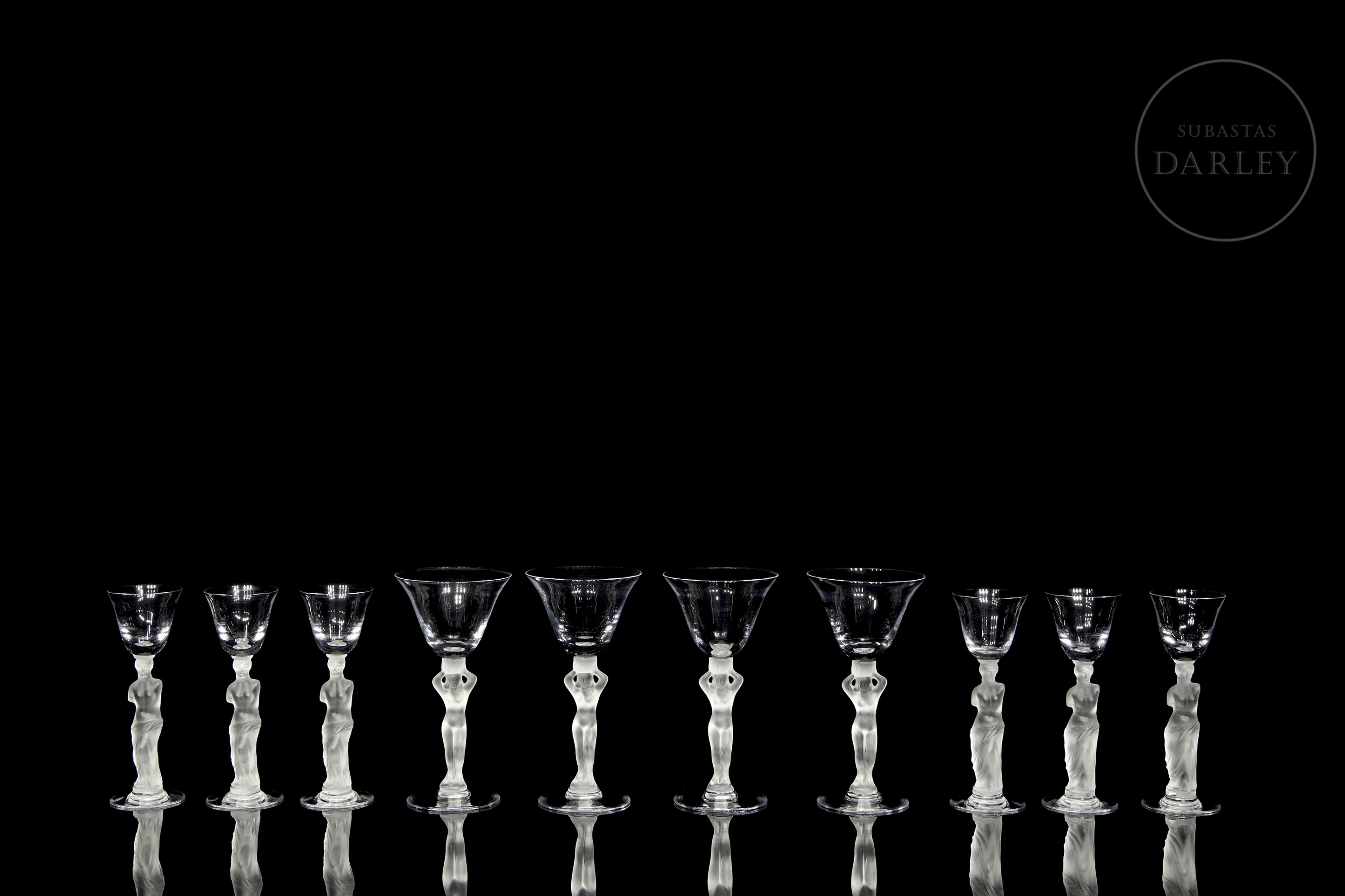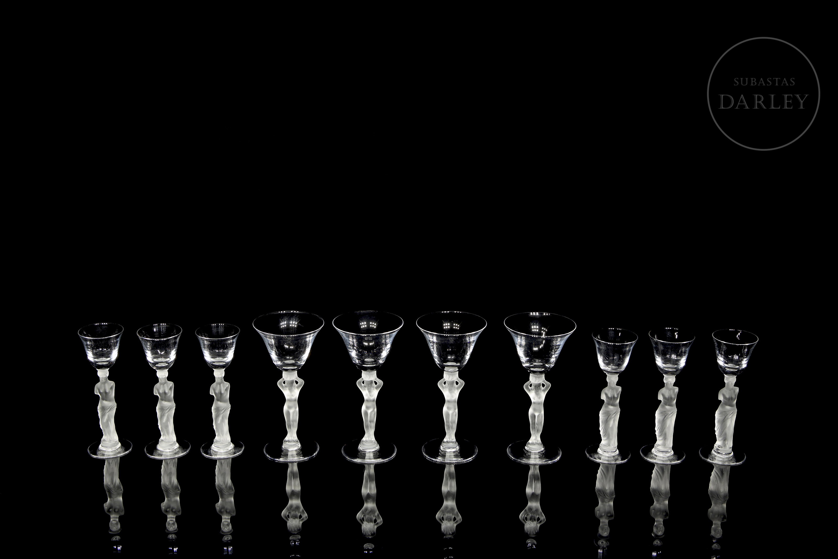 Set of 10 glasses from Bayel glassware, with a conical body and available in two sizes. The stem of each glass is a sculptural figure of a lady (Venus) made of frosted glass.