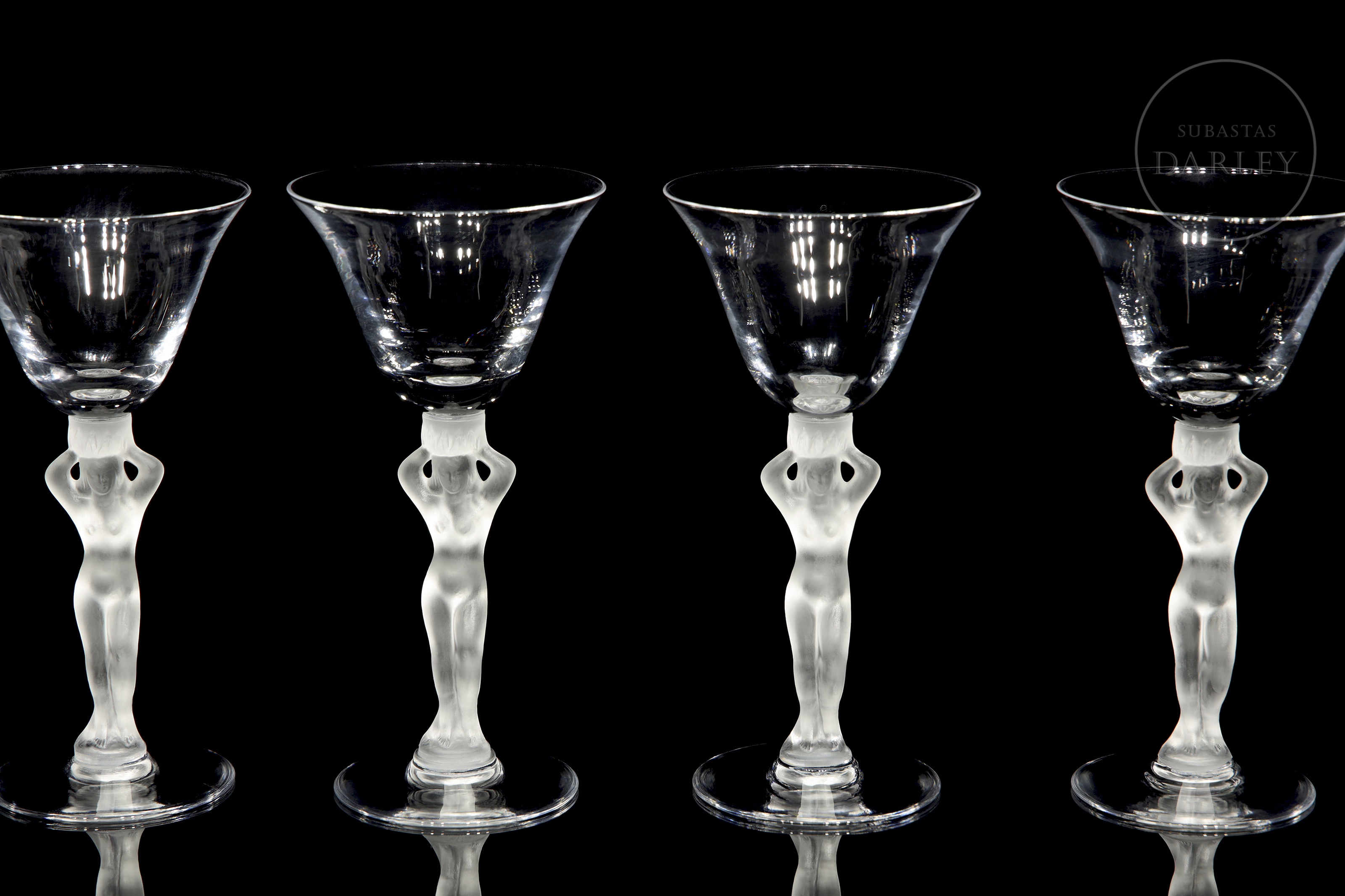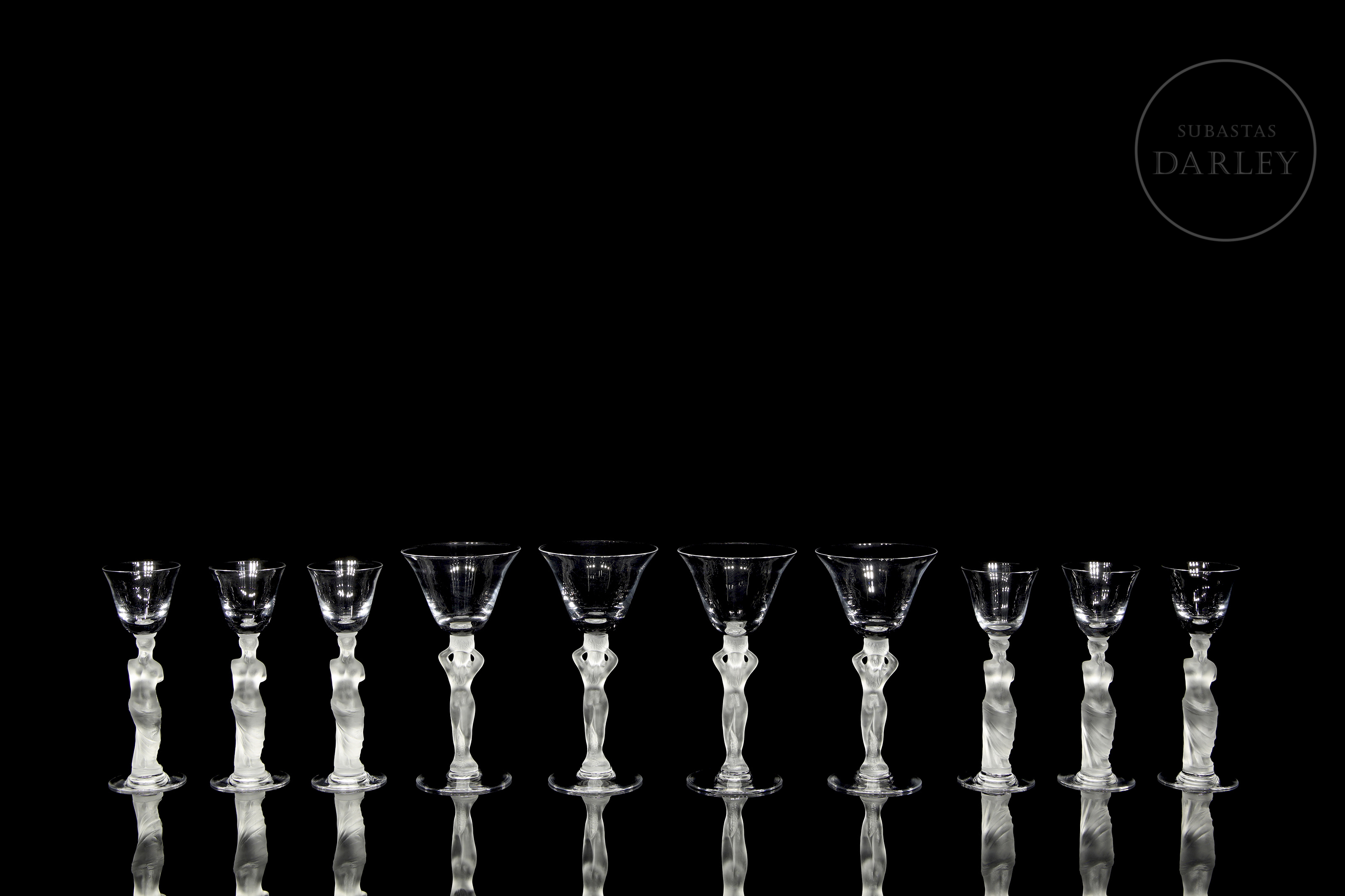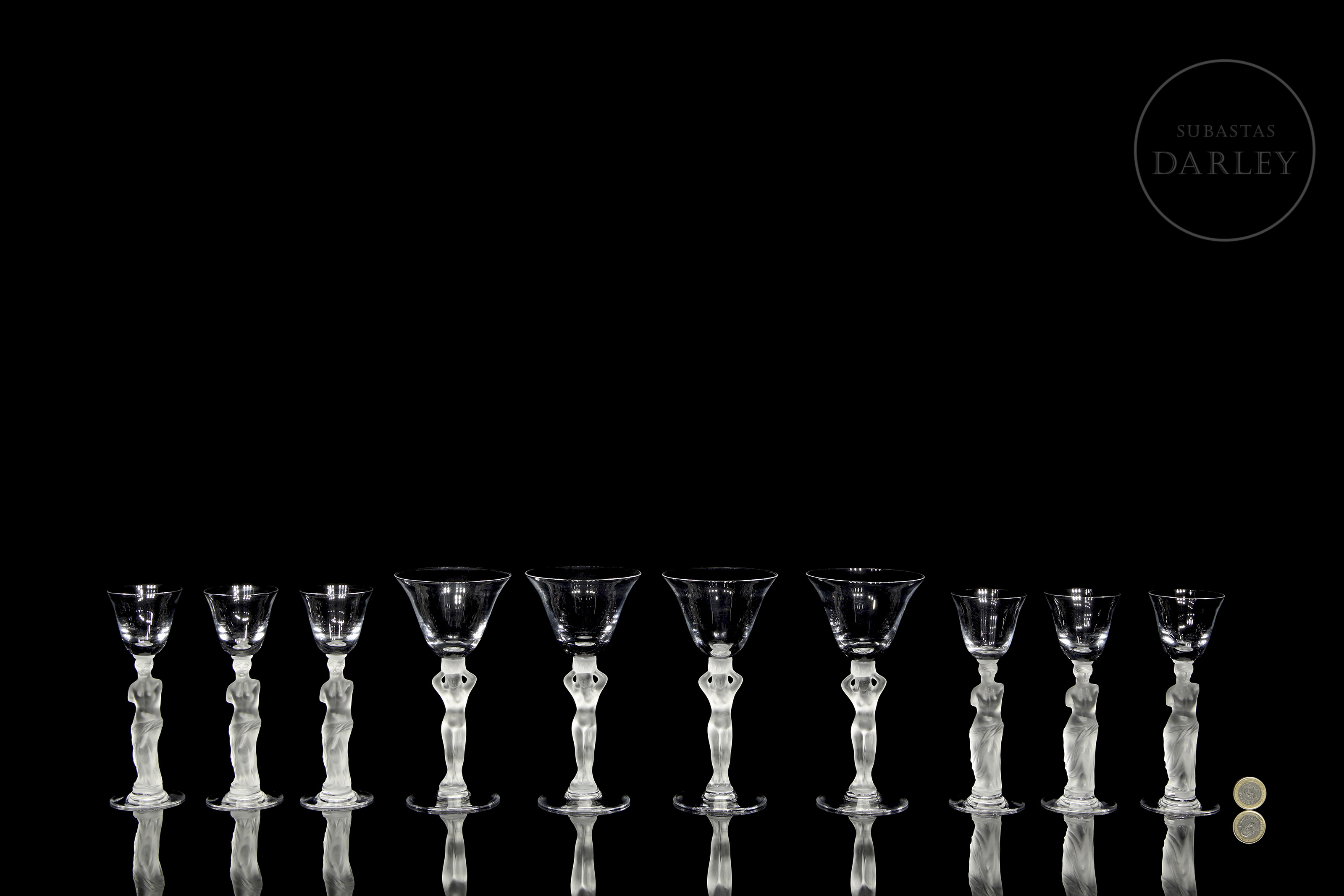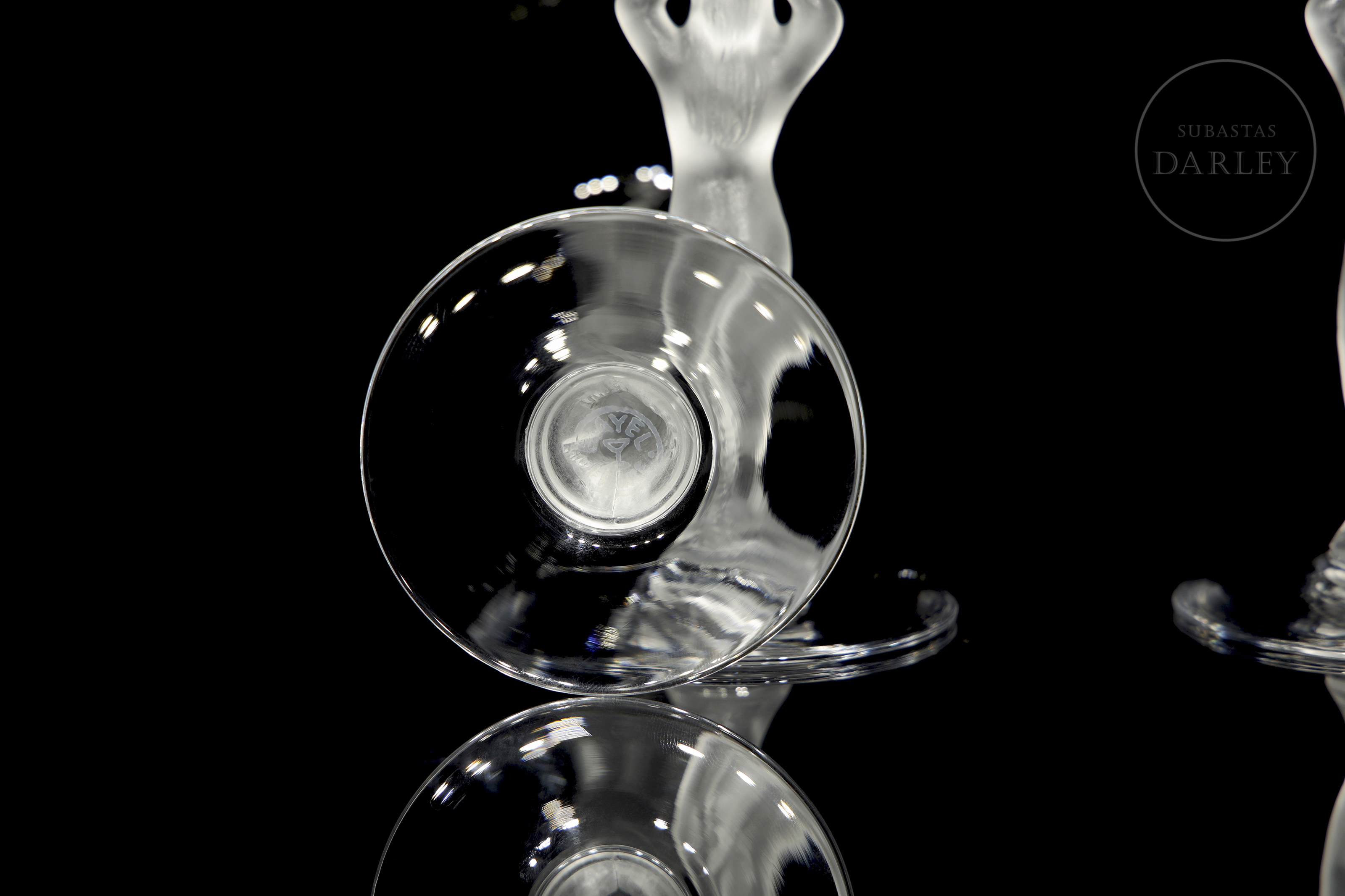 Set of 10 glasses from Bayel glassware, with a conical body and available in two sizes. The stem of each glass is a sculptural figure of a lady (Venus) made of frosted glass.