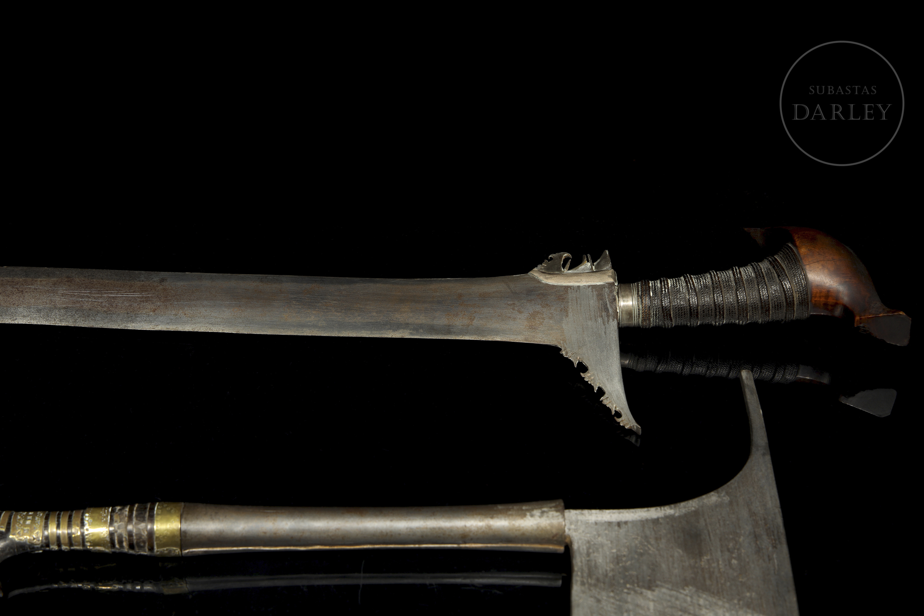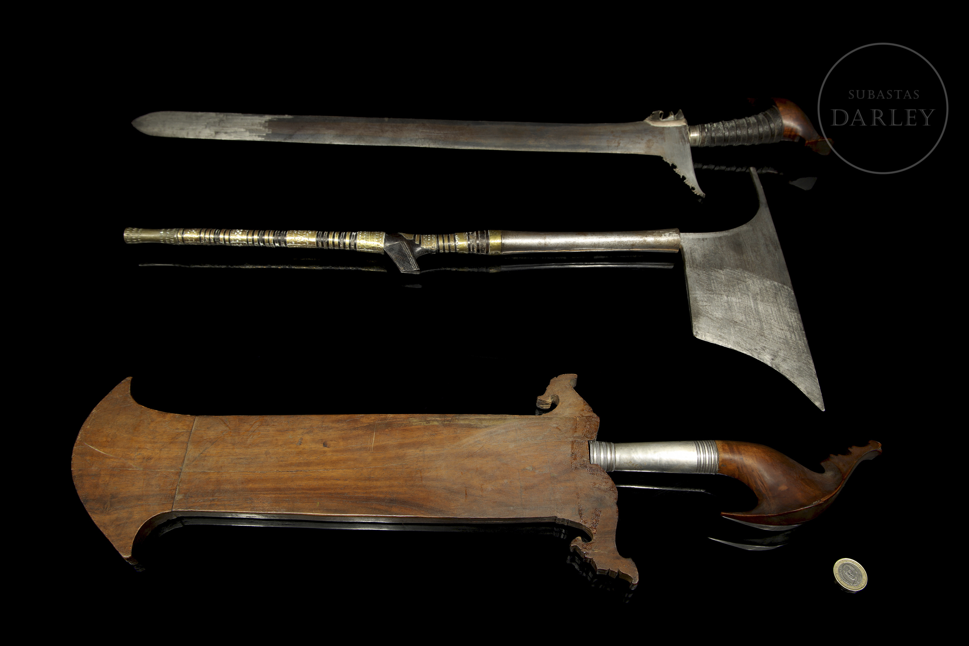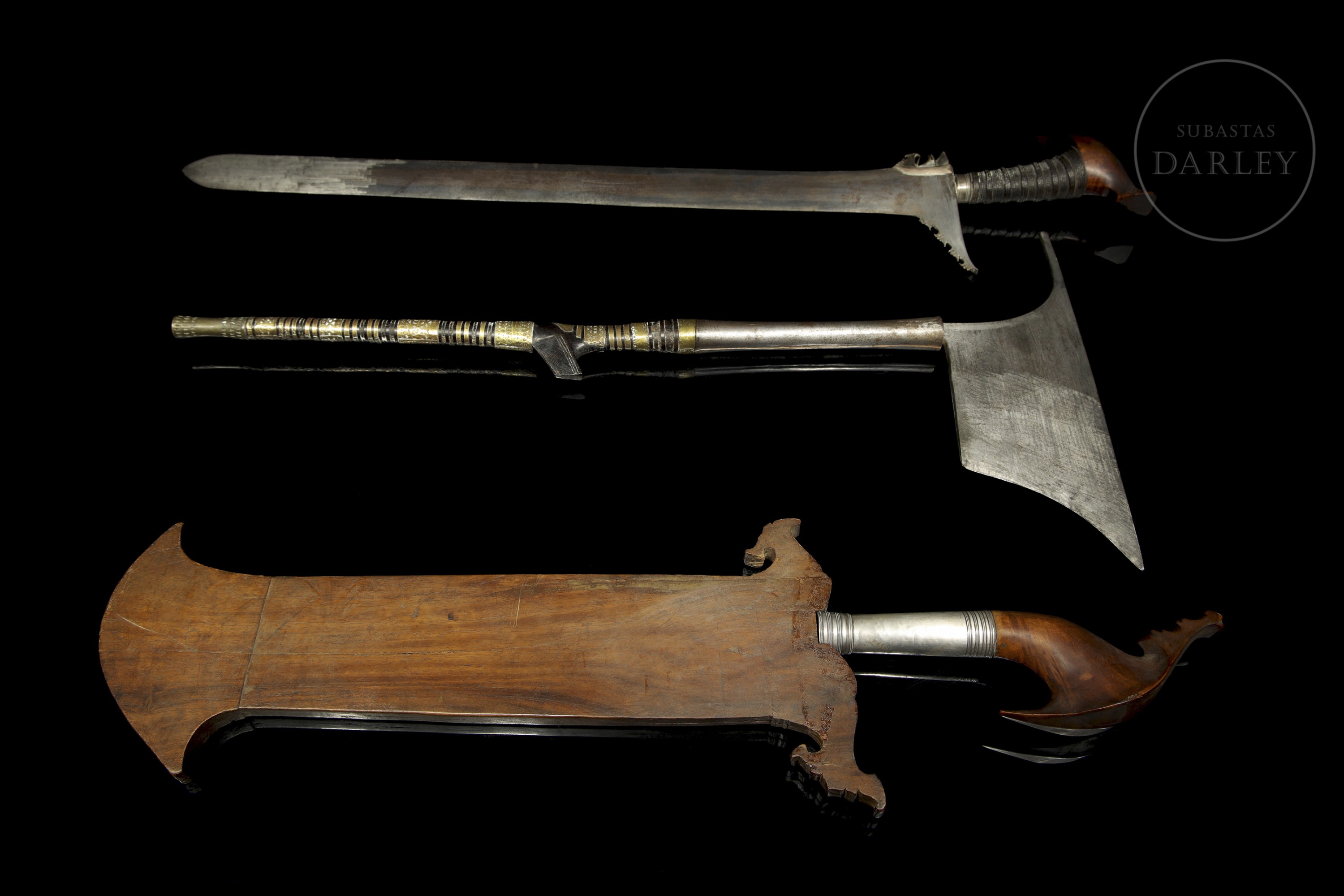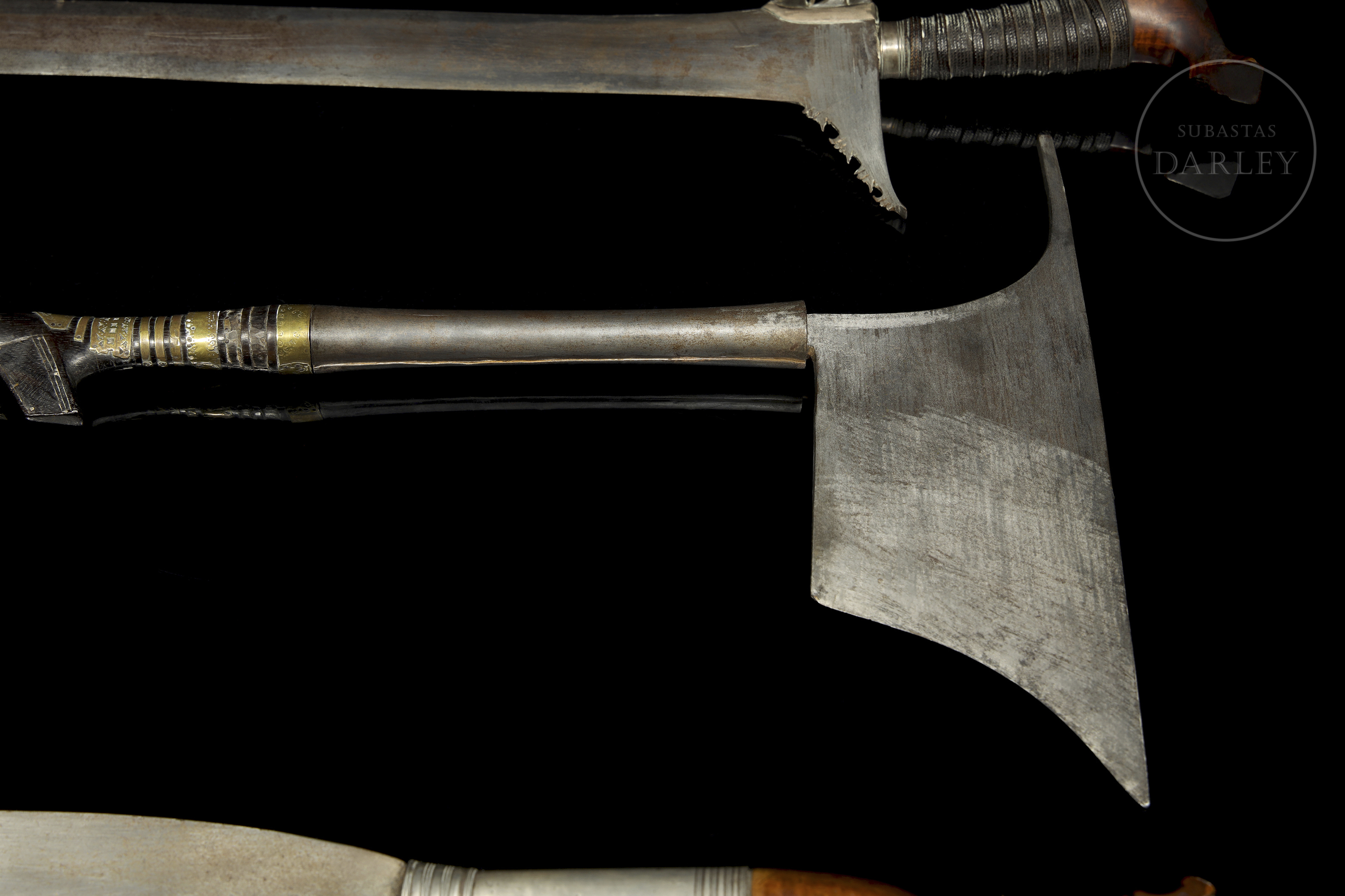 The sudang is a long sword with a double-edged blade and a lenticular cross-section. The barong, which still has its carved wooden sheath (with some breaks), is a knife with a short, wide, single-edged blade. The axe, with a Kalinga head, is used by the Luzon people and had both military and practical uses.