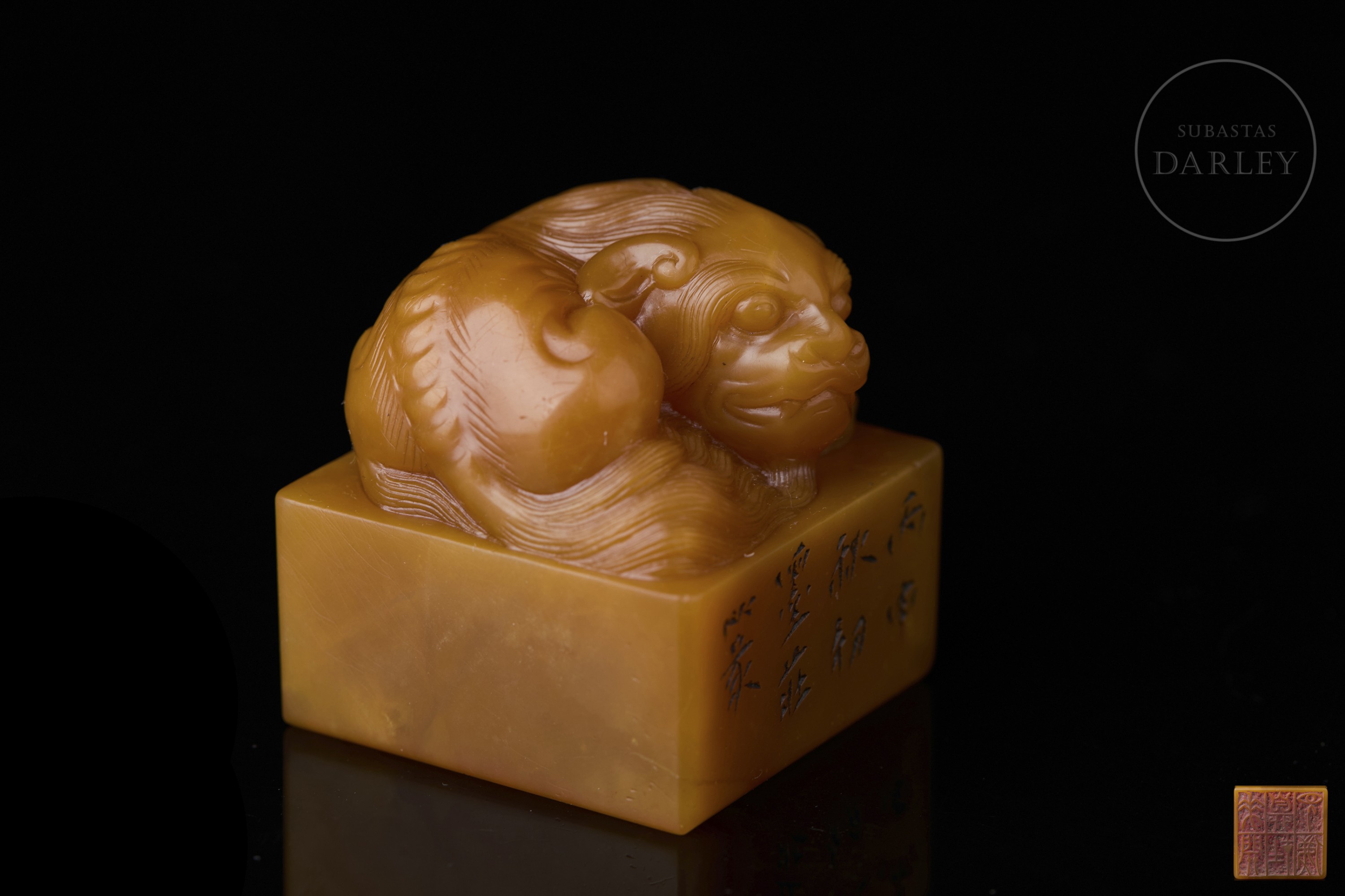 Shoushan seal in an intense orange hue. It has a square base topped by a reclining mythical lion, with a coiled body, lowered head and meticulous incised details depicting its curly mane, powerful musculature and serene expression. One side bears an incised inscription. The base contains an inscription for stamping with traces of cinnabar pigment. With textile pedestal and custom-made box.