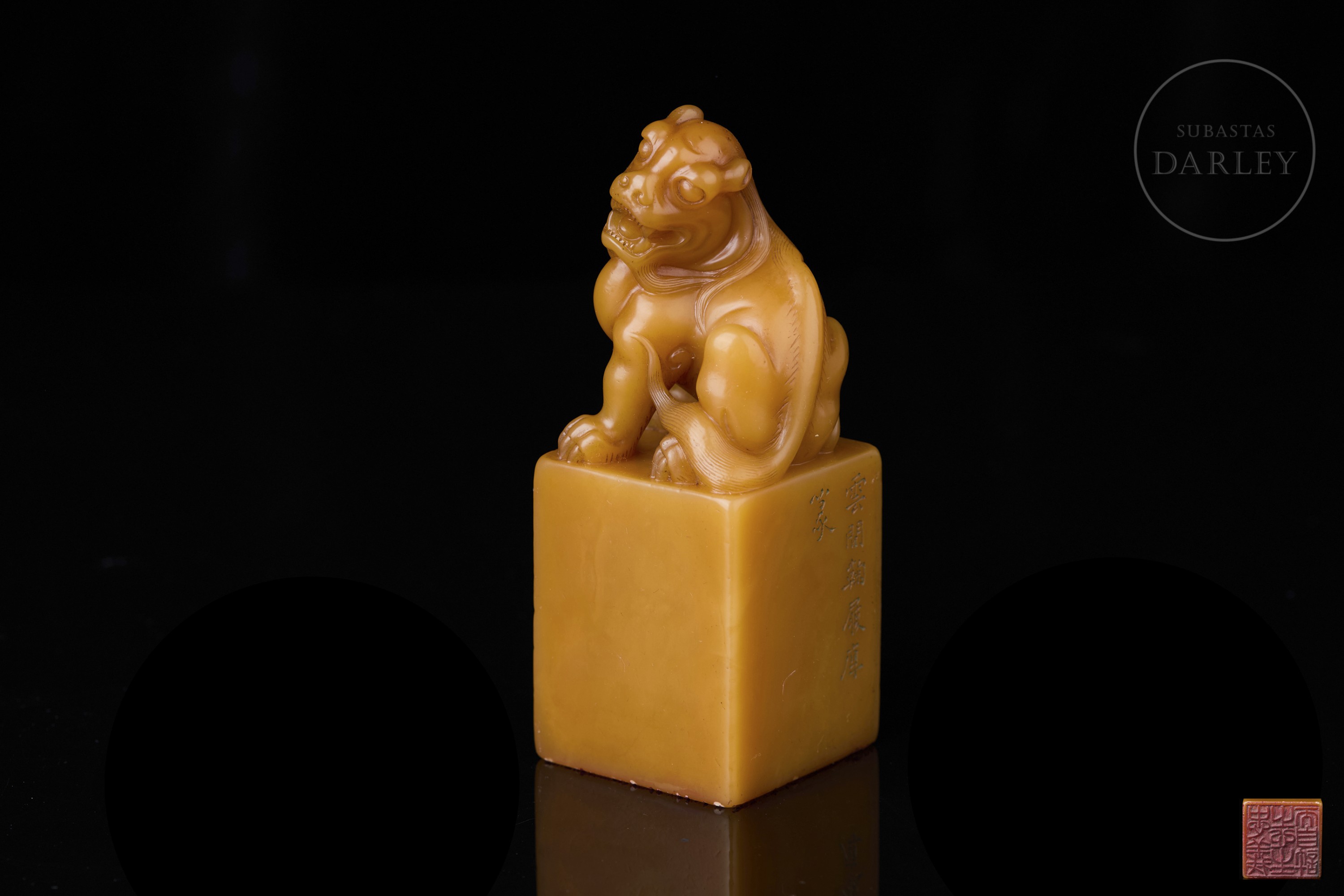 Carved Shoushan stone. The piece has a long, square base topped by the image of a seated mythical beast with an alert expression. The animal has vigorous features and incised and embossed details. One side has an incised inscription. The base contains characters engraved in seal style with traces of cinnabar pigment. It comes with a custom-made pedestal and box. Qing dynasty (1644-1912).