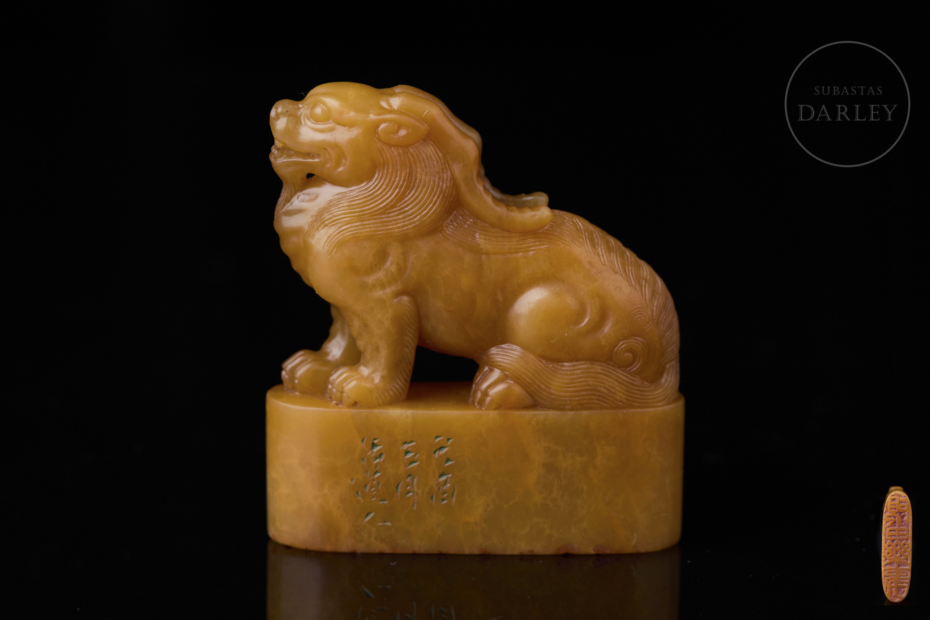Shoushan seal in a soft amber colour. It has an elliptical base topped by the image of the Tian Lu beast in an alert pose. It stands upright, with its head raised, vigorous musculature, and a solemn expression crowned by two large horns. There is an incised text on the base. The base has characters in bas-relief for stamping. It comes with a custom-made pedestal and box.