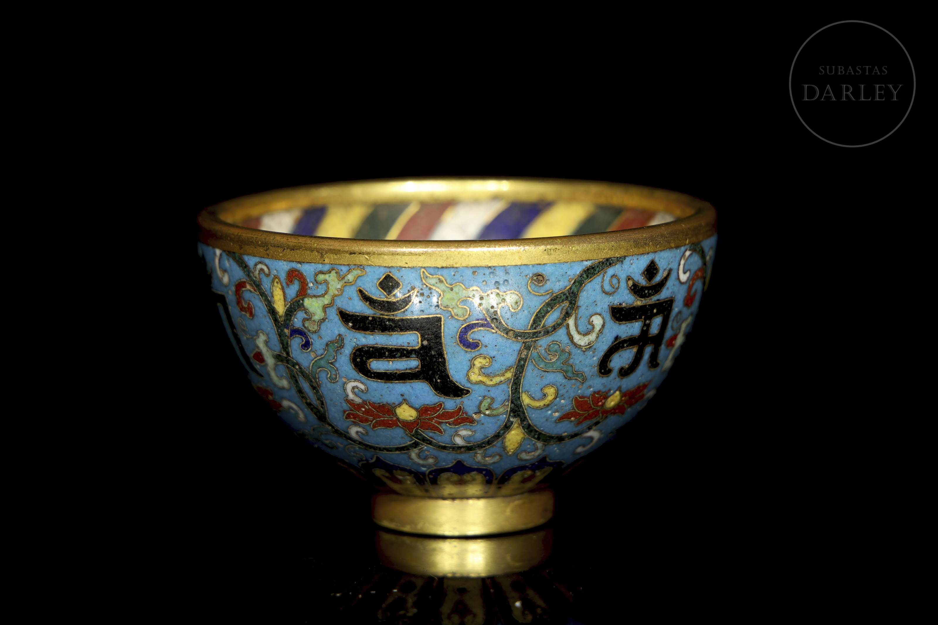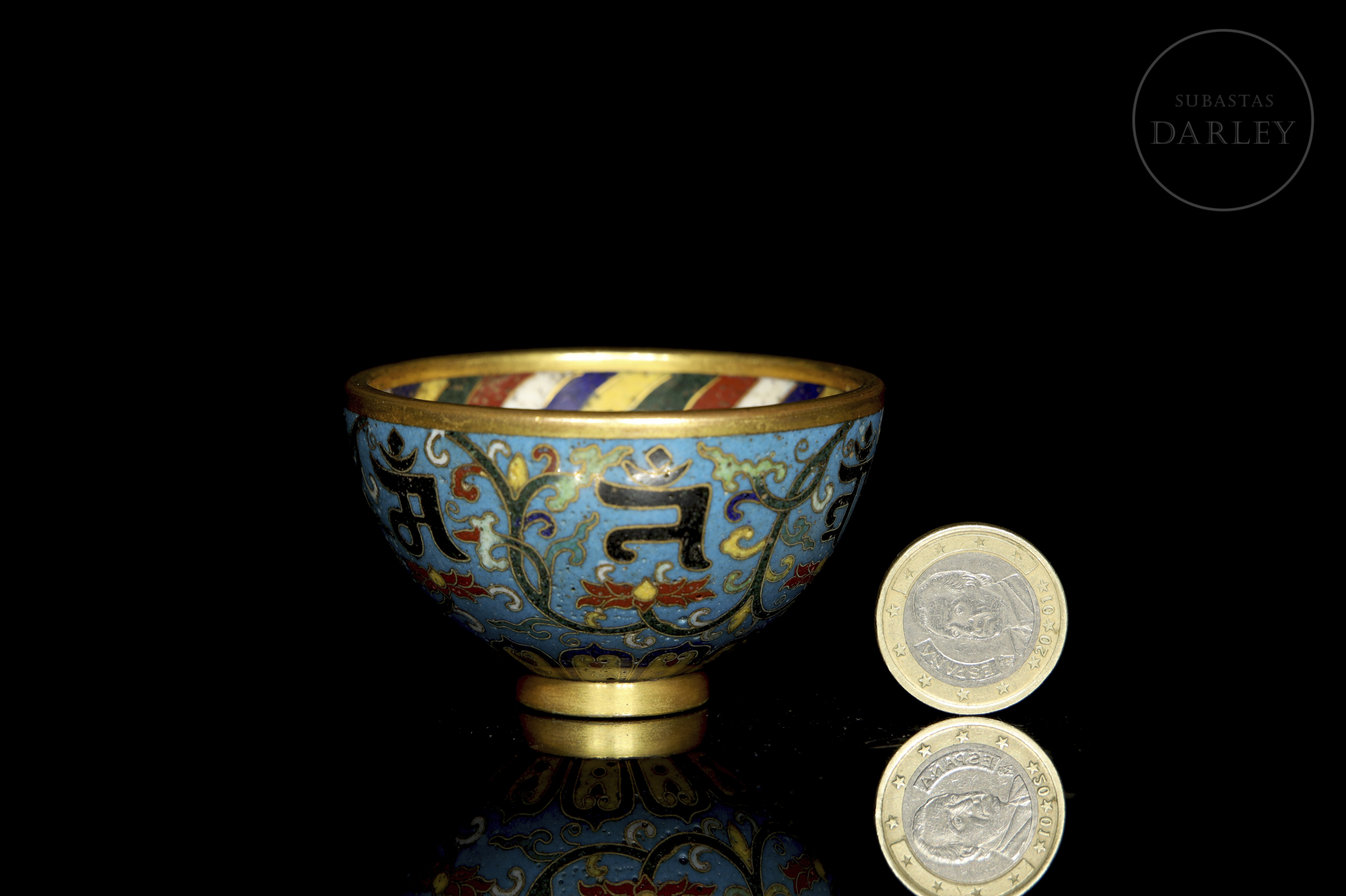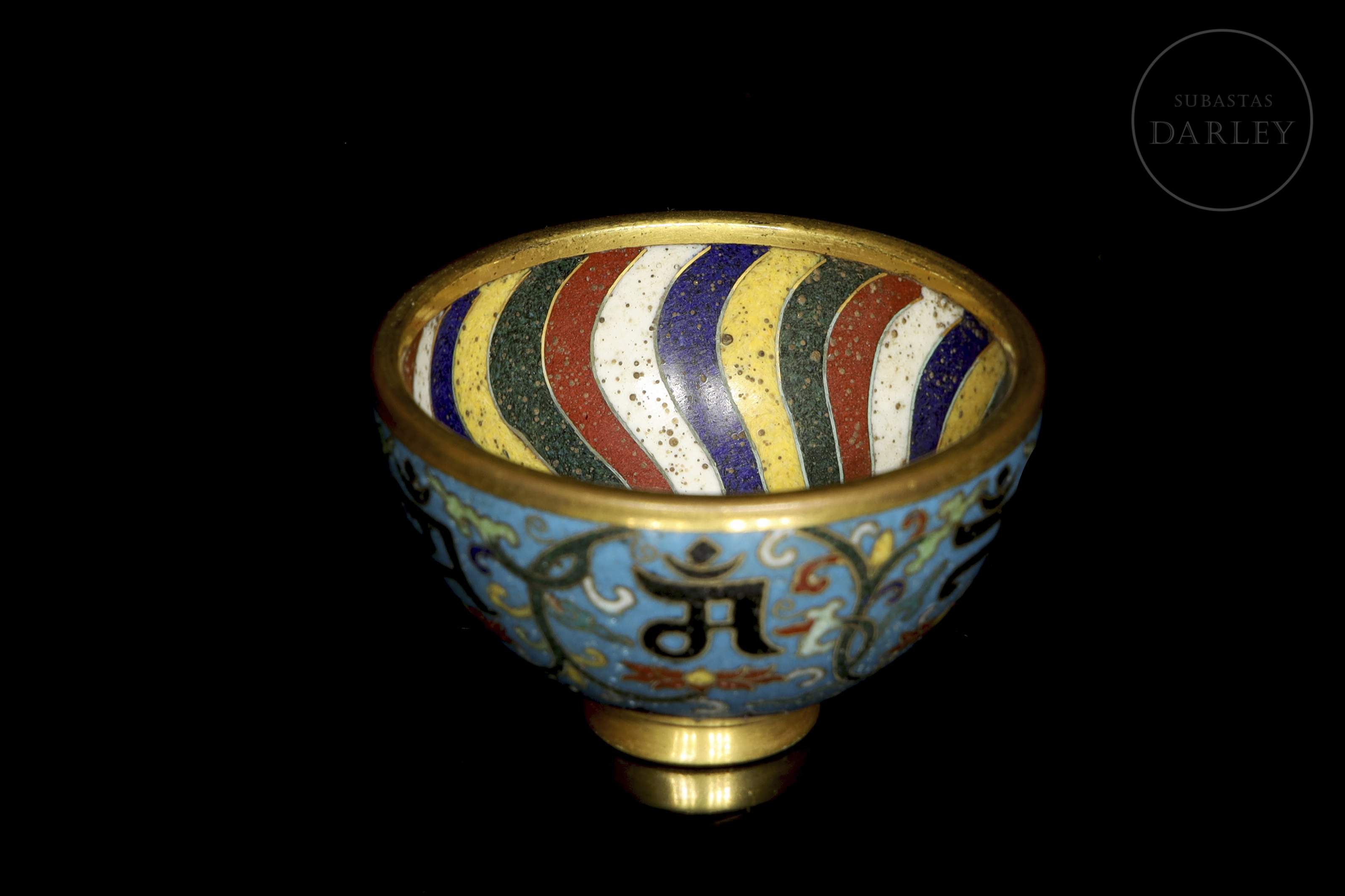 Small hemispherical bronze cup with curved walls. Decorated with cloisonné enamels, featuring a design of lotus flowers and foliage motifs framing auspicious characters, all in vibrant colours against a deep blue background. The centre shows bands converging in a spiral of bright colours that contrast with the exterior.