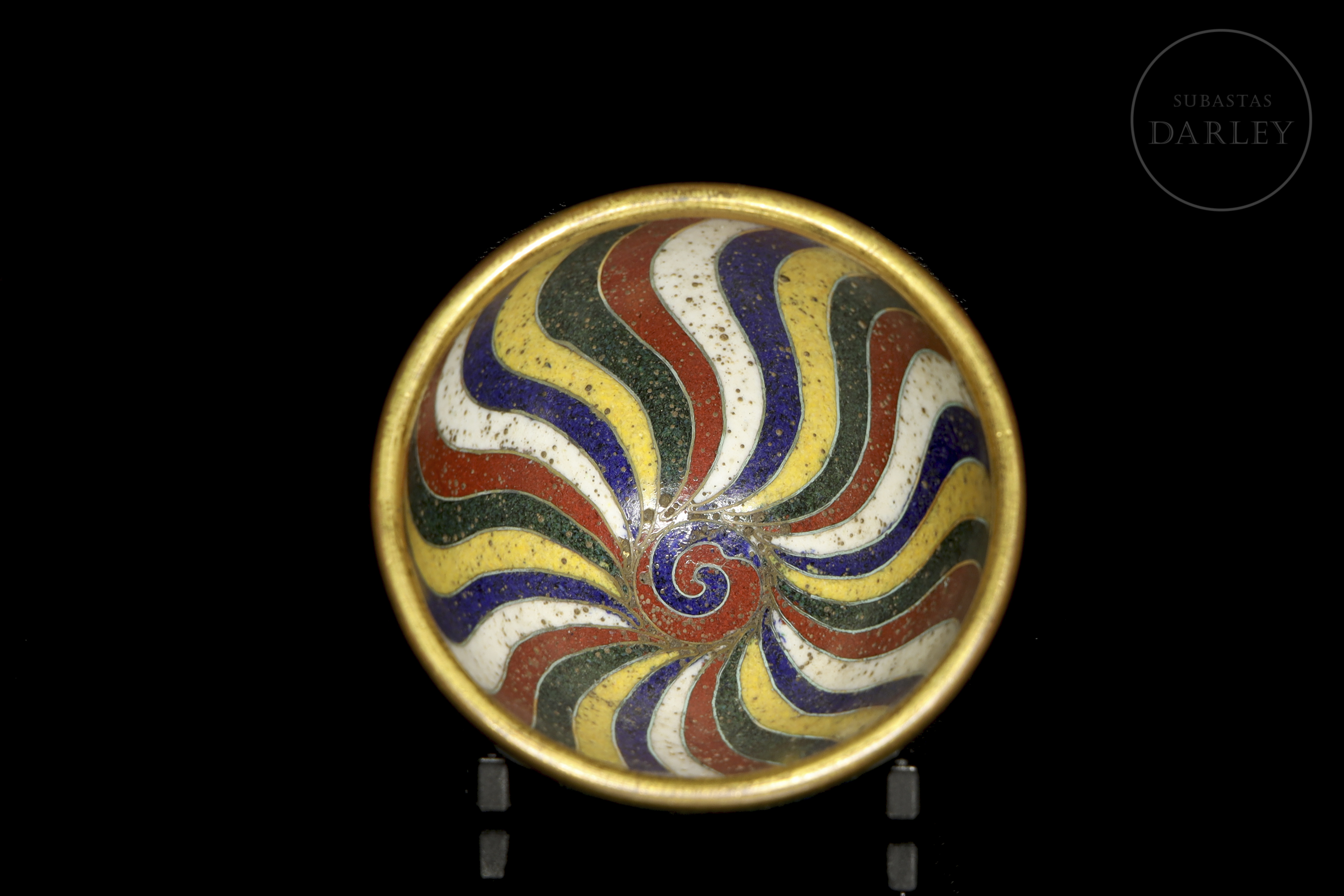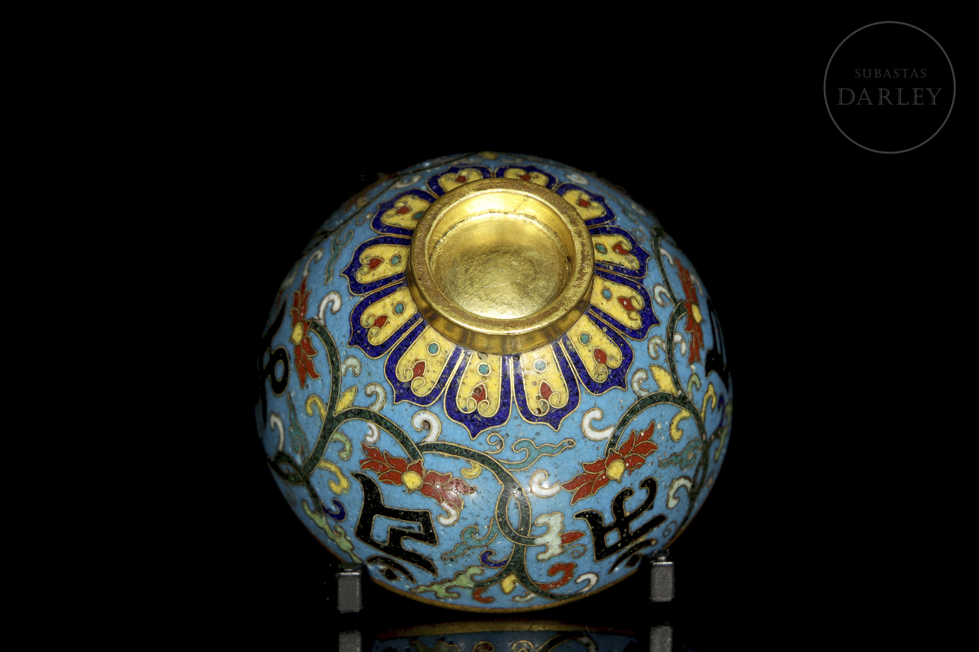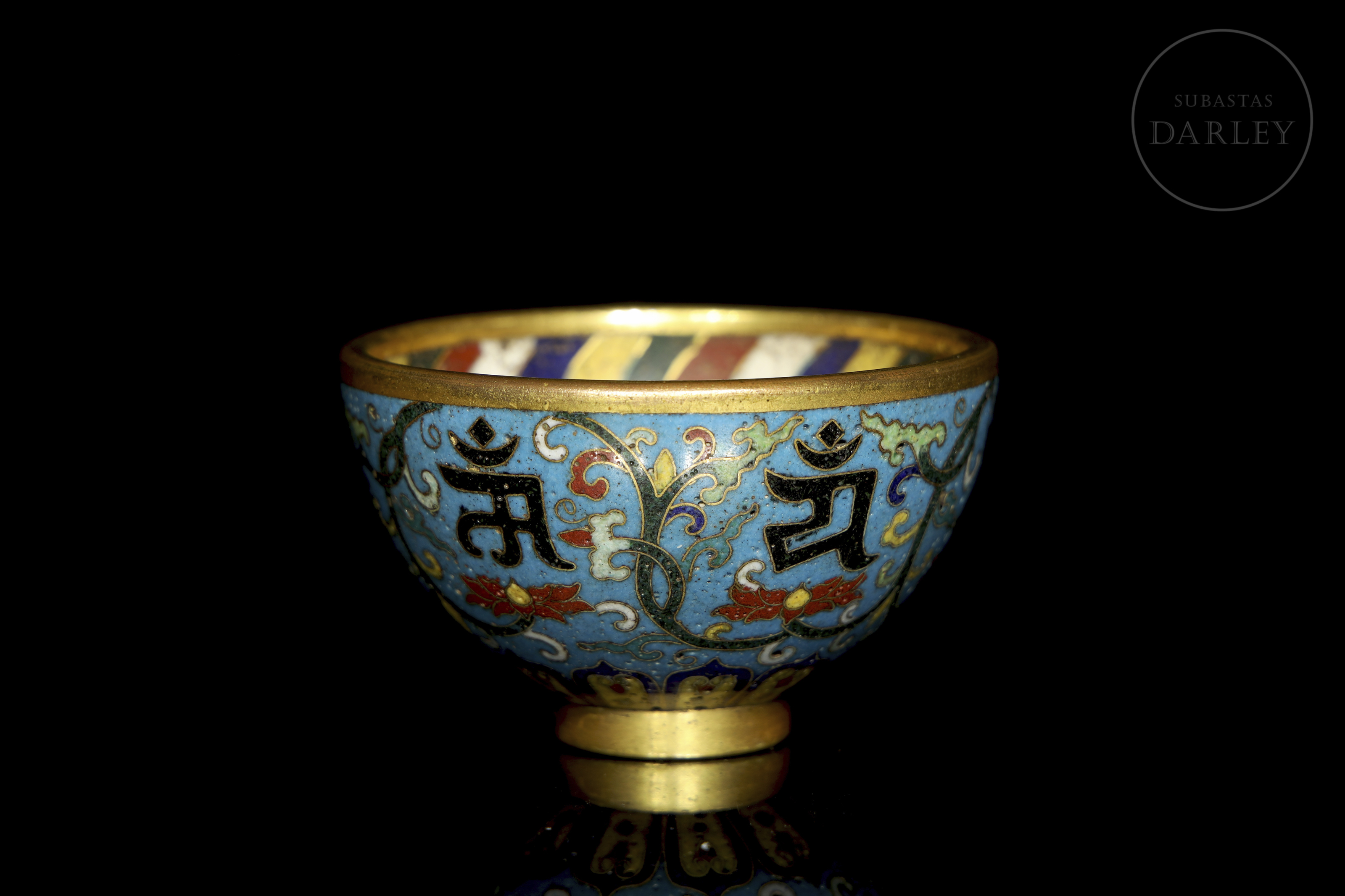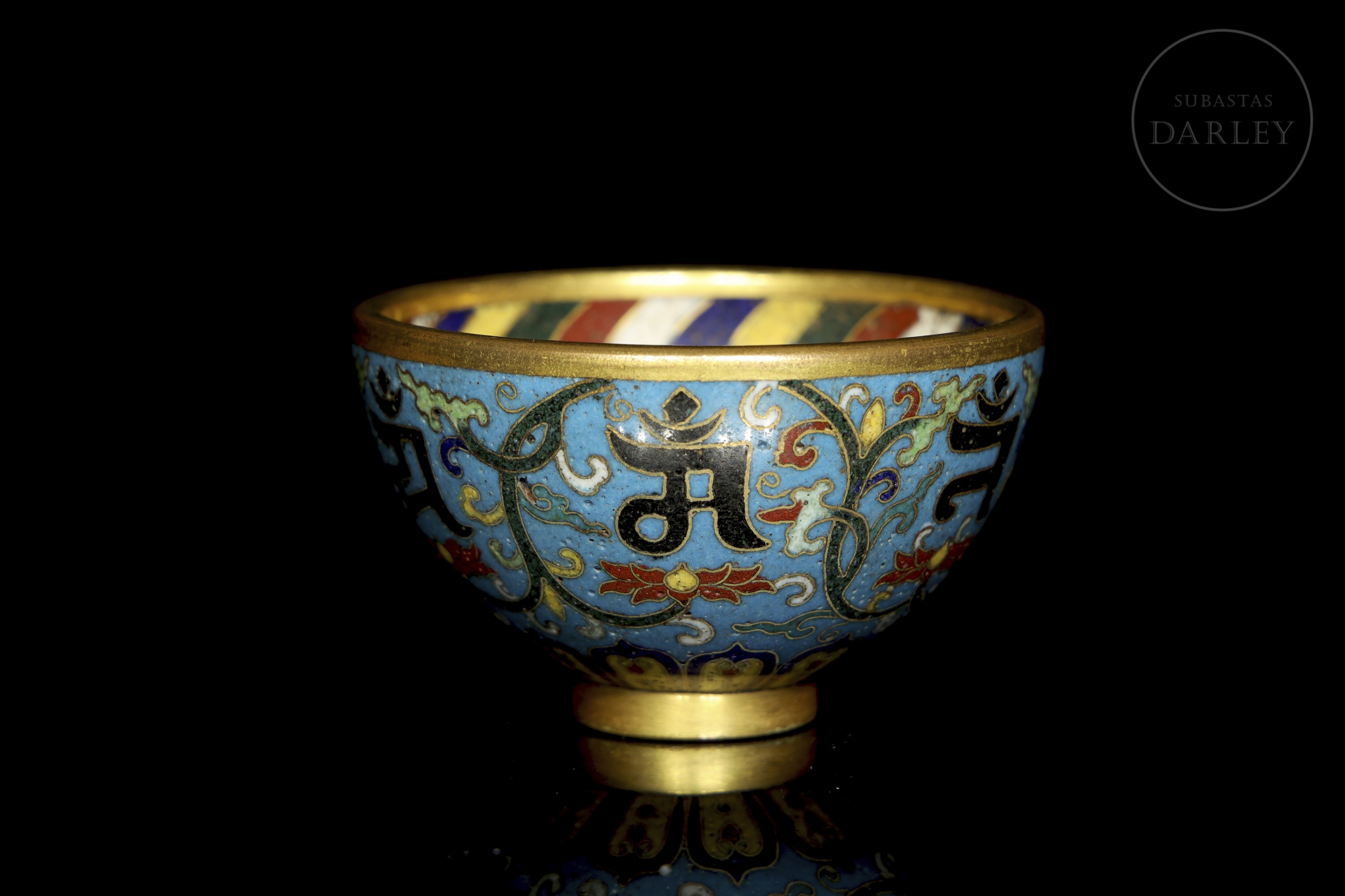 Small hemispherical bronze cup with curved walls. Decorated with cloisonné enamels, featuring a design of lotus flowers and foliage motifs framing auspicious characters, all in vibrant colours against a deep blue background. The centre shows bands converging in a spiral of bright colours that contrast with the exterior.