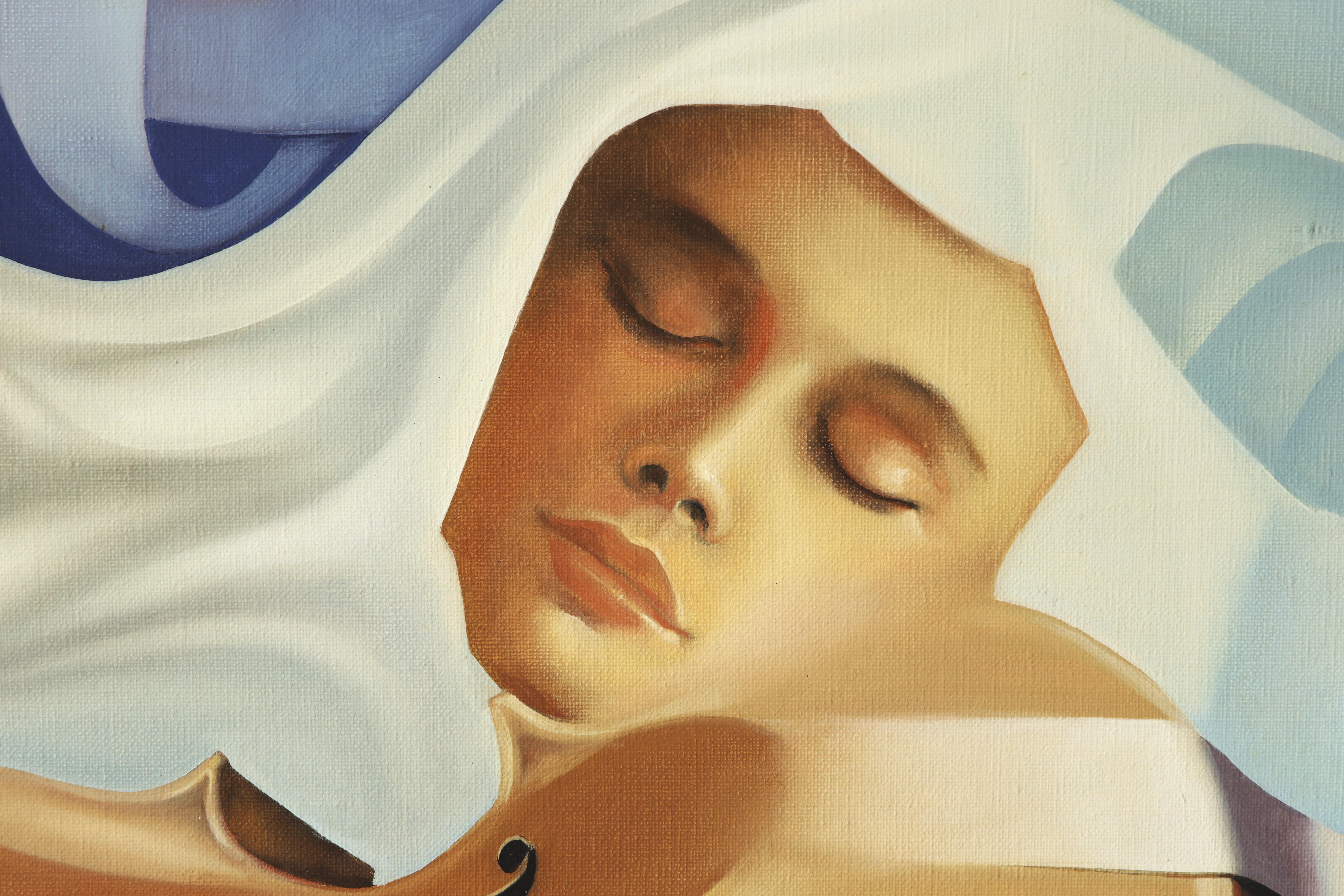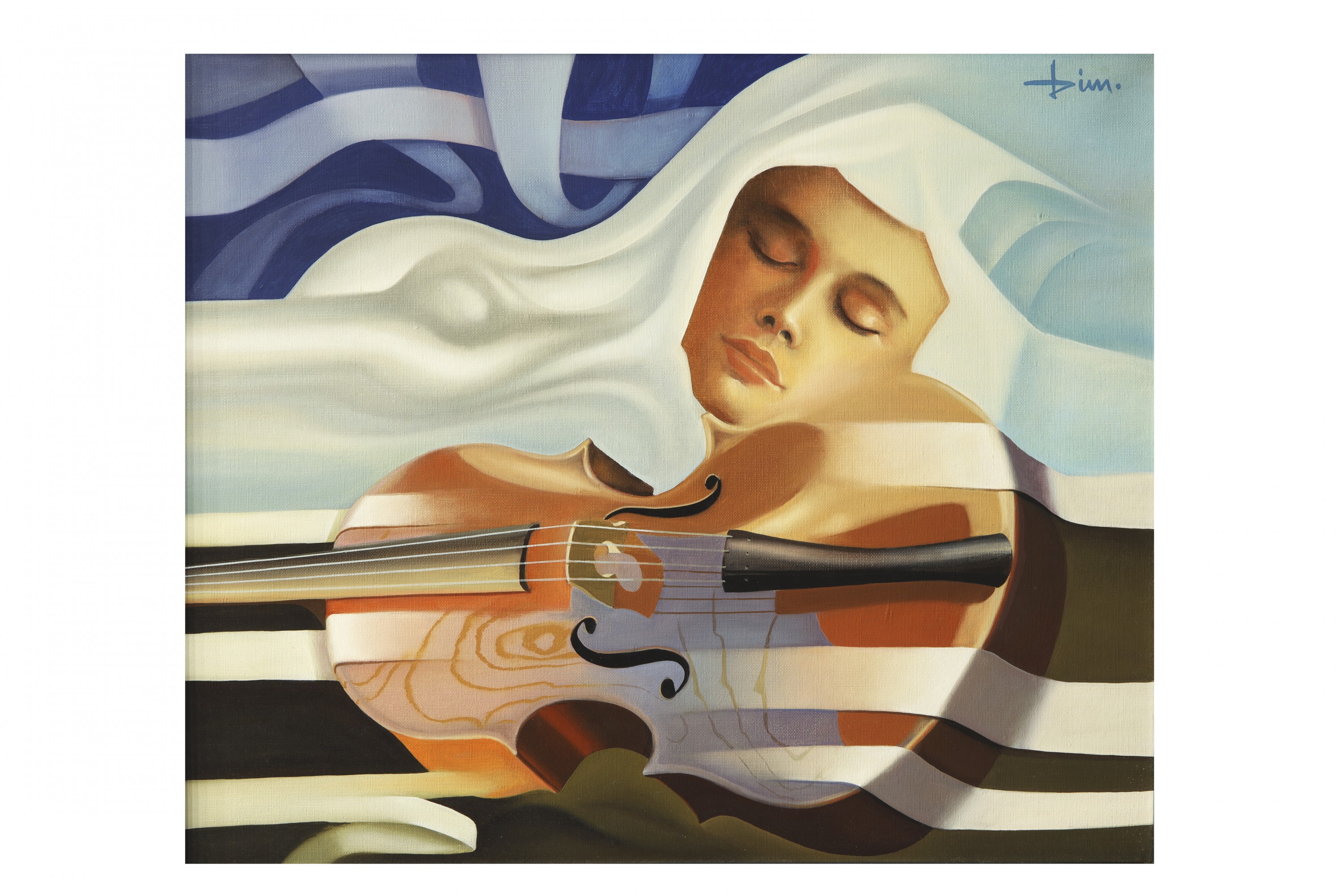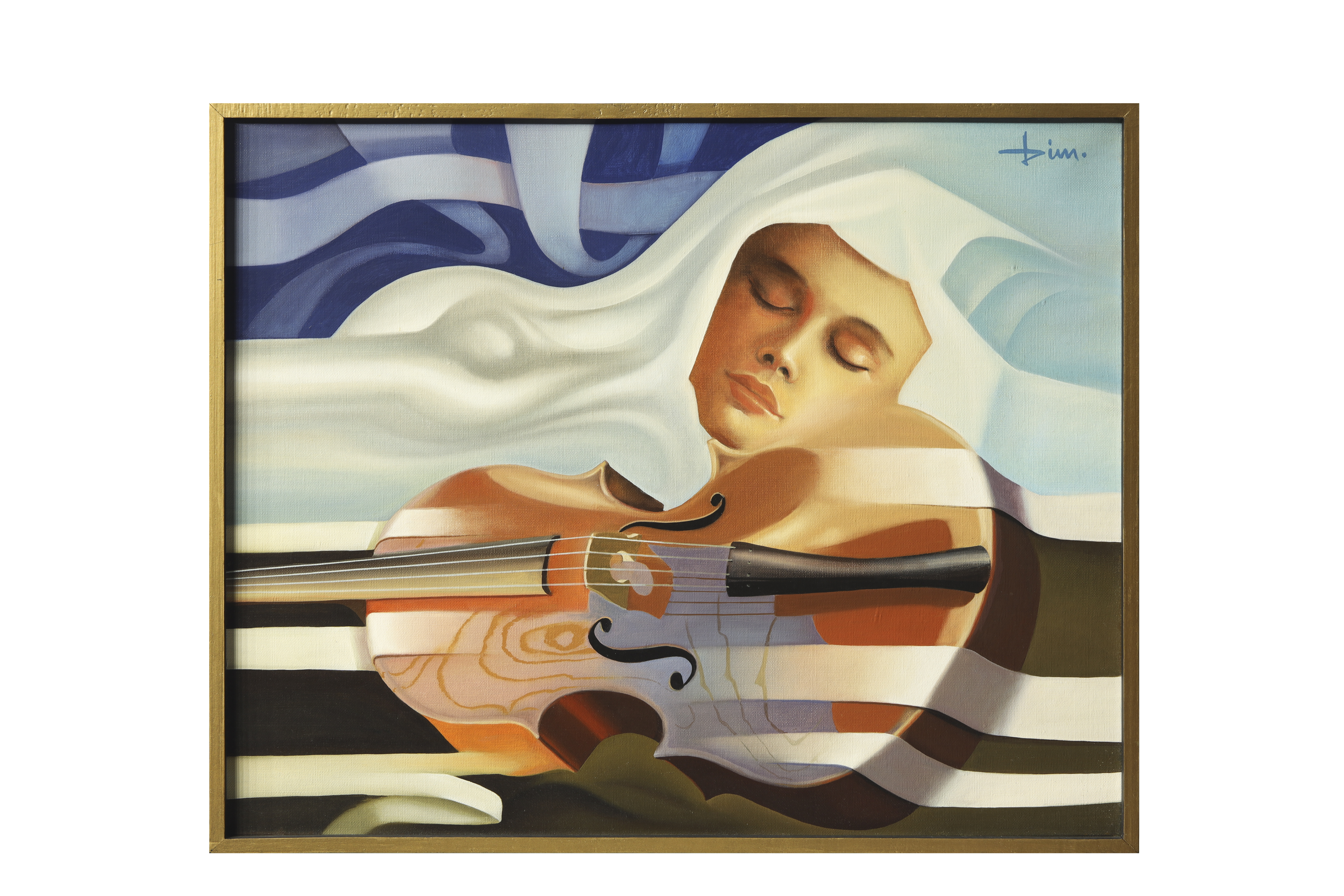 Oil on canvas. Surrealist composition that merges the face of a sleeping woman with the body of a violin. Signed ‘Dim.’ in the upper right corner. Titled and dated on the reverse.