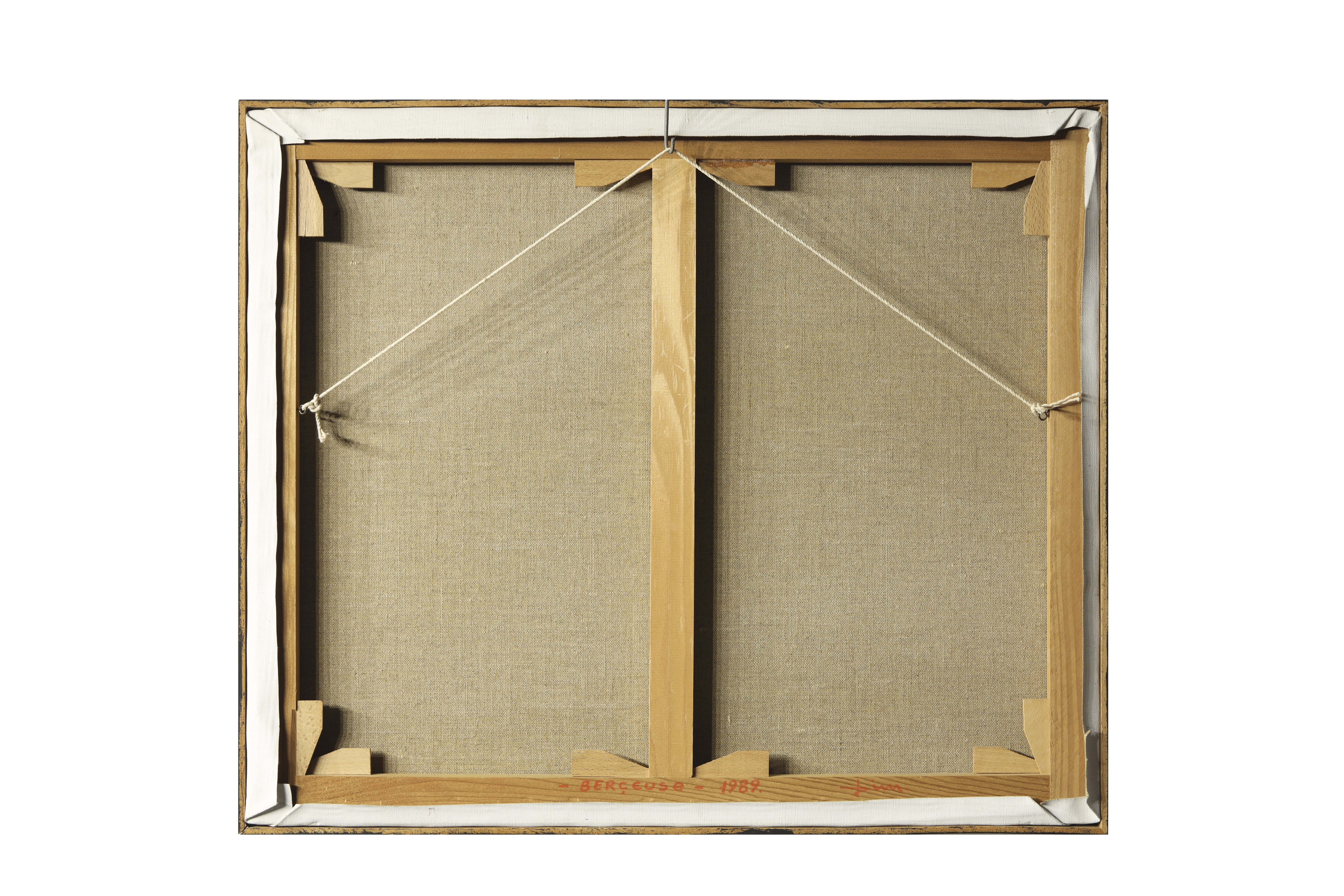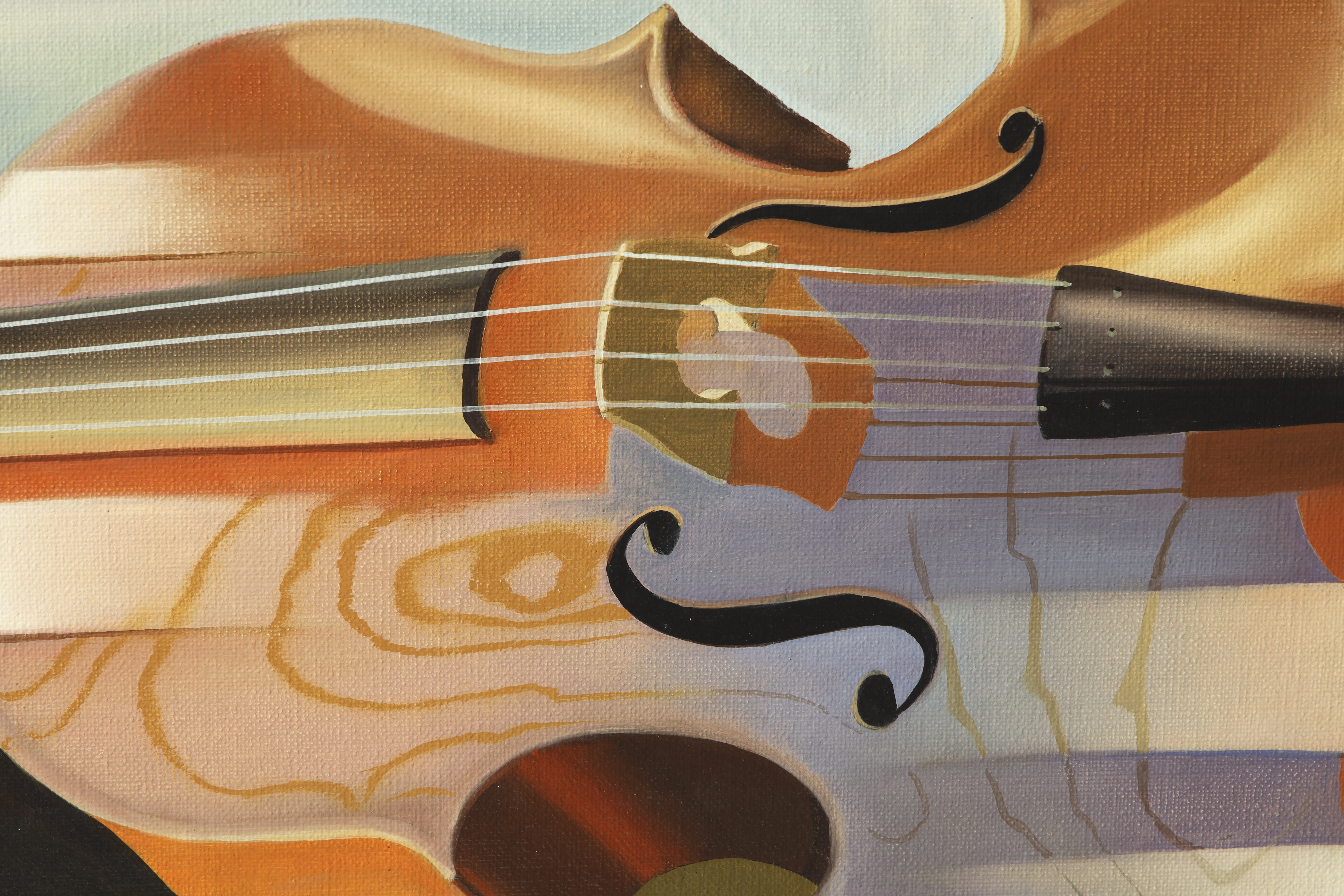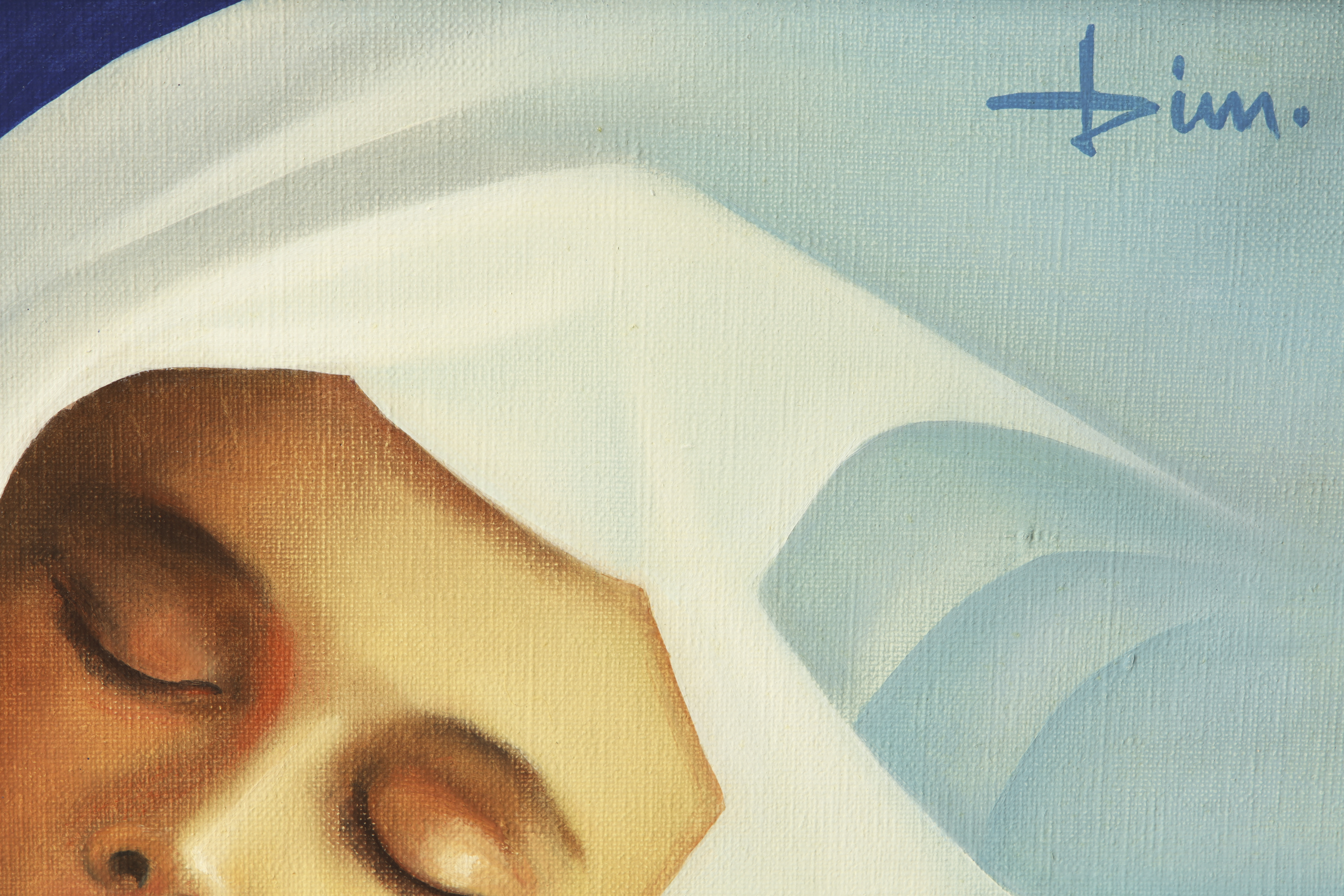 Oil on canvas. Surrealist composition that merges the face of a sleeping woman with the body of a violin. Signed ‘Dim.’ in the upper right corner. Titled and dated on the reverse.