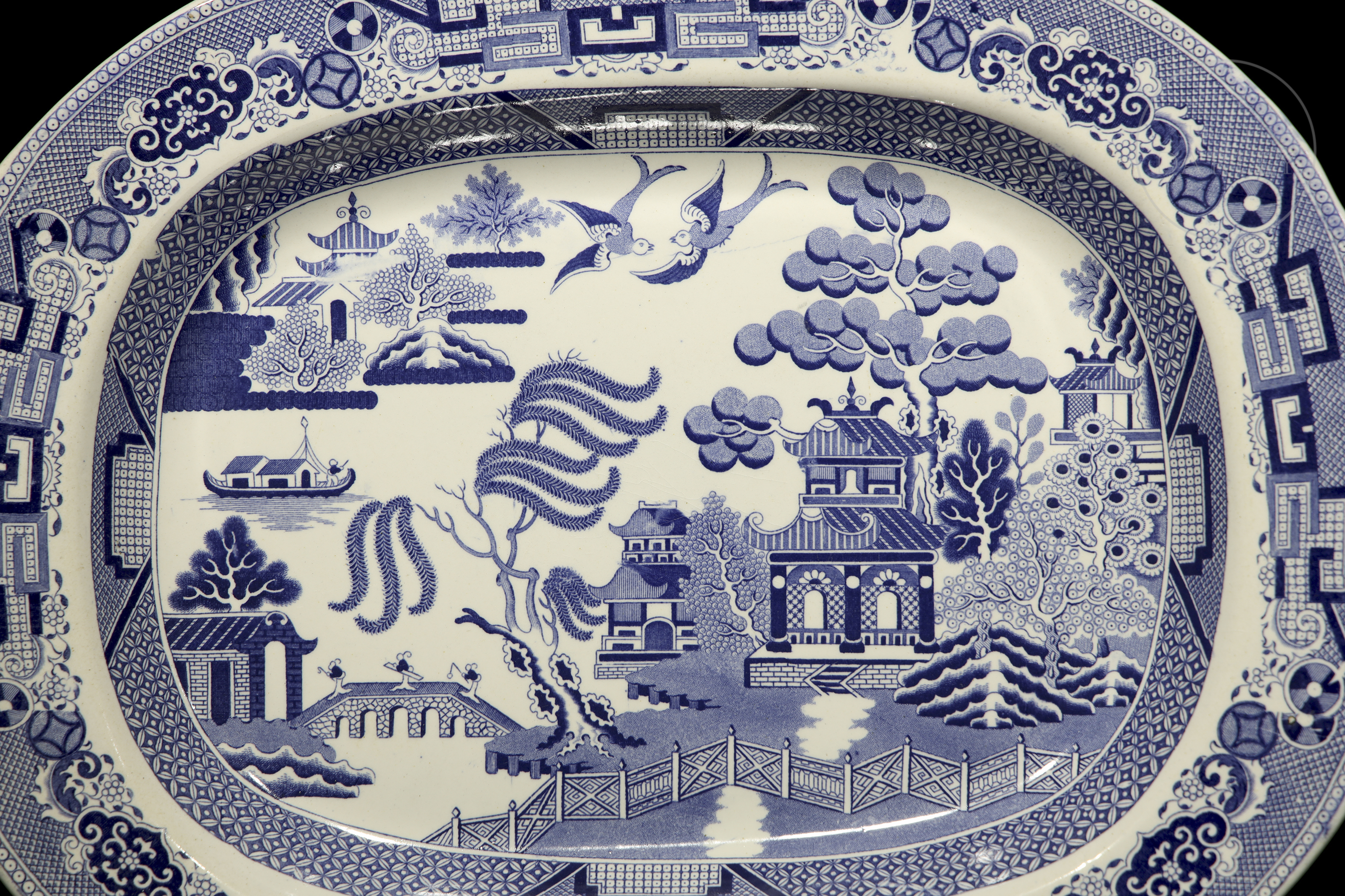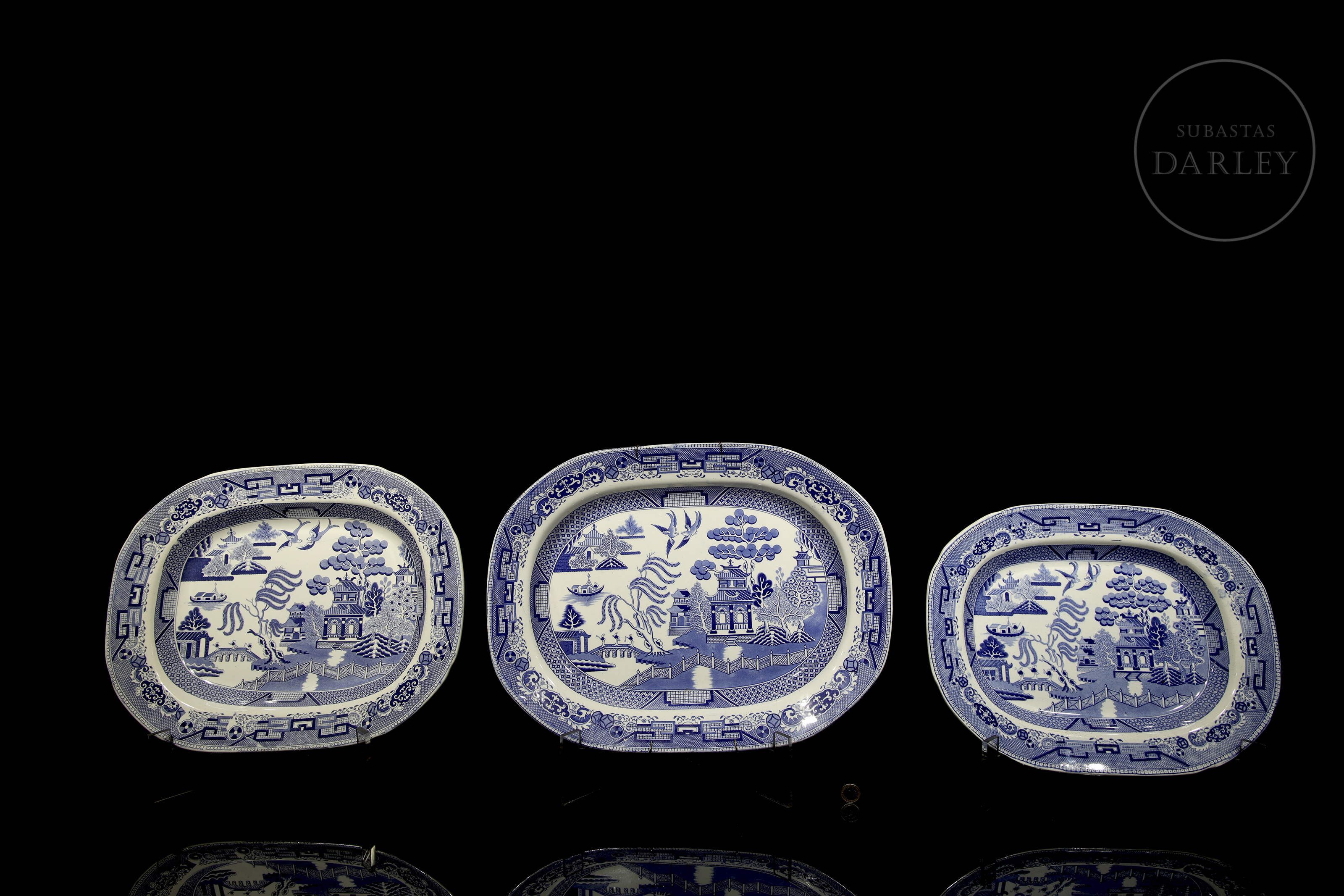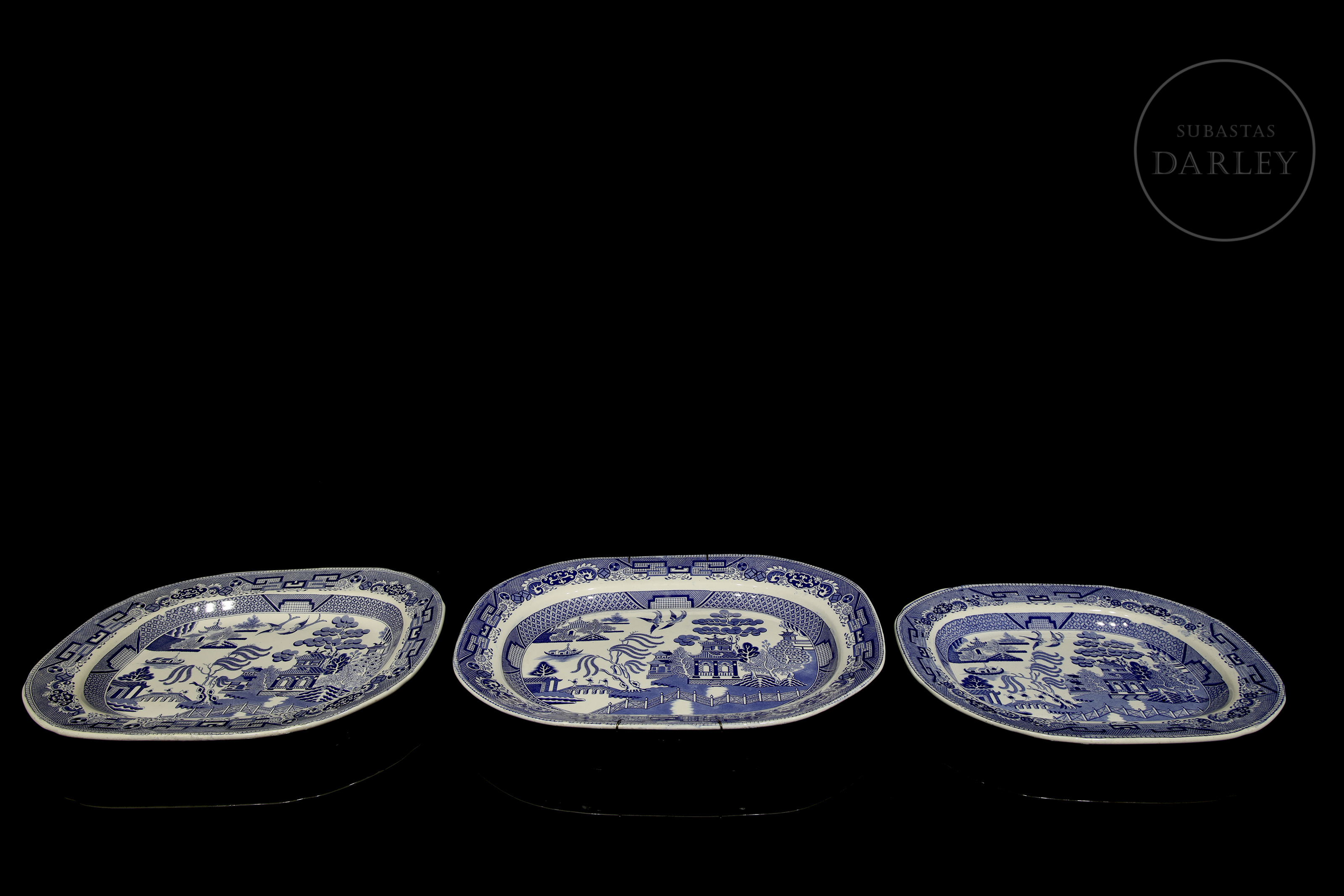 Three trays of varying sizes featuring the English Willow Pattern. This design, though inspired by Chinese porcelain, was developed in England during the late 18th and early 19th centuries.