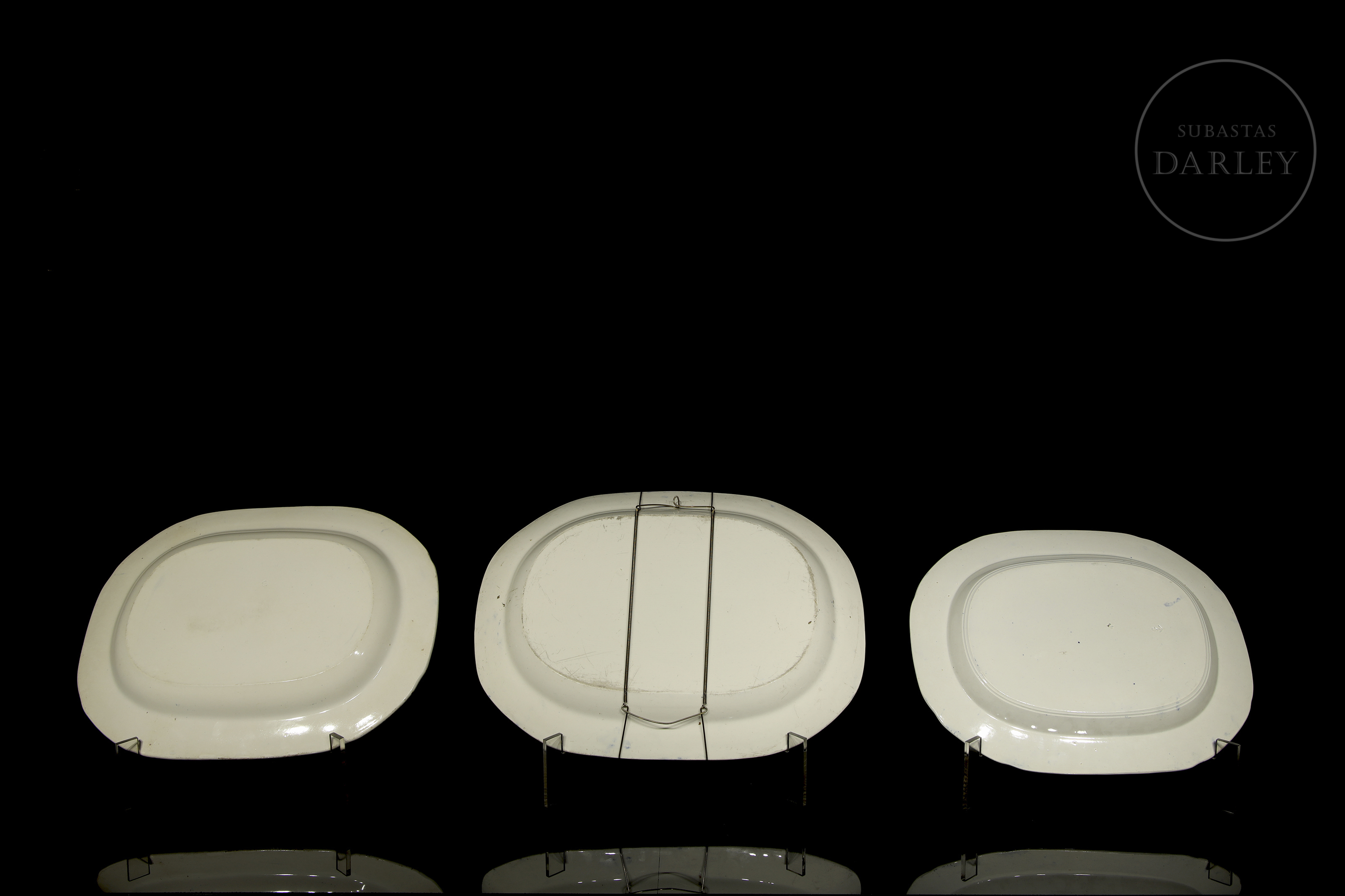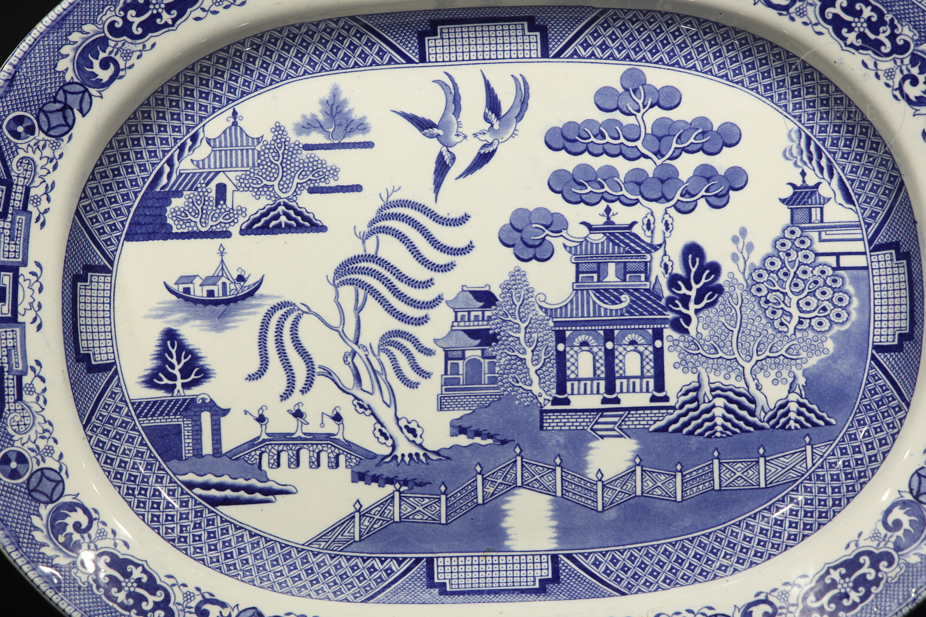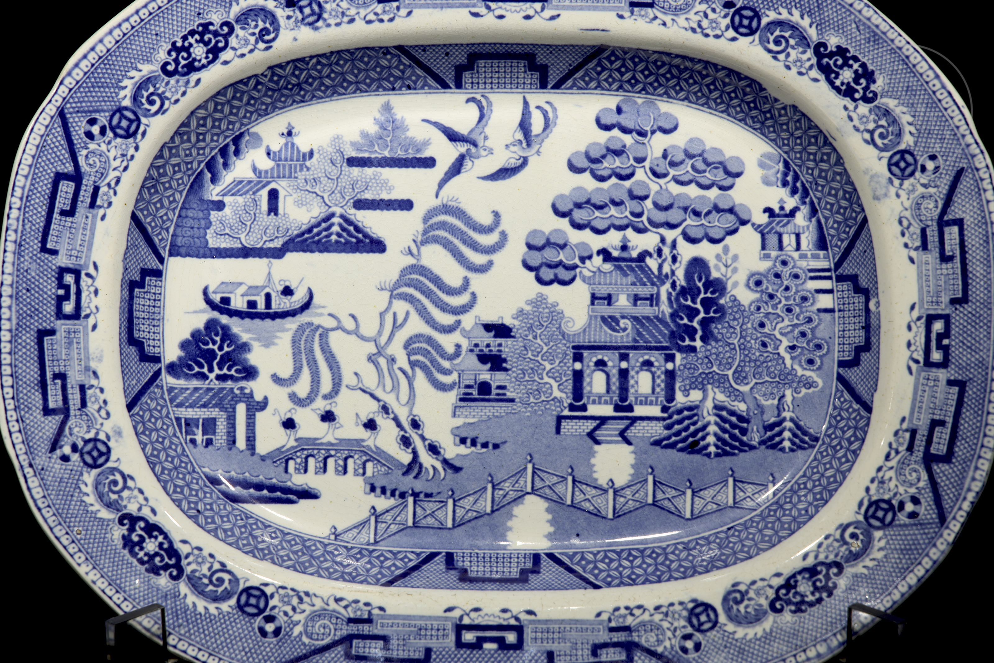 Three trays of varying sizes featuring the English Willow Pattern. This design, though inspired by Chinese porcelain, was developed in England during the late 18th and early 19th centuries.