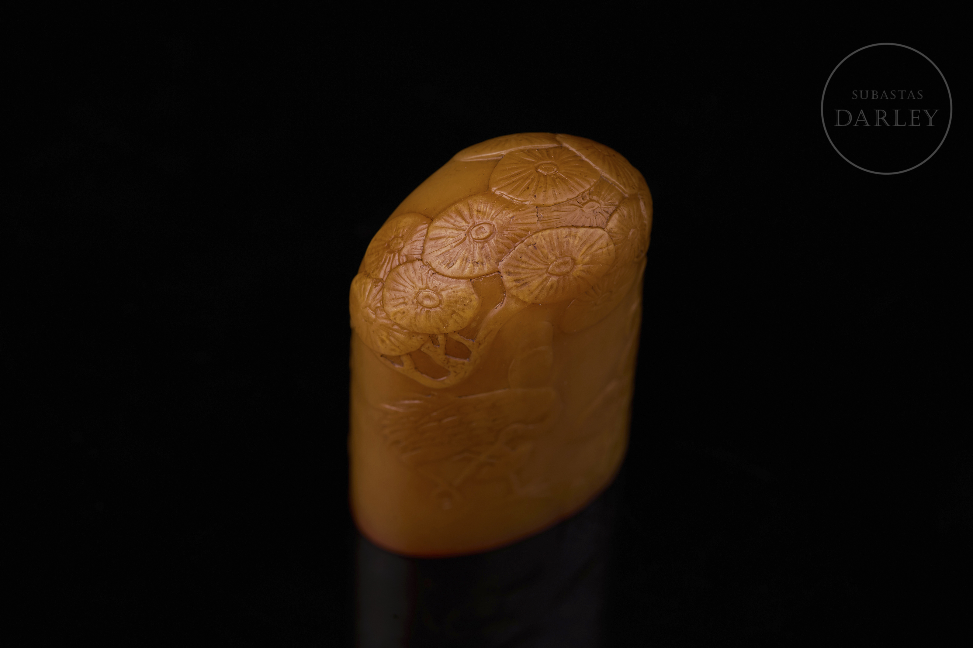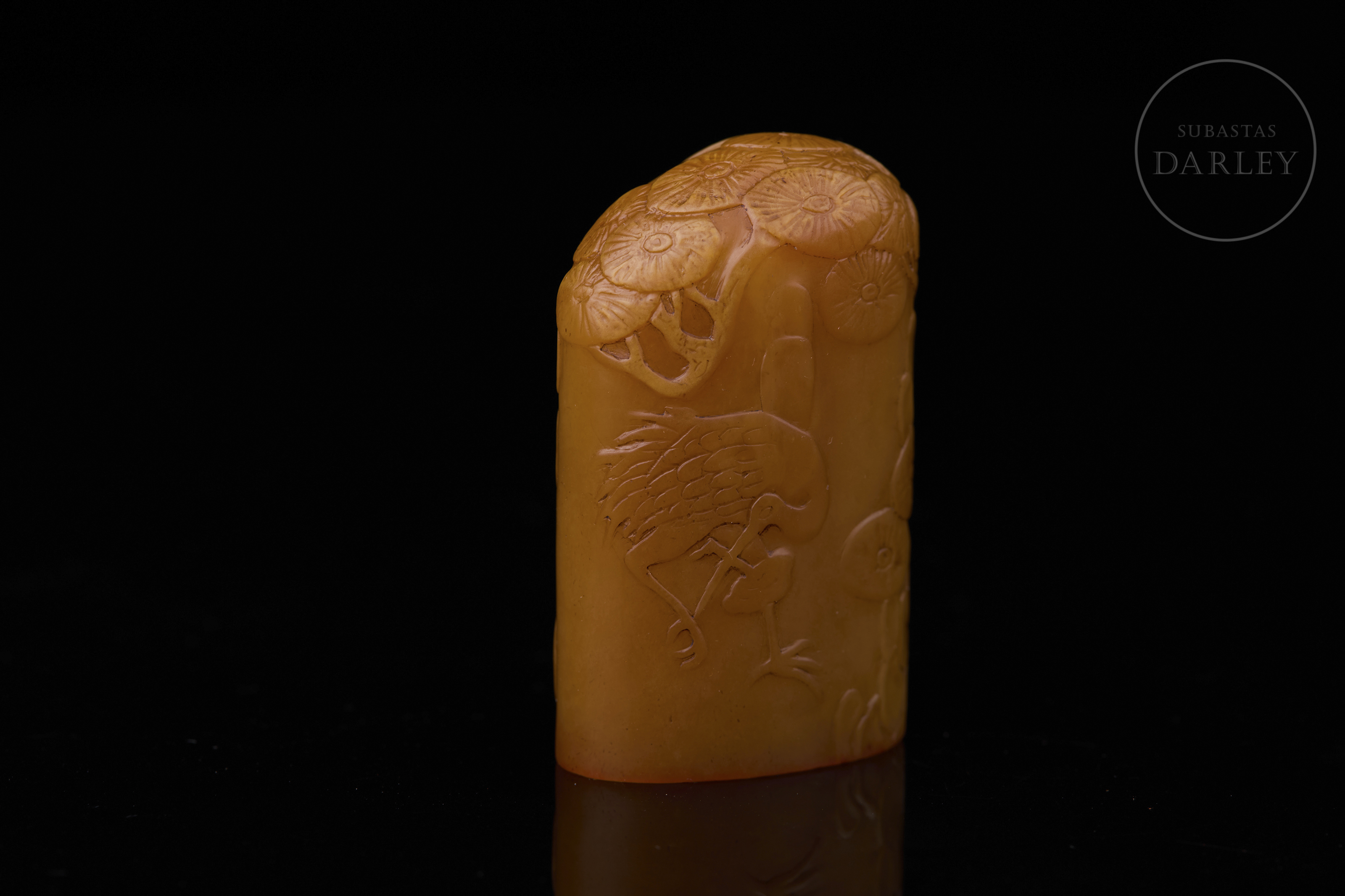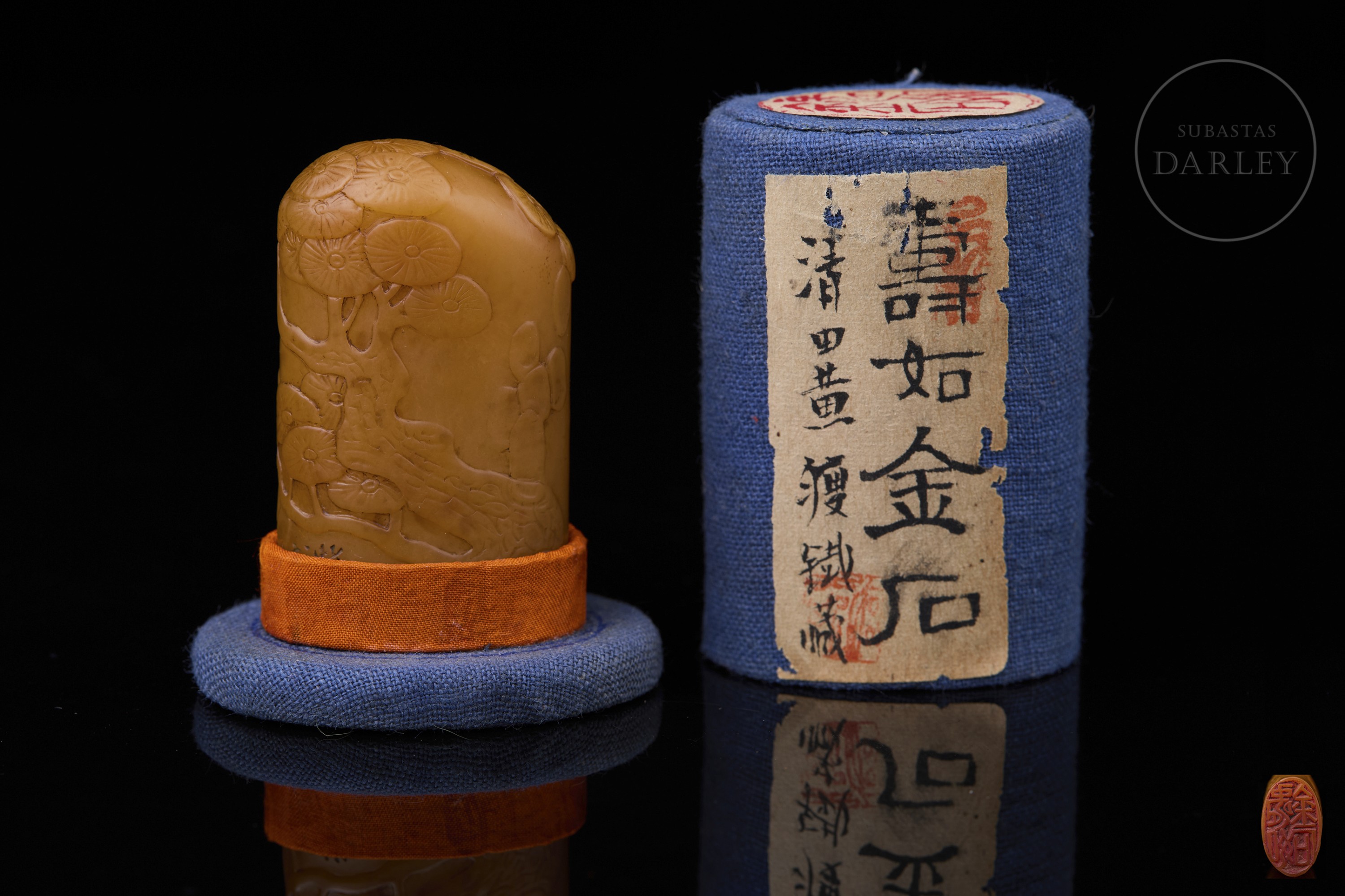 Tianhuang stone seal, honey yellow in colour with reddish veins. The shape is irregular and elongated, with a rounded top. Decorated with a relief scene of a heron among pine trees and flowers, with the signature ‘牧甫’ engraved on one side. The matrix shows engraved characters ‘蠶如金石’. With a cylindrical box lined with cloth and a label “蠶如金石” ‘清田黄薄钱藏’. Qing dynasty (1644–1912).