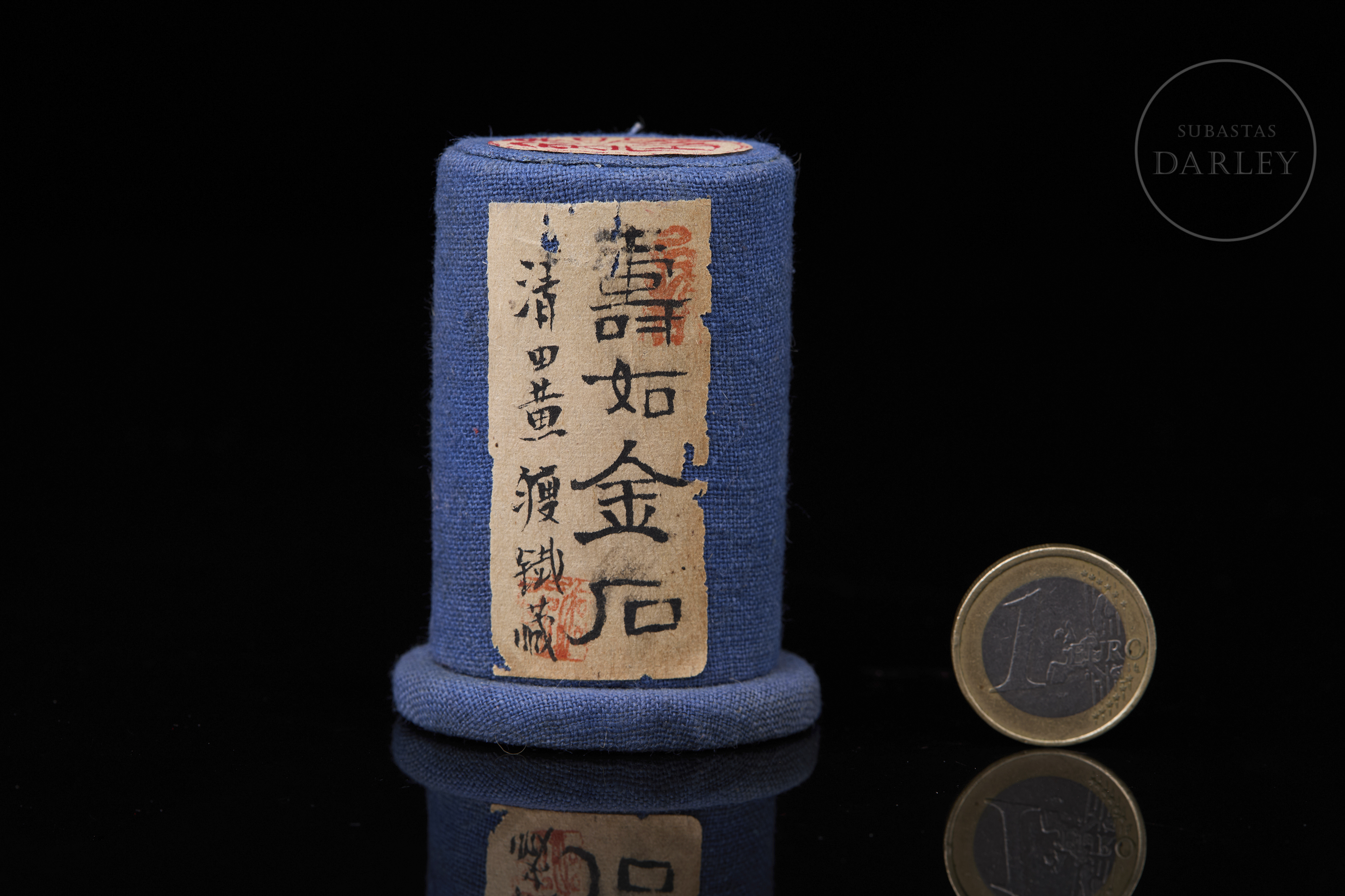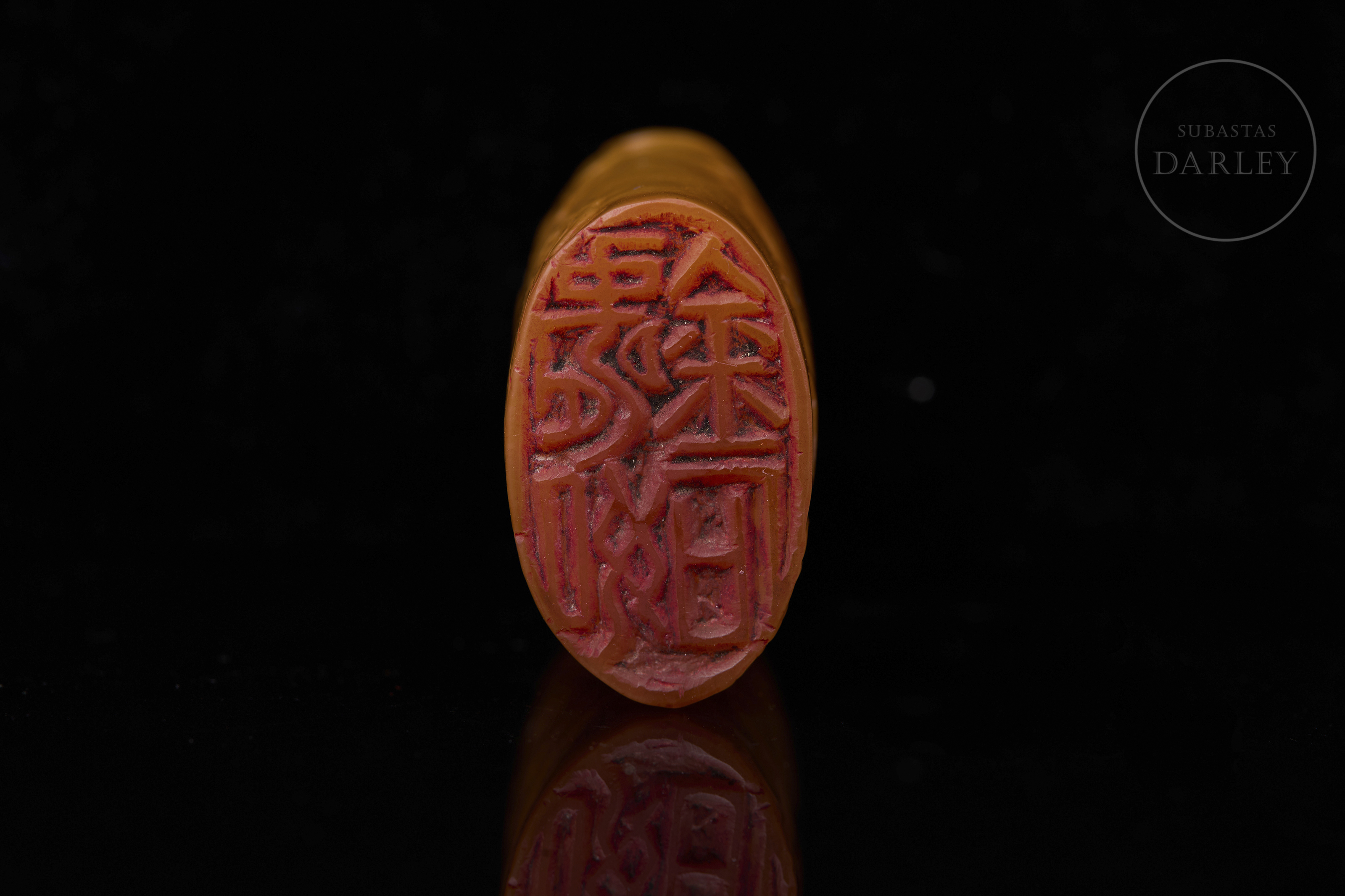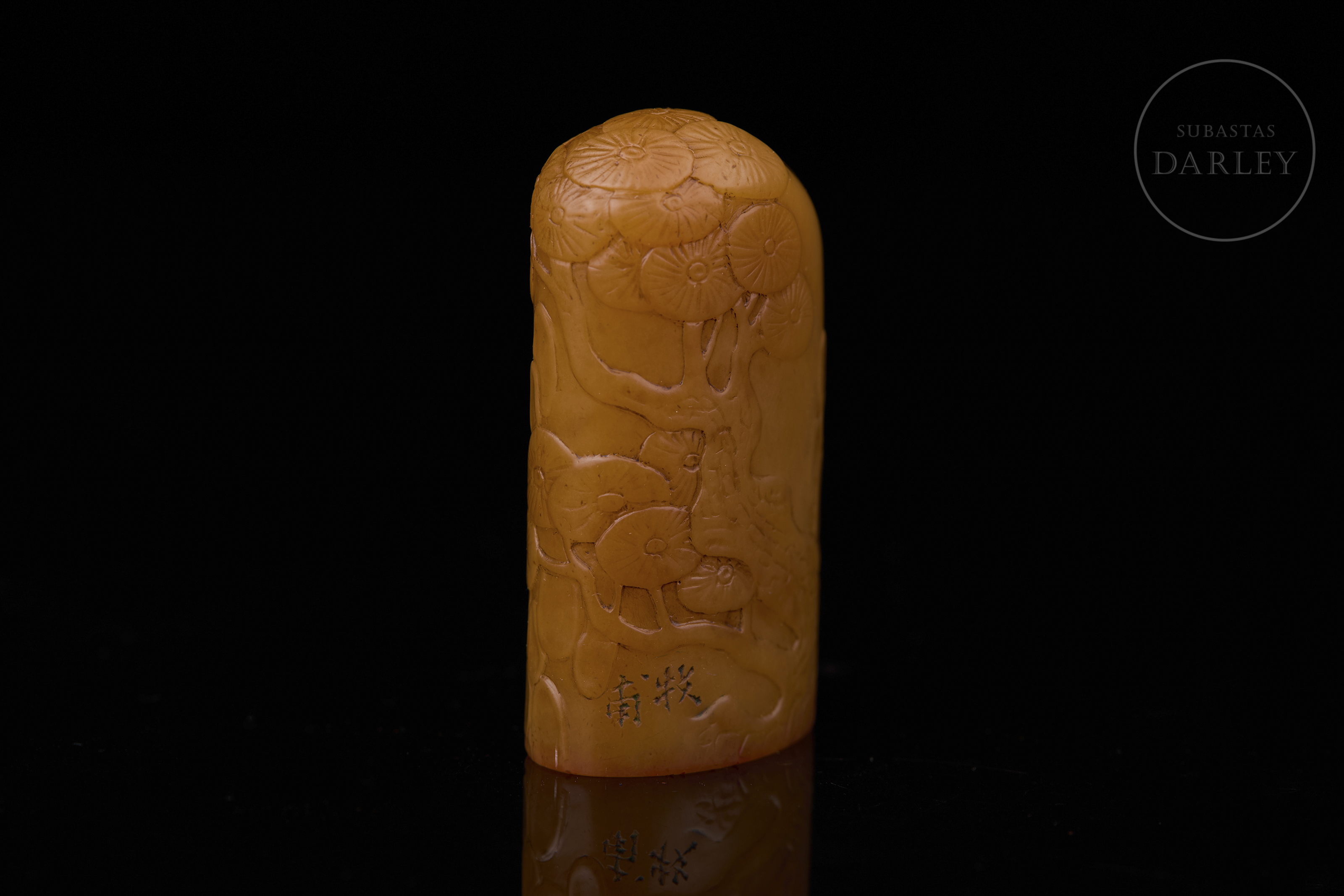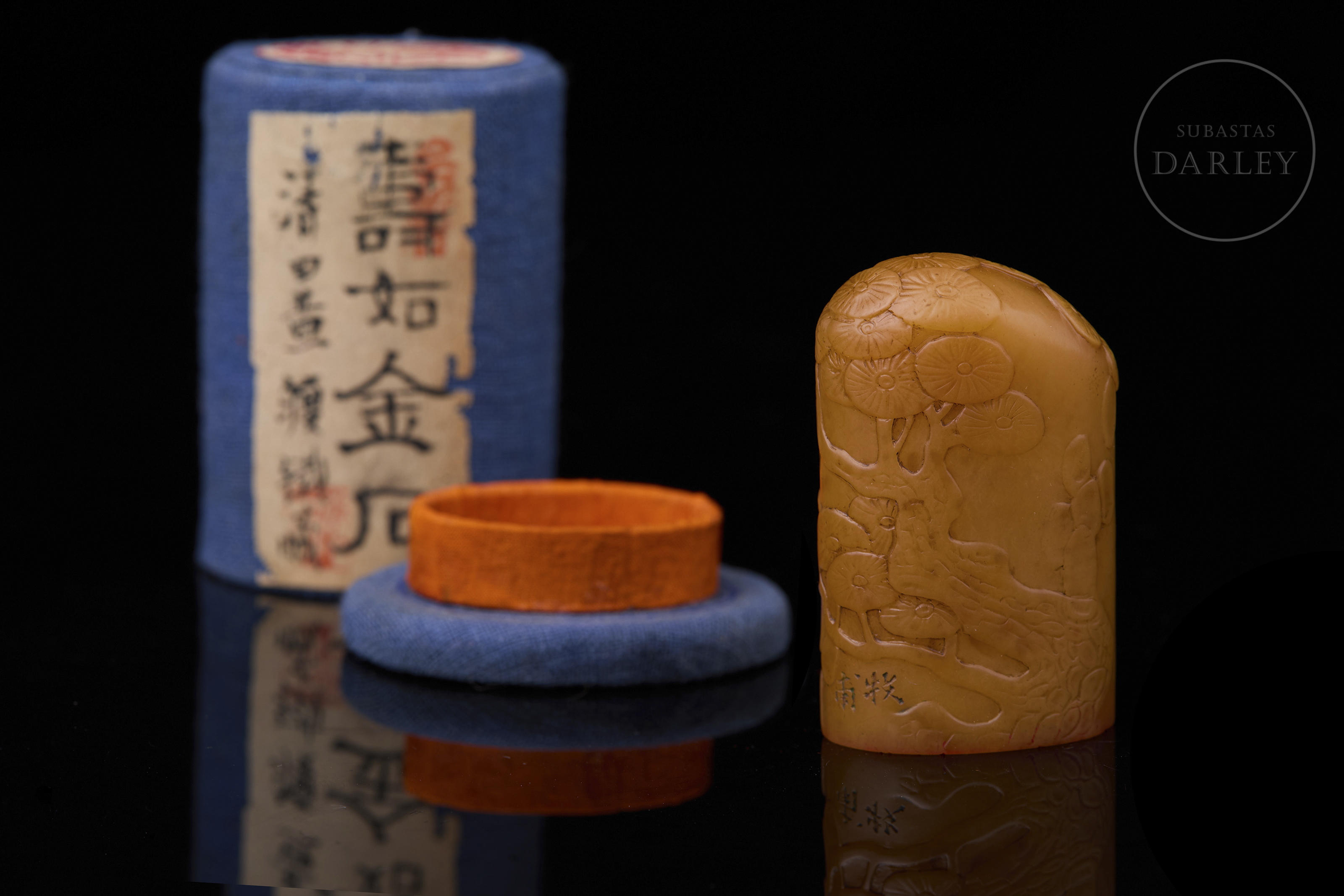 Tianhuang stone seal, honey yellow in colour with reddish veins. The shape is irregular and elongated, with a rounded top. Decorated with a relief scene of a heron among pine trees and flowers, with the signature ‘牧甫’ engraved on one side. The matrix shows engraved characters ‘蠶如金石’. With a cylindrical box lined with cloth and a label “蠶如金石” ‘清田黄薄钱藏’. Qing dynasty (1644–1912).