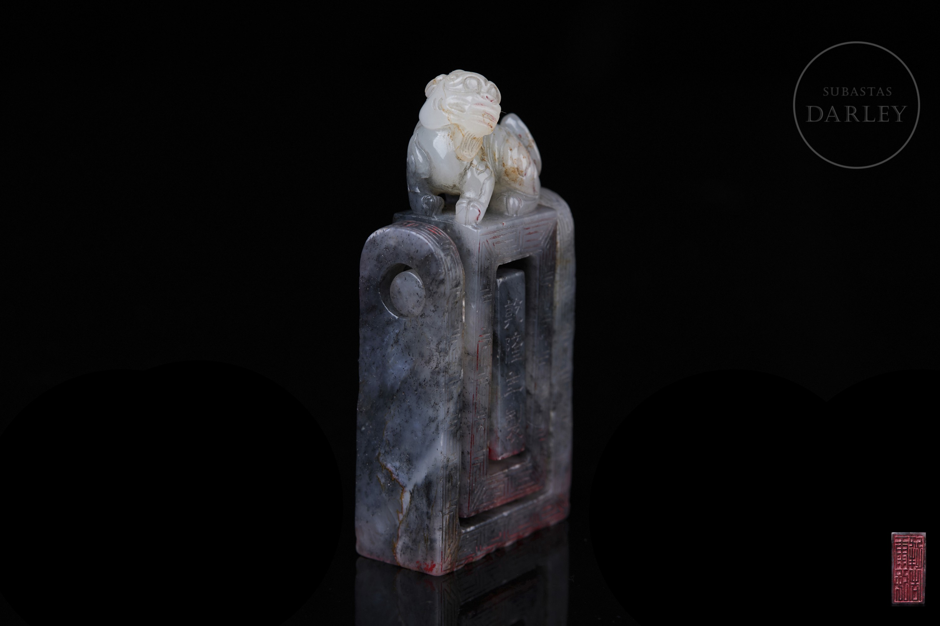 Jade with an attractive combination of greyish tones veined with white and ochre spots. It stands out for its complex mechanical structure, consisting of an articulated outer support that houses a rotating shaft with three independent sealing faces inside. The upper finial is dominated by a mythical lion. The central body of the seal has a frame structure decorated with engraved archaic fretwork. Qing dynasty (1644–1911).