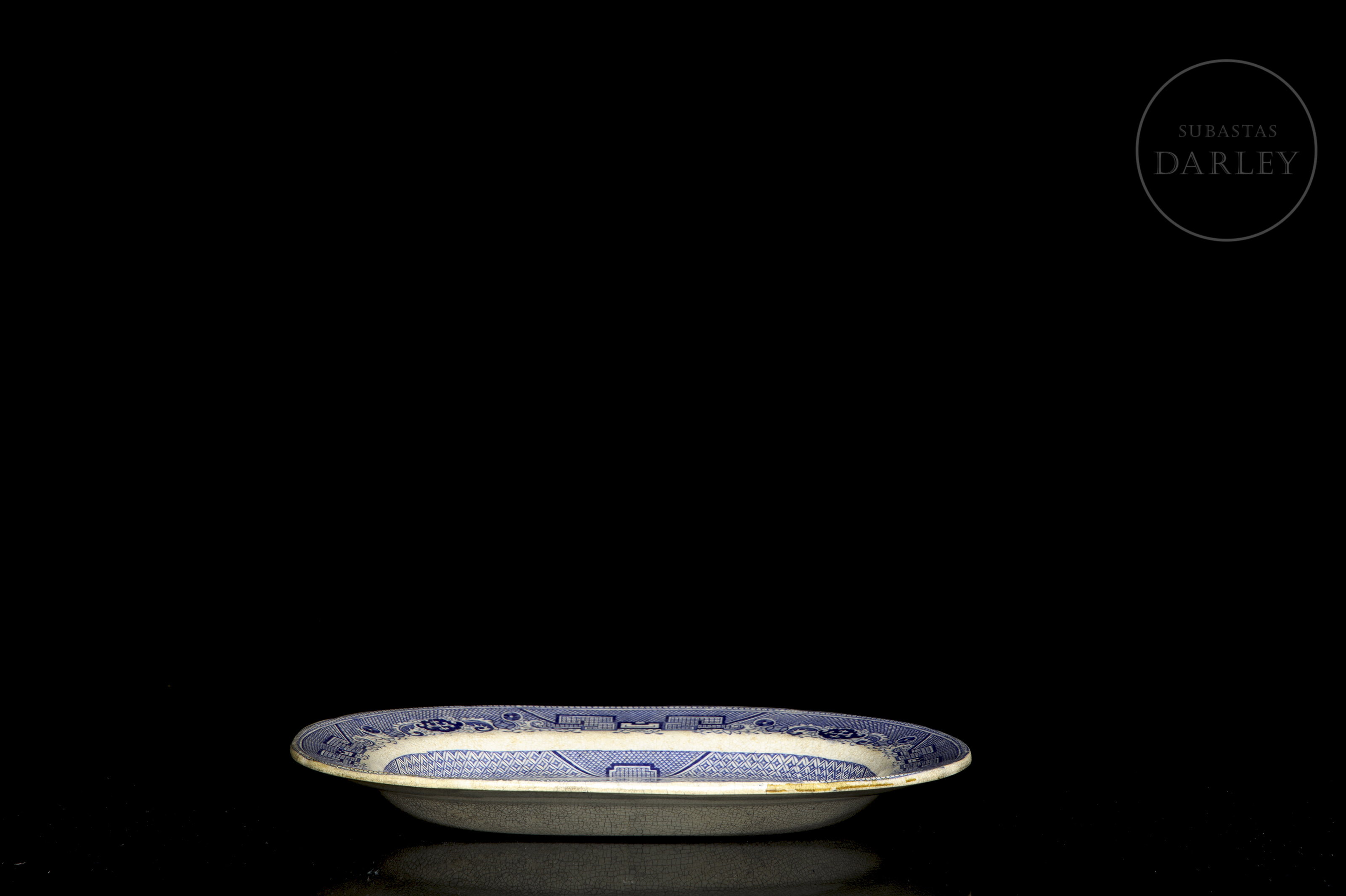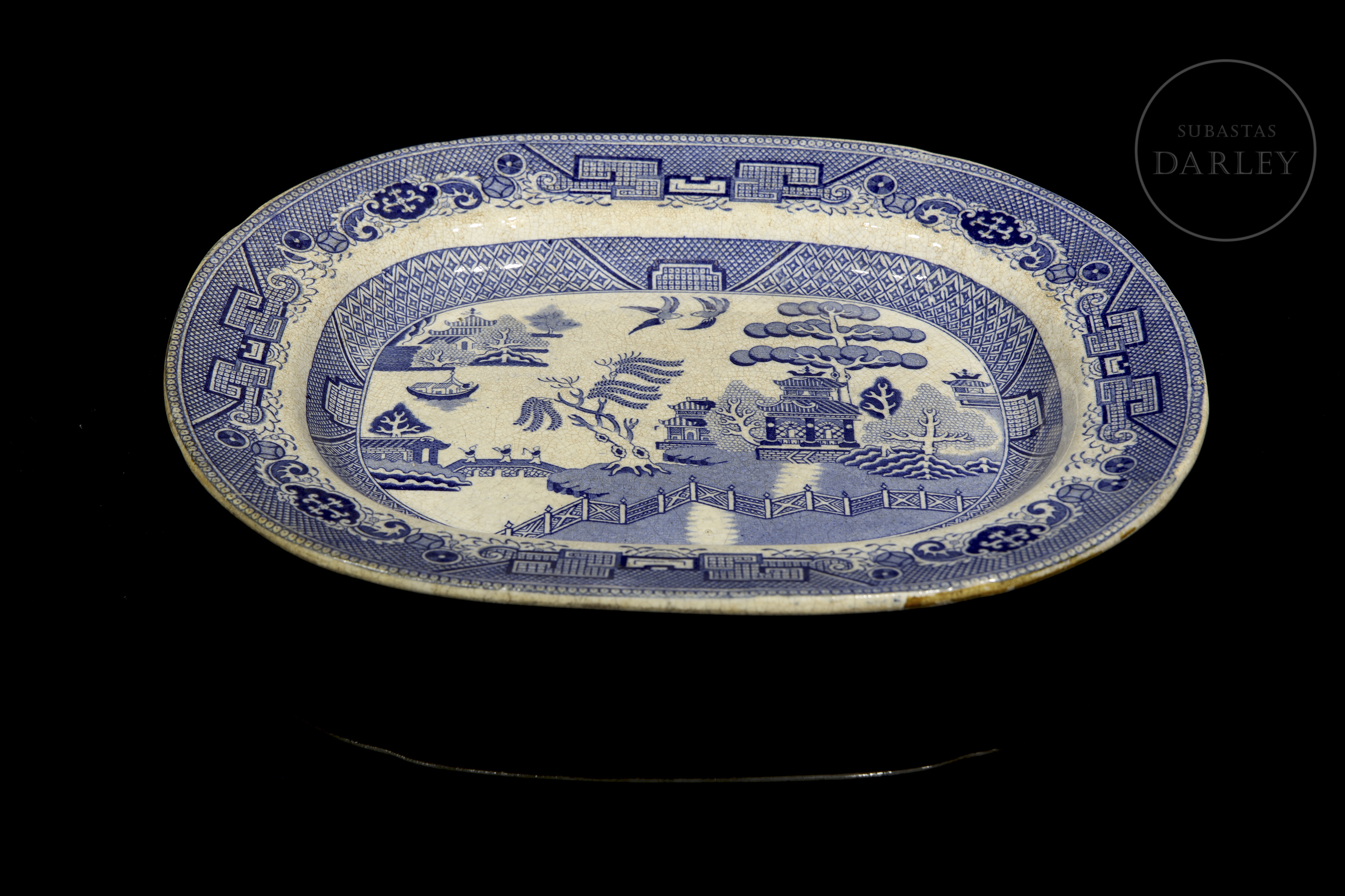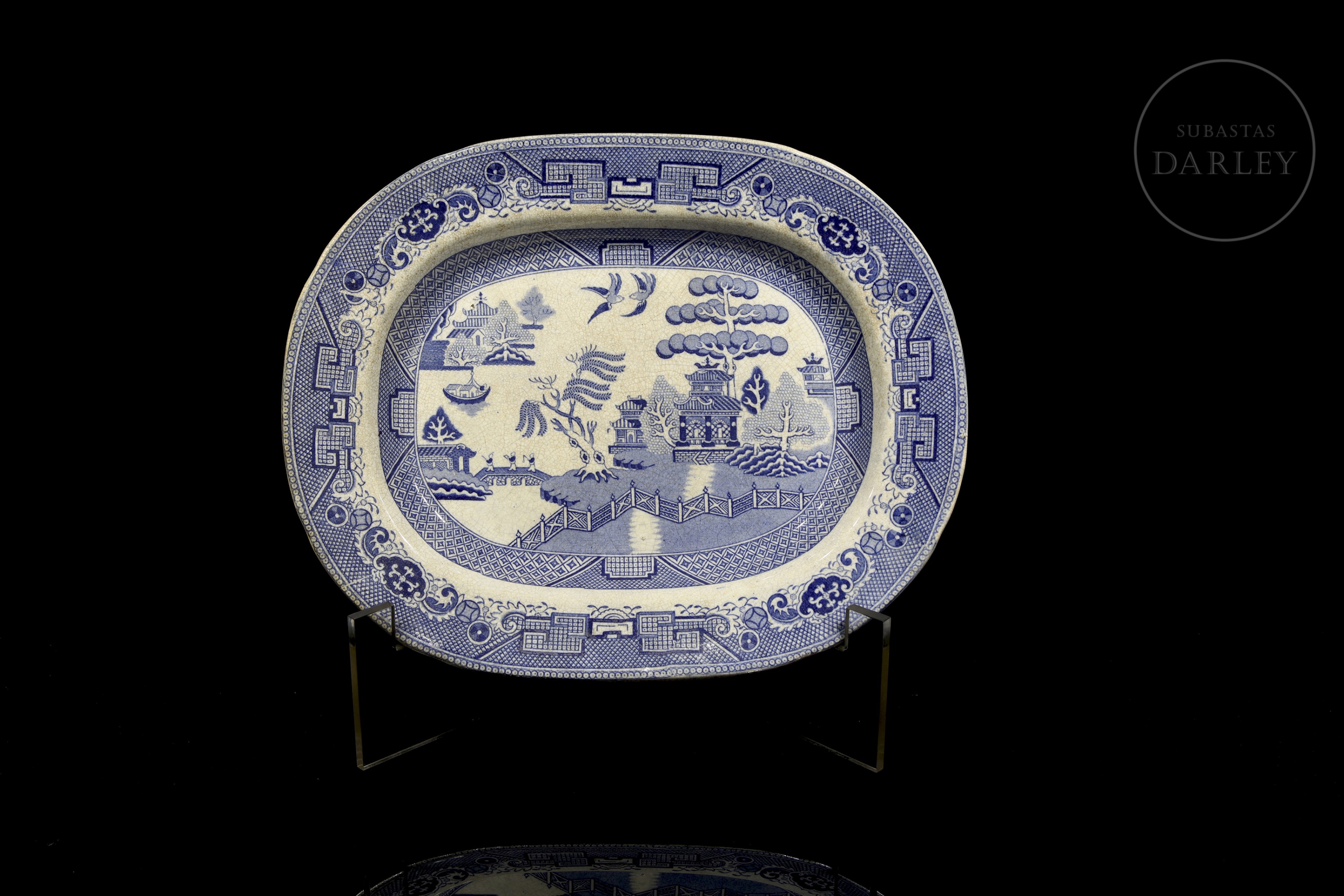 Tray with Willow pattern design by English ceramics firm Samuel Barker & Son. The company was active from 1839 to 1893 and operated from Don Pottery in Swinton, Yorkshire, England.