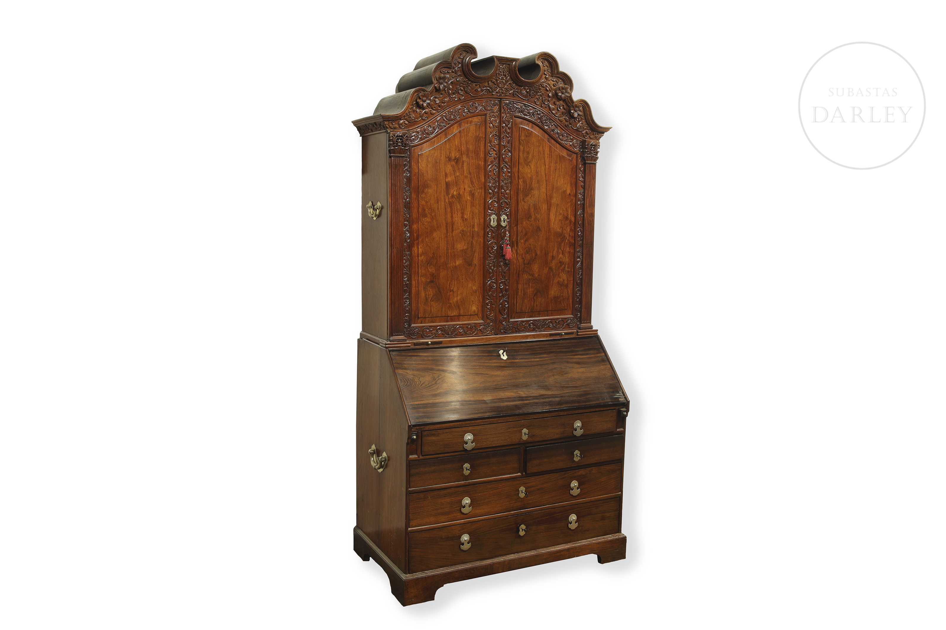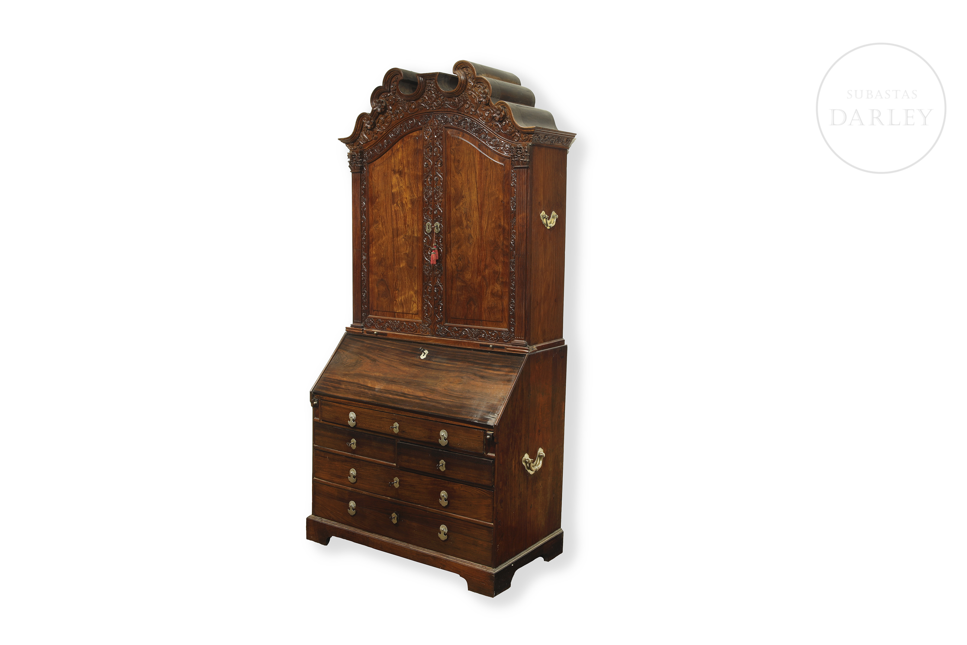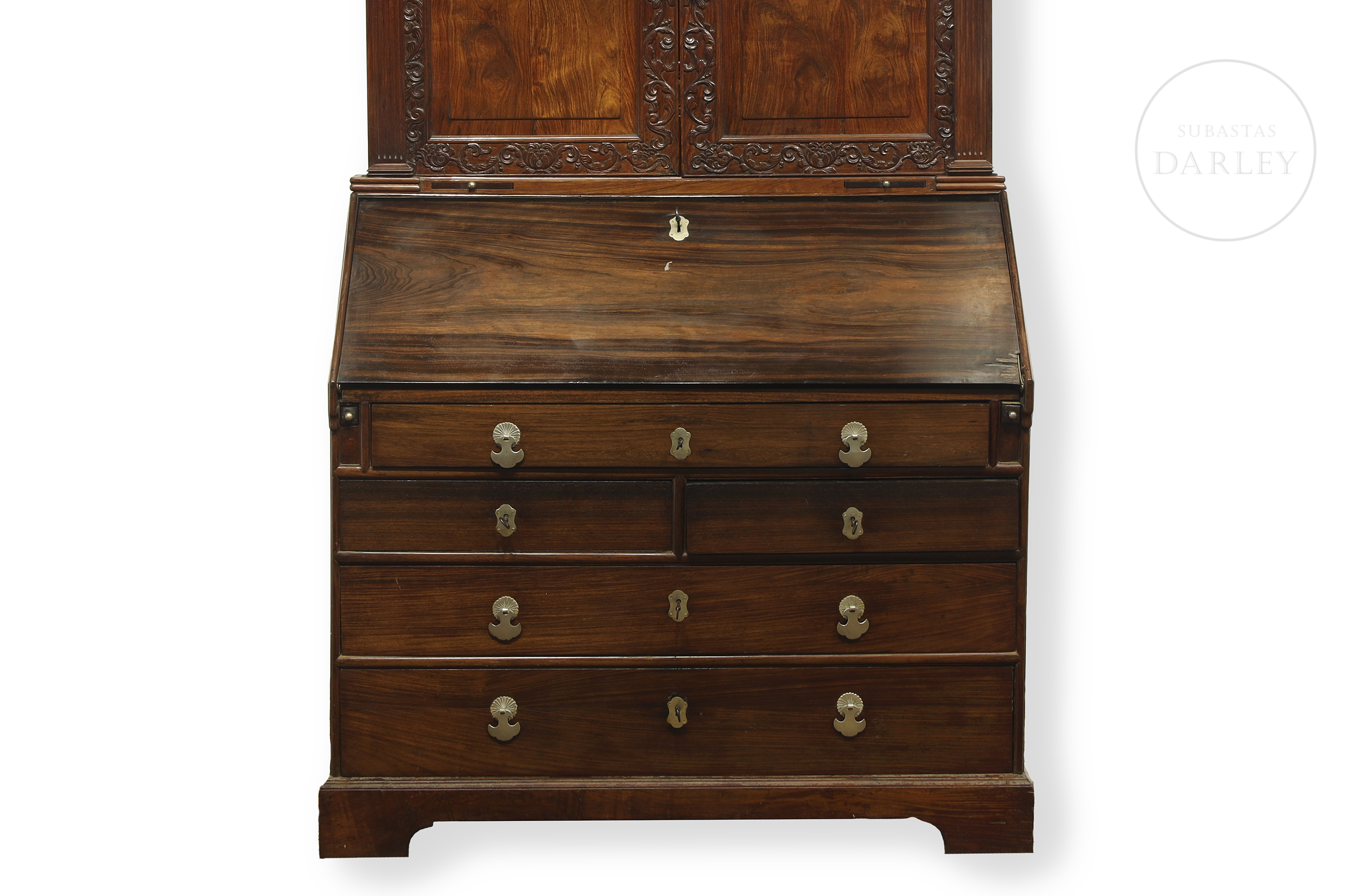 Two-piece secretary desk, modelled on the Chippendale style (18th century). The lower section is a desk with a drop-leaf top and drawers. The upper section is a display cabinet with two doors carved with rocaille and floral designs, topped with an openwork cornice.