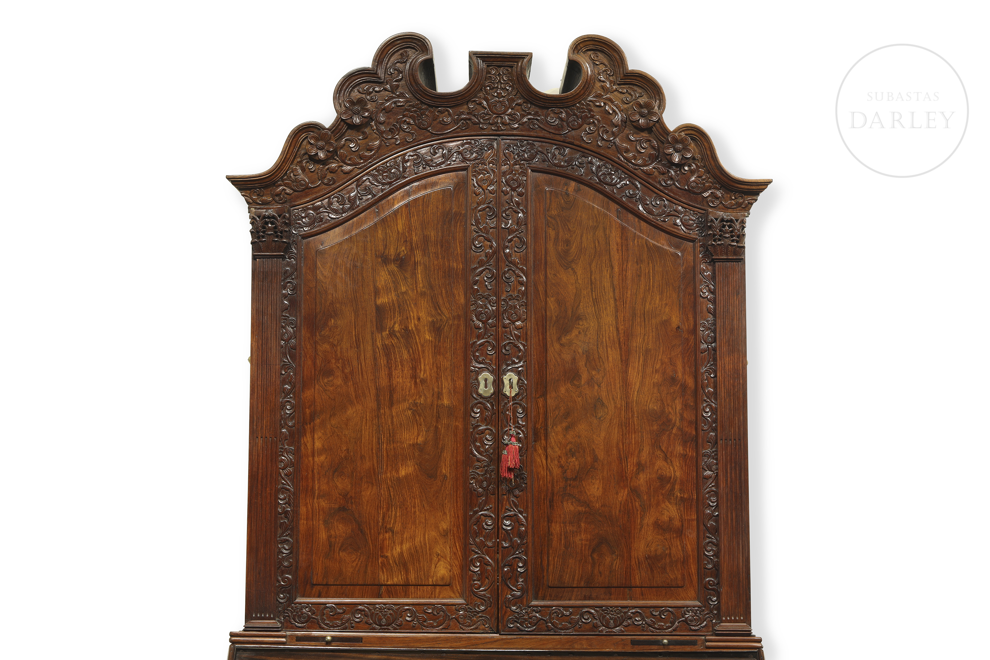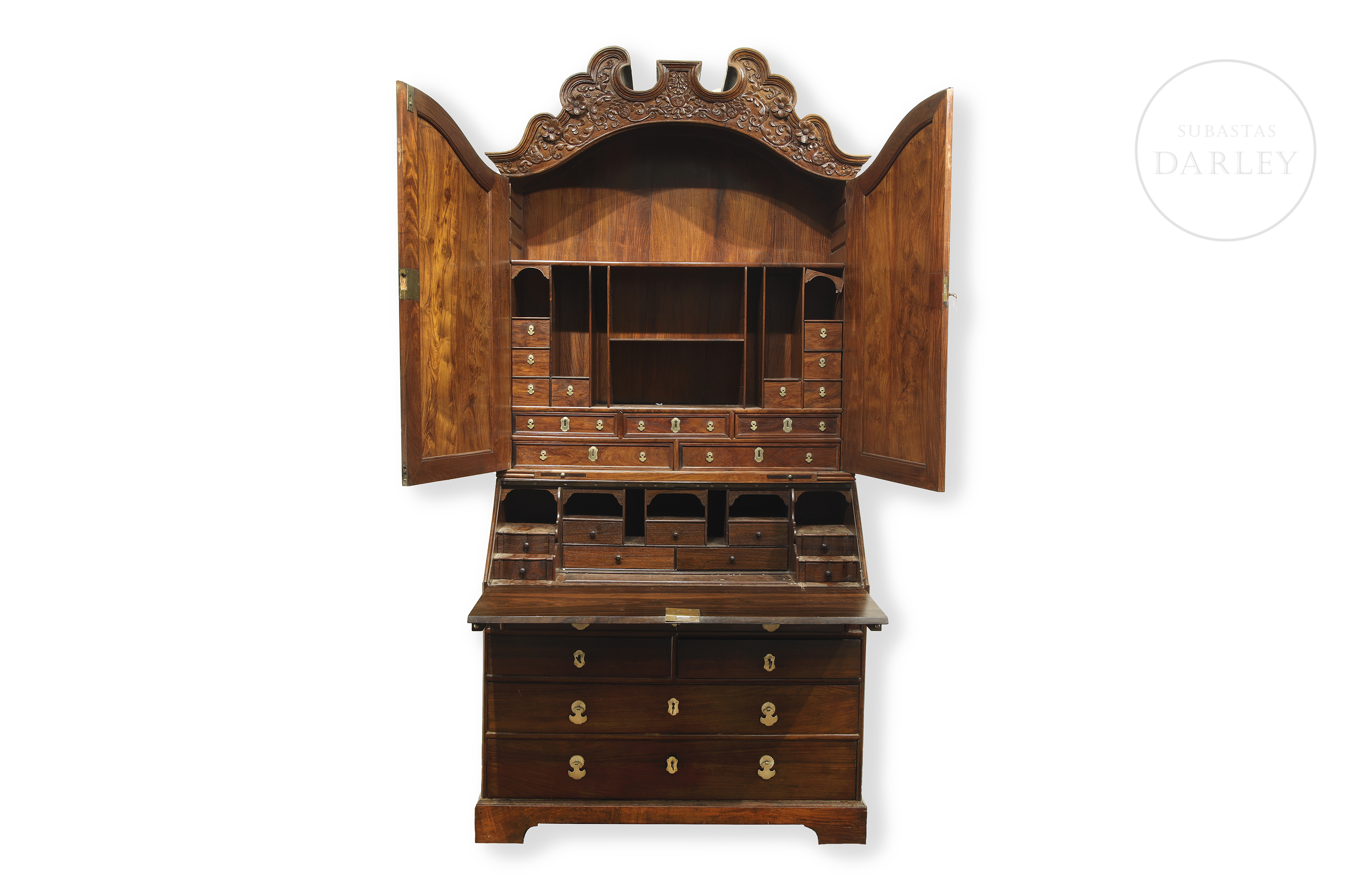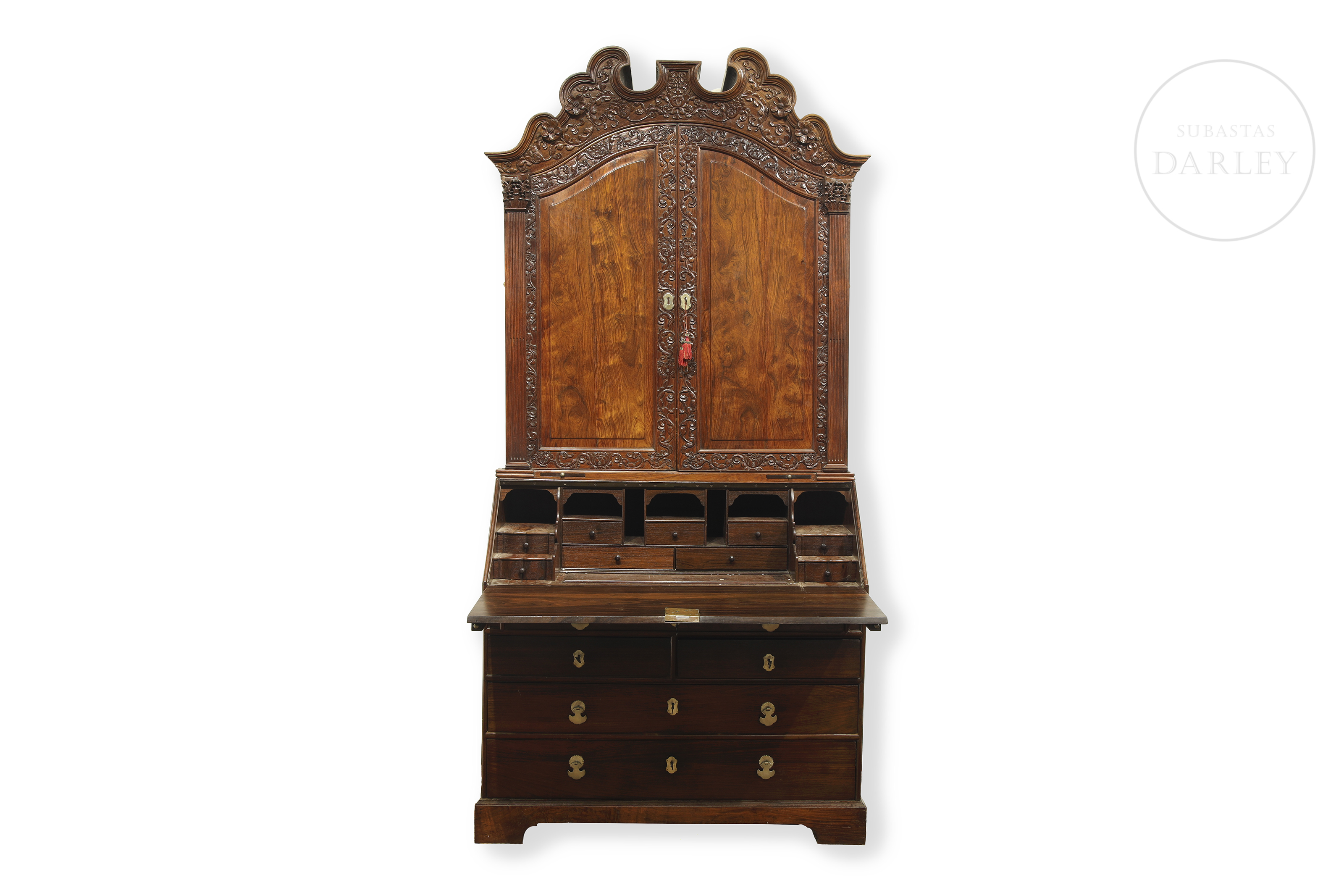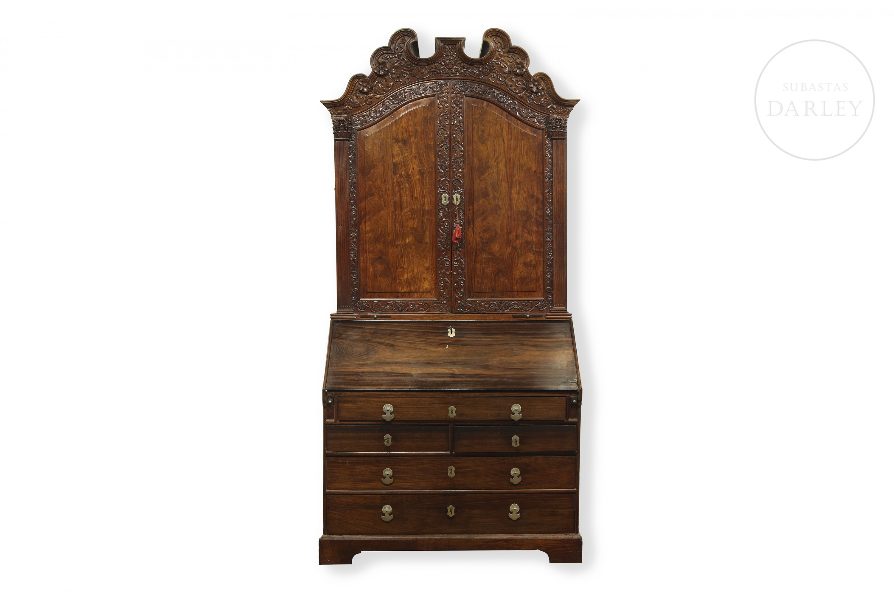 Two-piece secretary desk, modelled on the Chippendale style (18th century). The lower section is a desk with a drop-leaf top and drawers. The upper section is a display cabinet with two doors carved with rocaille and floral designs, topped with an openwork cornice.