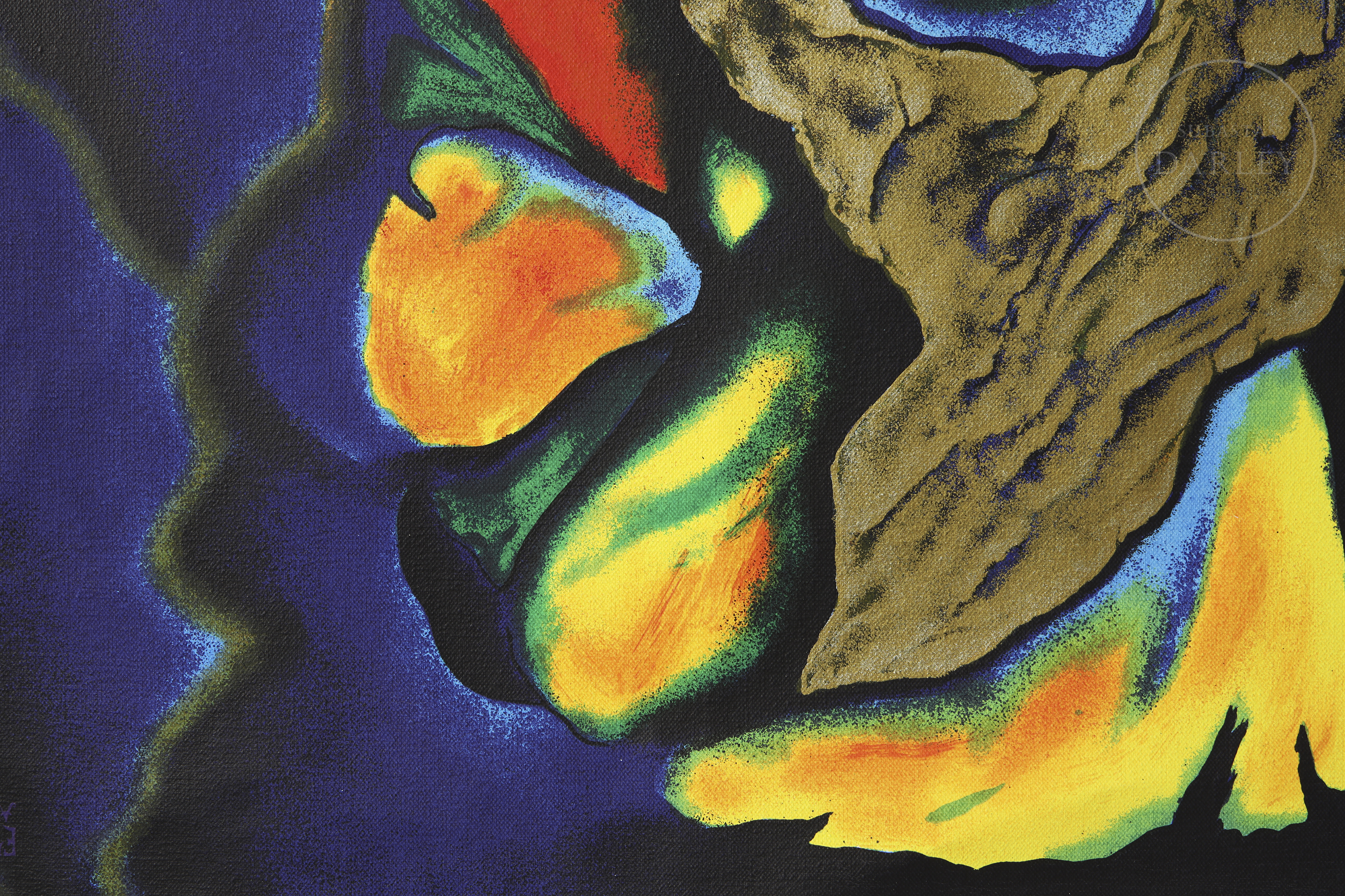 Mixed media on canvas. Abstract composition formed by different high-contrast chromatic elements. Signed in the lower right corner and inscribed ‘Fuera de Serie’ in the lower left corner.