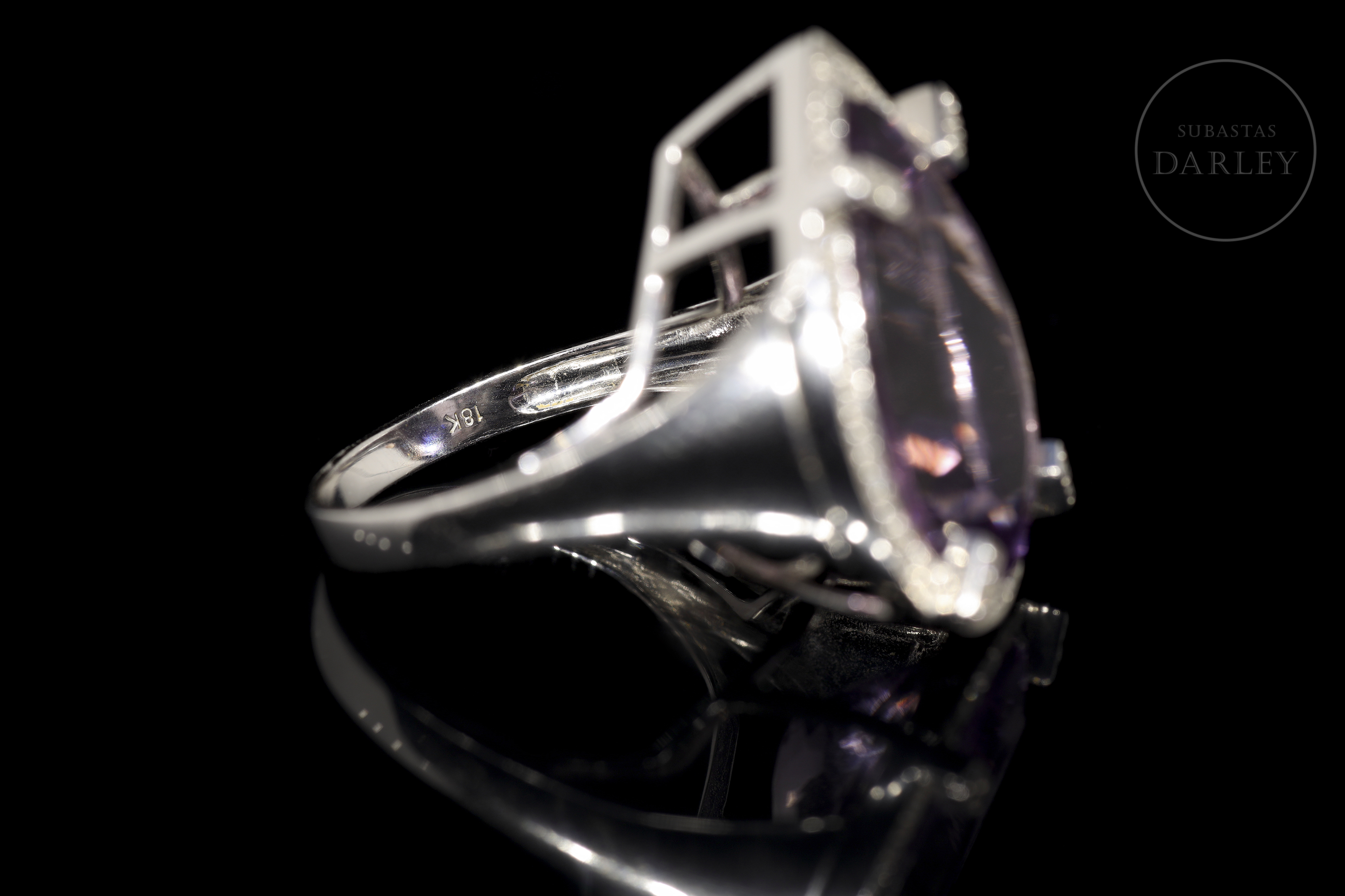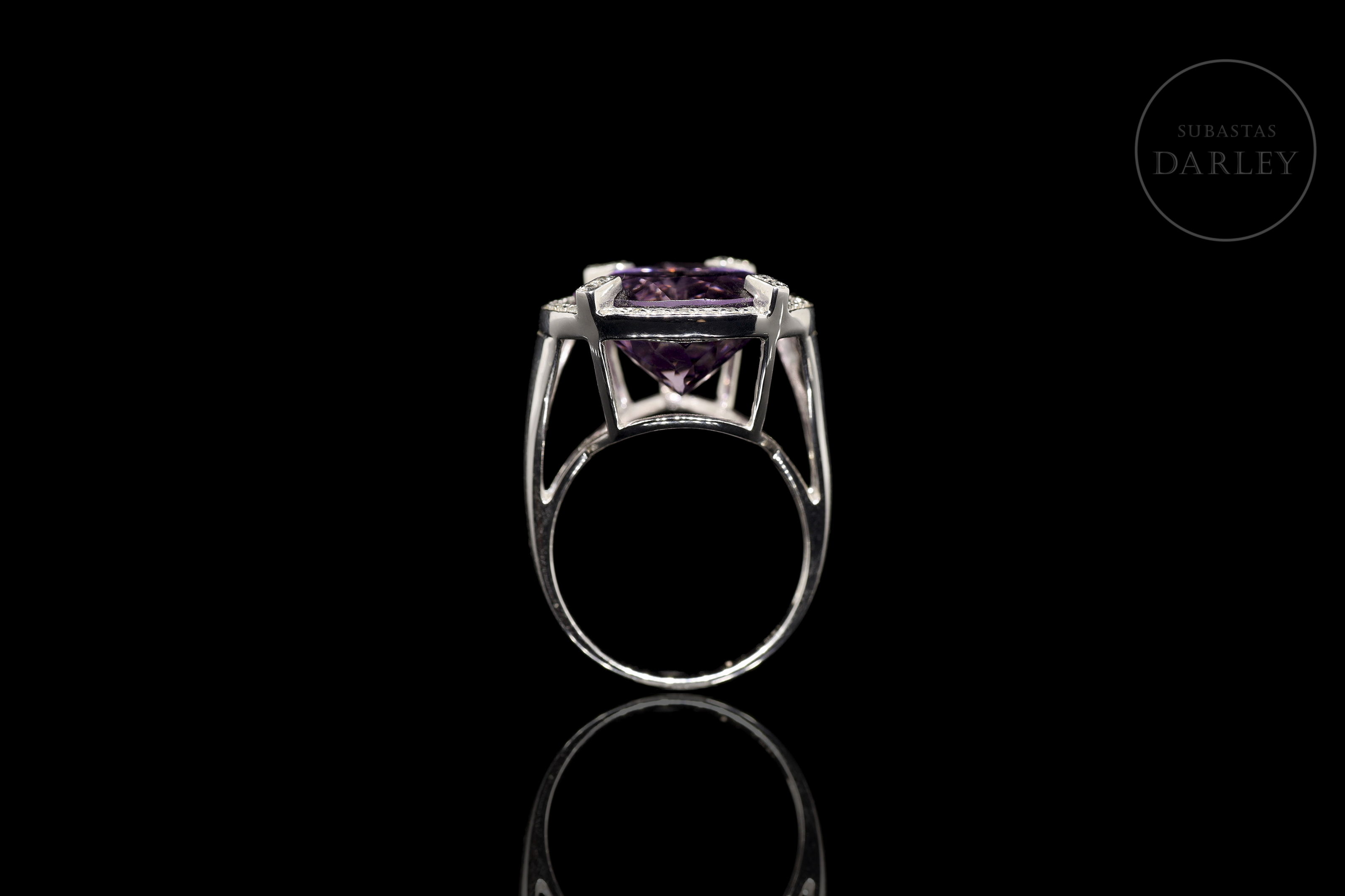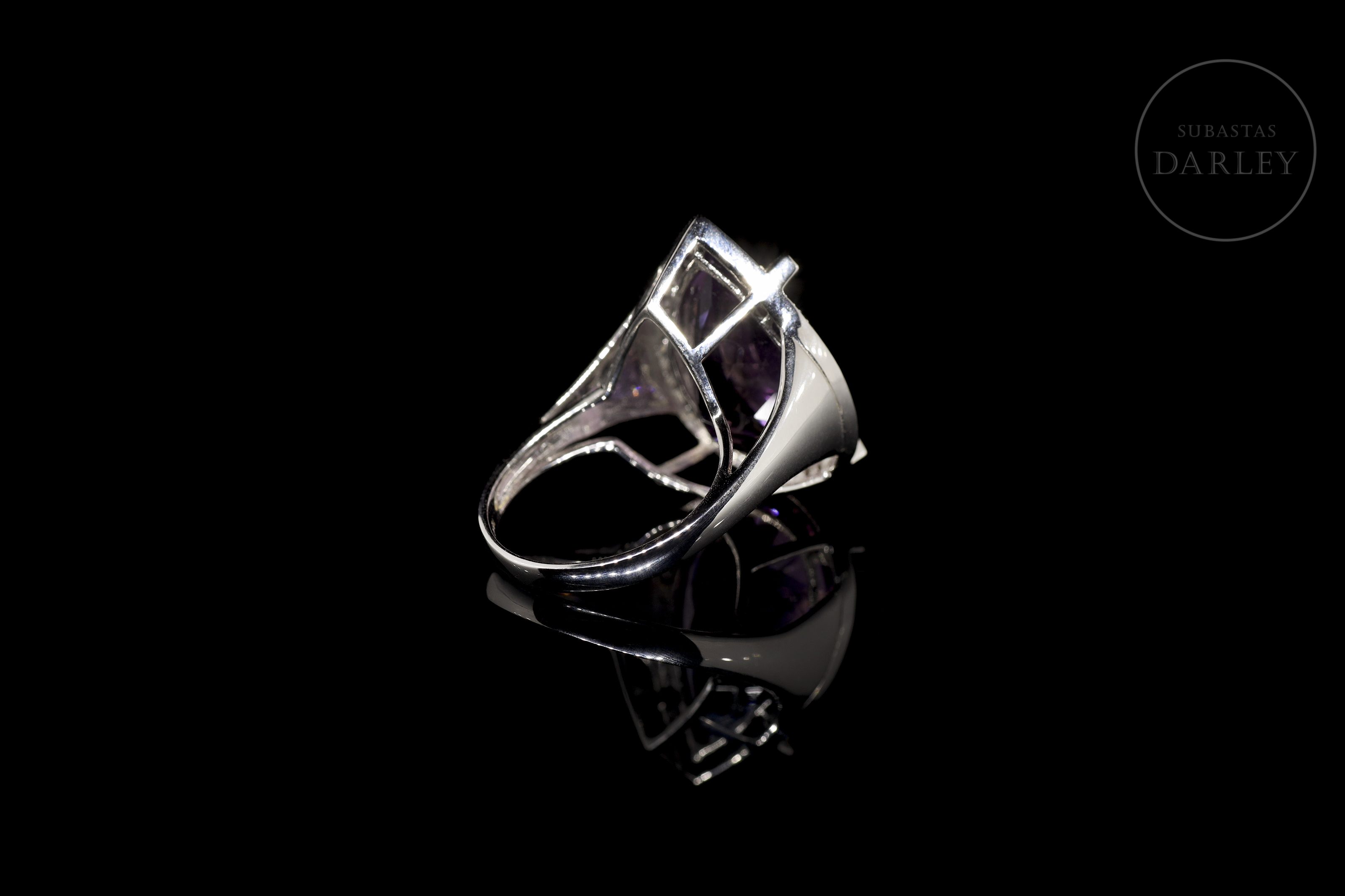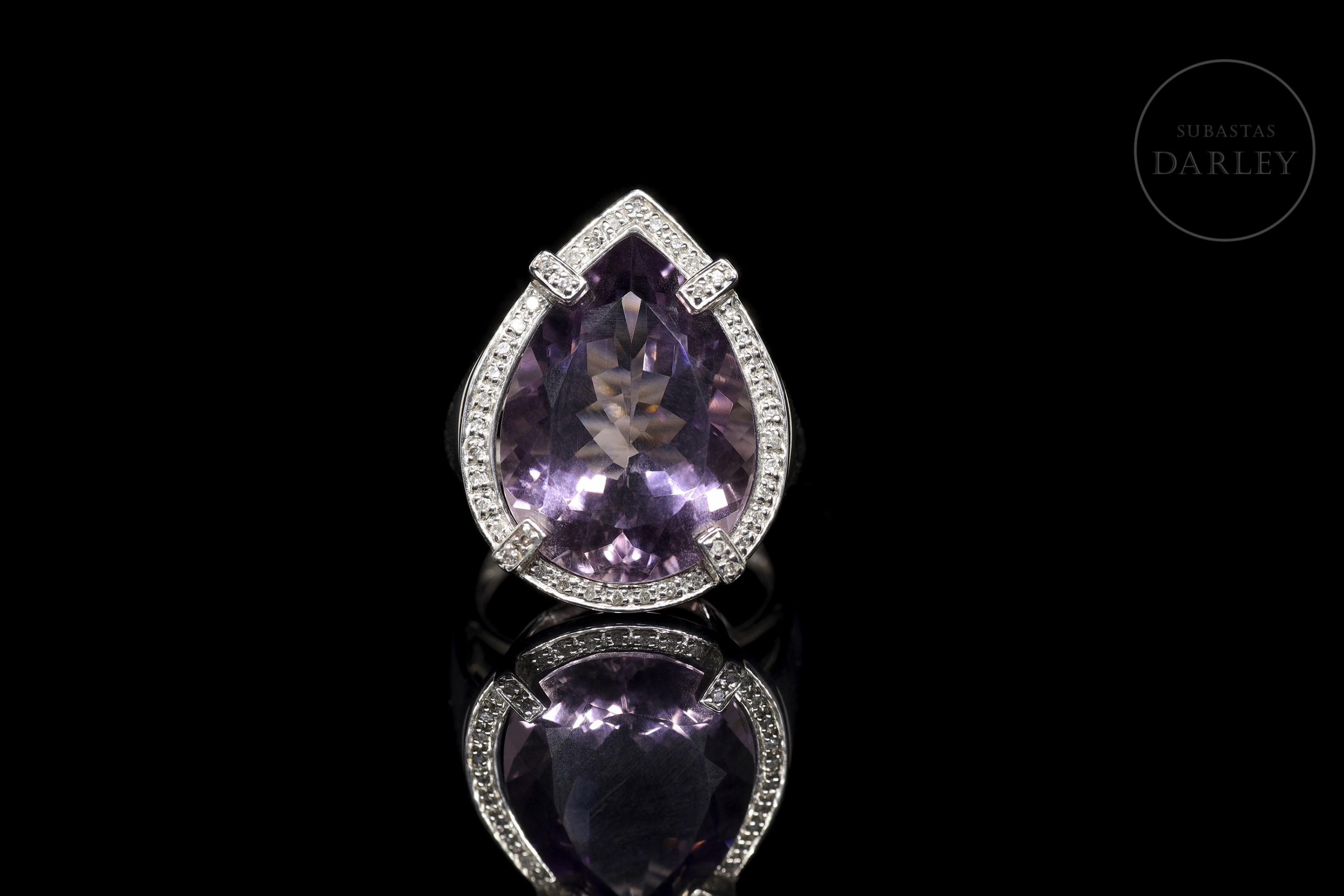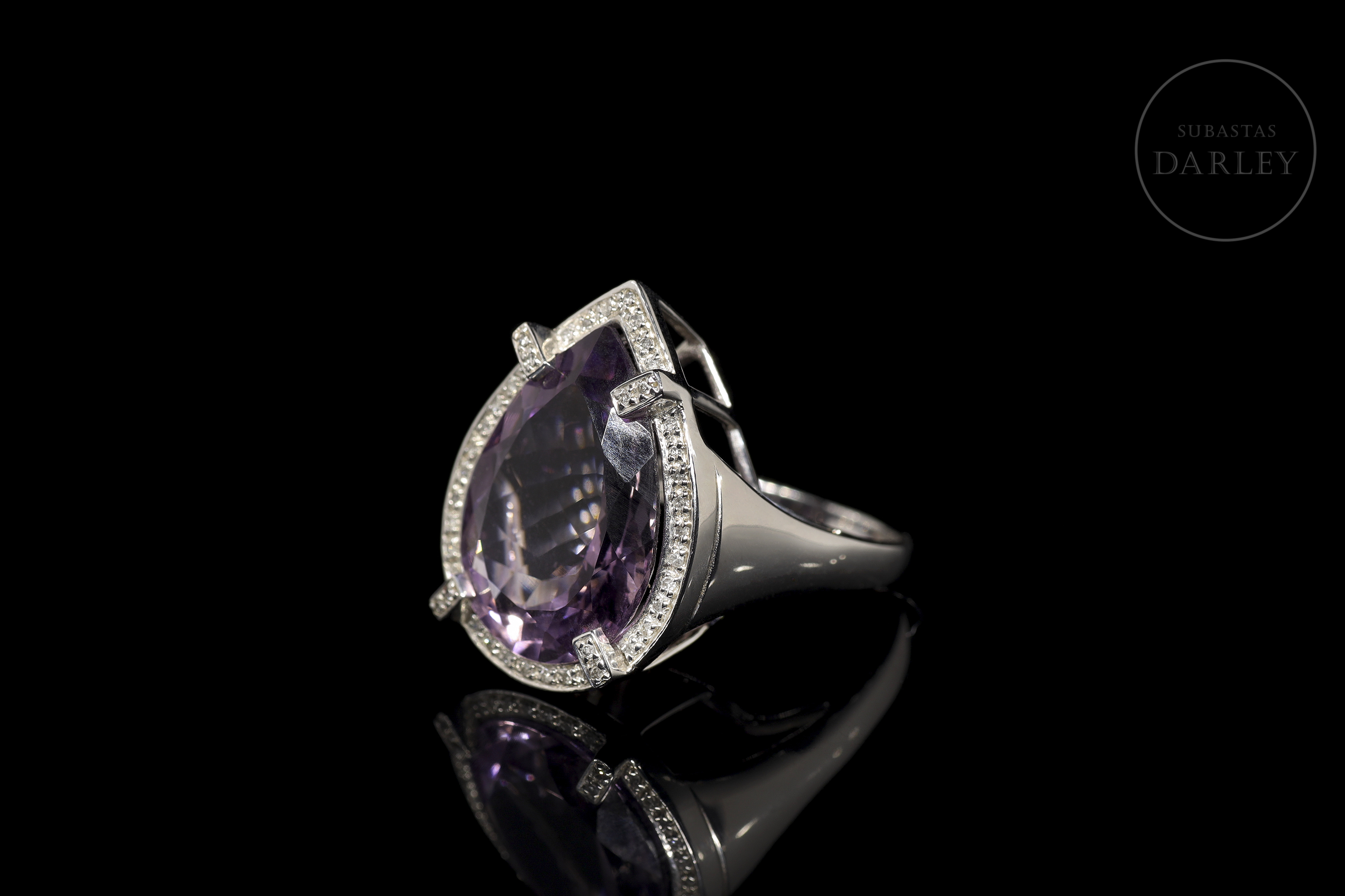 Flat arm ring with wide shoulders, dominated by a faceted pear-shaped dark purple amethyst weighing approximately 12.50 ct. It is finished with a bezel decorated with 42 brilliant-cut diamonds set in claws, from which four clamp-shaped claws emerge.