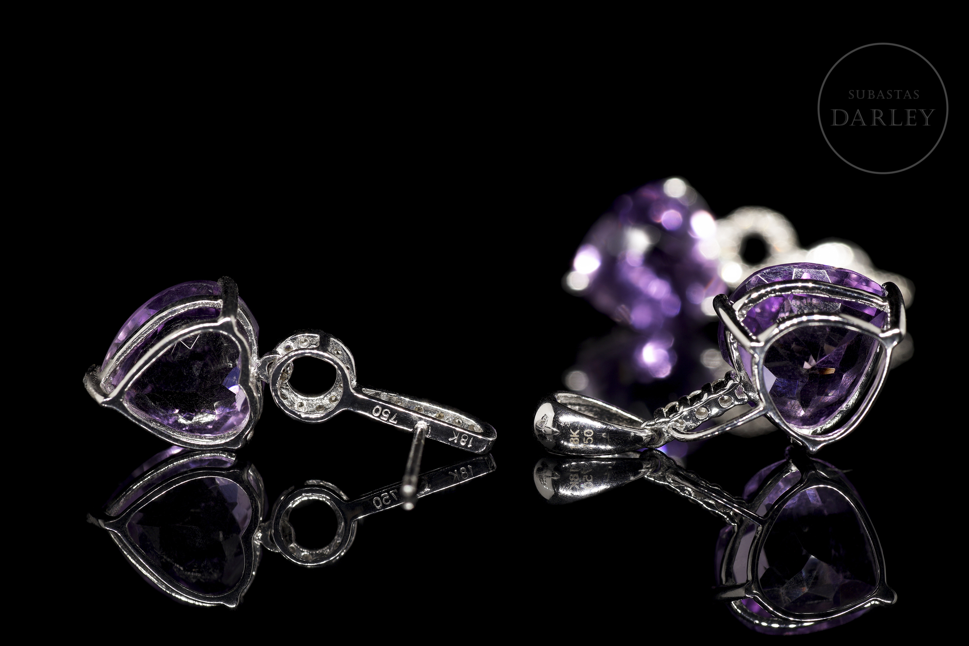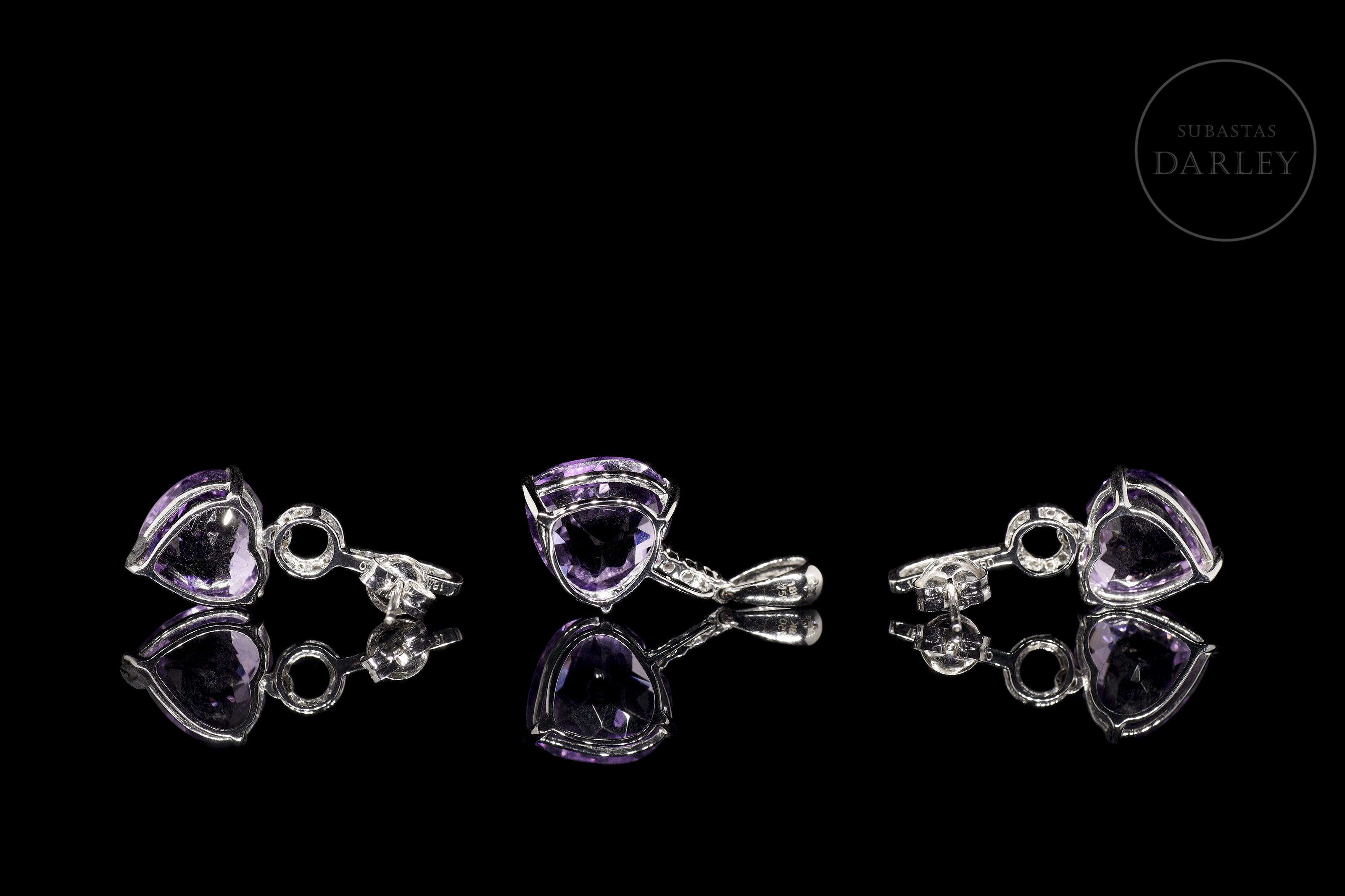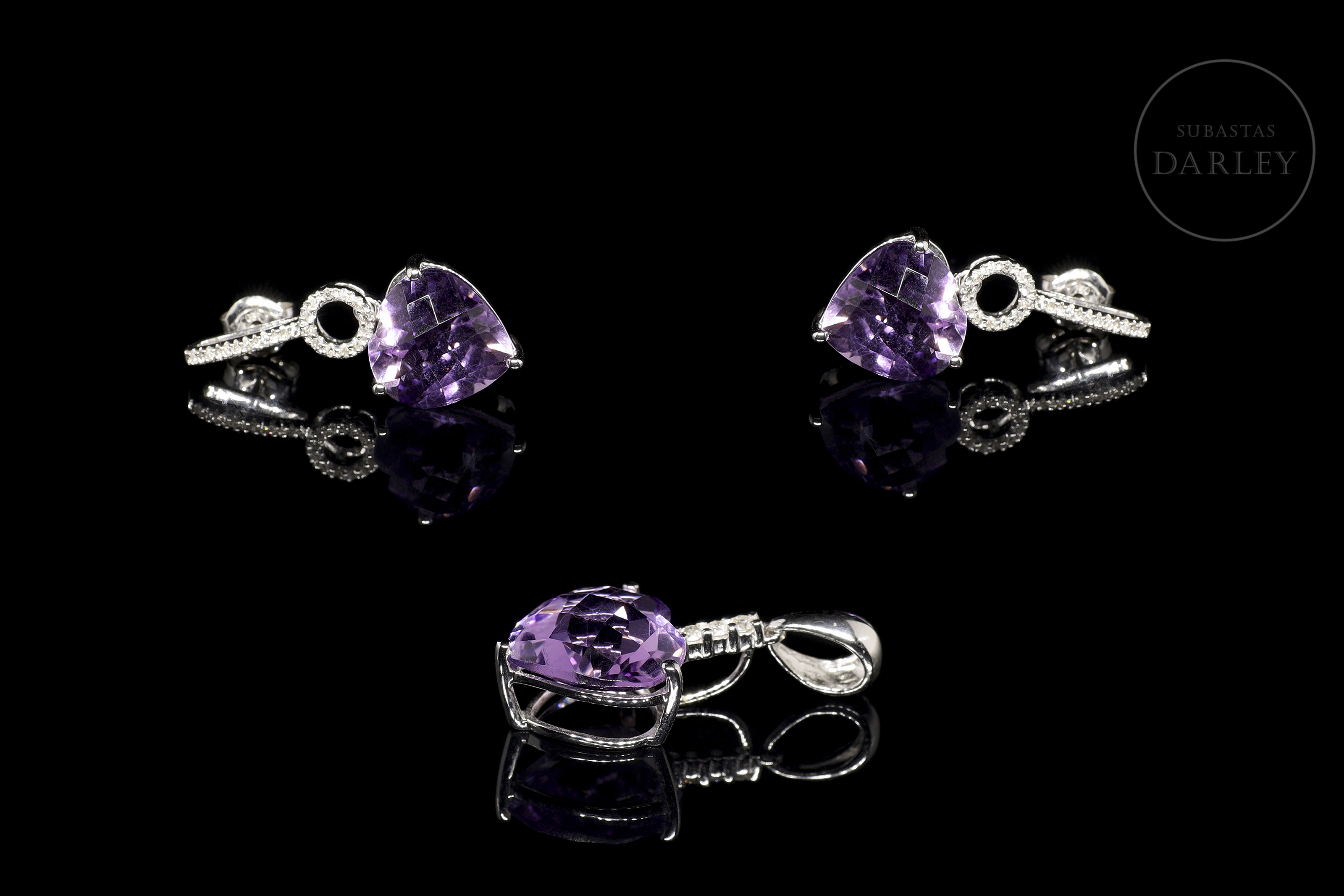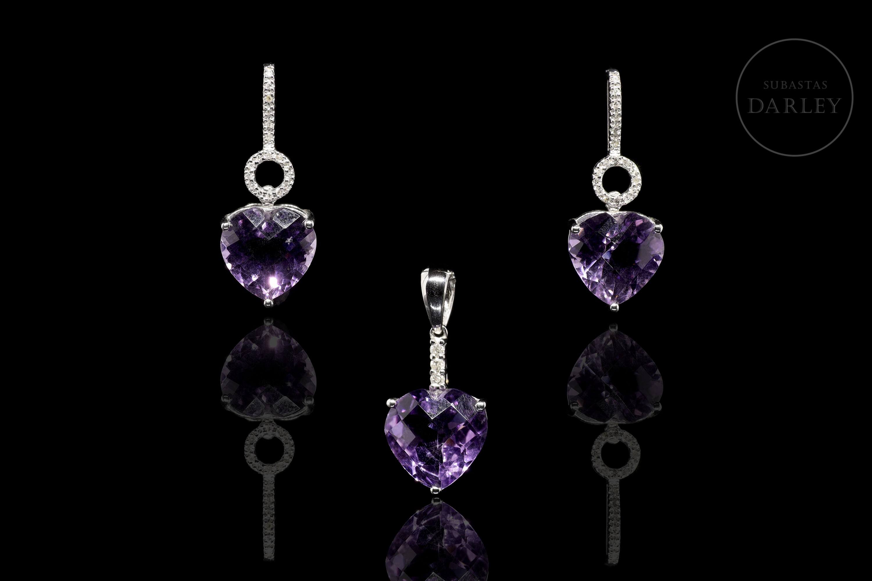 Set consisting of a pendant and earrings crafted in 18-carat white gold, each piece featuring a heart-shaped amethyst, with a total approximate weight of 12 carats. The gems are set in open prongs and accompanied by brilliant-cut diamonds that run along the hoops and arms of the mountings. The pendant has a smooth wedge-shaped bail. Pressure clasps on the earrings.
