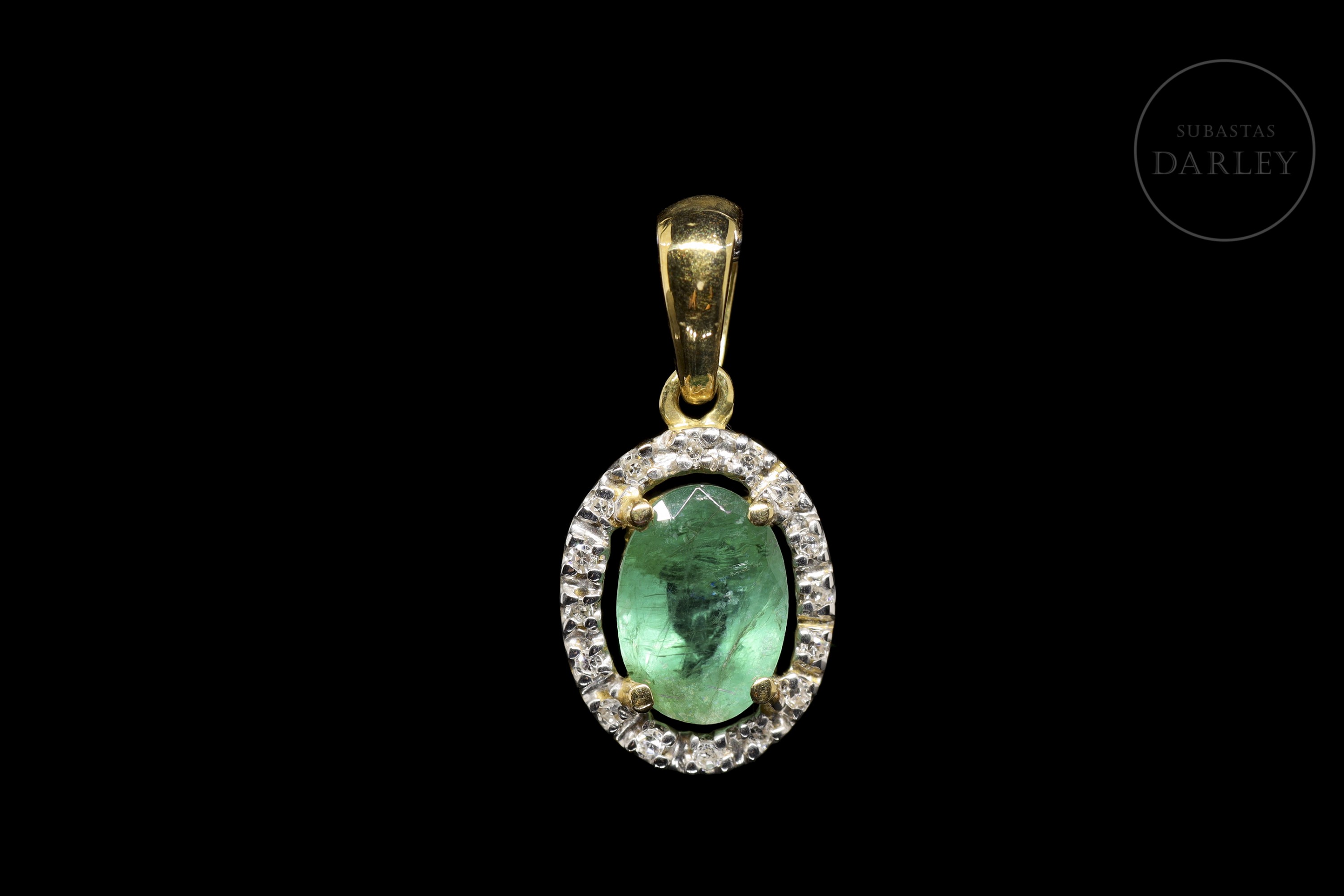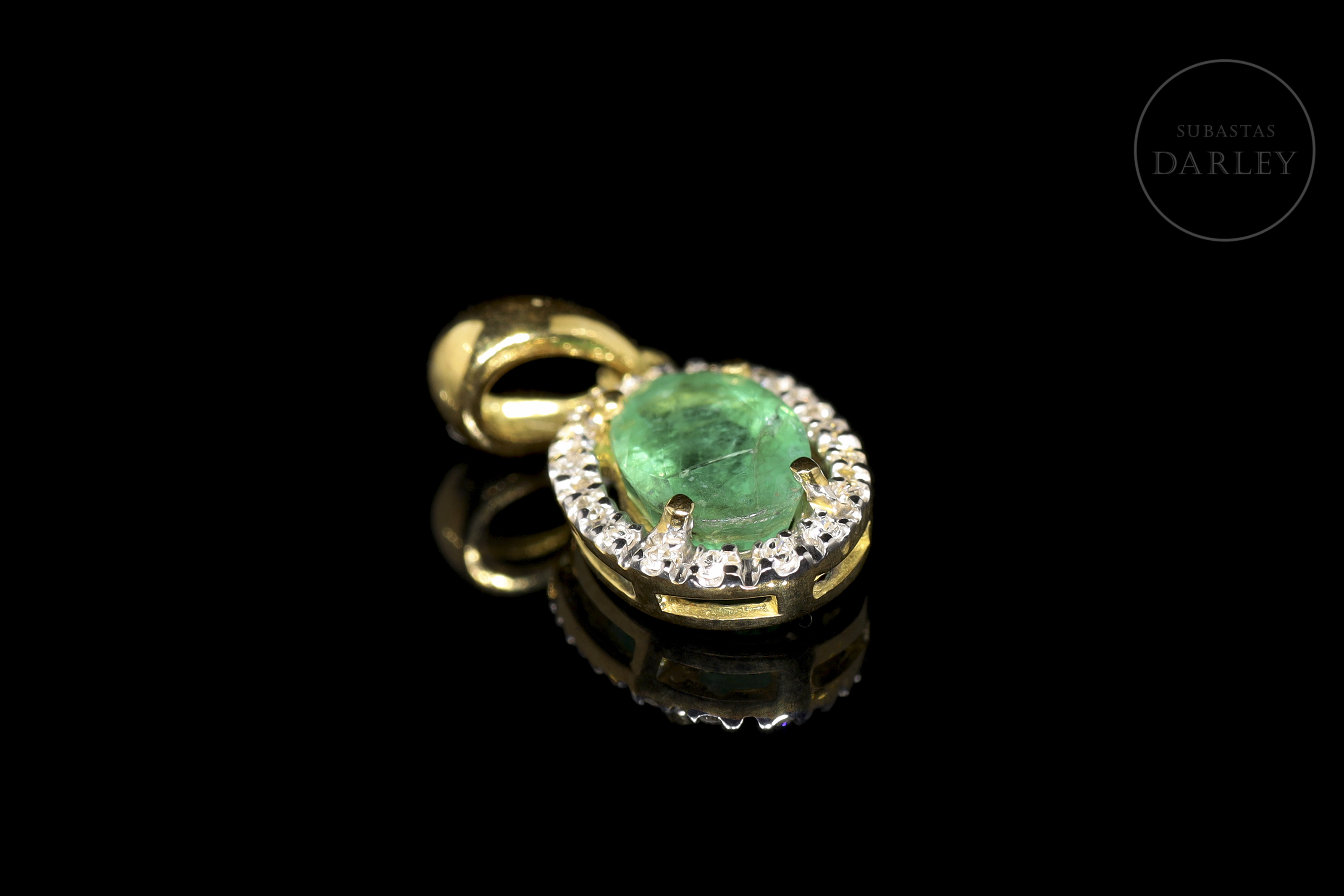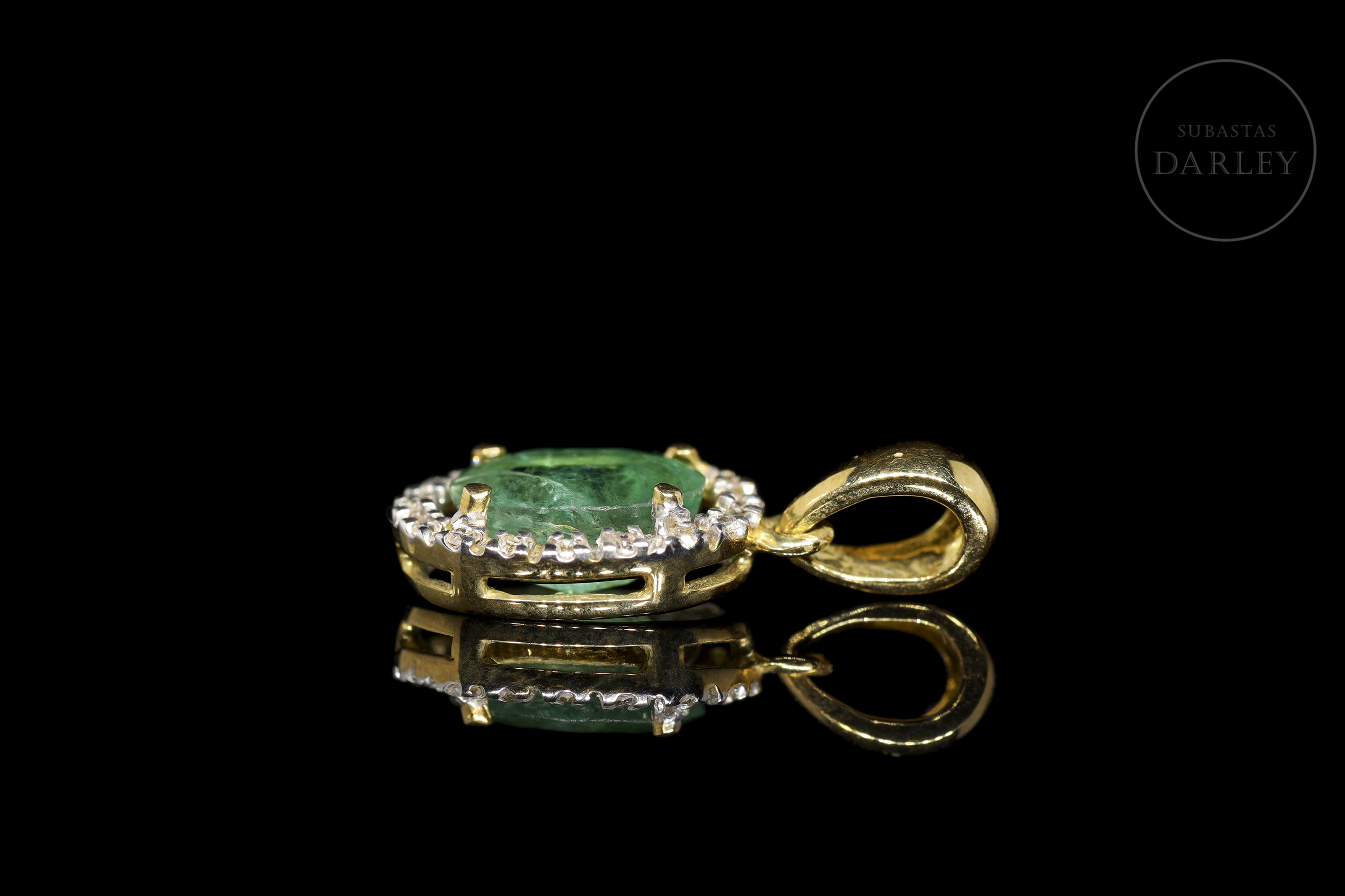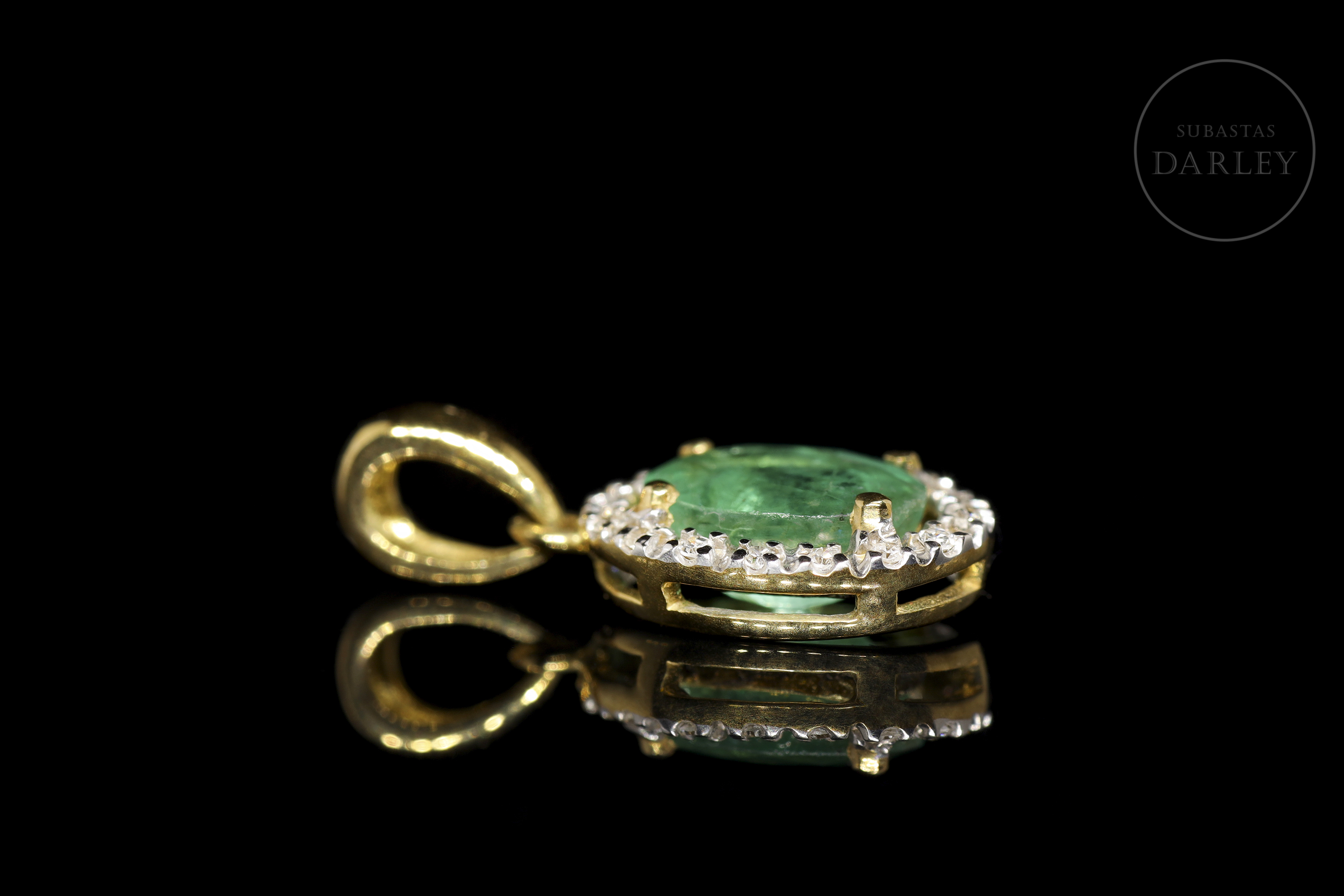 18-kt yellow gold pendant, adorned with 16 brilliant-cut diamonds framing a central oval-cut emerald weighing 0.85 carats, set in four angular prongs integrated into the bezel. It hangs from a smooth wedge-shaped bail.