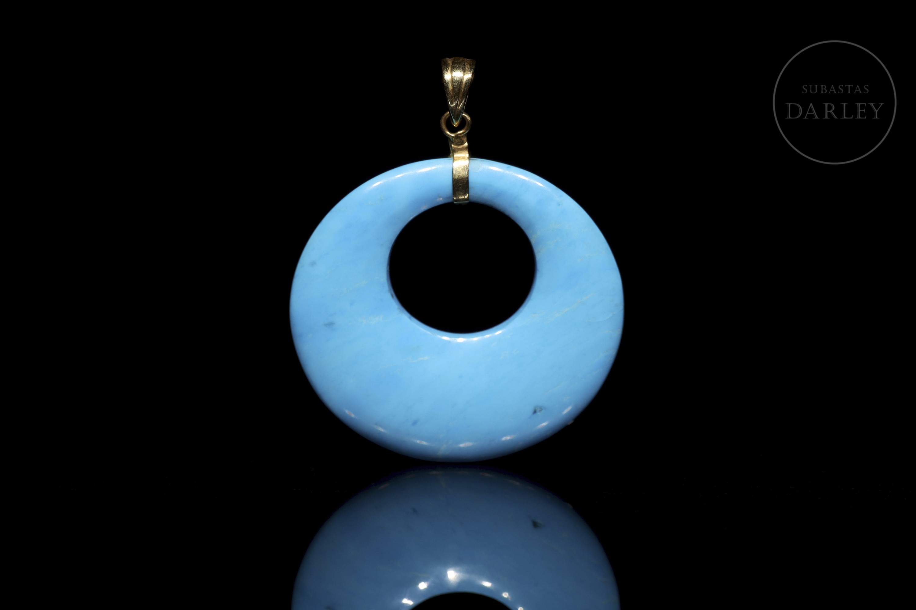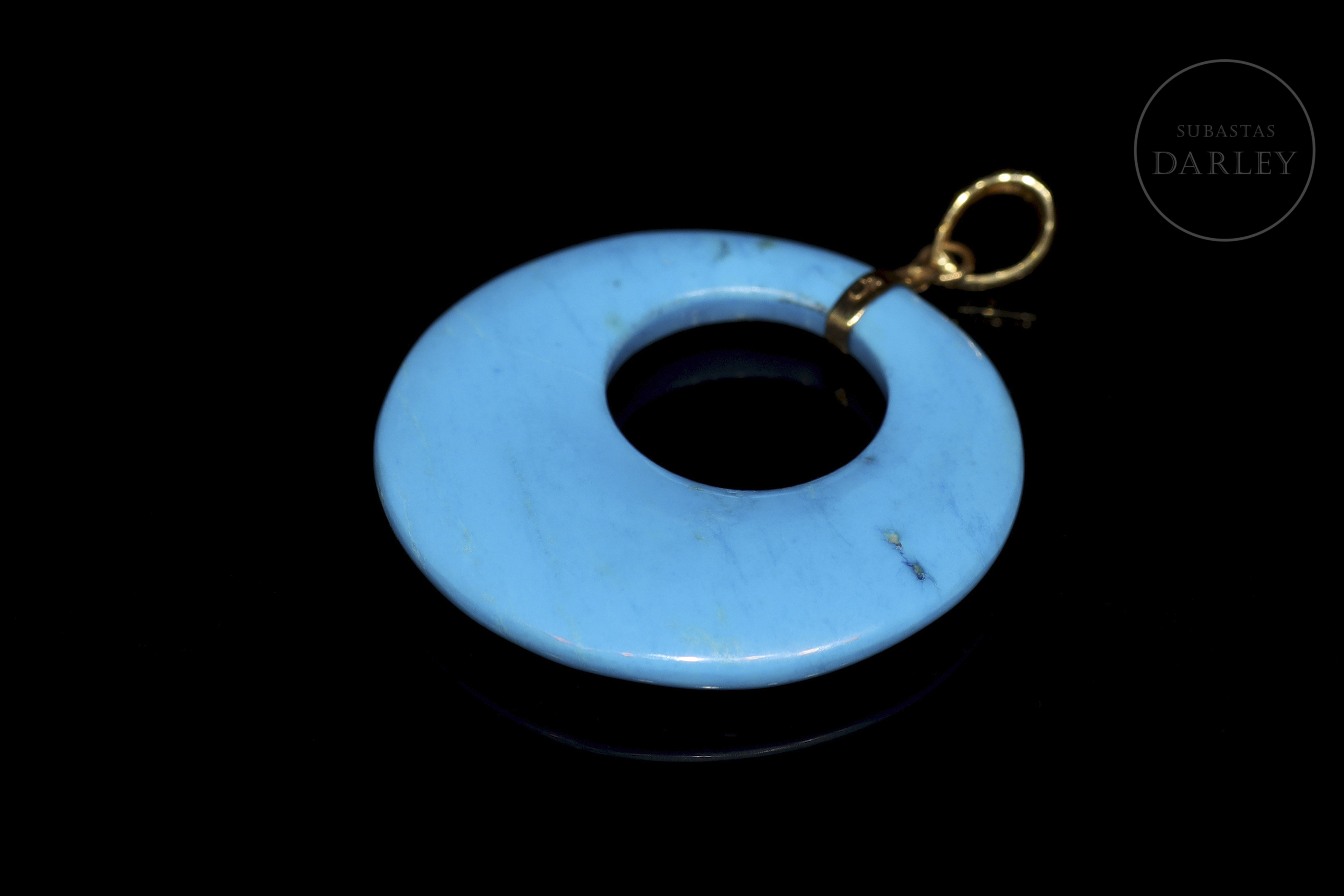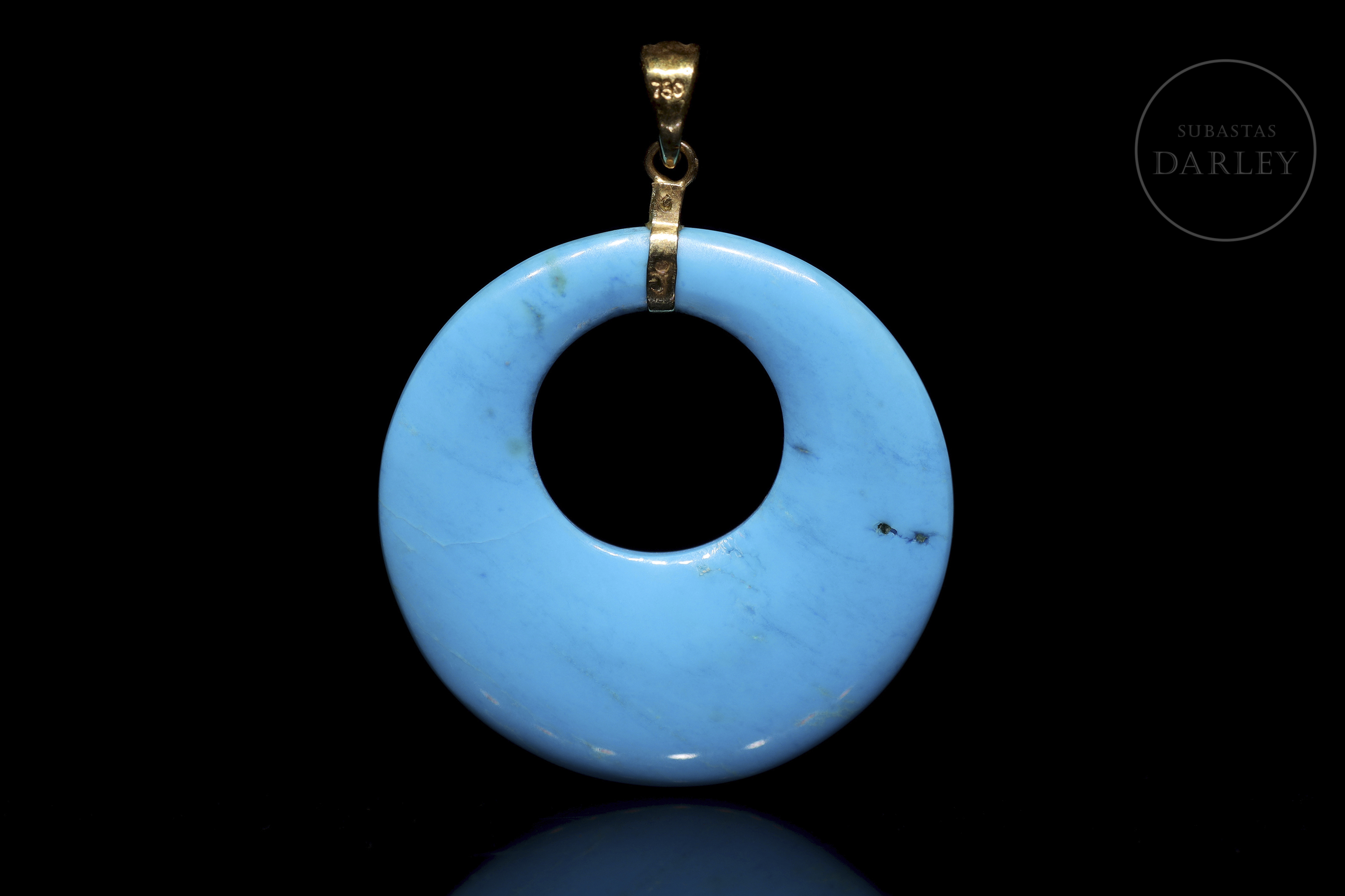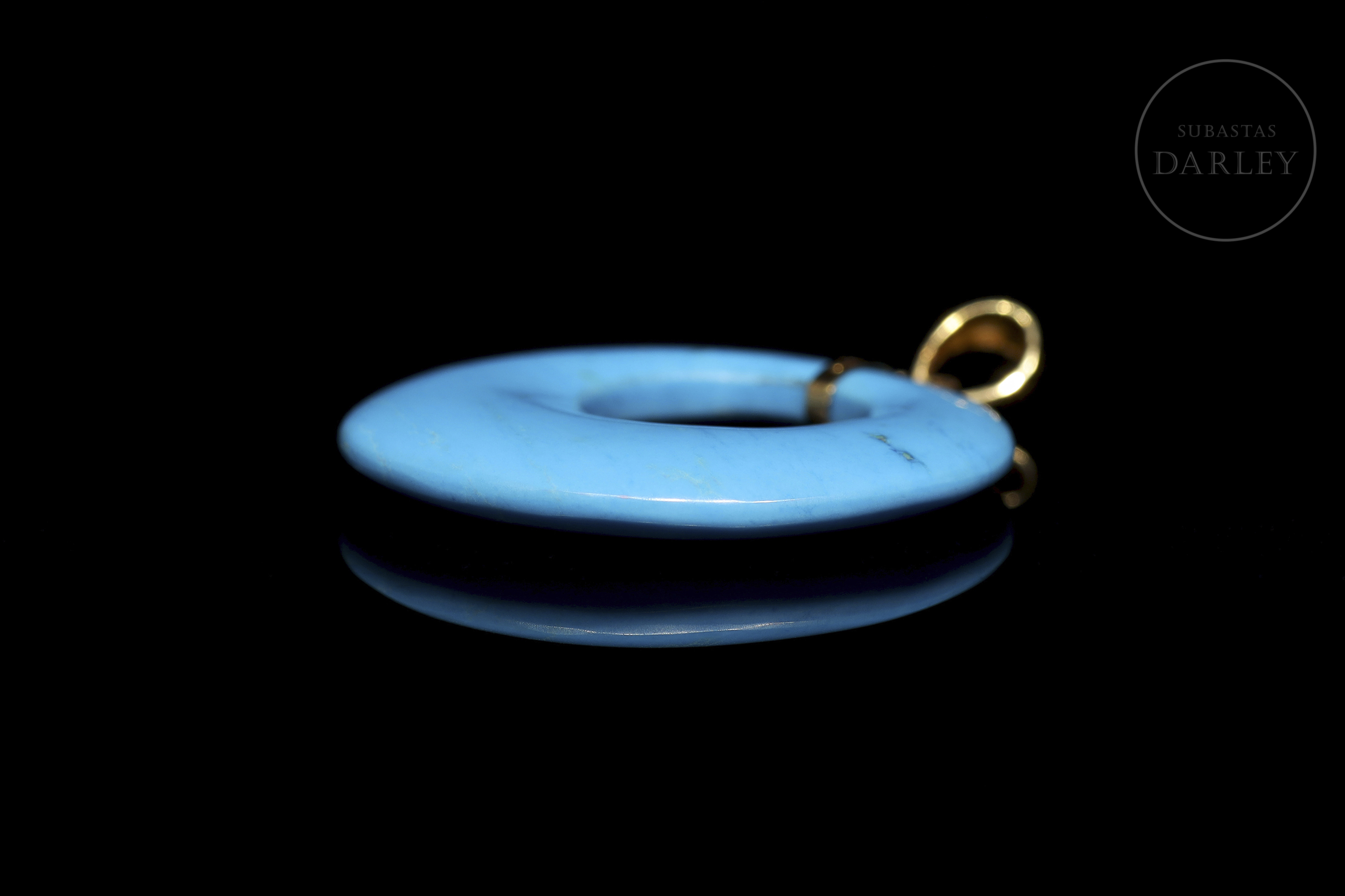 The front is formed by a circular, domed piece of turquoise with a new circle cut out of the top centre, leaving a void. It is attached by a clasp to an 18-carat yellow gold wedge handle.