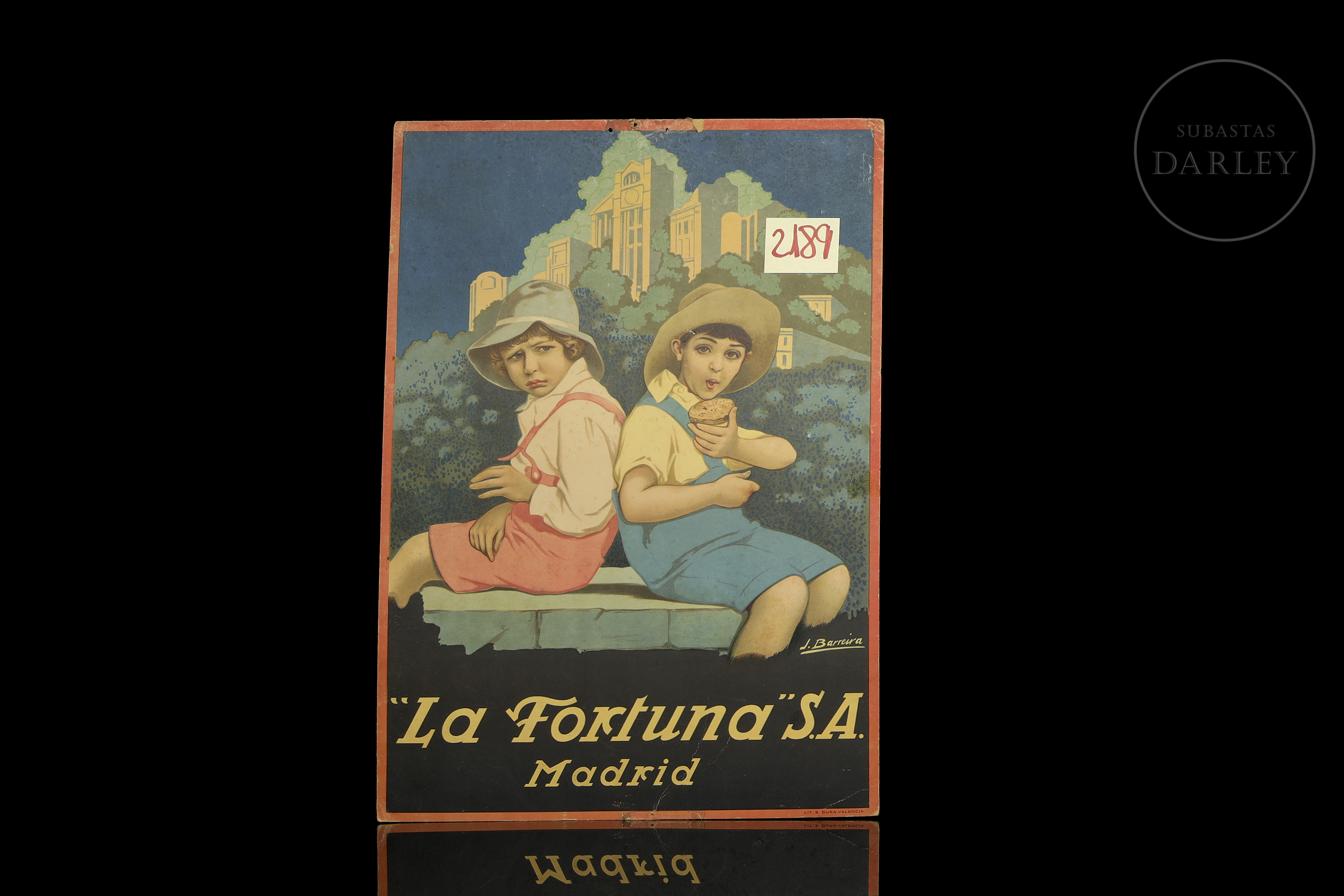 Printed on soft cardboard. Advertising poster for the chocolate, biscuit and chocolate factory ‘La Fortuna’. Based on the painting by ‘J. Barreira’, signed in the lower right area.