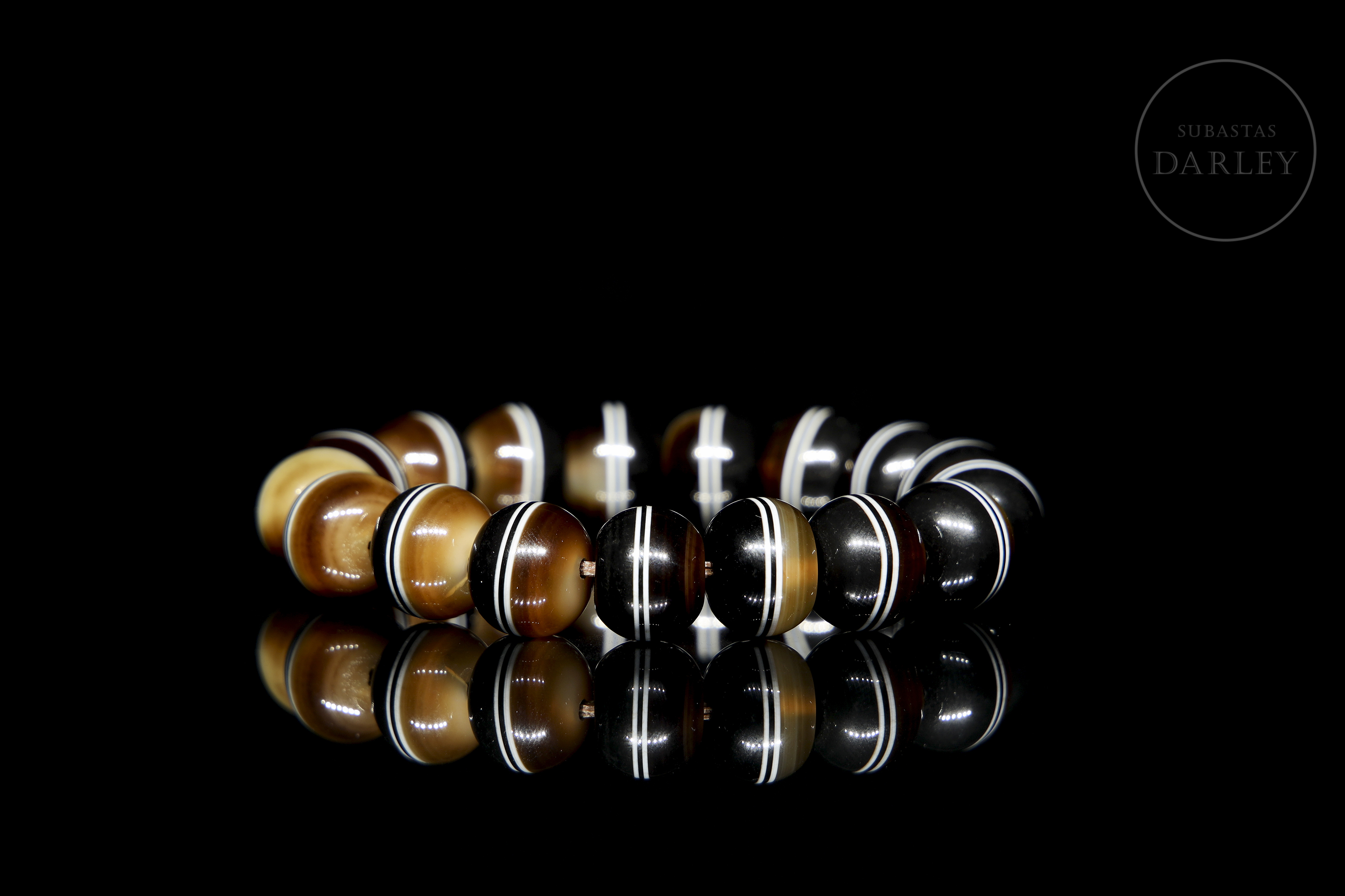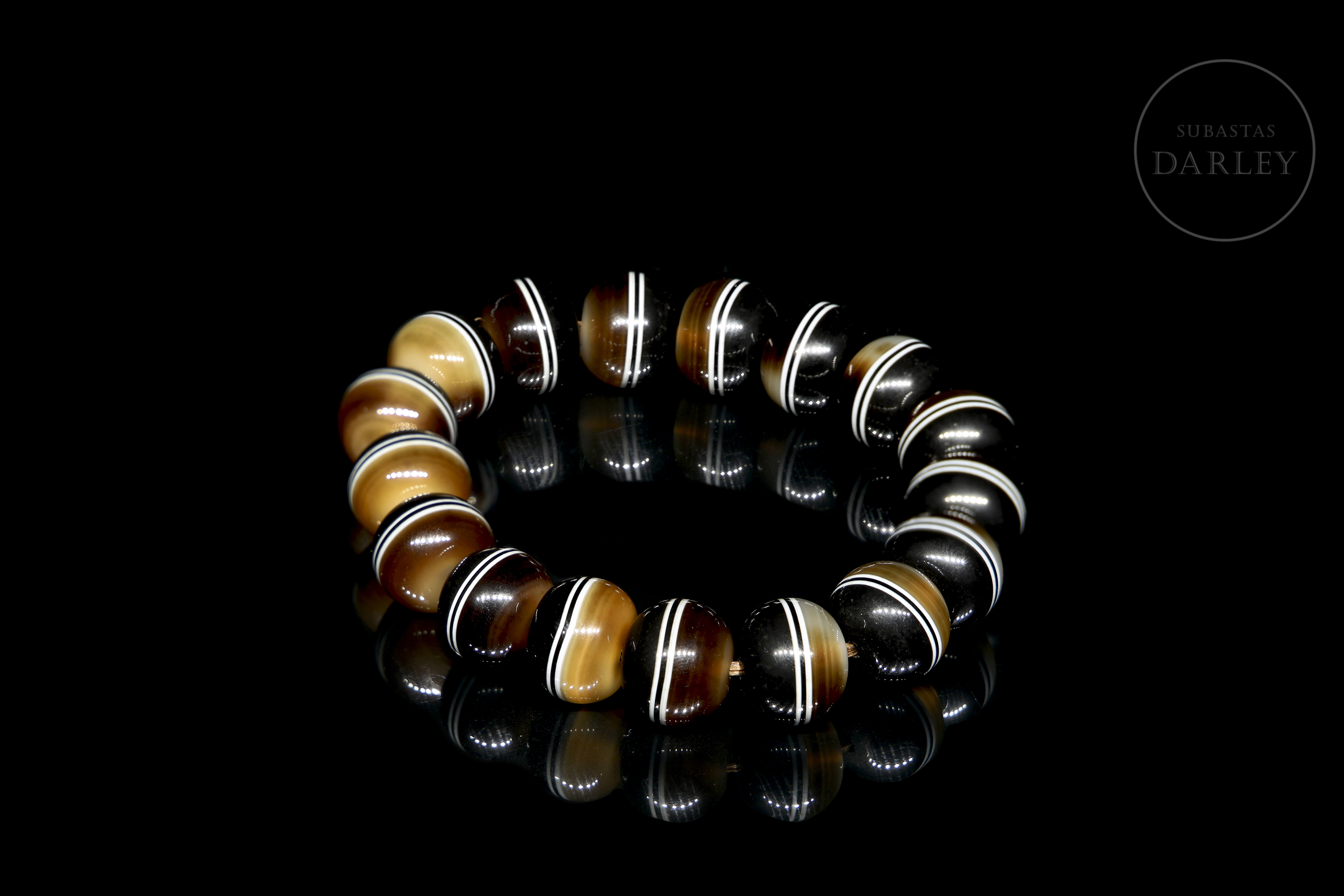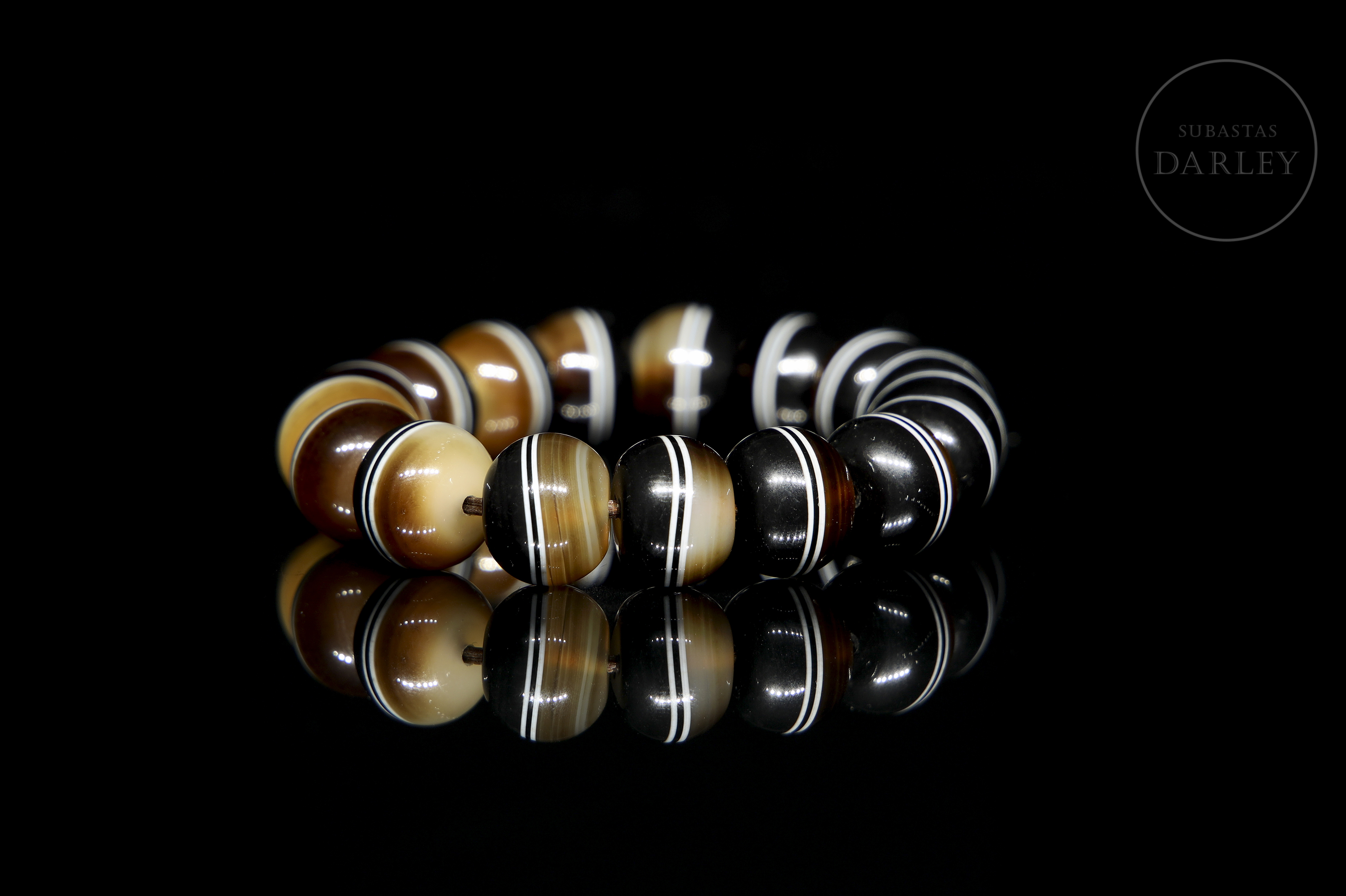 Bracelet composed of a total of 16 spherical agate beads in shades of brown, ochre and black, with longitudinal white veins. The beads have a polished, uniform surface.