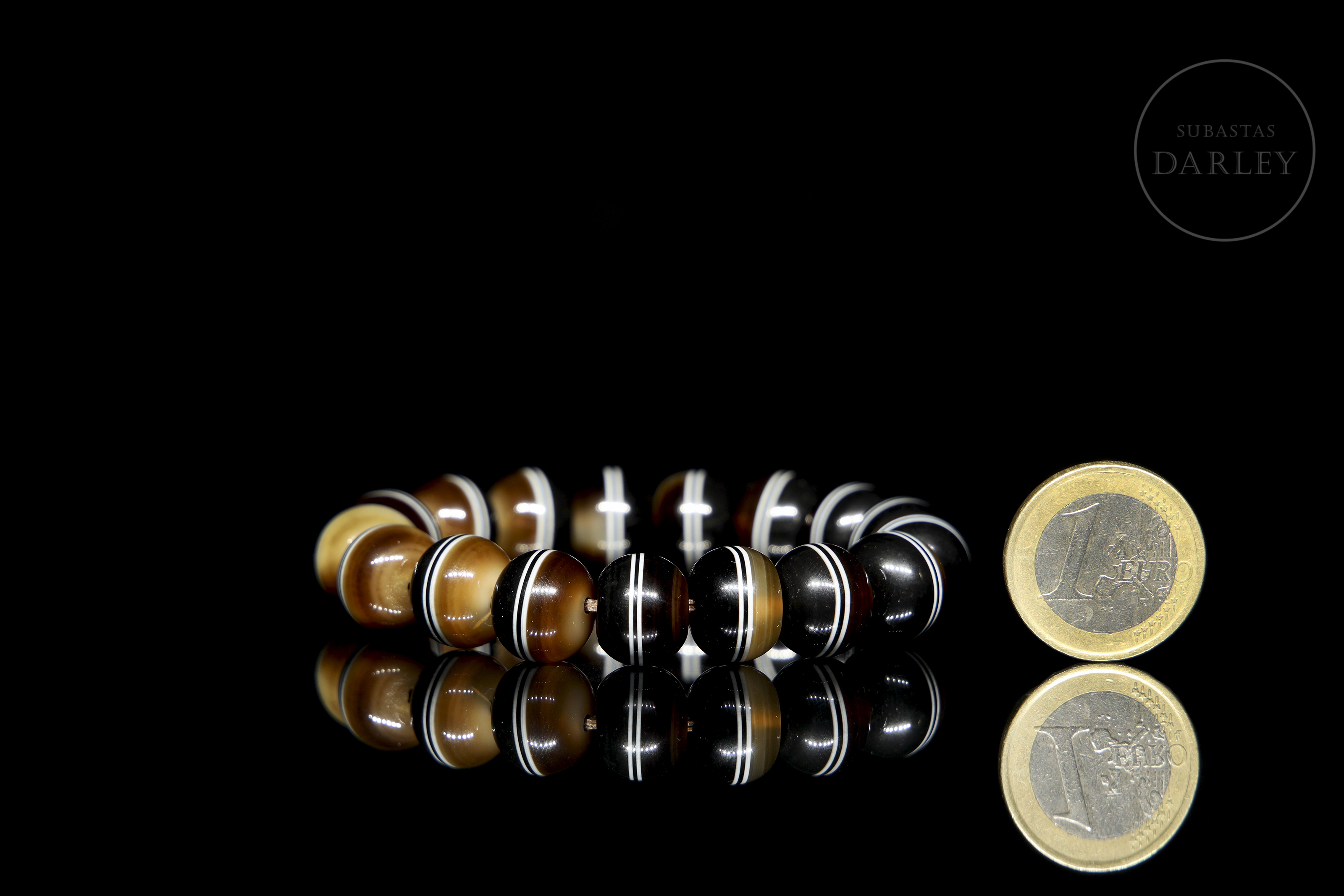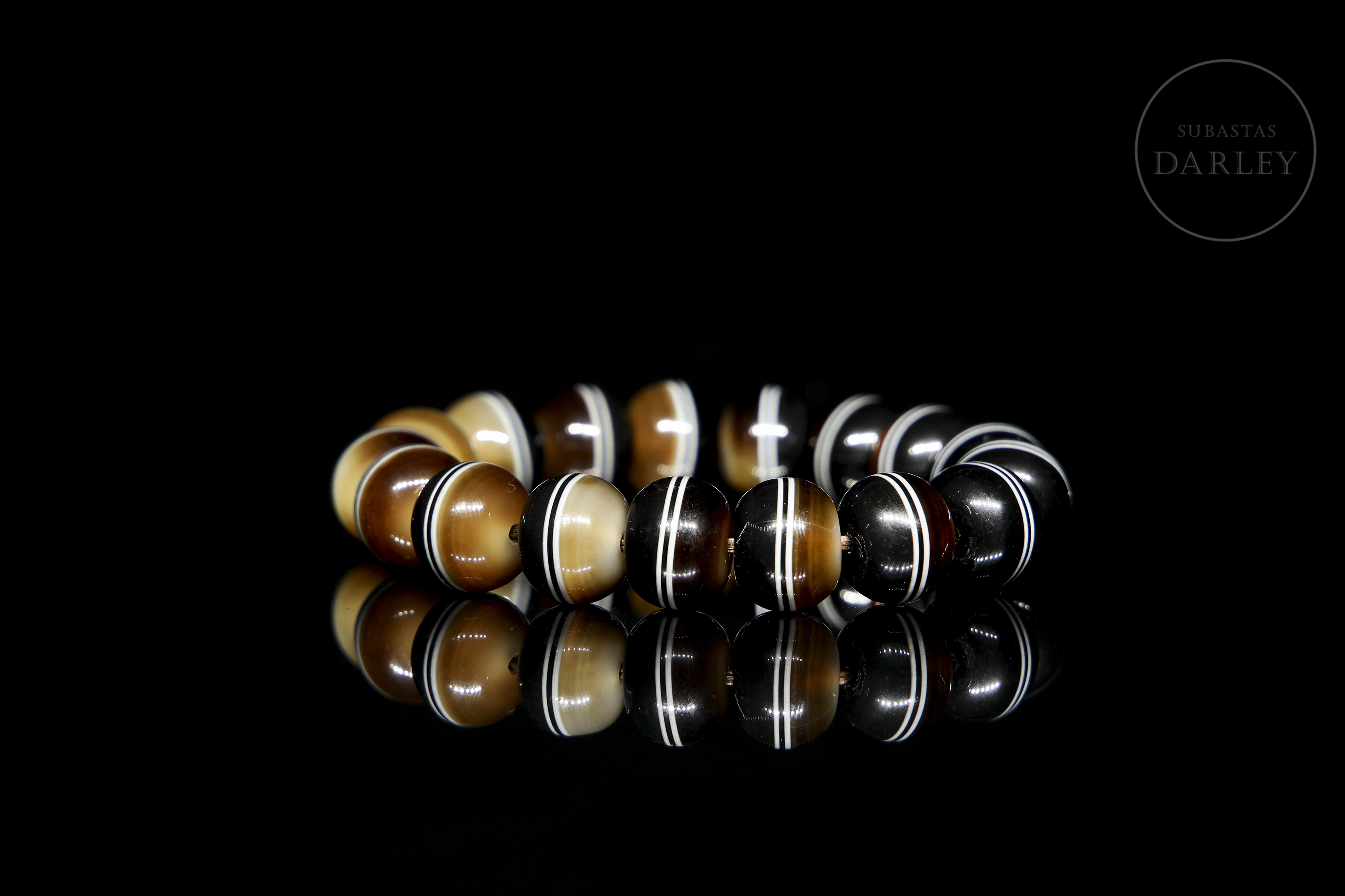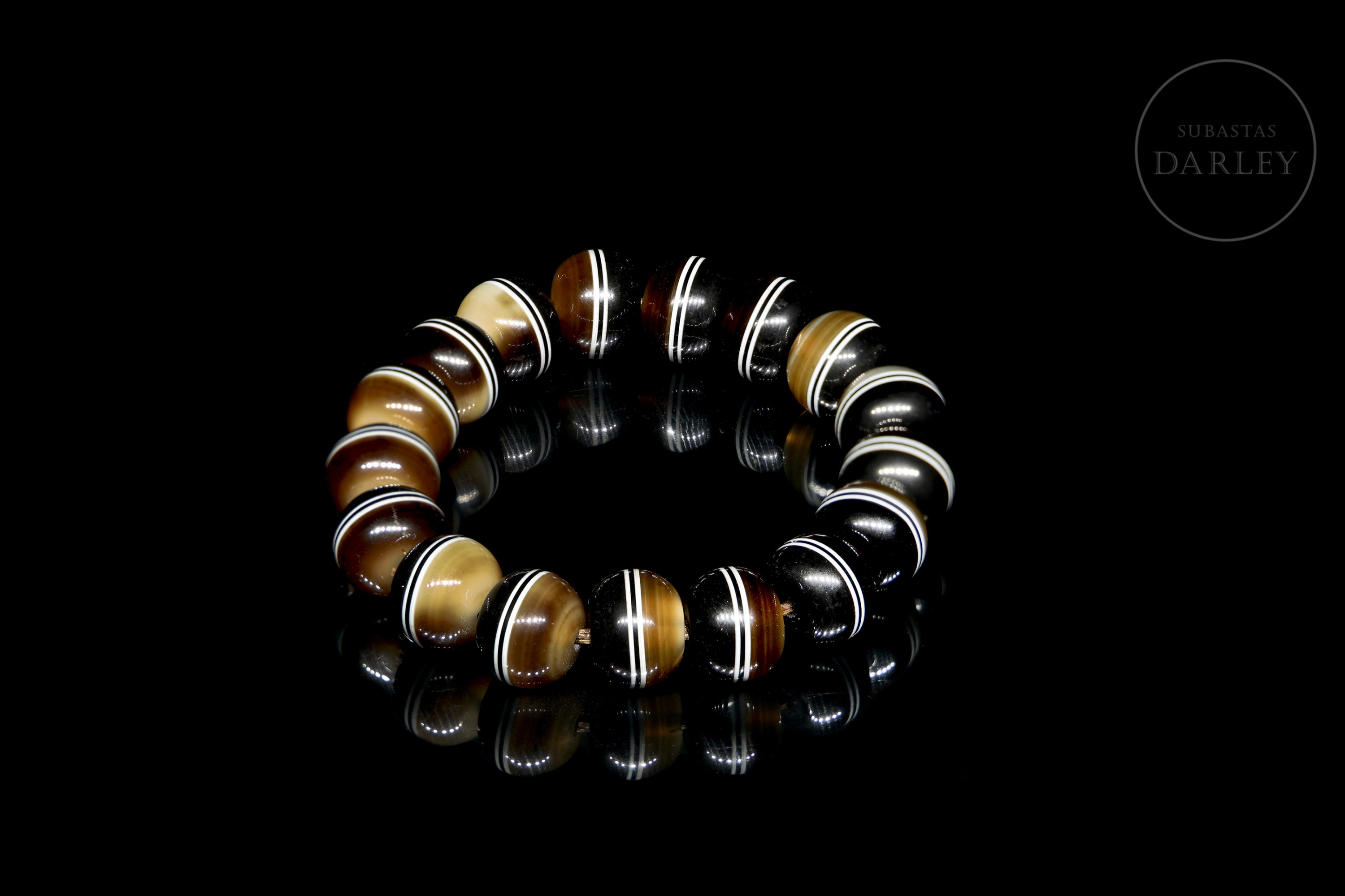 Bracelet composed of a total of 16 spherical agate beads in shades of brown, ochre and black, with longitudinal white veins. The beads have a polished, uniform surface.