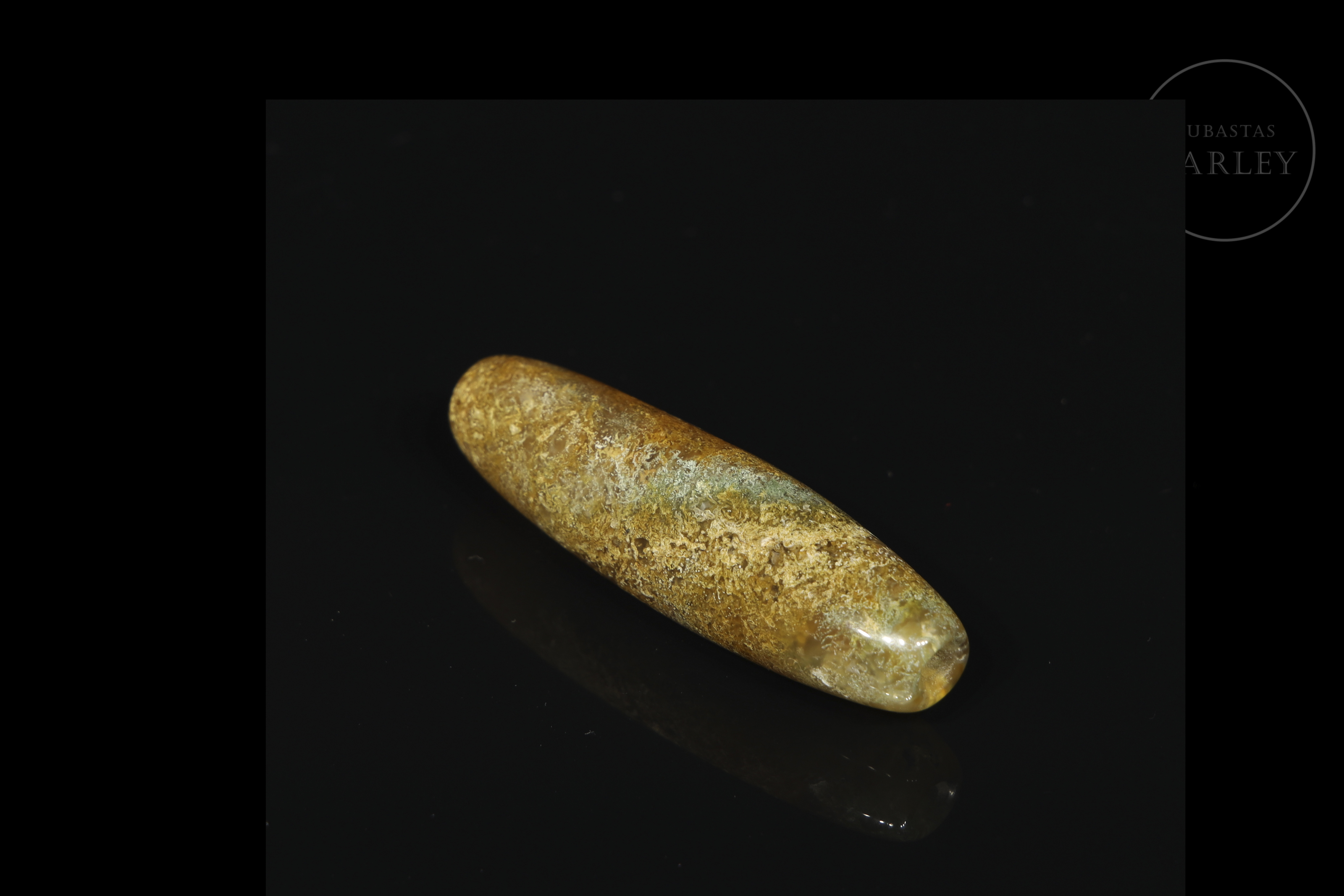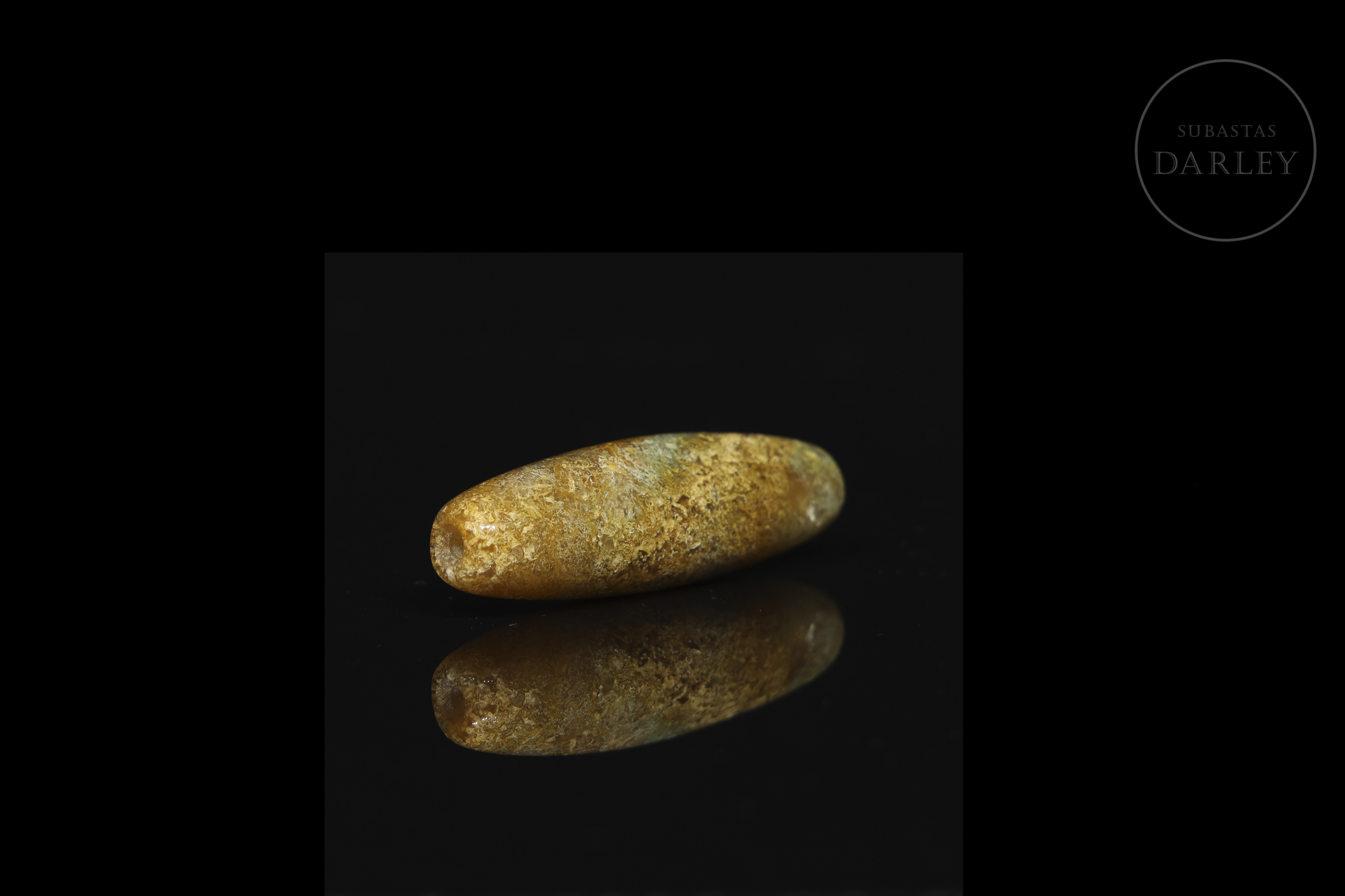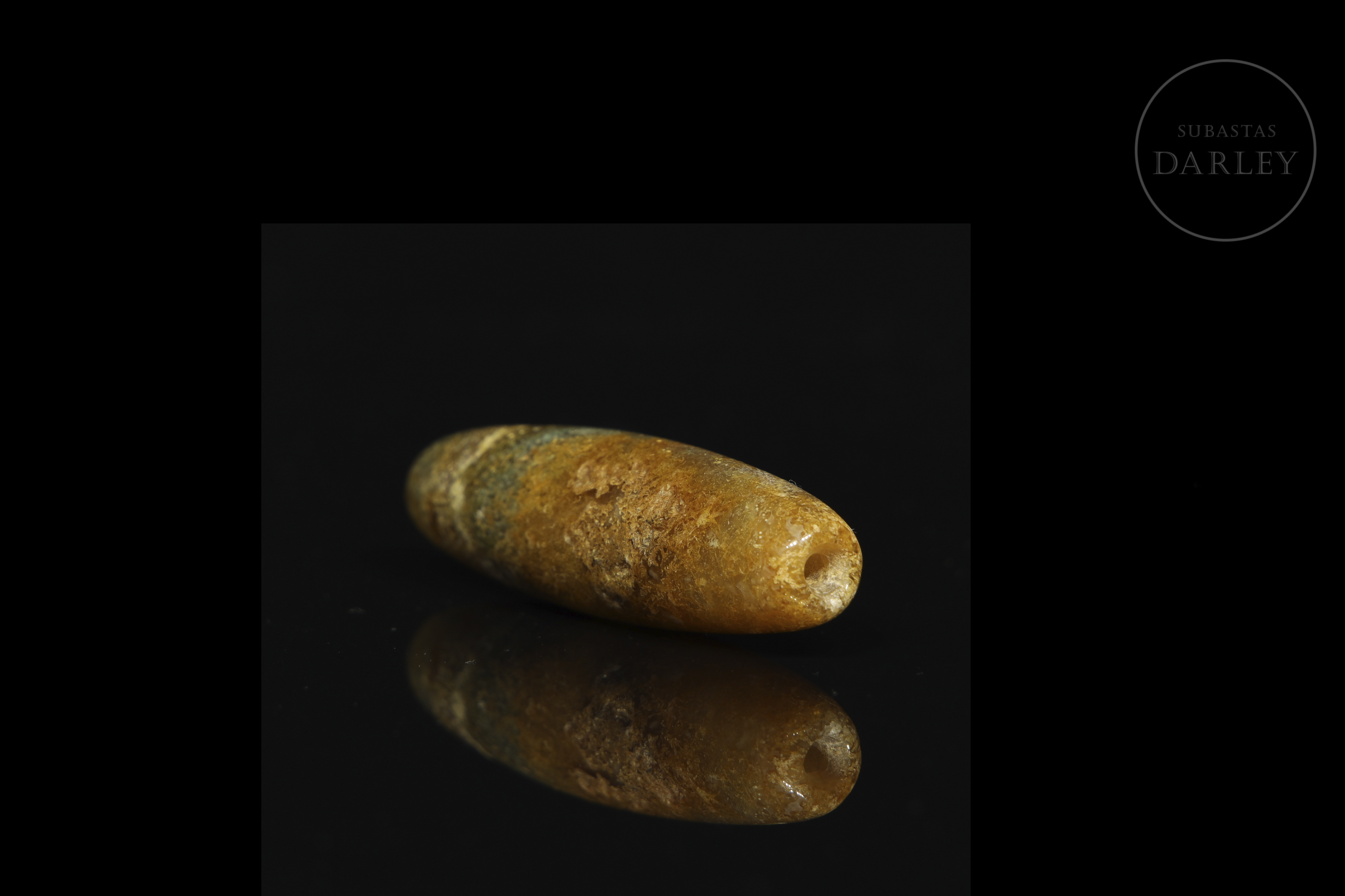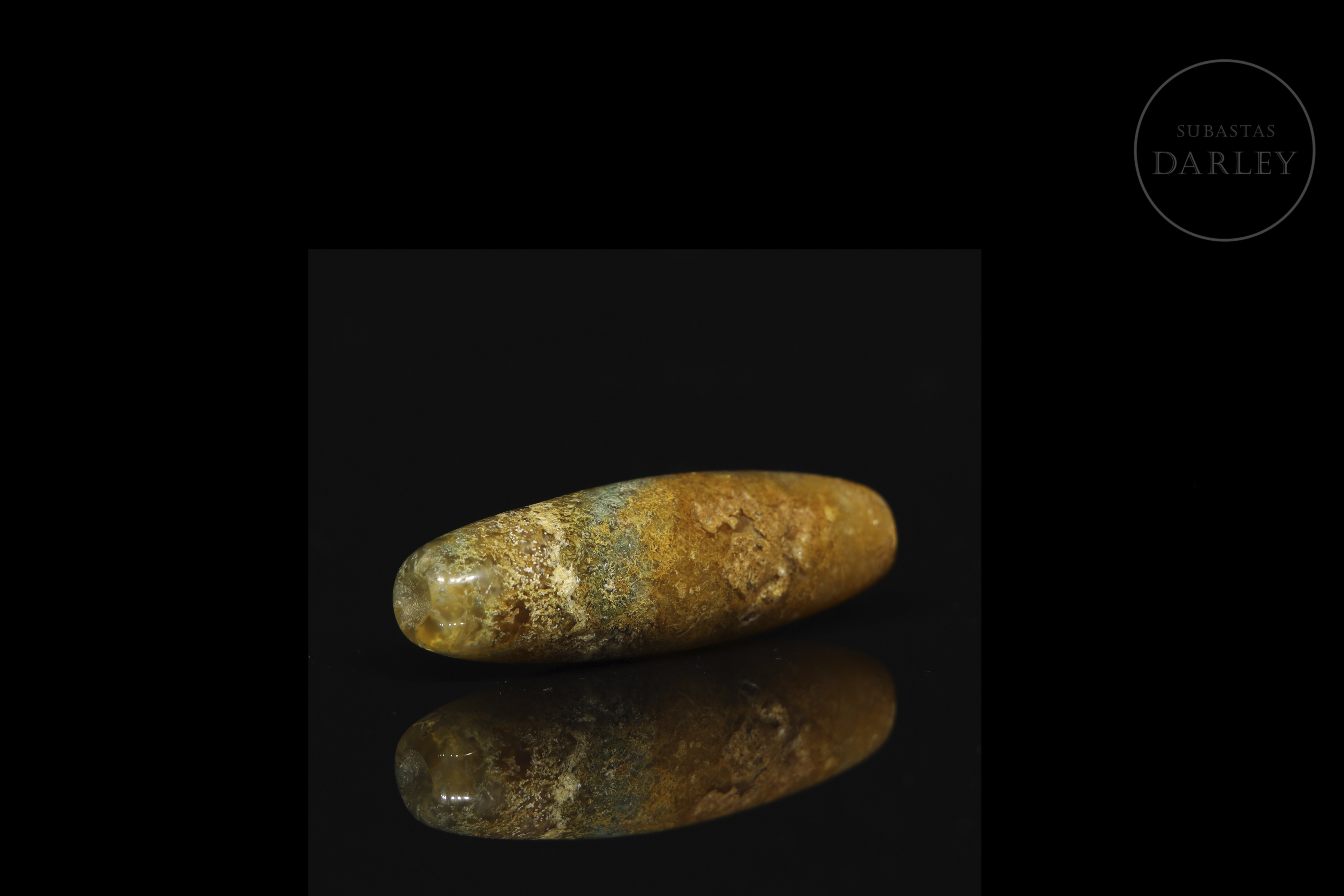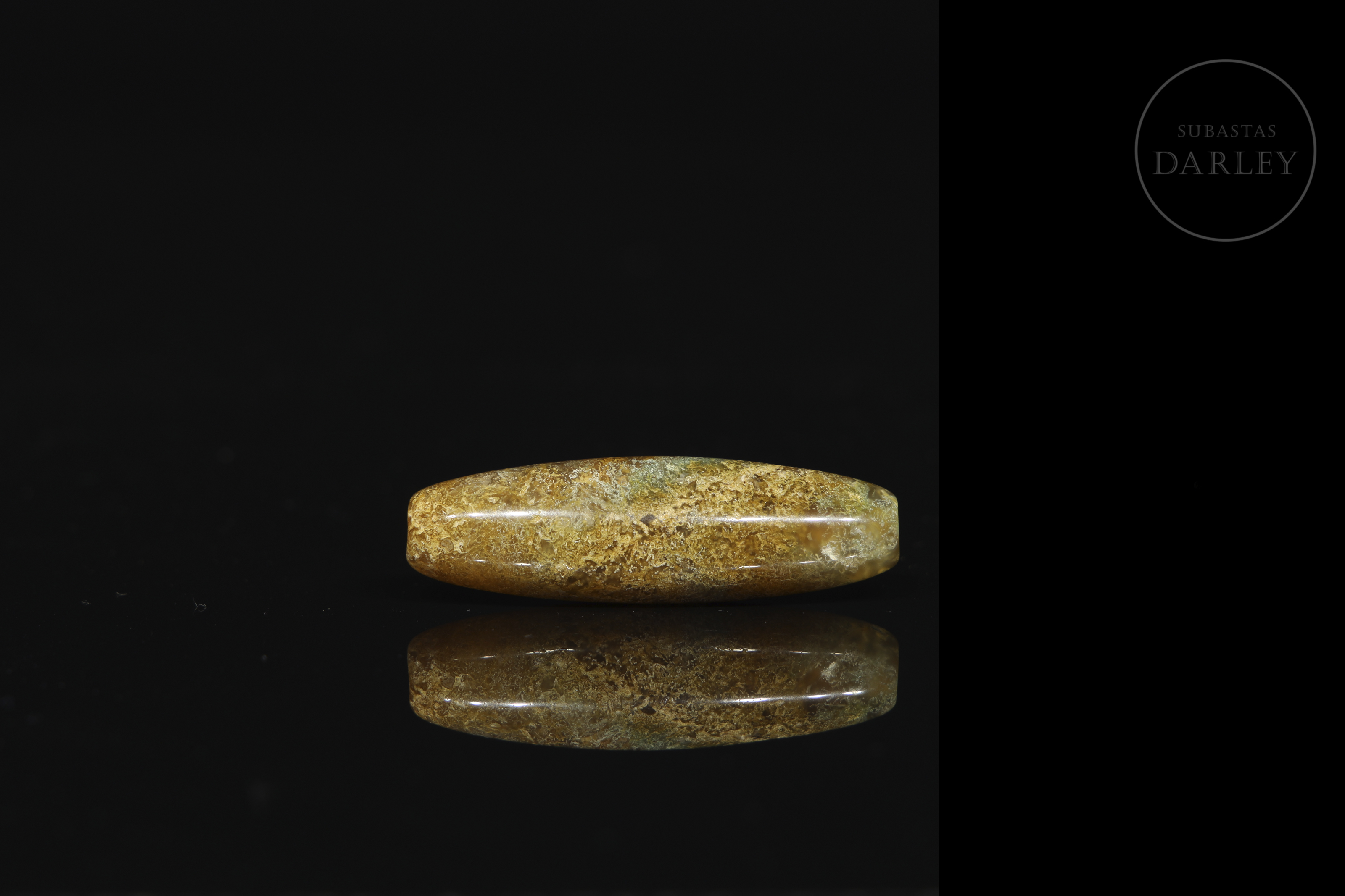 Dzi agate bead with an elongated cylindrical shape and rounded ends. Decorated with the stone's natural brown and ochre-coloured veins, among which a subtle greenish stripe stands out. Liao Dynasty (916-1125) or later.
