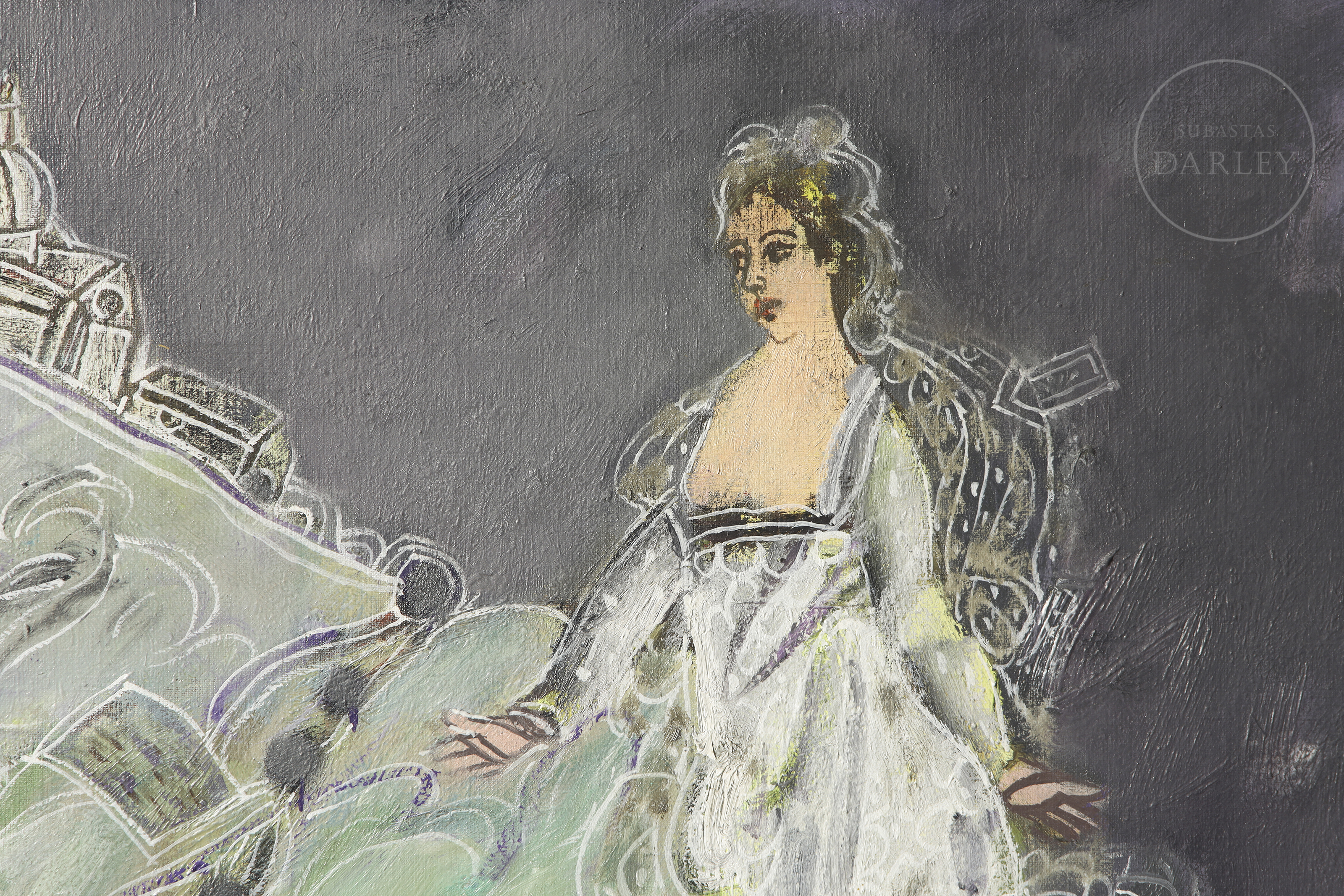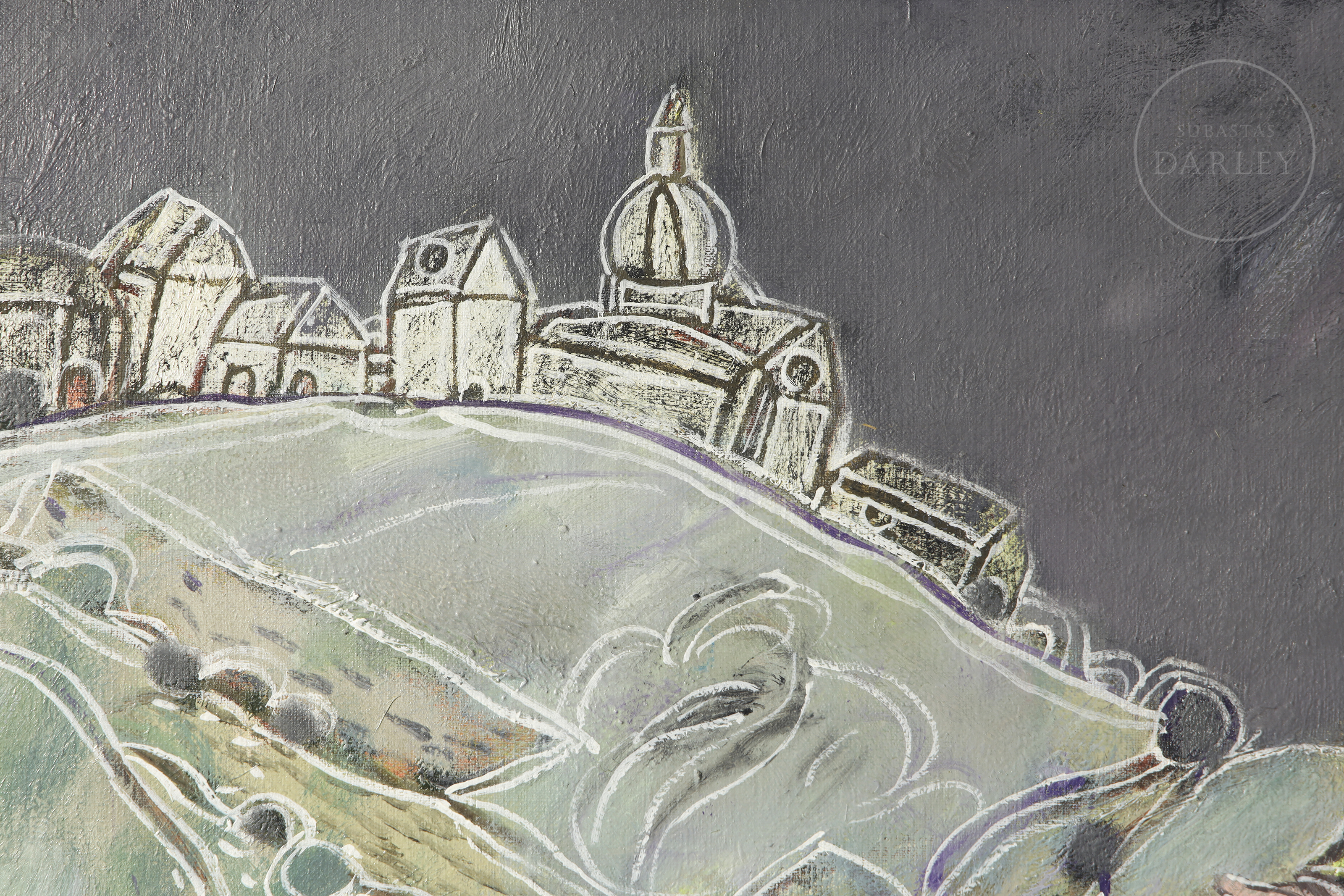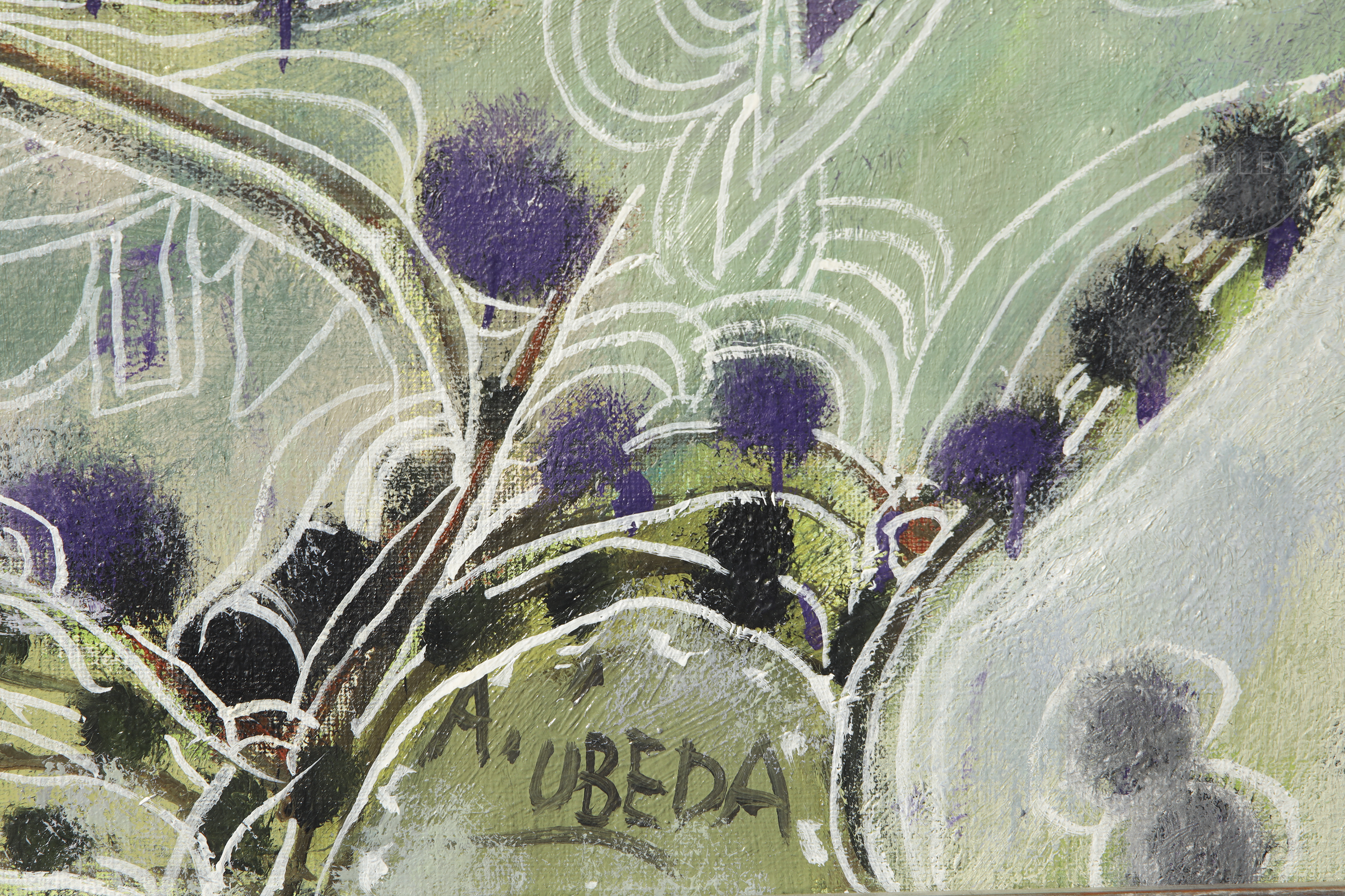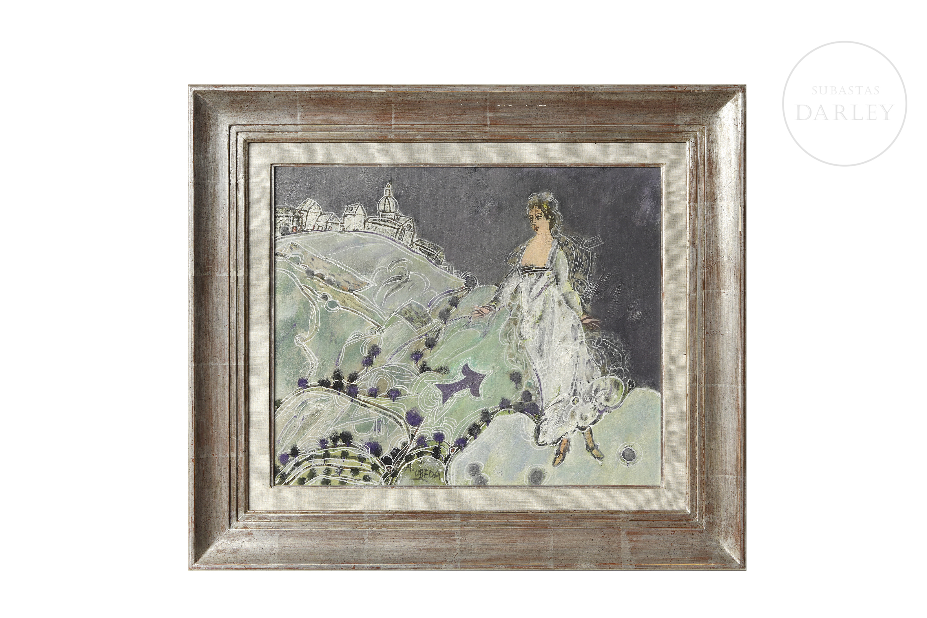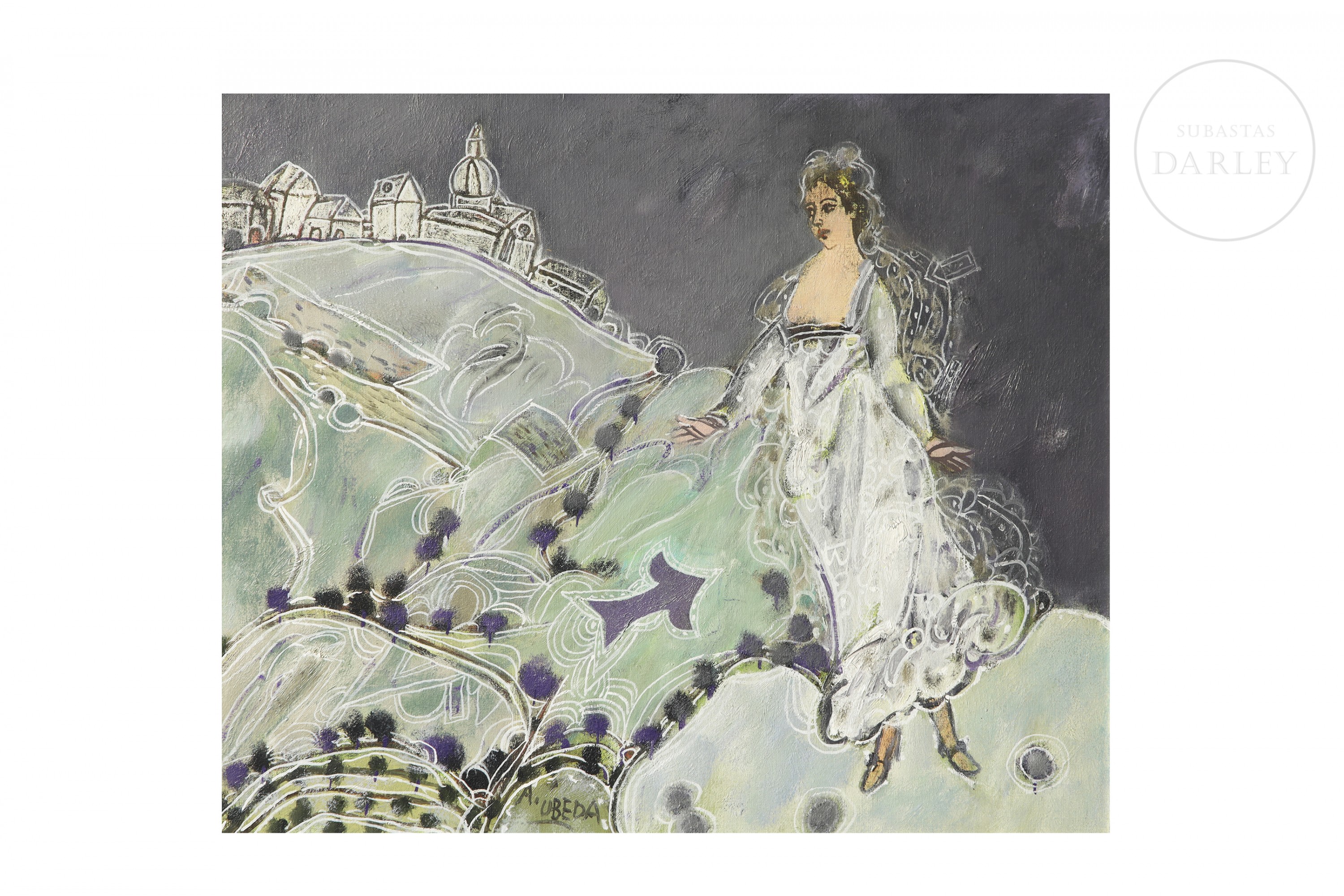 Oil on canvas. Figurative composition depicting a lady in a white dress against a backdrop of rolling green hills. A village can be seen in the distance, and purple thistles are depicted in the foreground. Signed ‘A. Úbeda’ at the bottom. Titled and signed on the reverse.