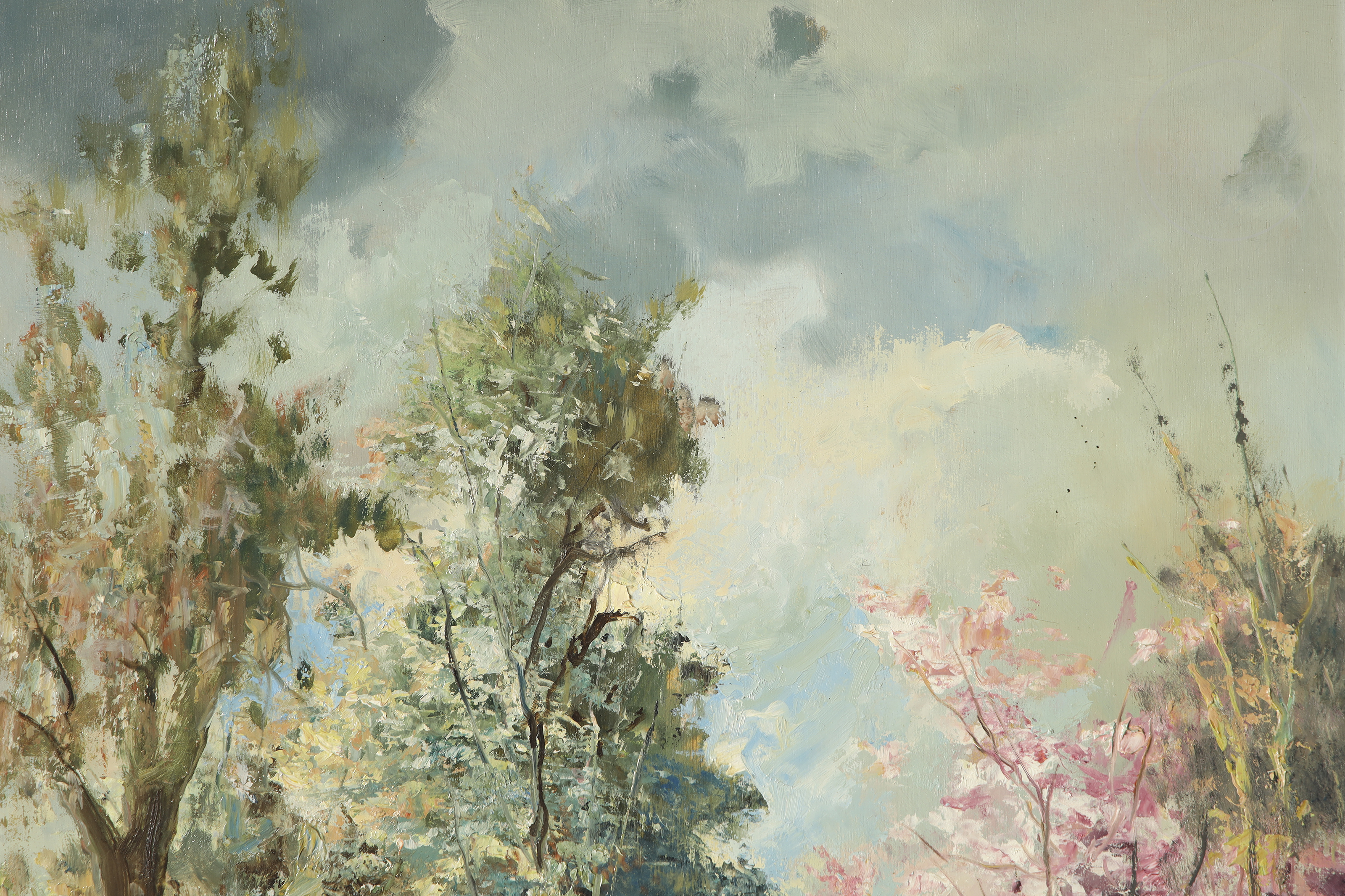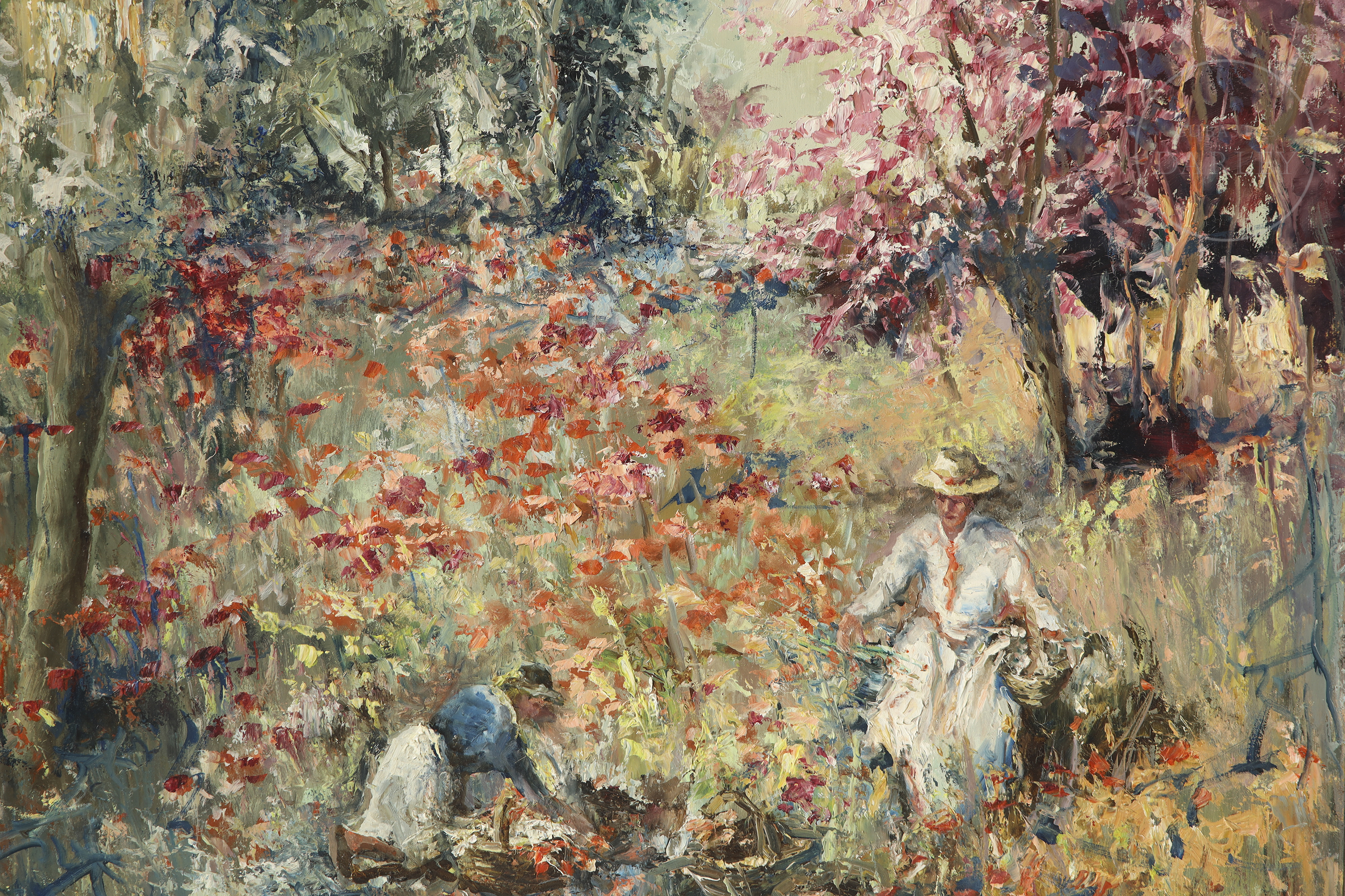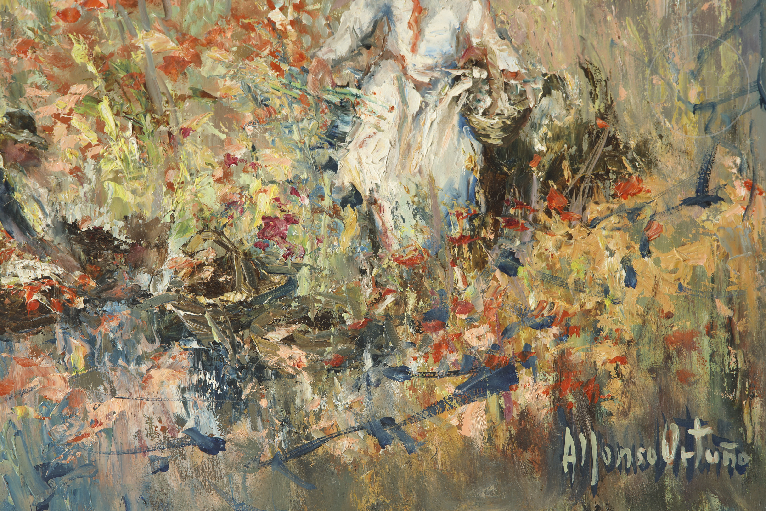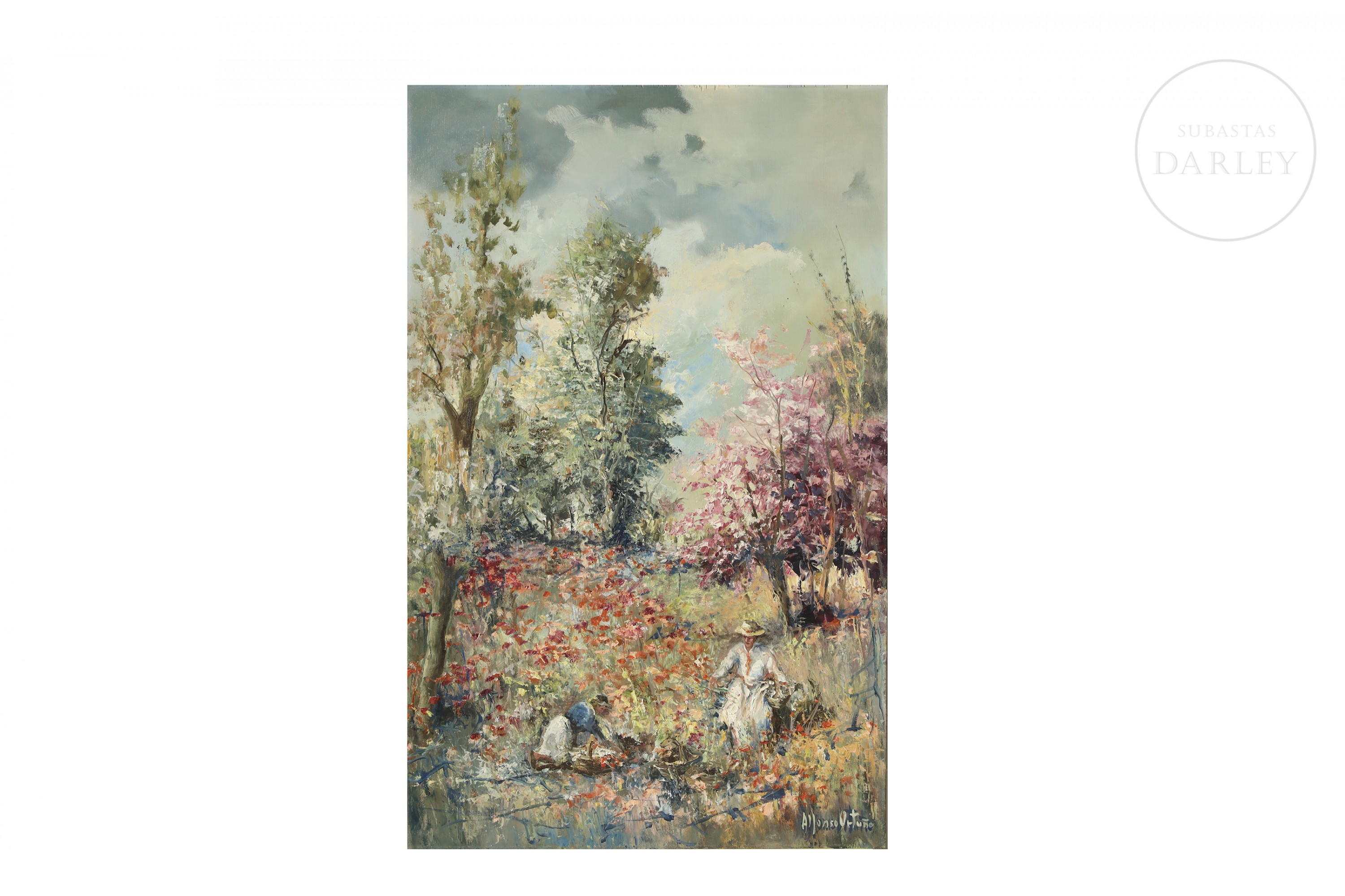 Oil on panel. Genre scene depicting two female figures picking flowers in the countryside, painted with thick, vibrant brushstrokes. Signed “Alfonso Ortuño” in the lower right corner.