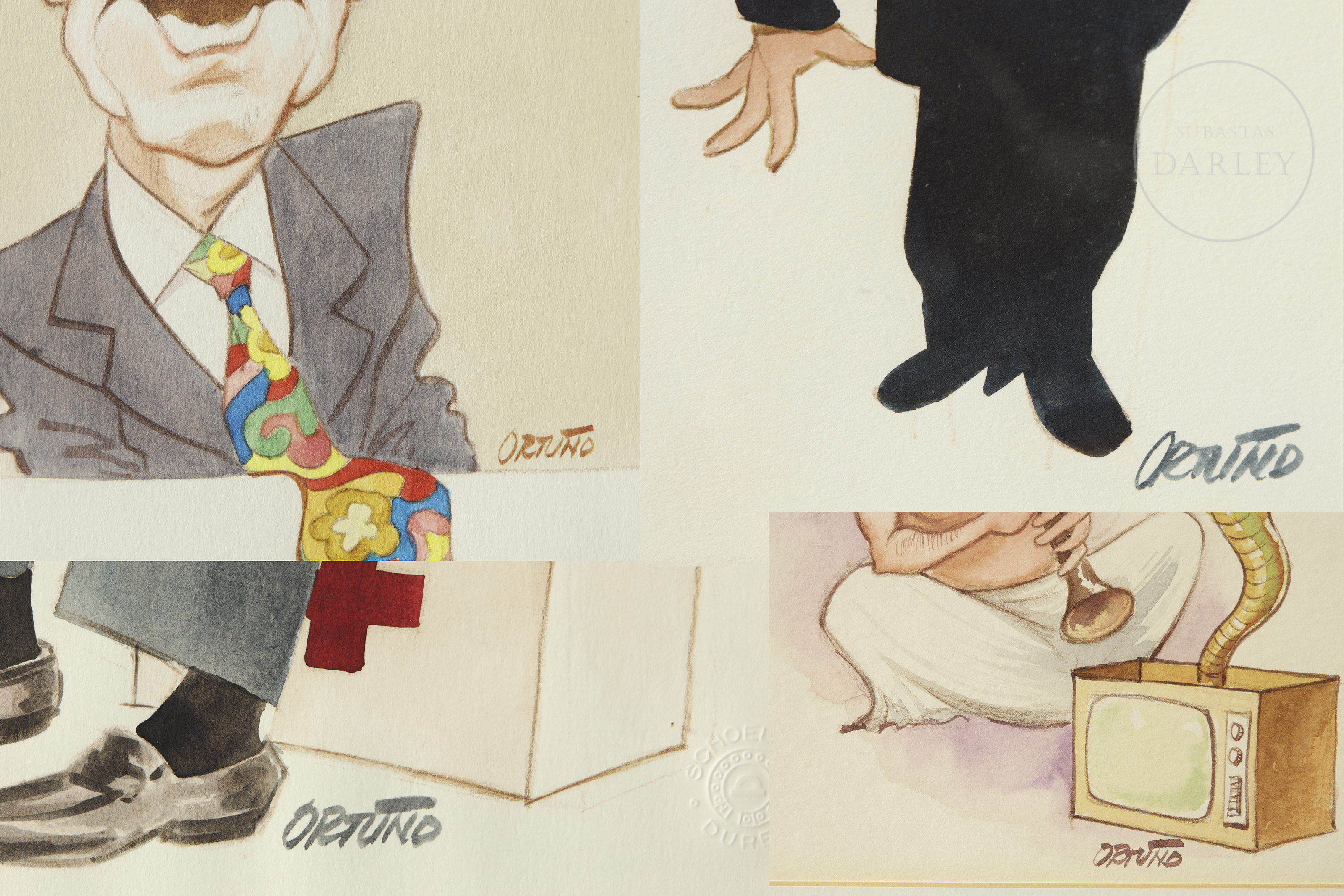 Watercolor and graphite on paper. Set of four caricatures signed “Ortuño.” Unidentified subjects.