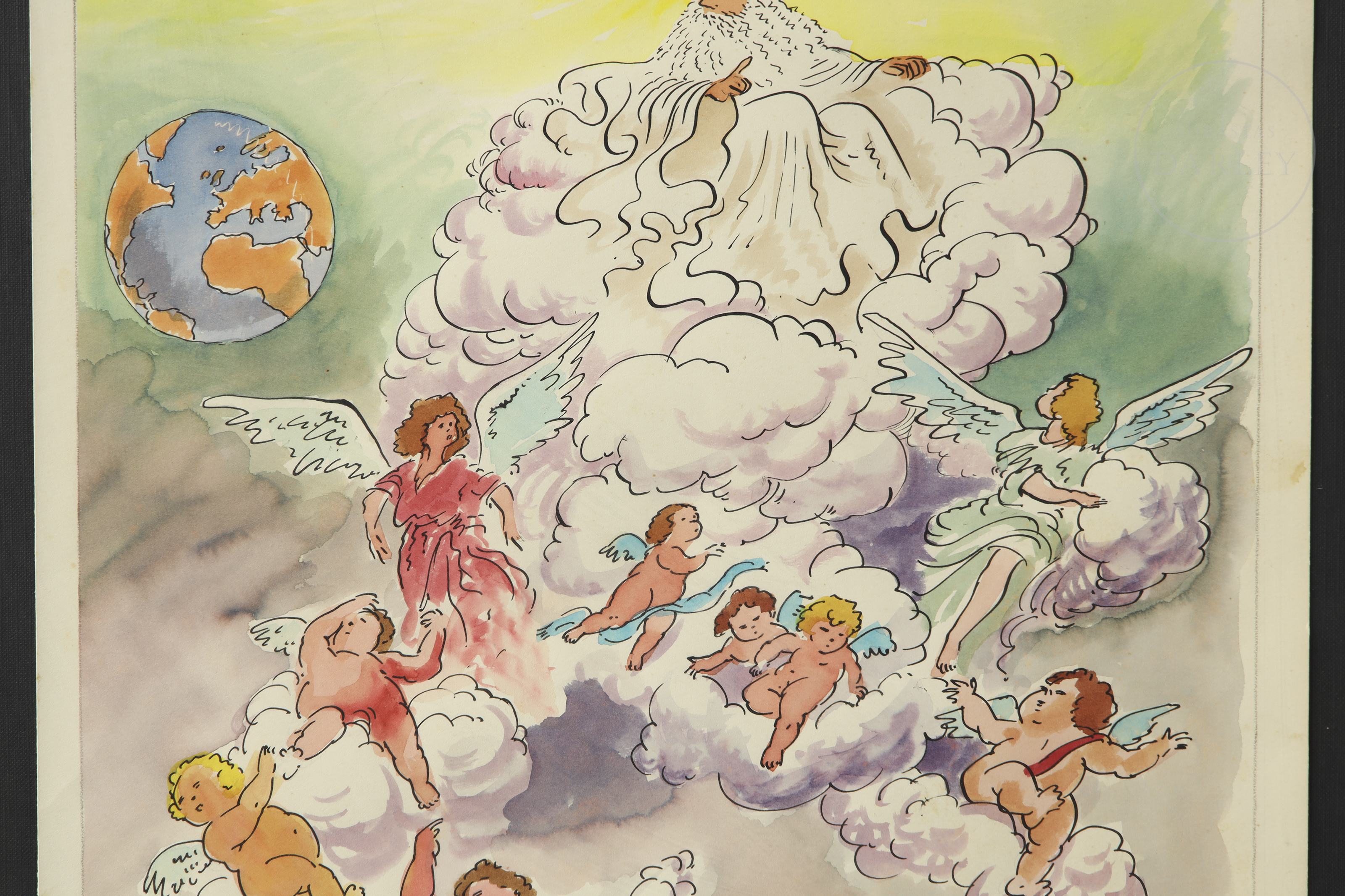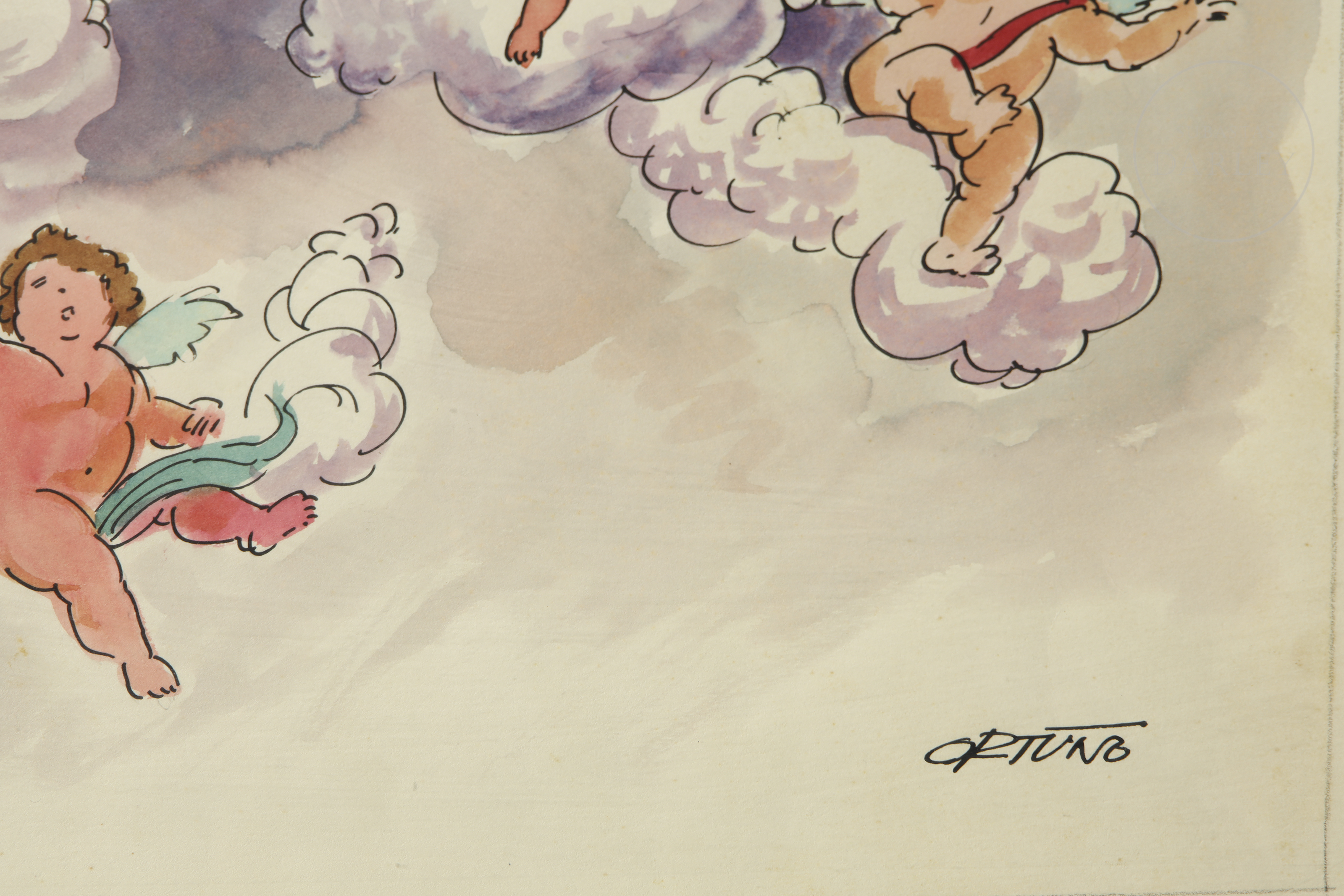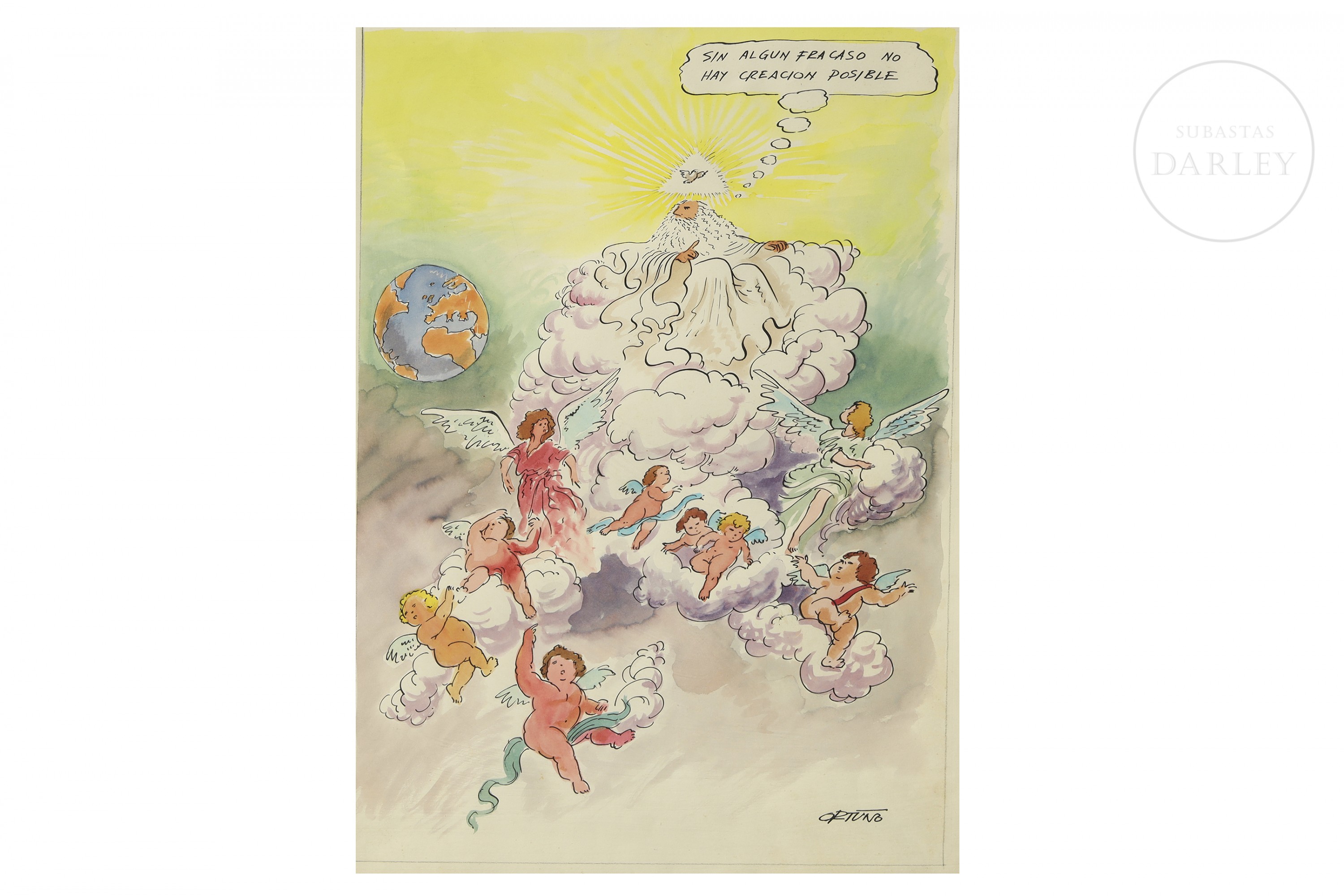 Watercolor and ink on paper. Signed “Ortuño” in the lower right corner of the work. The piece depicts a vignette-like scene with the text: “Without some failure, no creation is possible.”