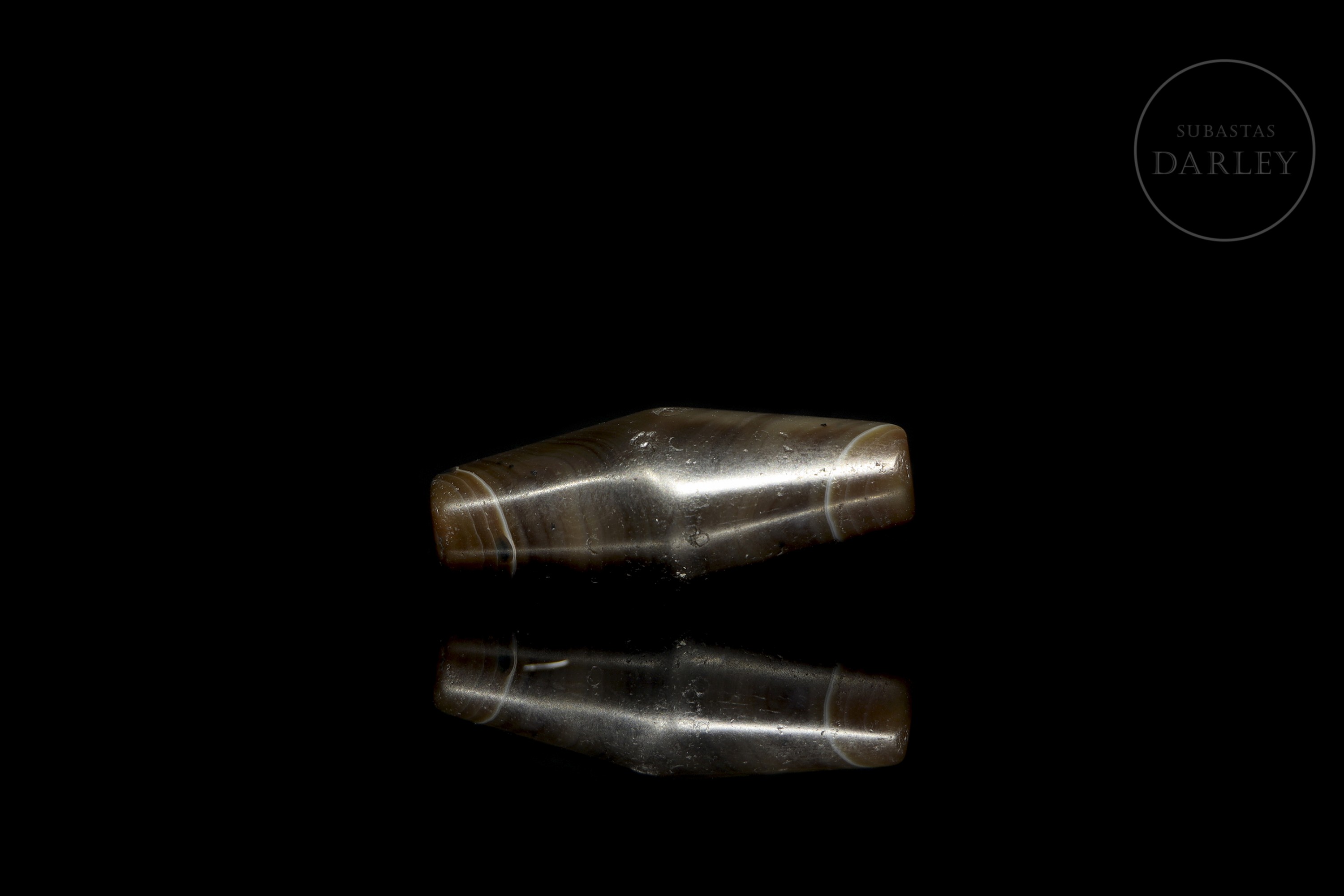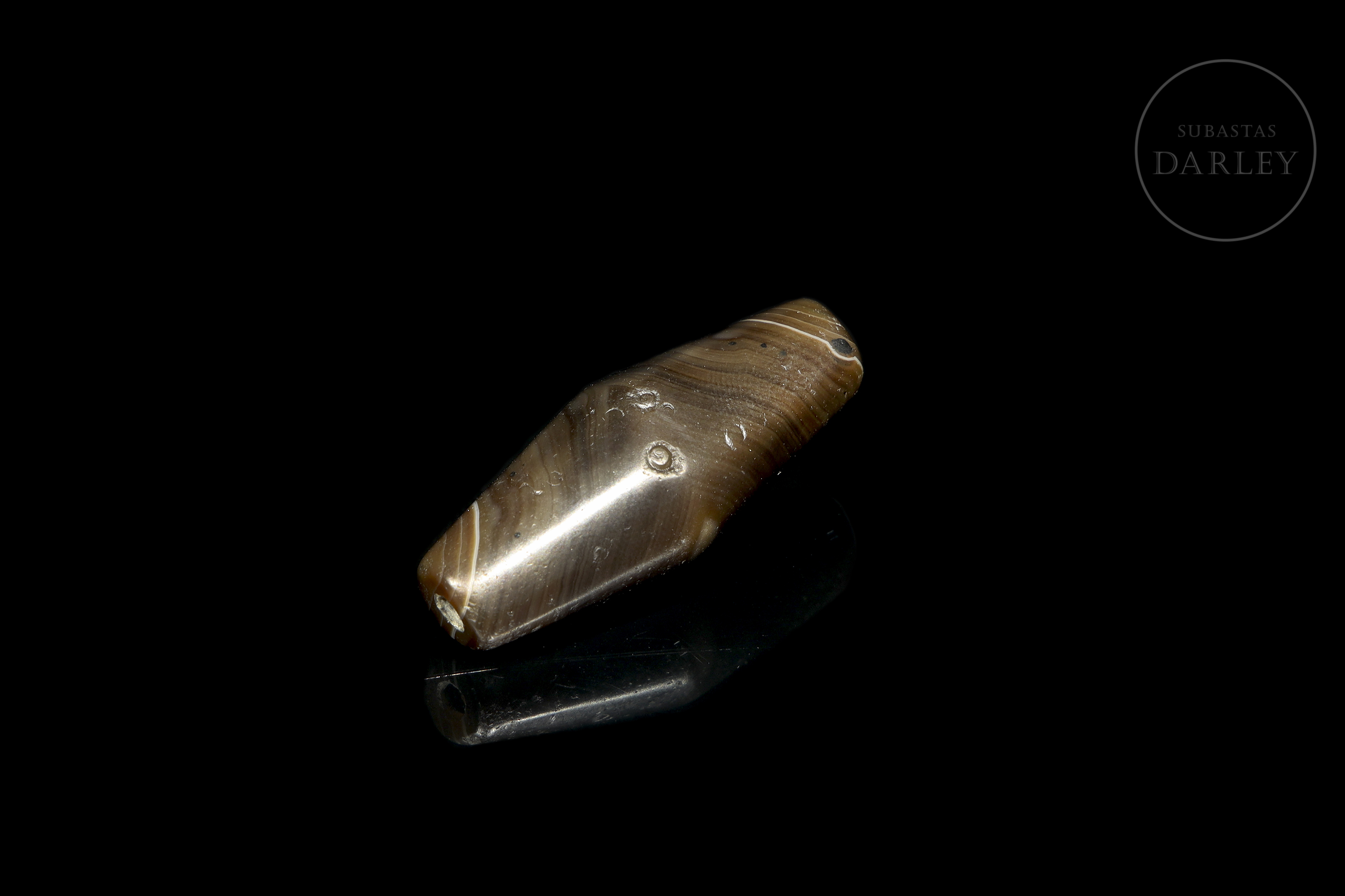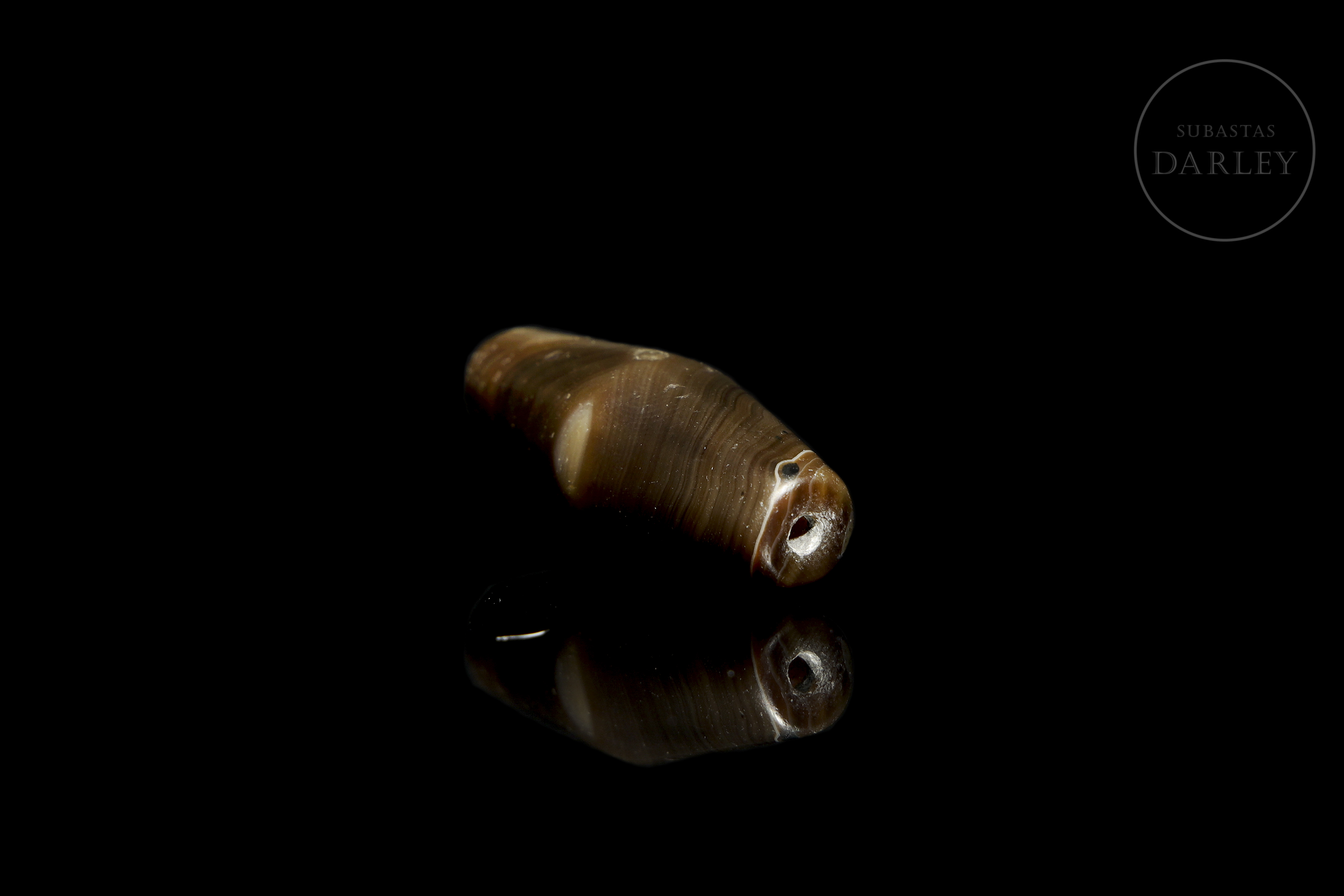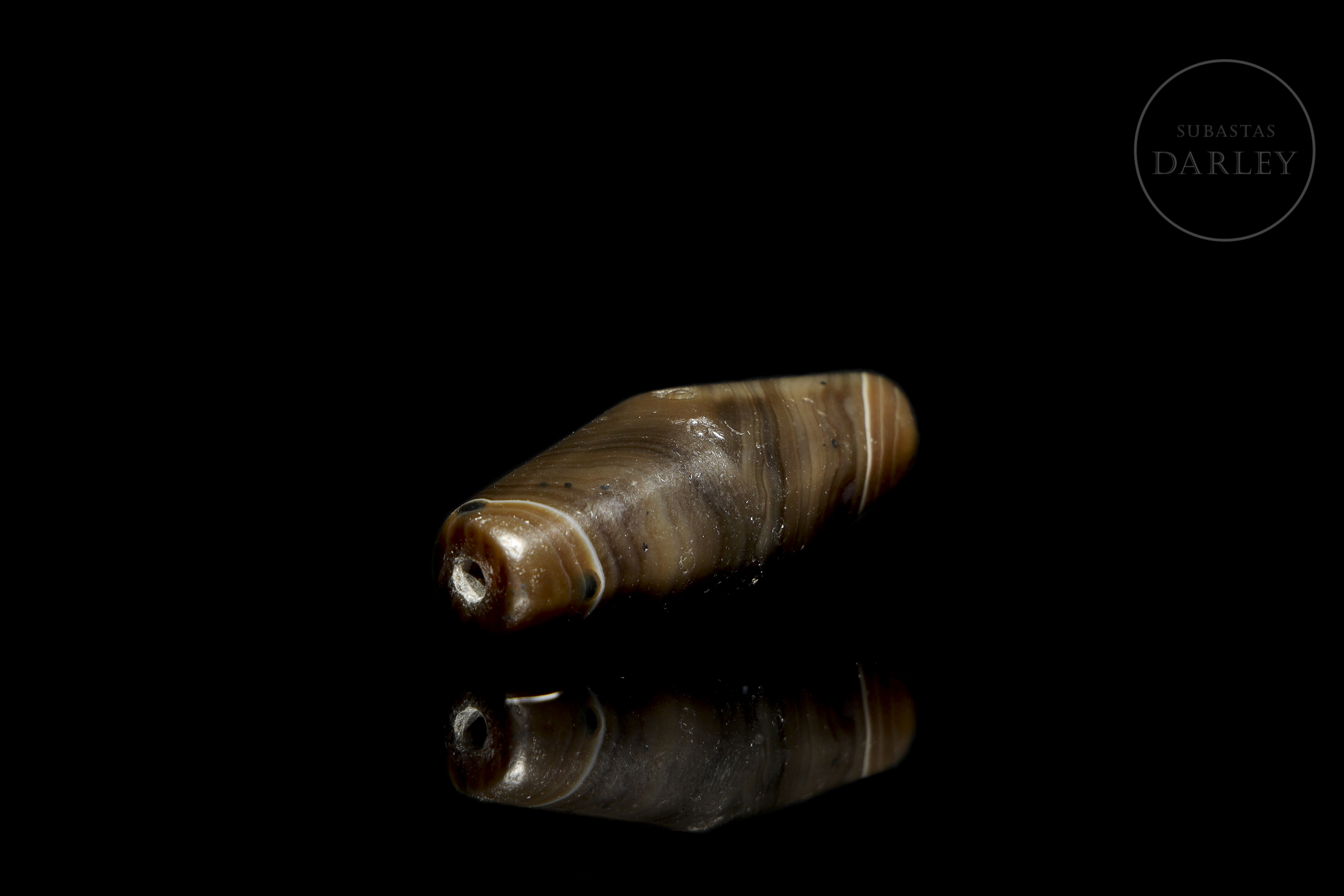 Carved agate ‘Dzi’ bead (千年老珠), elongated cylindrical with a widened centre and slightly rounded ends, with a transverse perforation. The piece is made of intensely brown agate with areas of honey and greyish tones. It is decorated with a series of concentric circles. The surface shows significant patina and wear due to ageing.