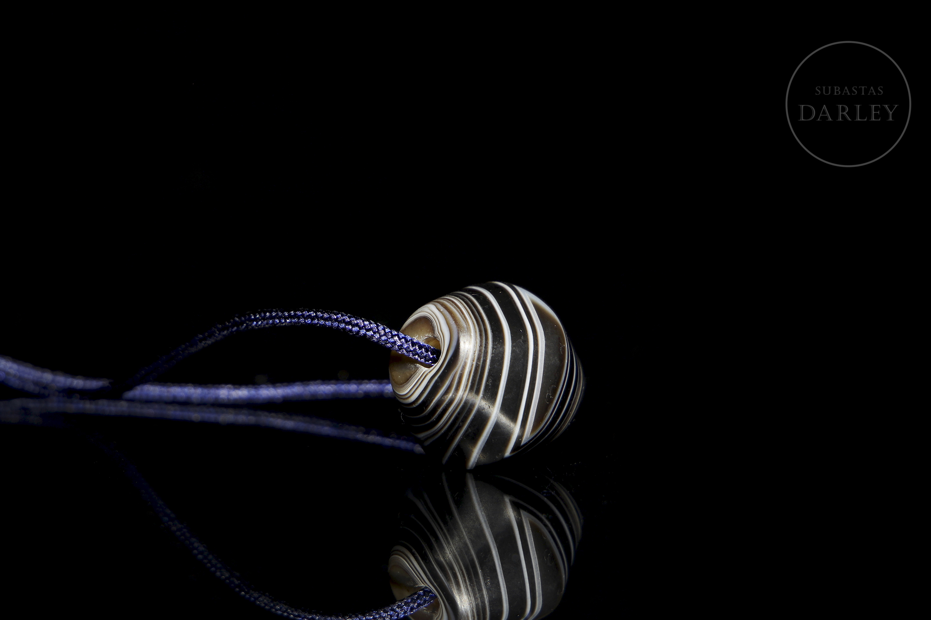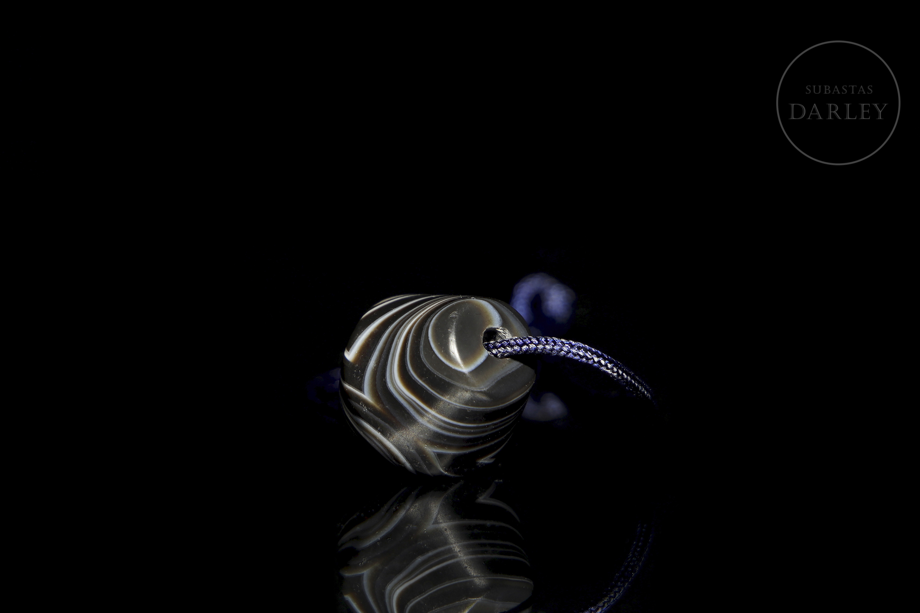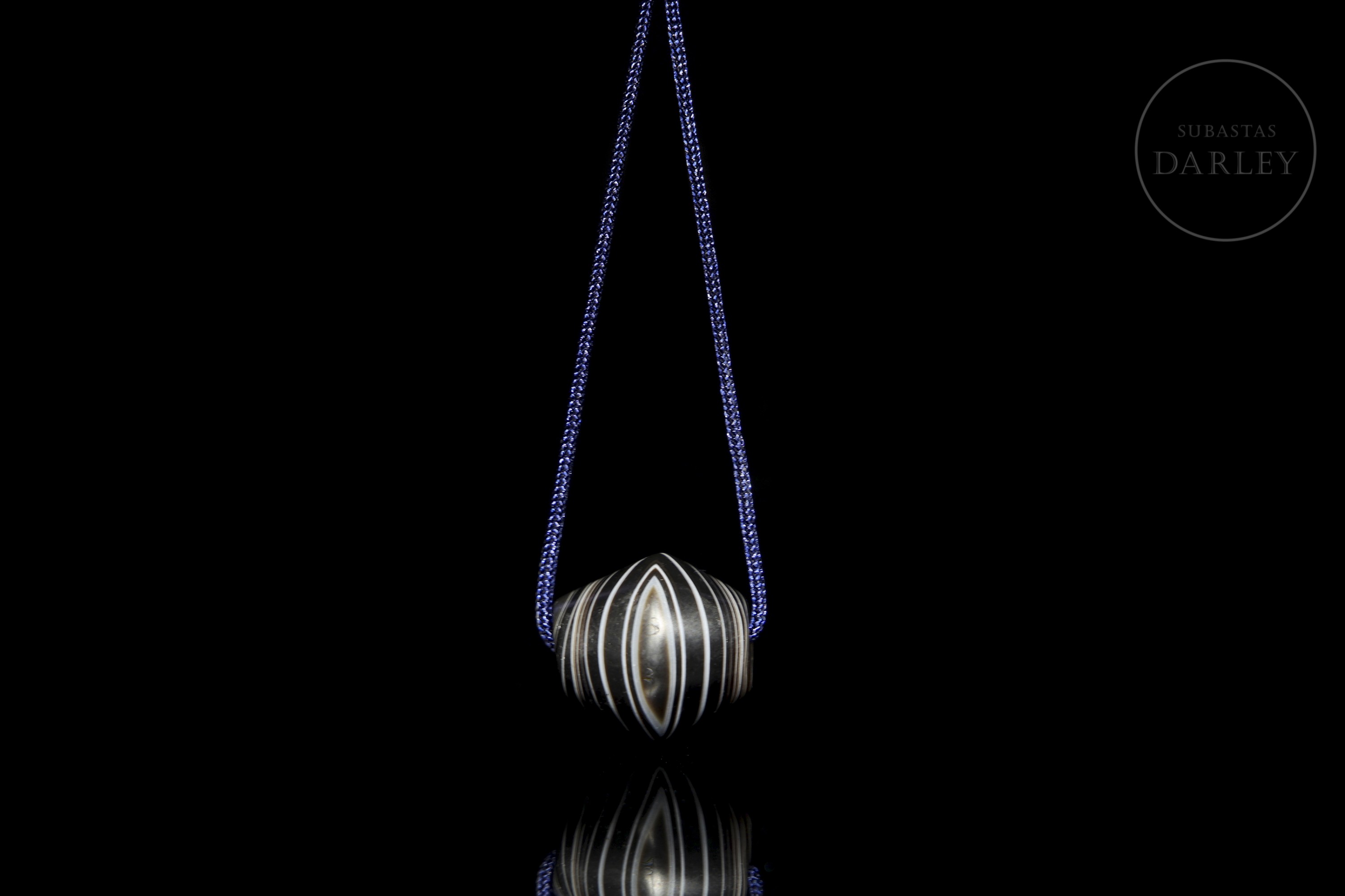 Hard stone with a deep black hue and alternating natural white bands. The piece has a flattened globular shape, widening in the centre. Its concentric bands stand out, creating a visual pattern with a central ‘eye’. It has a longitudinal perforation. The surface shows patina and wear due to ageing.