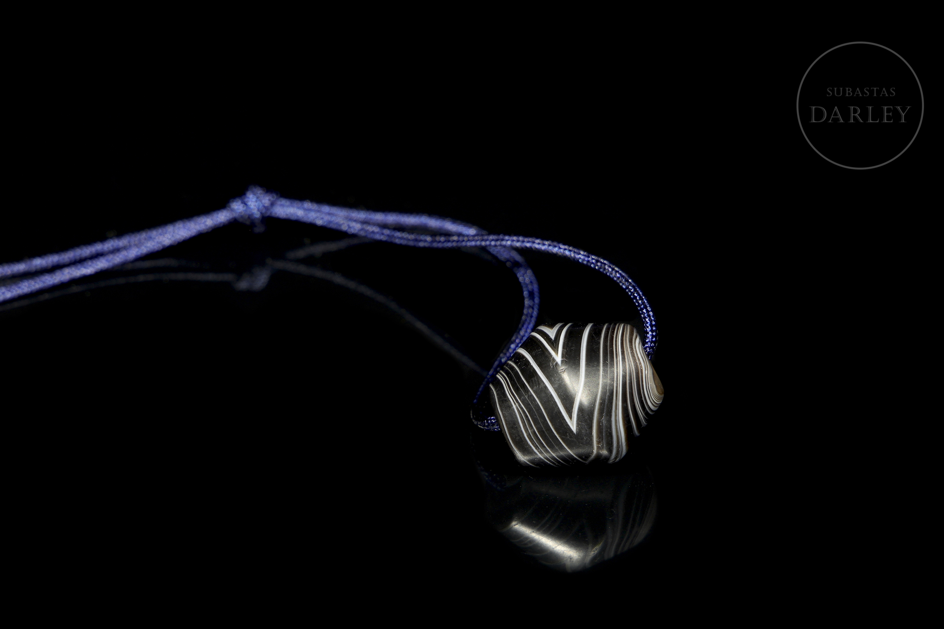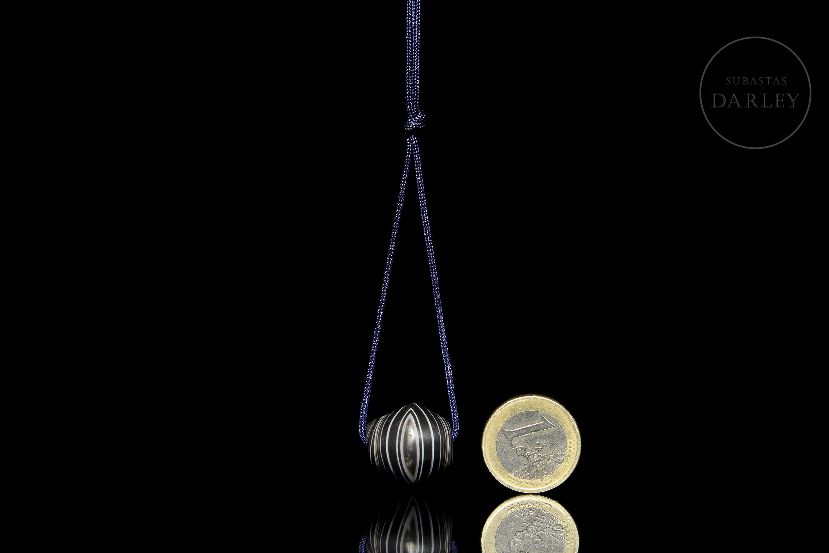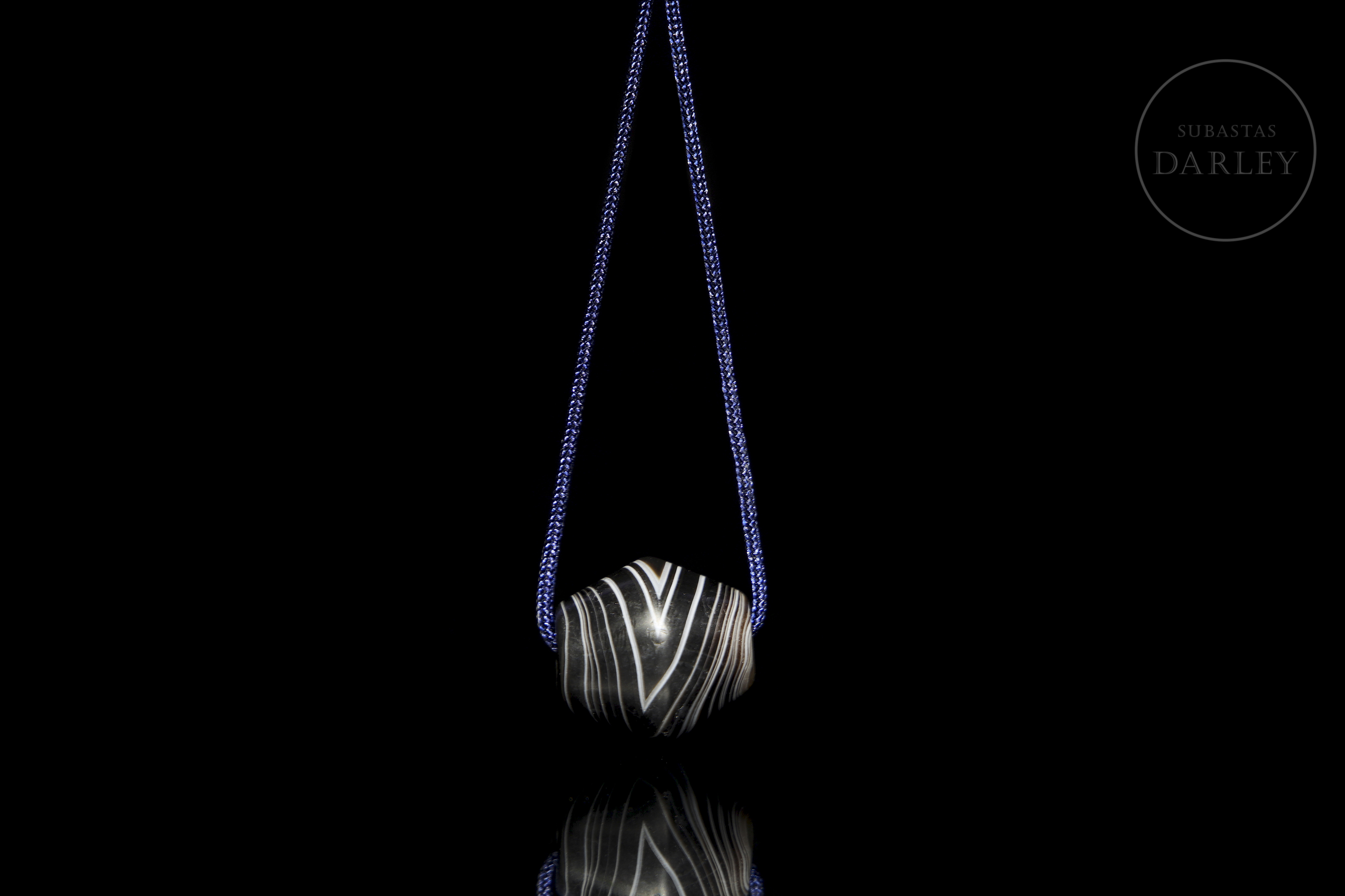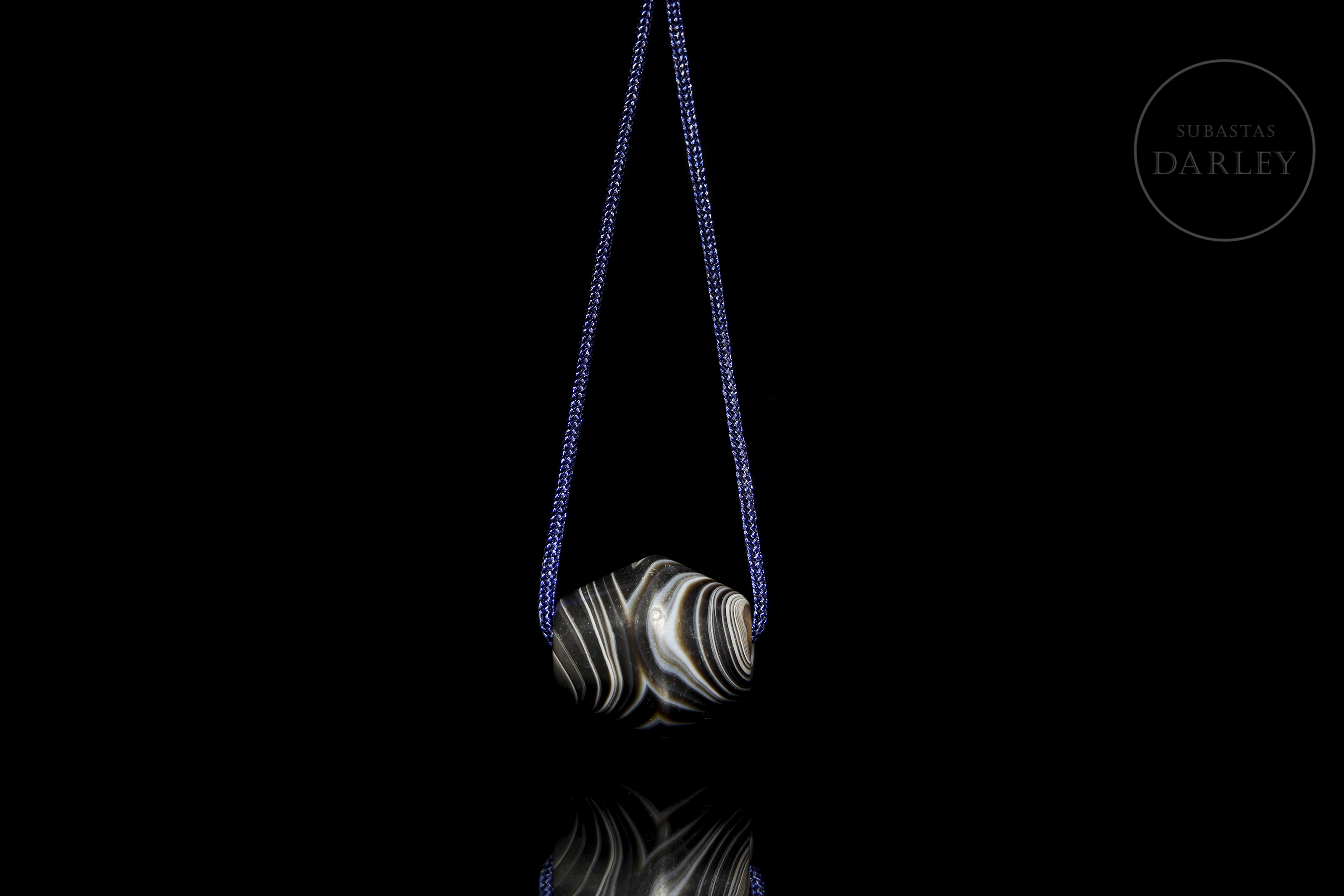 Hard stone with a deep black hue and alternating natural white bands. The piece has a flattened globular shape, widening in the centre. Its concentric bands stand out, creating a visual pattern with a central ‘eye’. It has a longitudinal perforation. The surface shows patina and wear due to ageing.