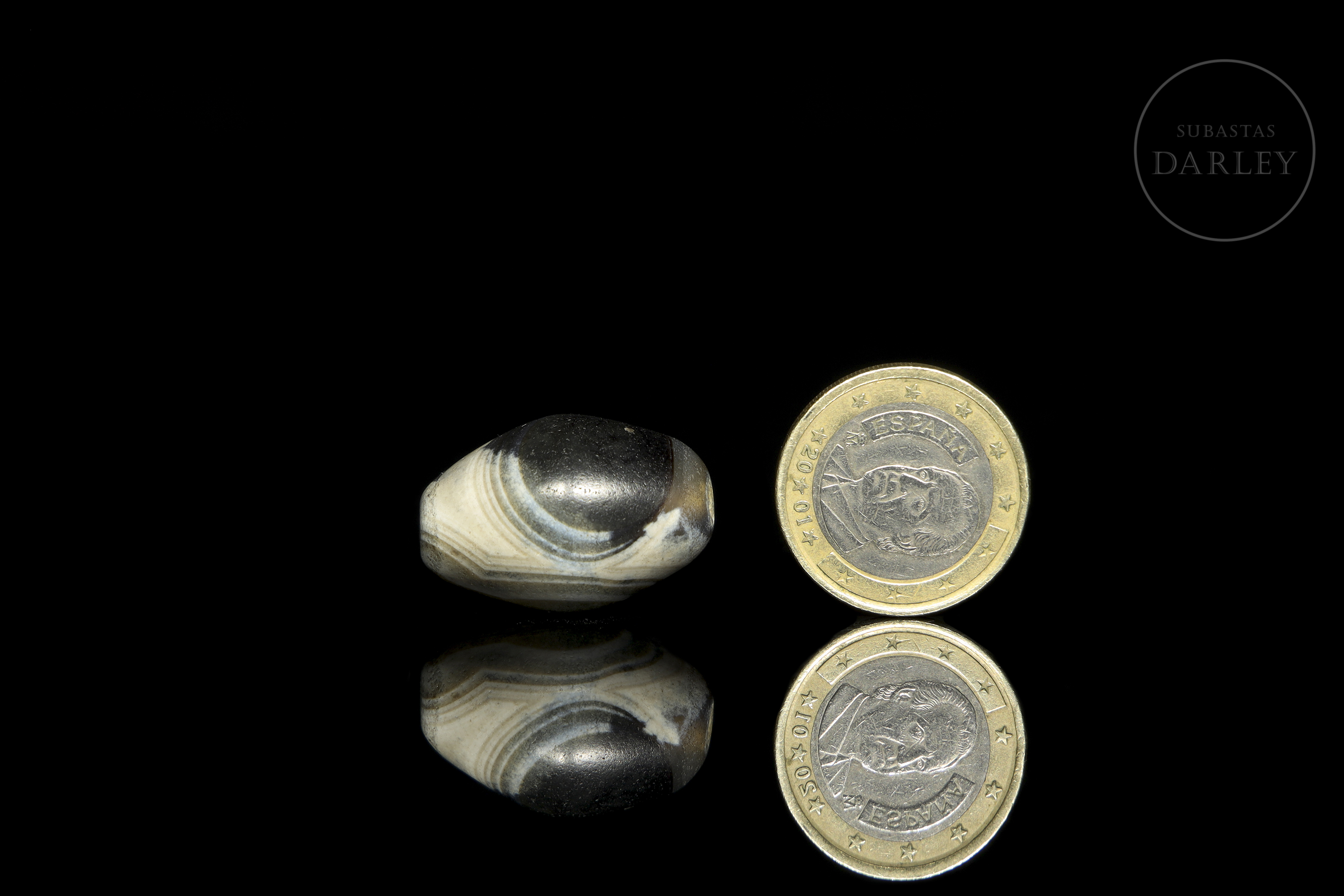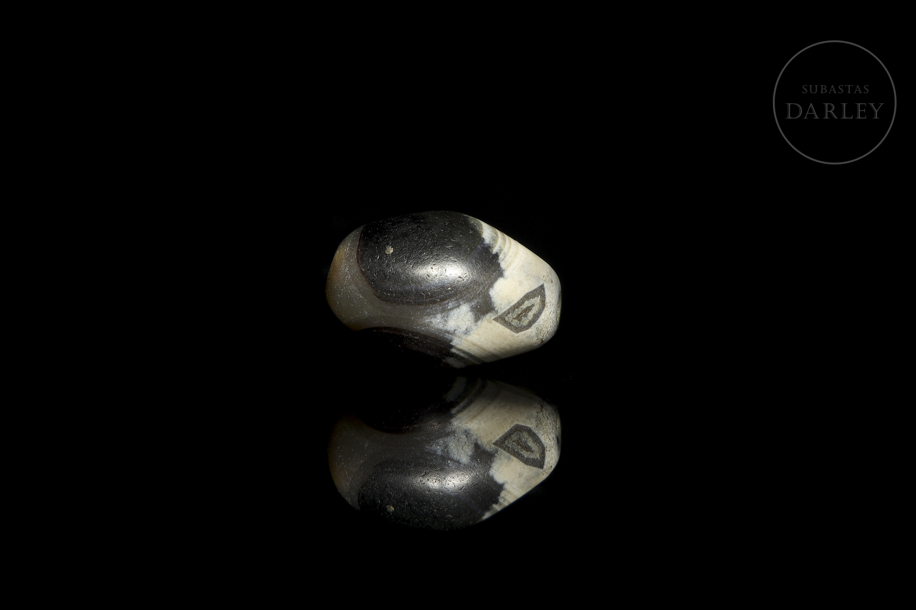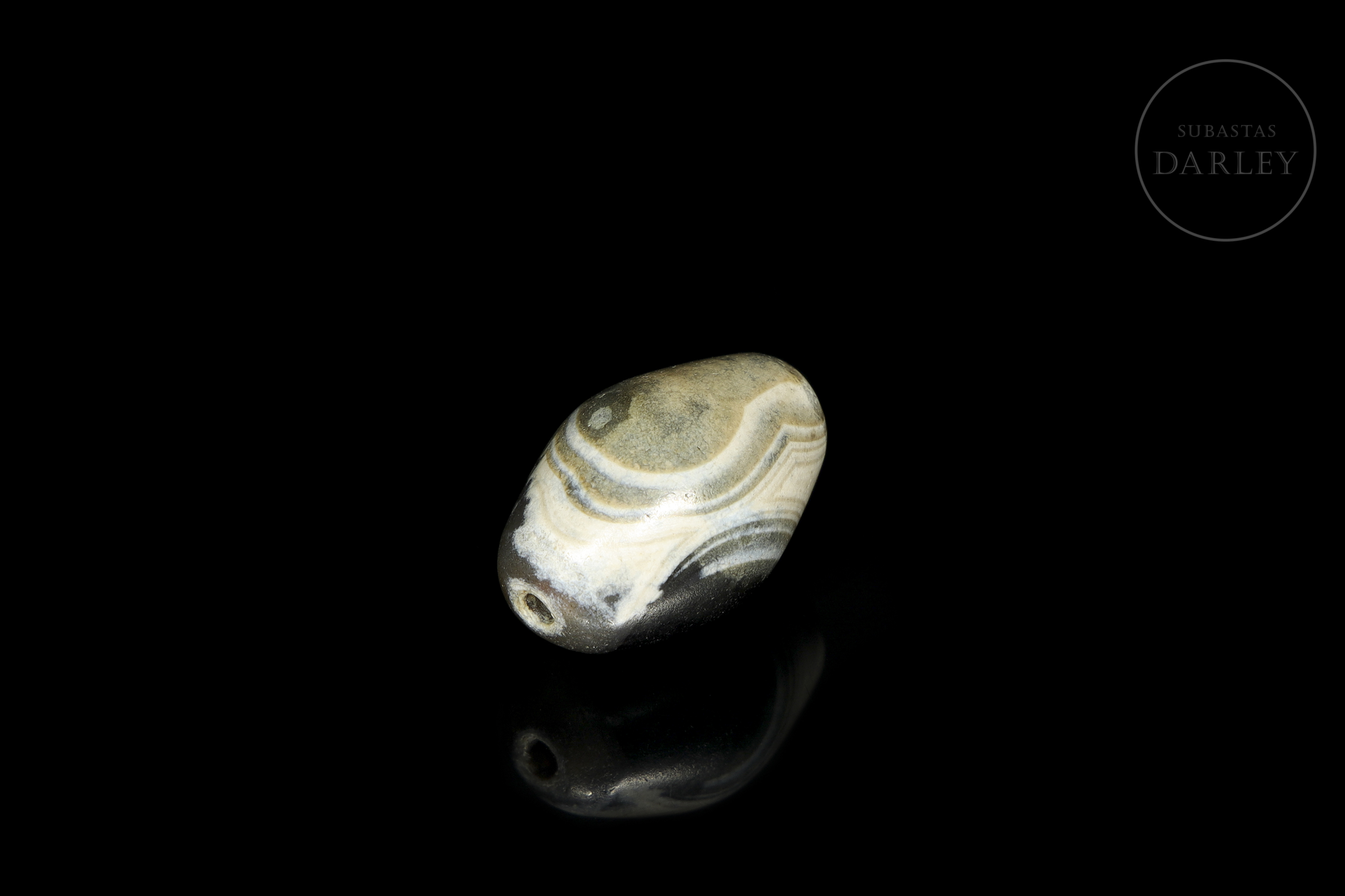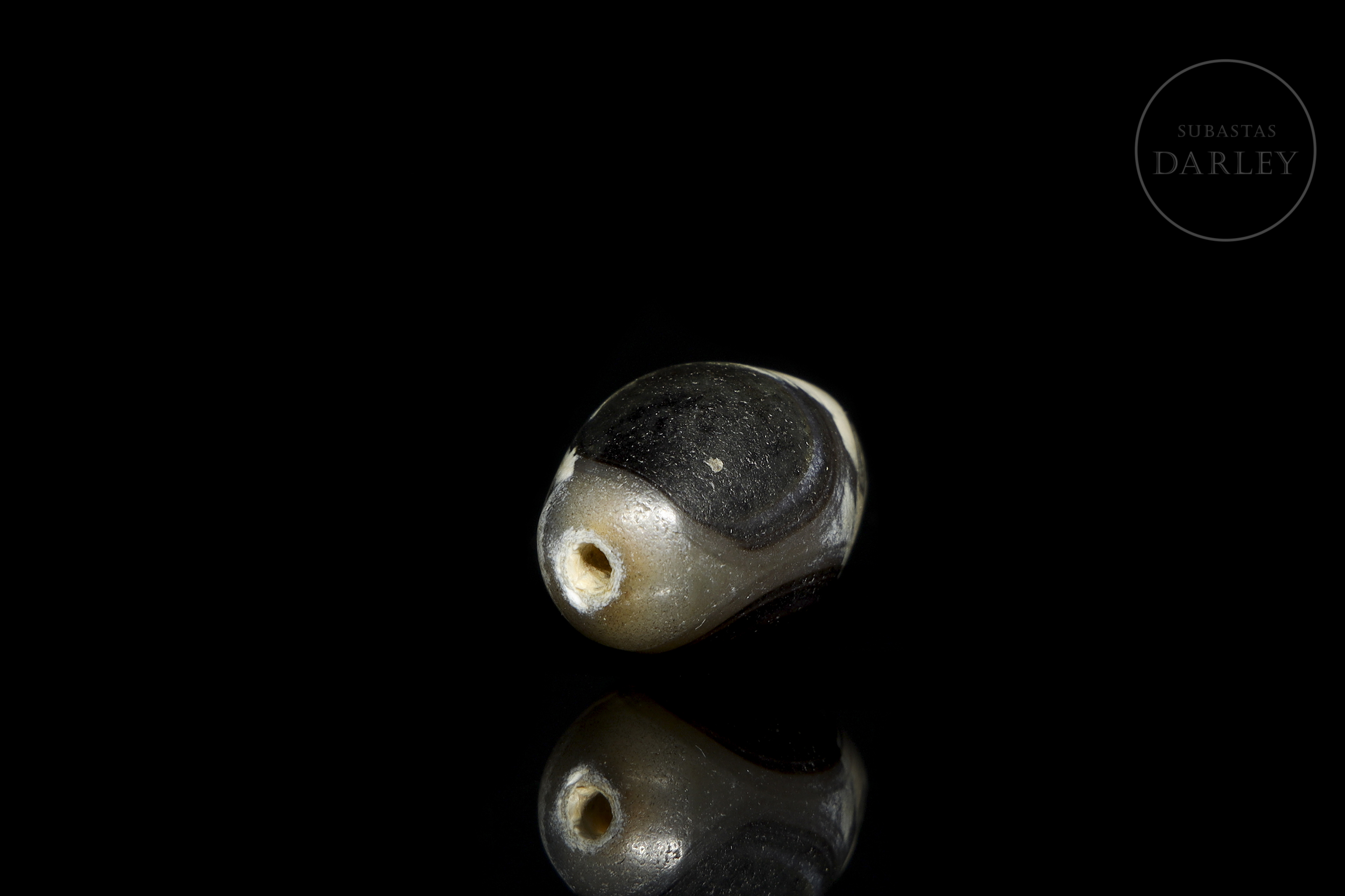 Carved agate, short and rounded cylindrical in shape, with a markedly widened centre, a longitudinal perforation and blunt ends. The piece is made of agate in an almost black greyish tone with areas of white, which are distributed to form an ‘eye’ design. The surface shows a notable patina due to ageing.