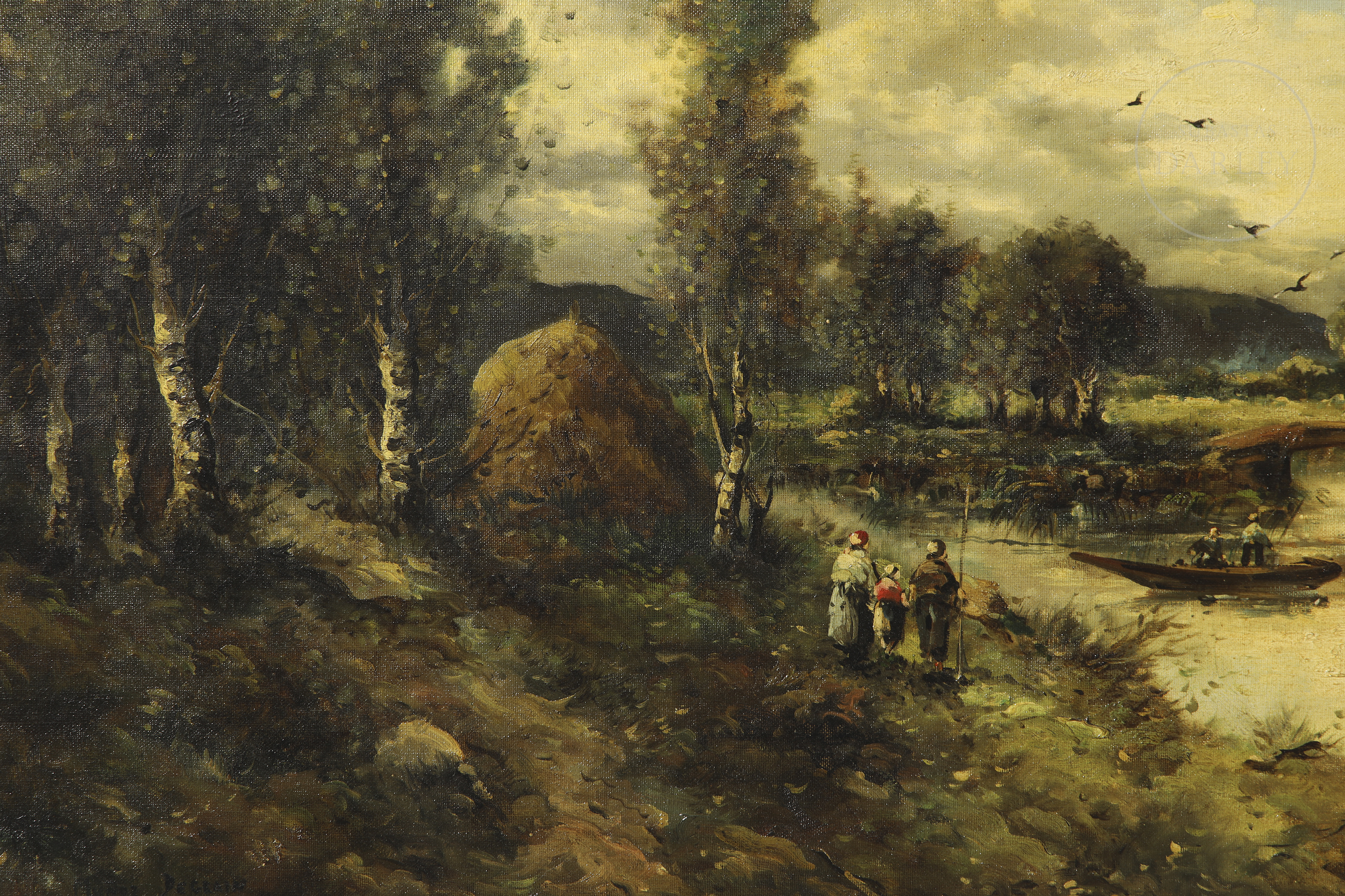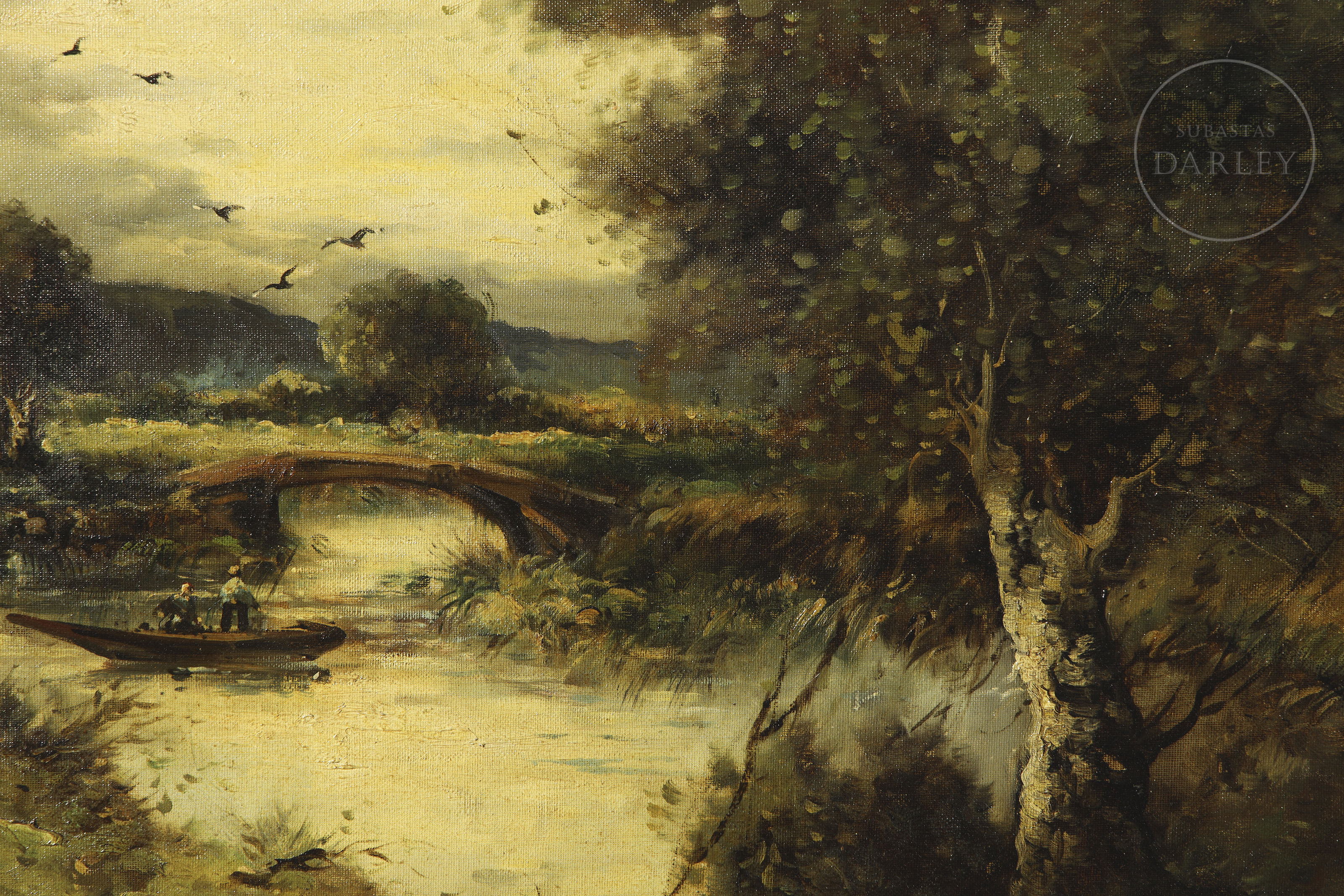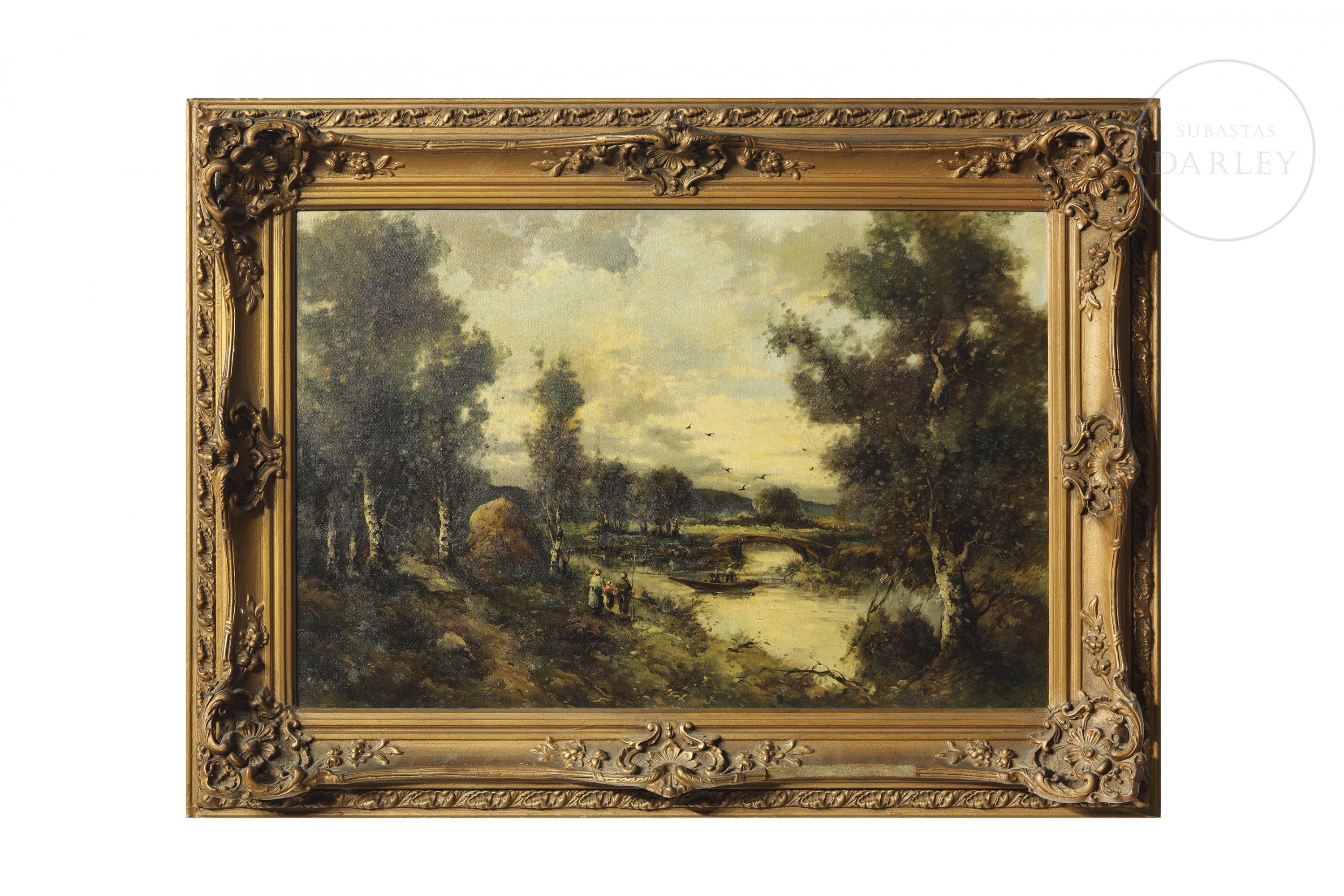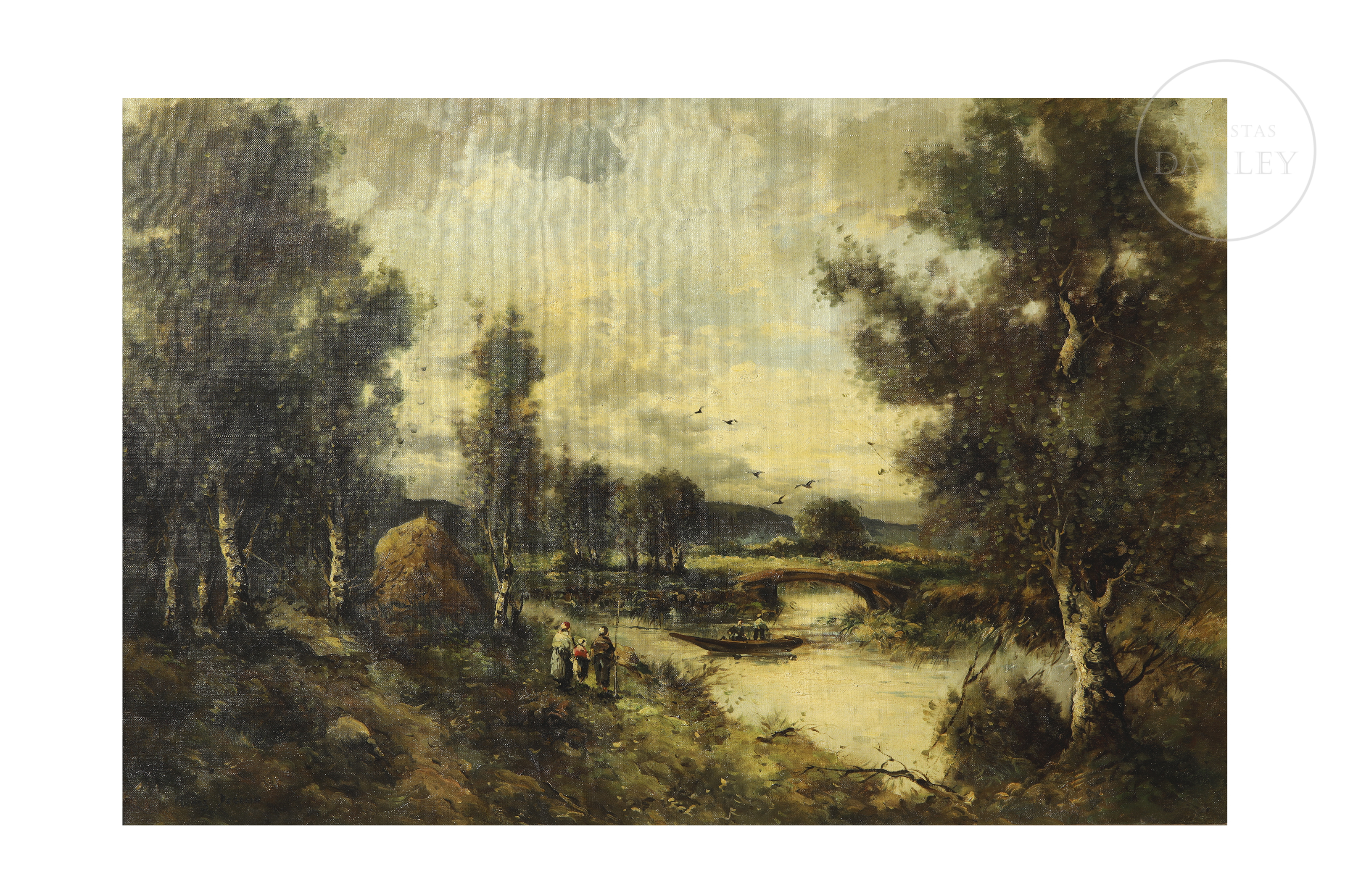 Oil on canvas. Romantic landscape depicting a river flanked by trees and a stone bridge in the background. Human figures are positioned on the riverbank in the foreground.