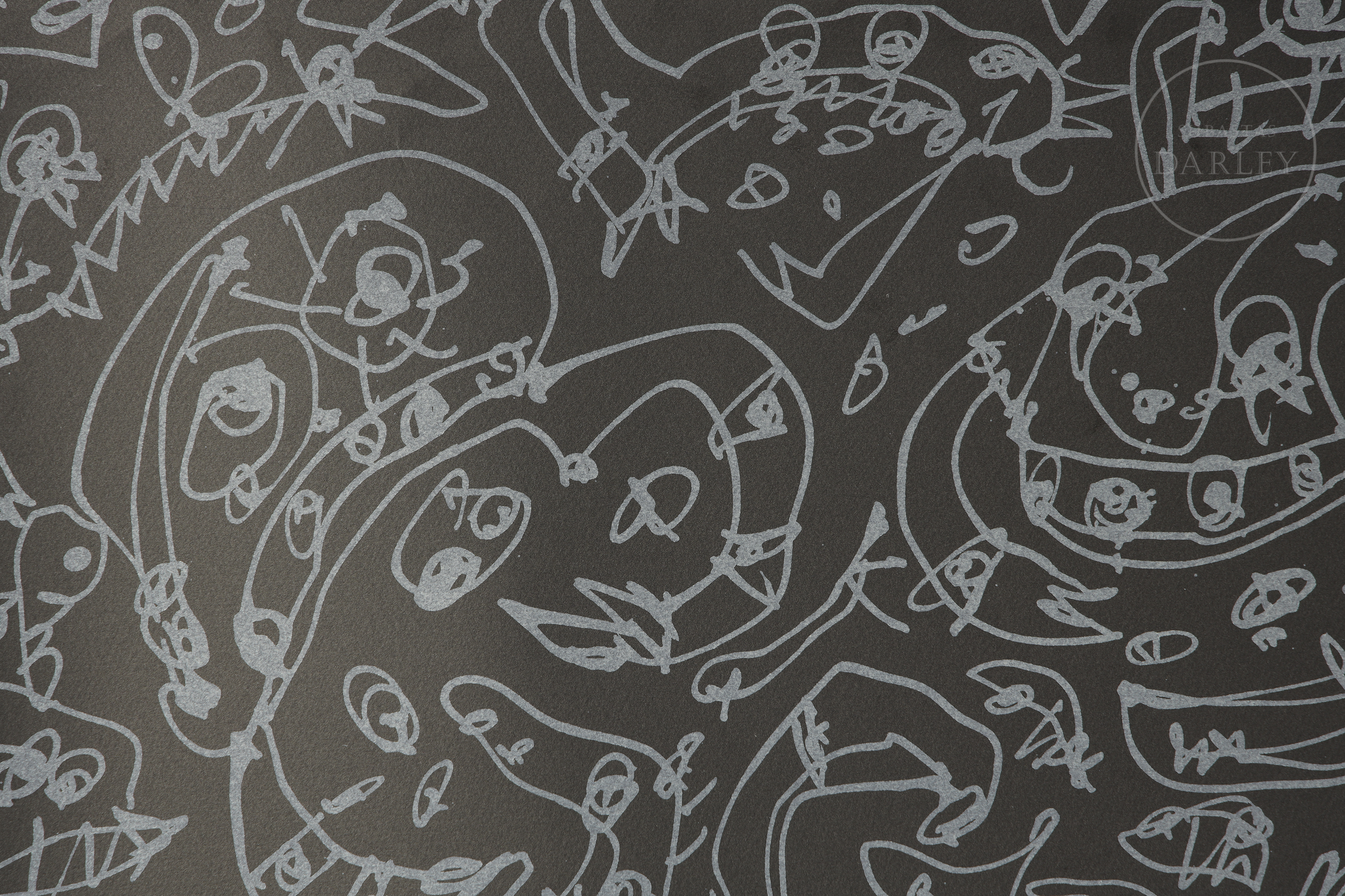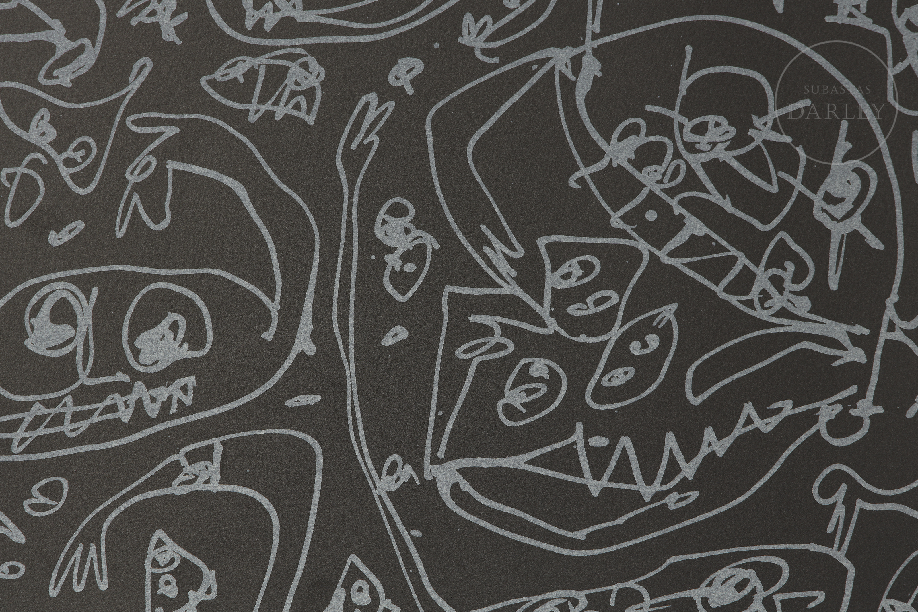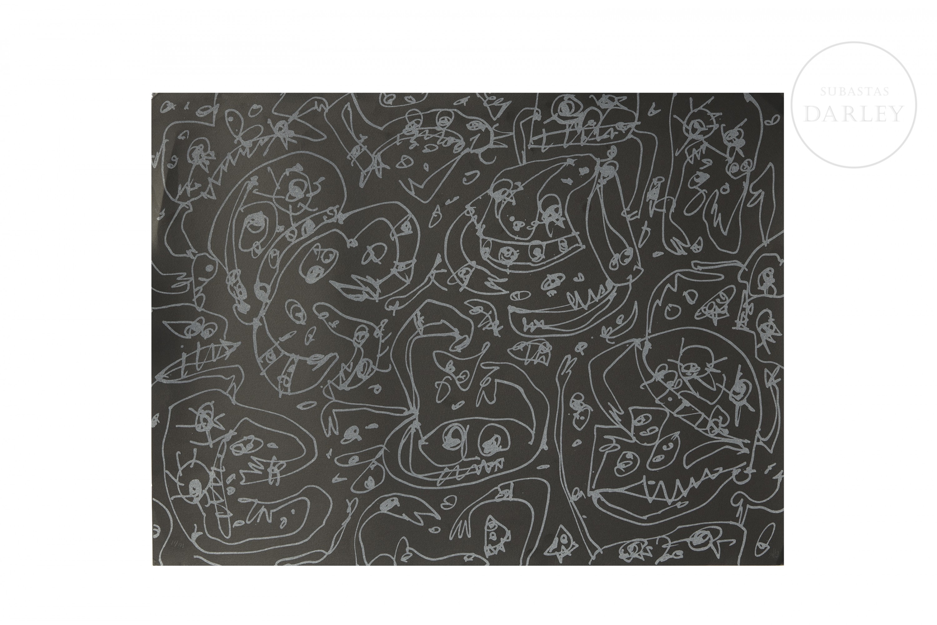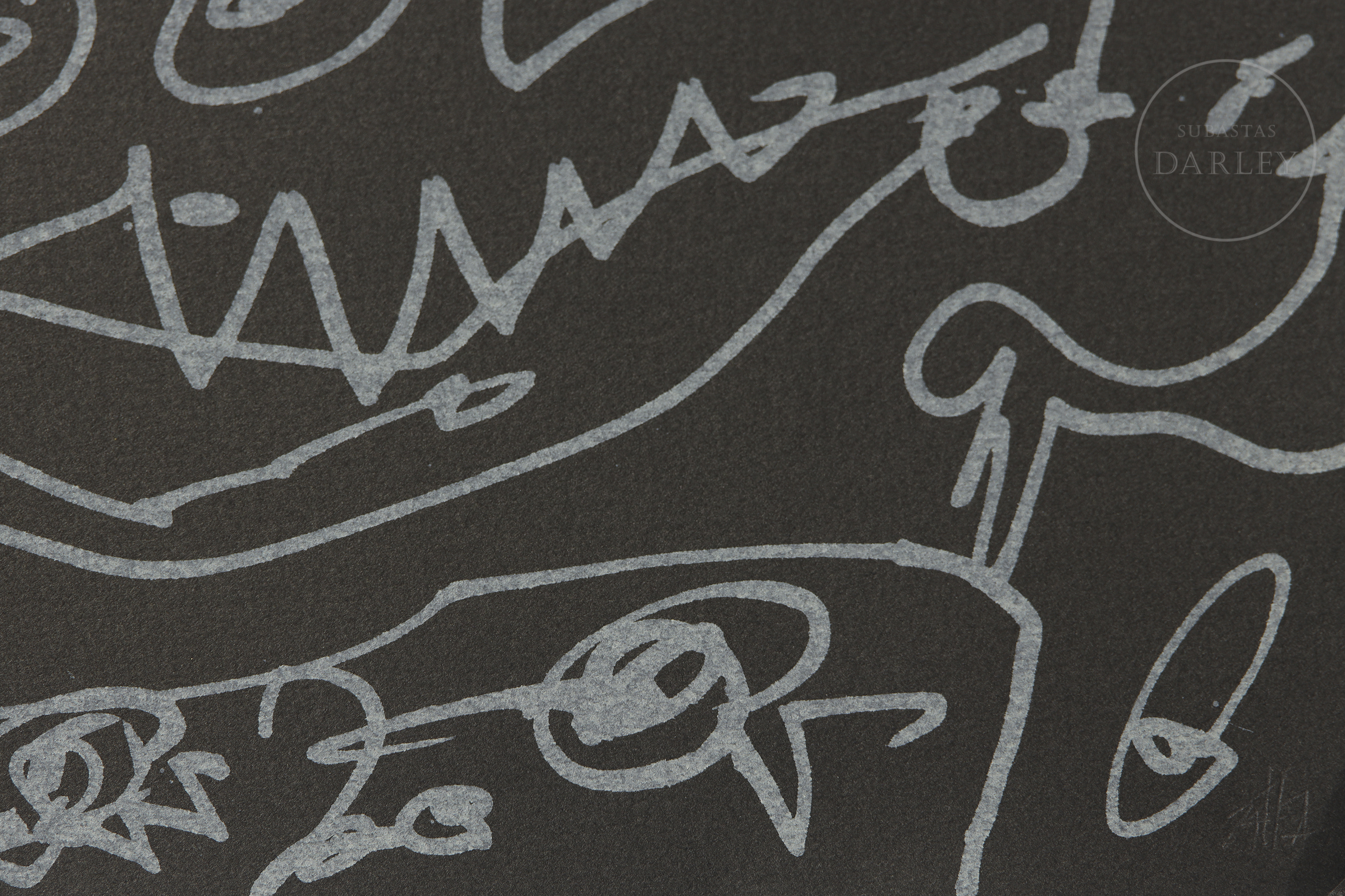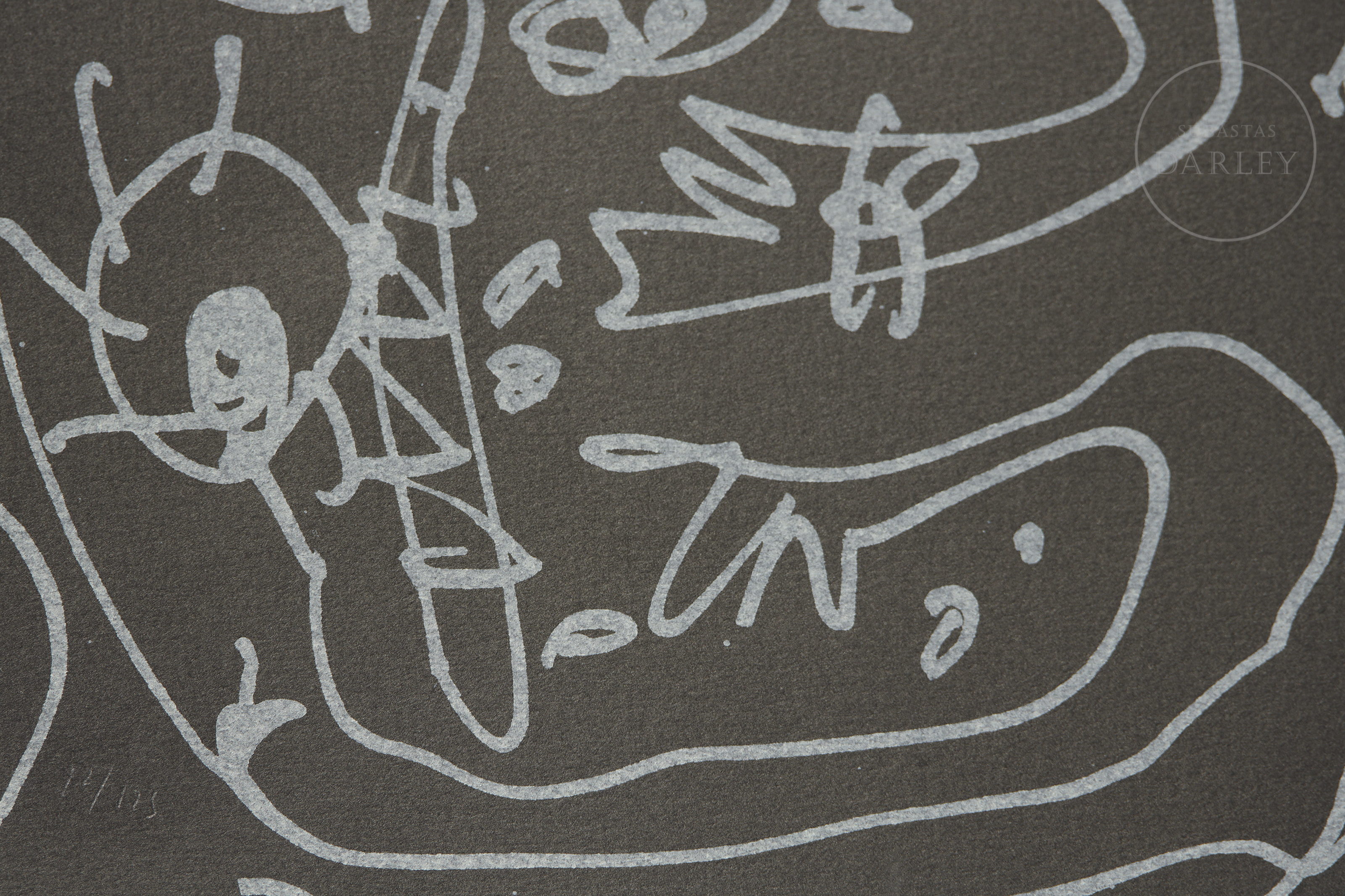 Engraving on paper. Abstract composition rendered as a dense network of grotesque figures and faces, traced in white line on a dark background. Signed ‘Saura’ in the lower right corner and hand-numbered ‘12/125’ in the lower left corner.