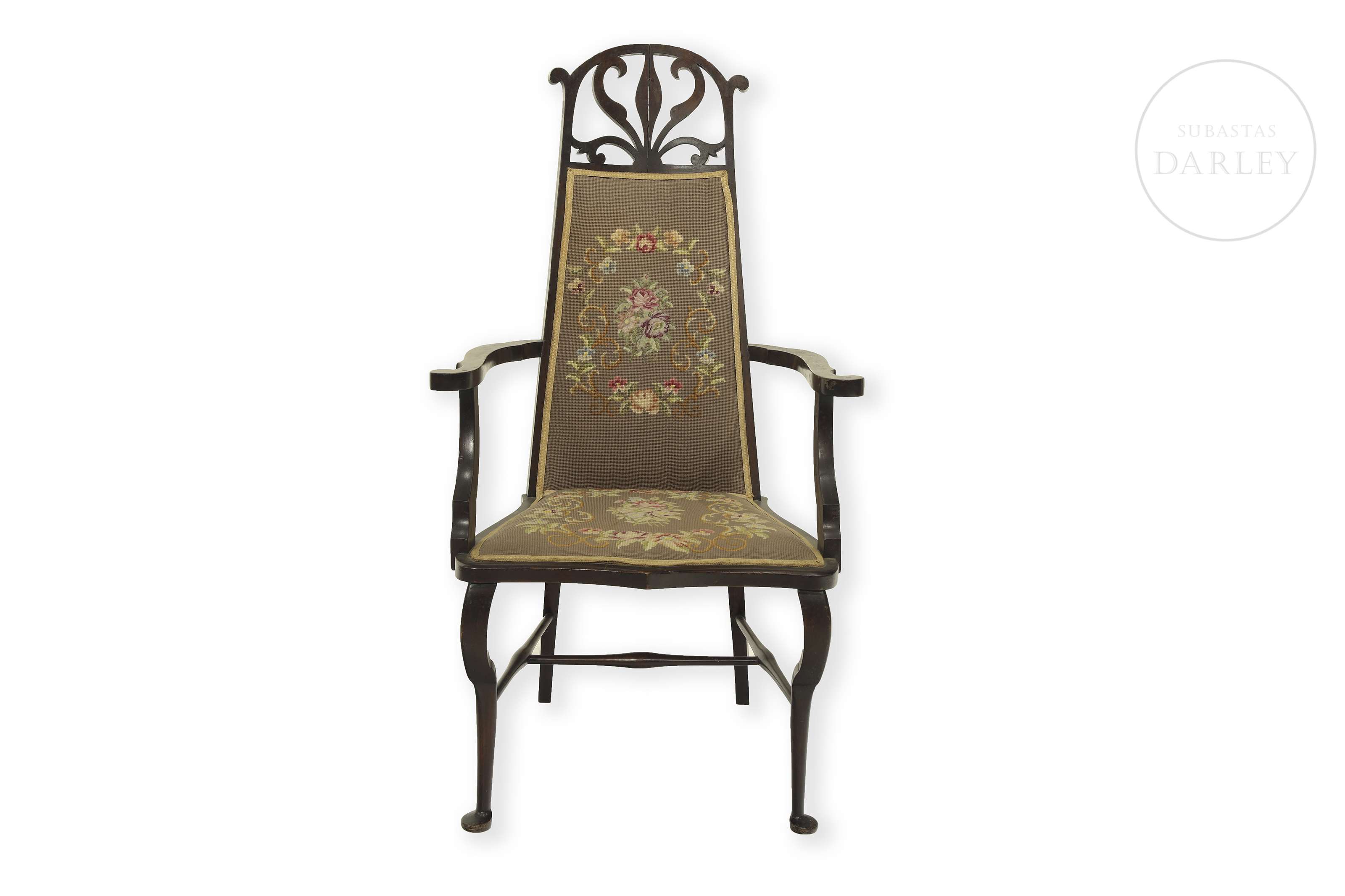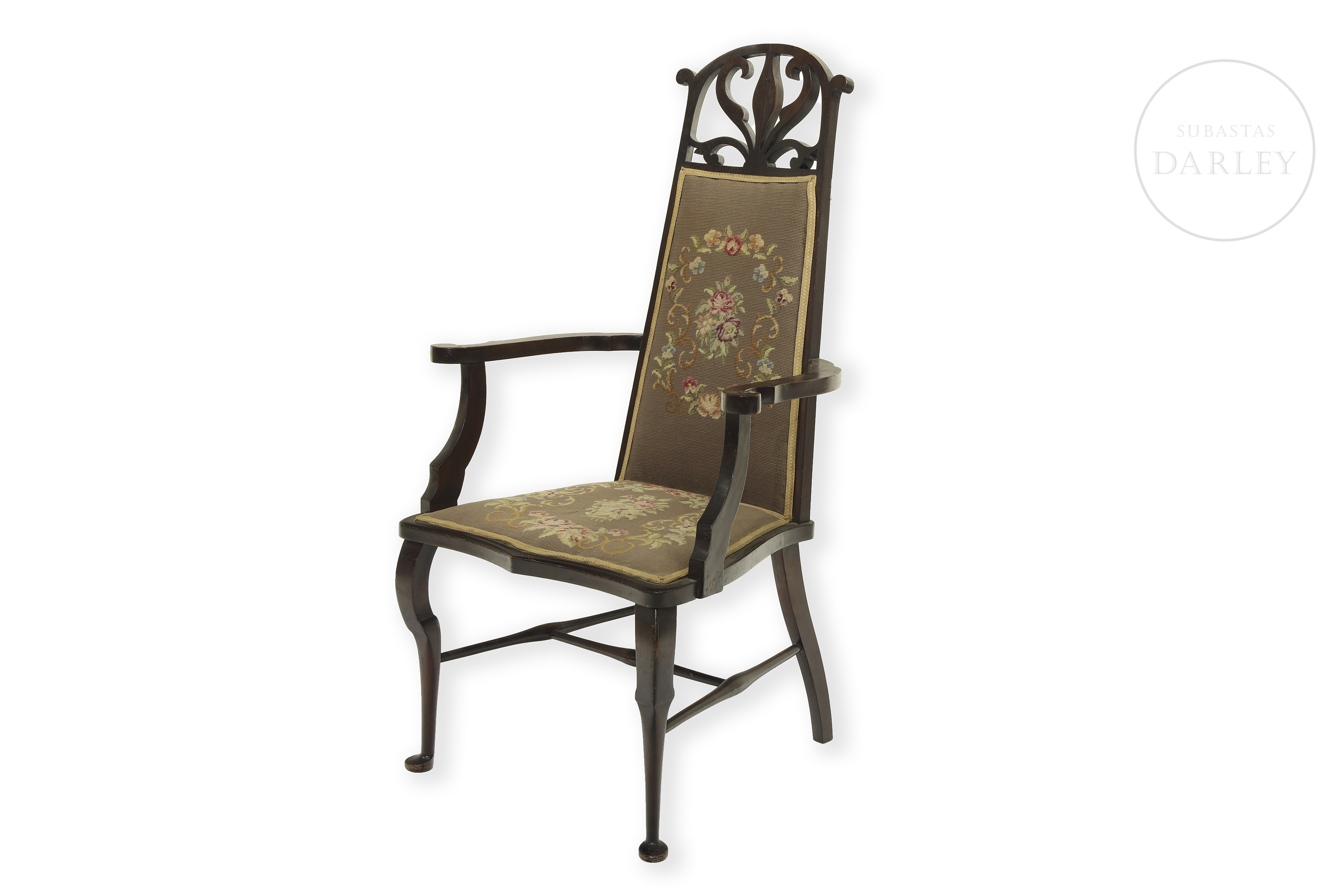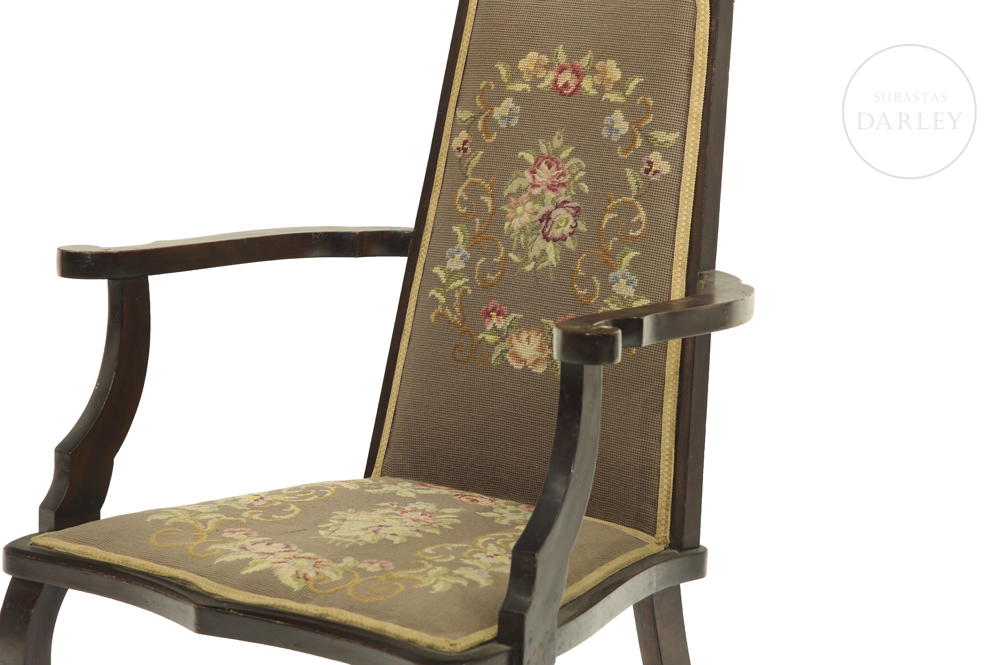 Carved wooden seat, with a long, narrow backrest, finished with a headrest with openwork vegetal motifs. Upholstered with embroidered floral details.