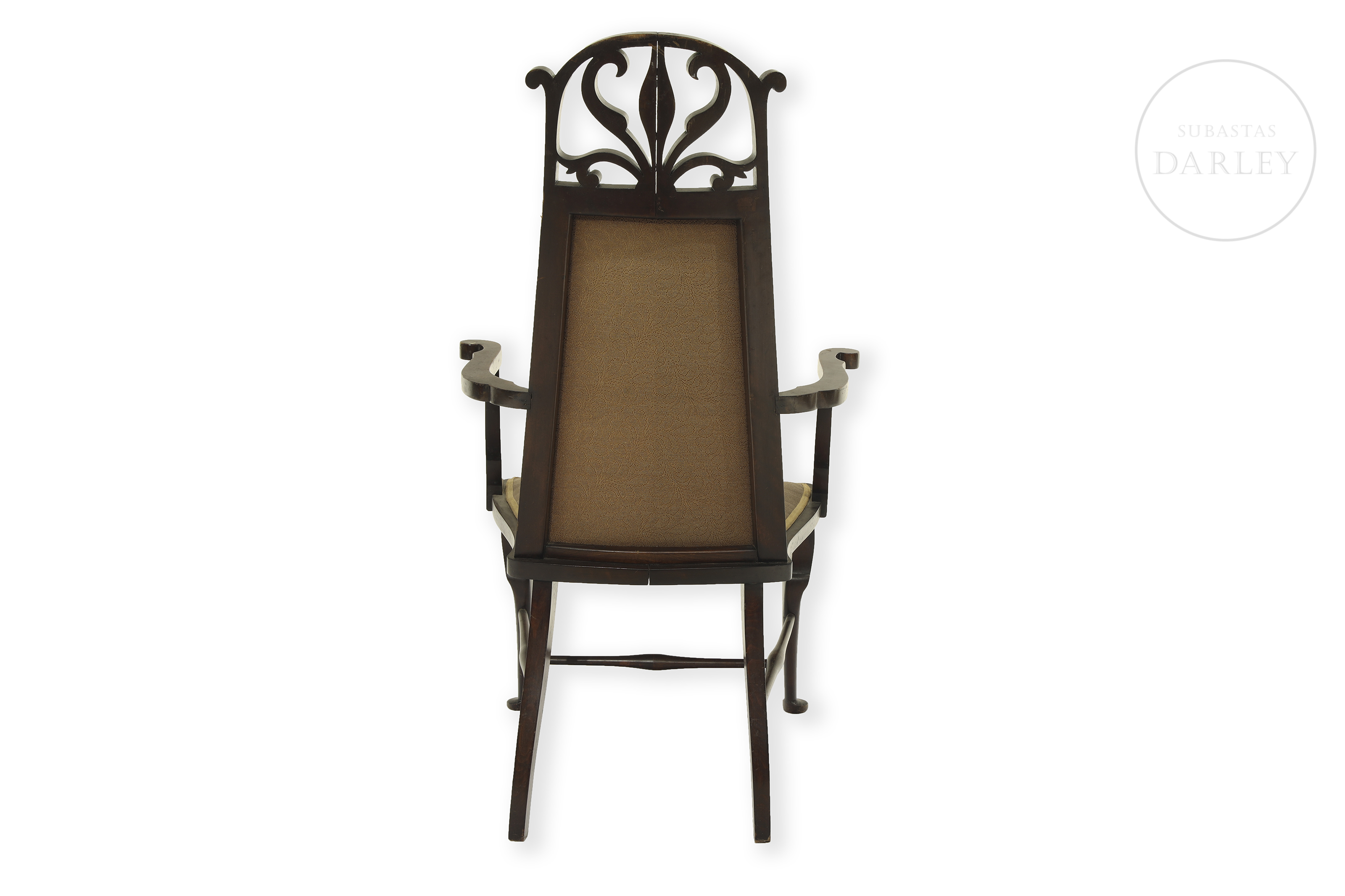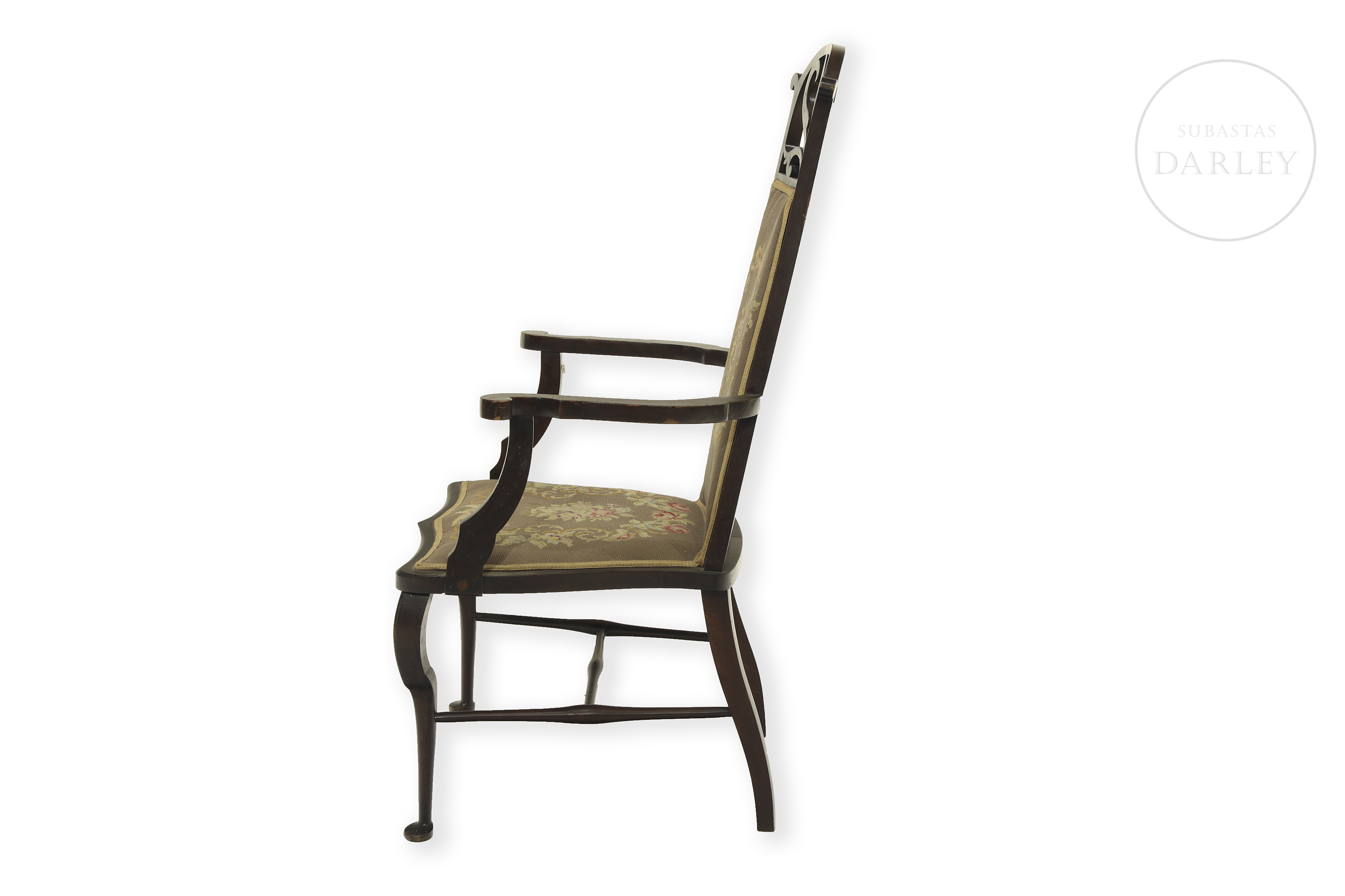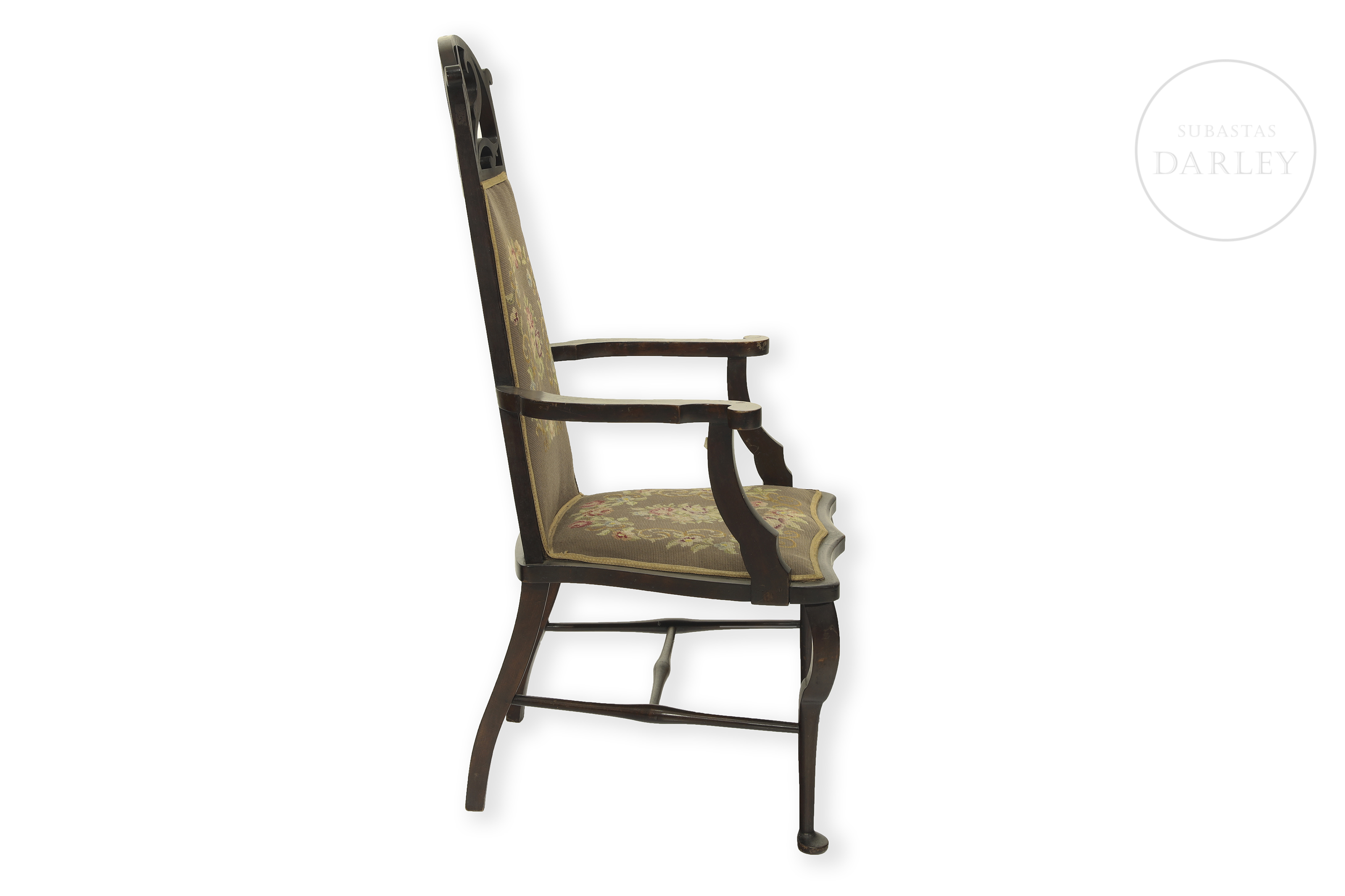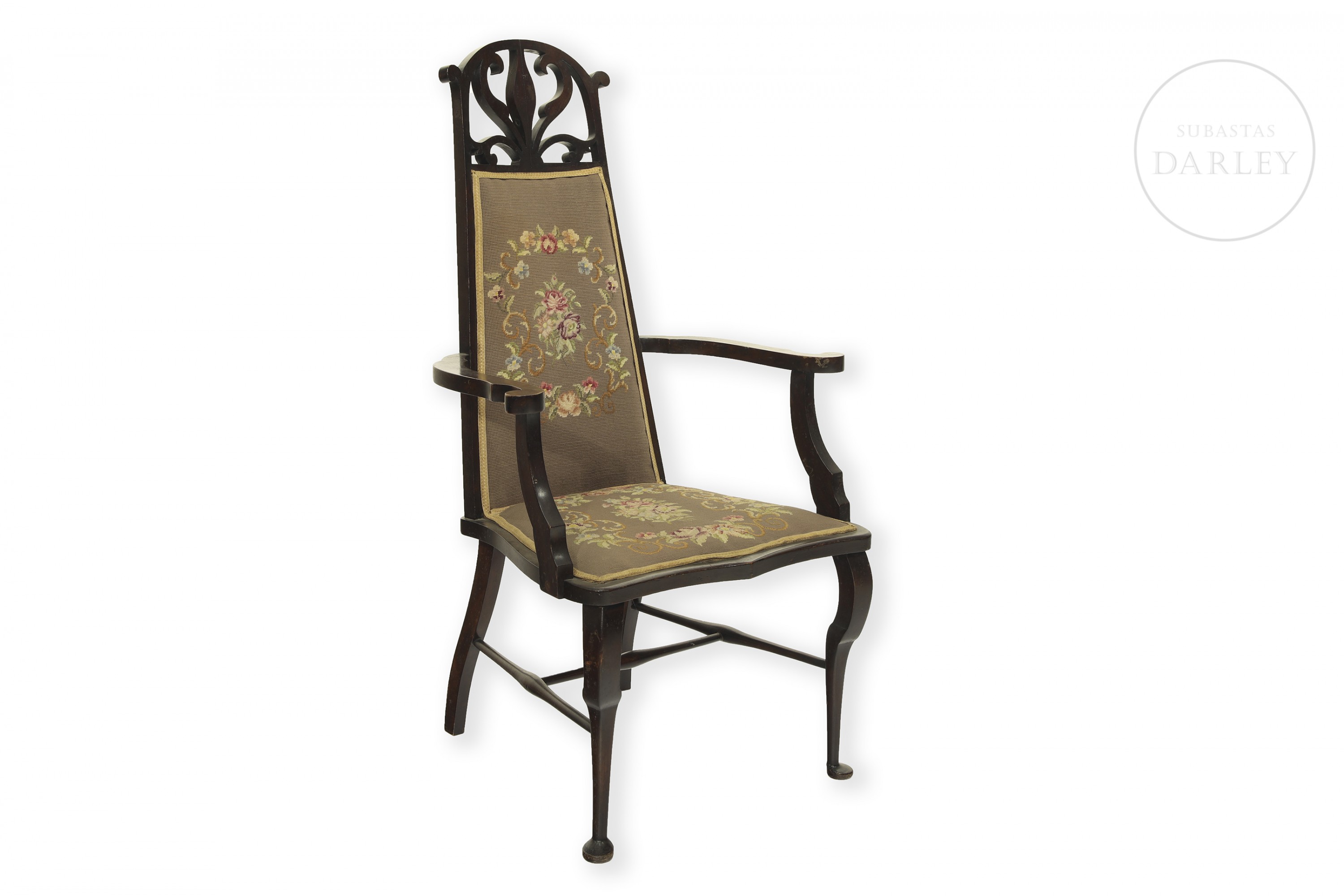 Carved wooden seat, with a long, narrow backrest, finished with a headrest with openwork vegetal motifs. Upholstered with embroidered floral details.