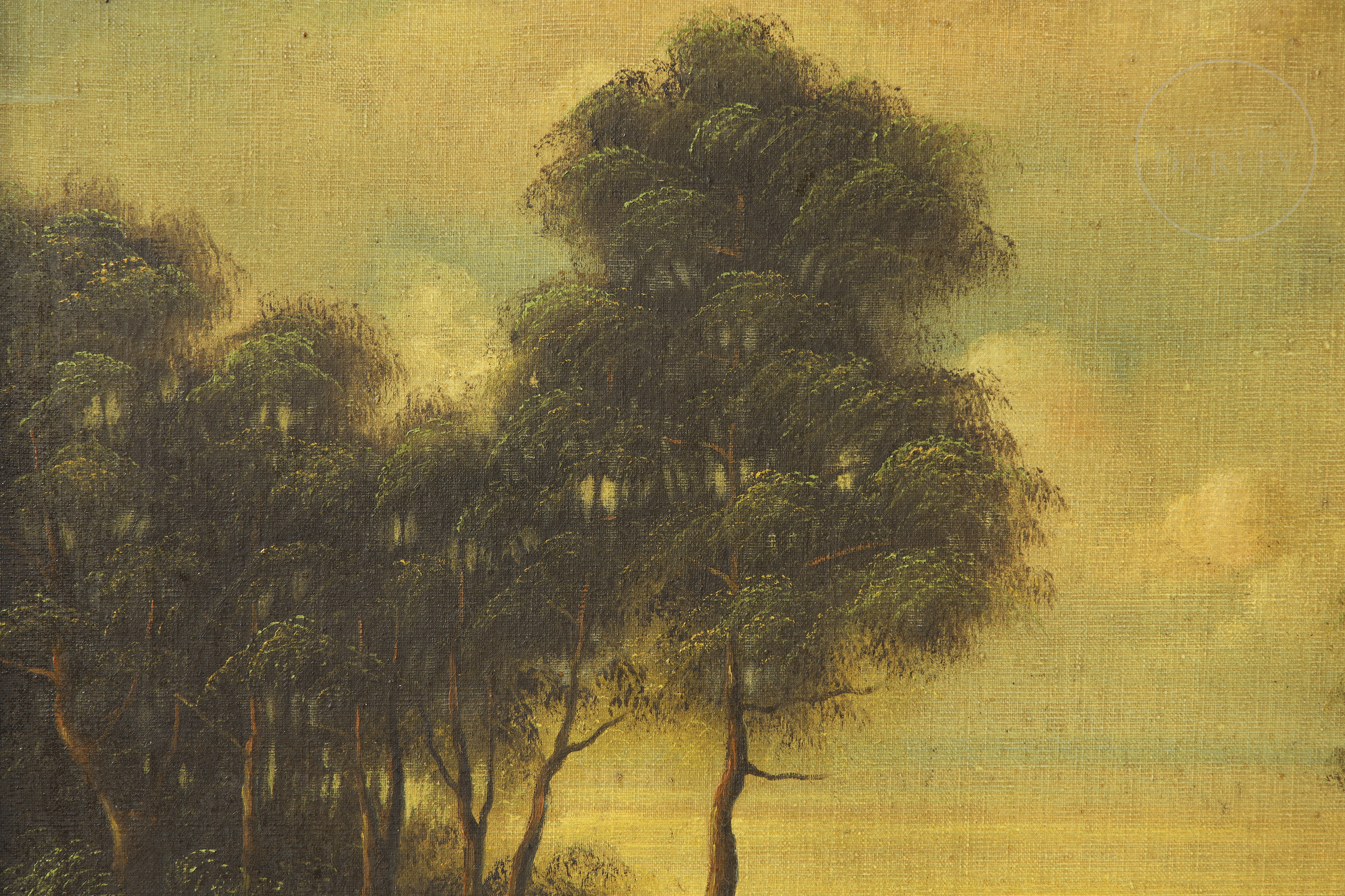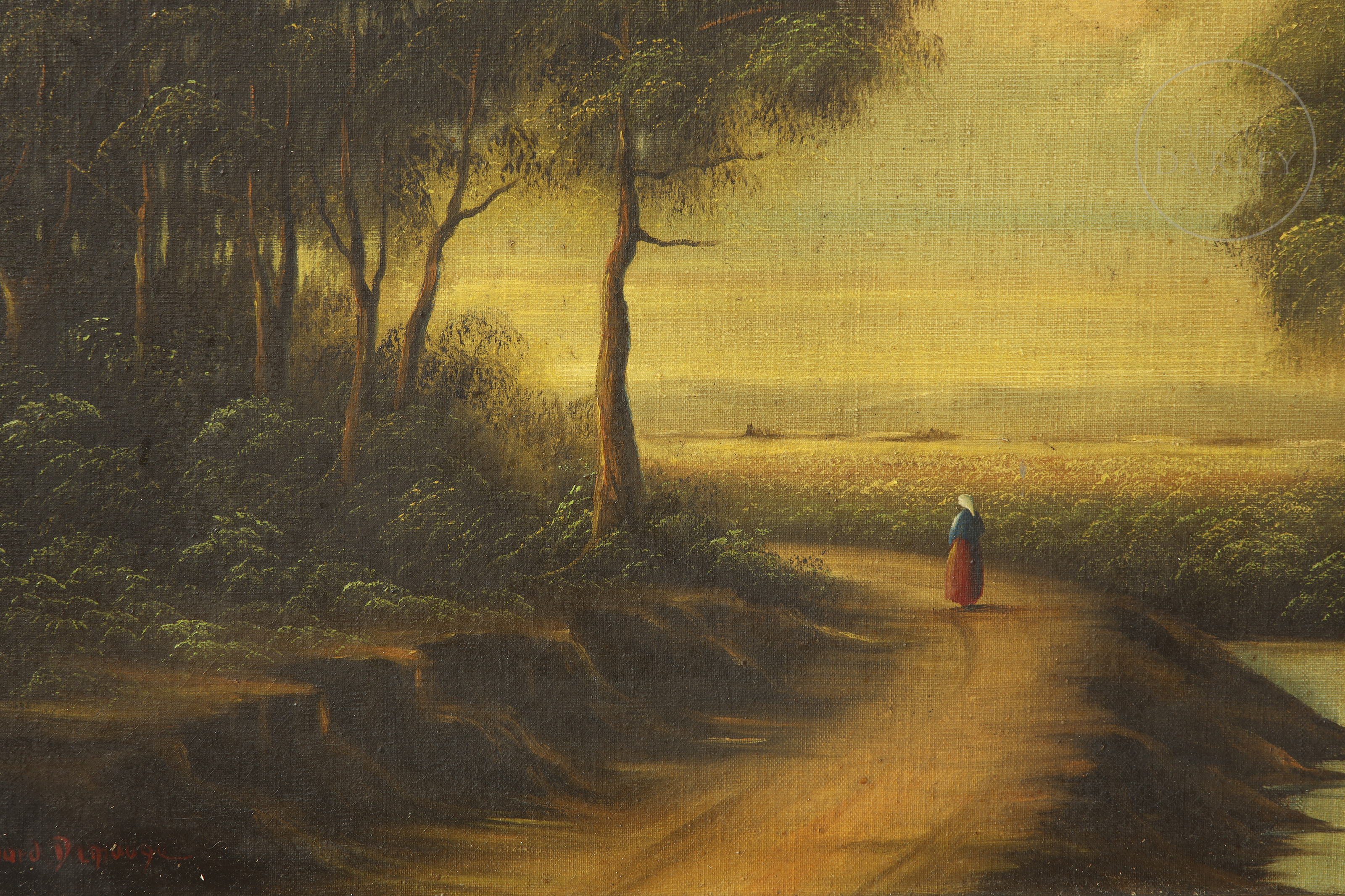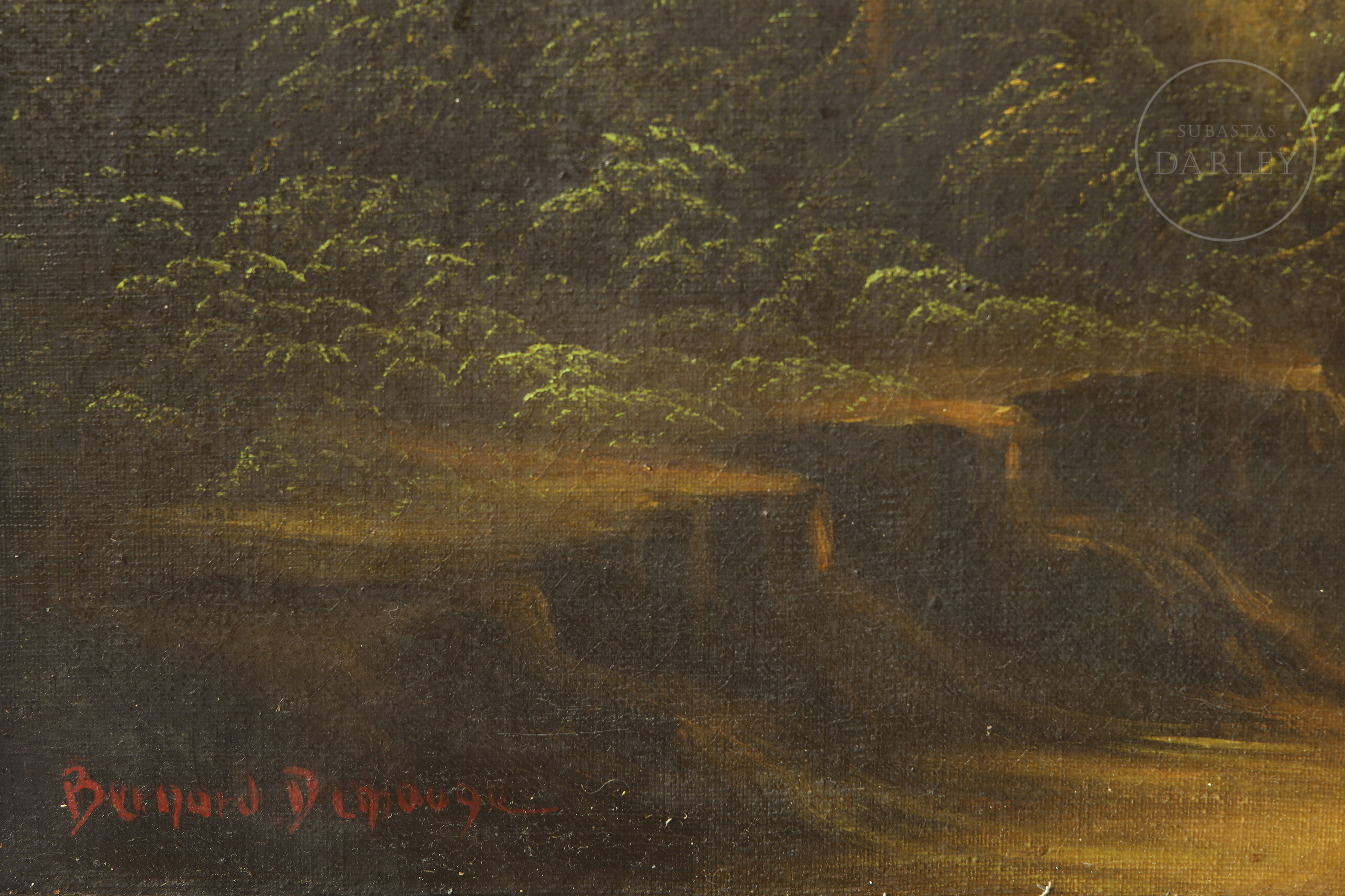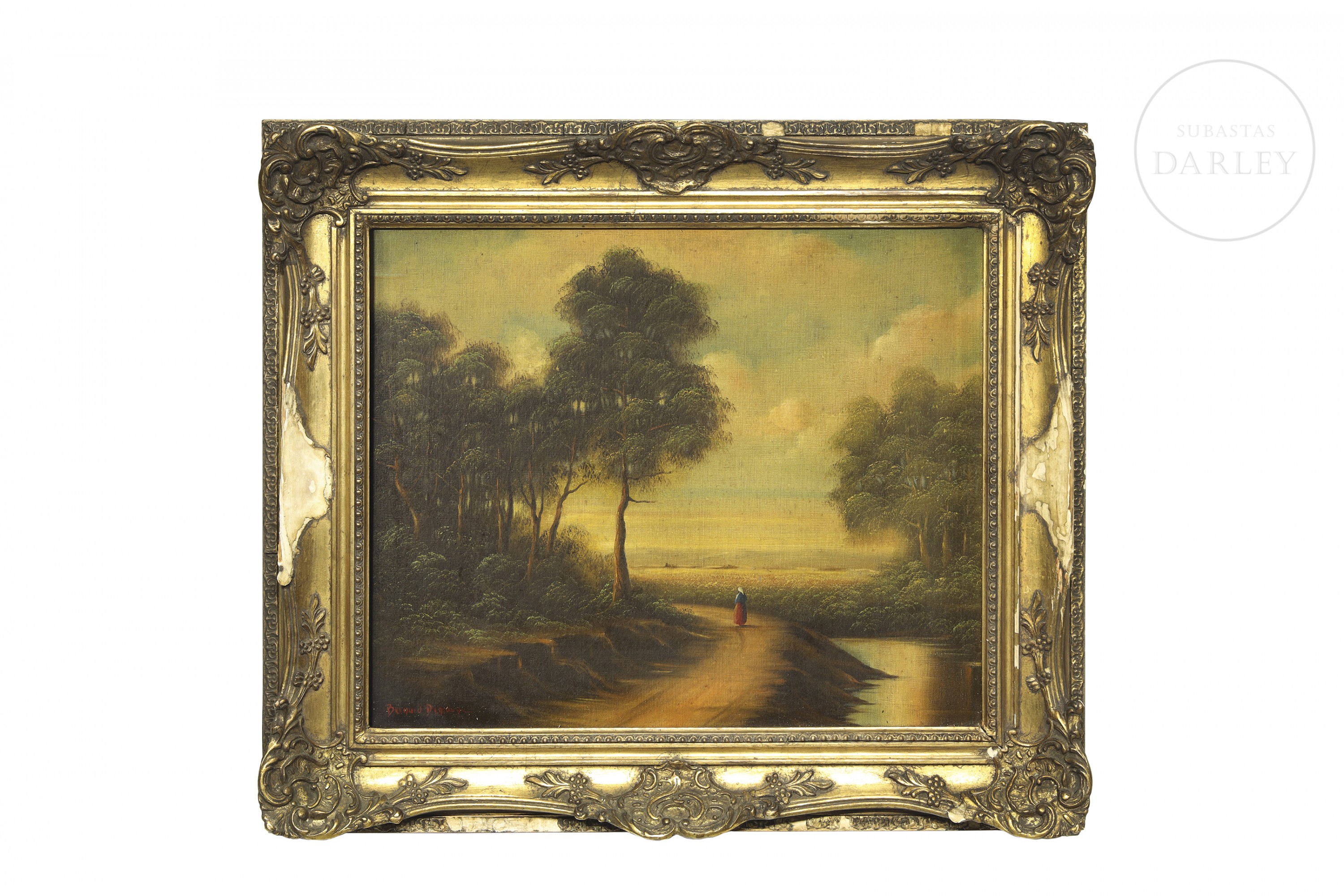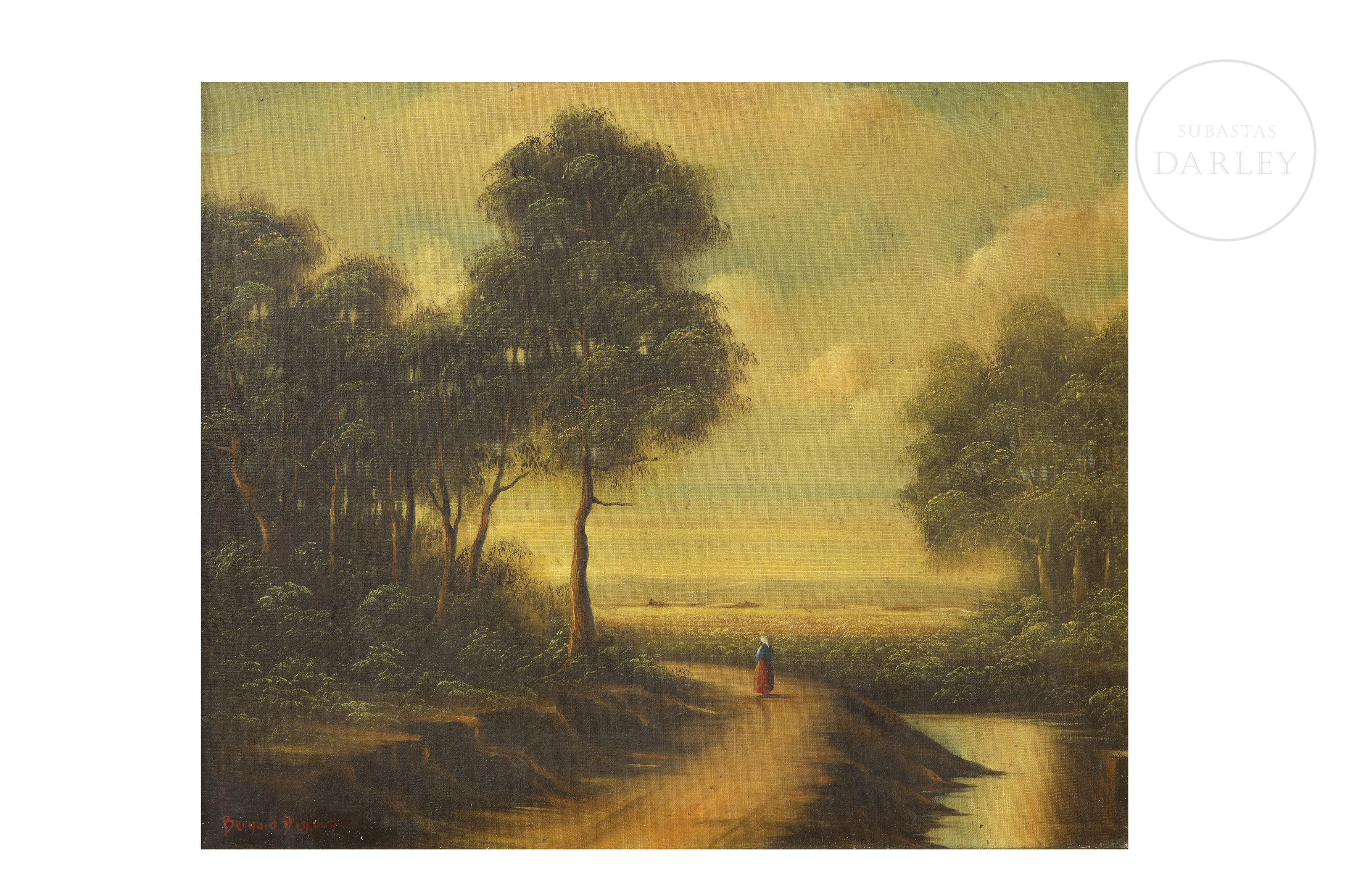 Oil on canvas. Wooded landscape with a solitary figure of a lady walking along a dirt path. Signed ‘Bernard Denauge’ in the lower left corner.