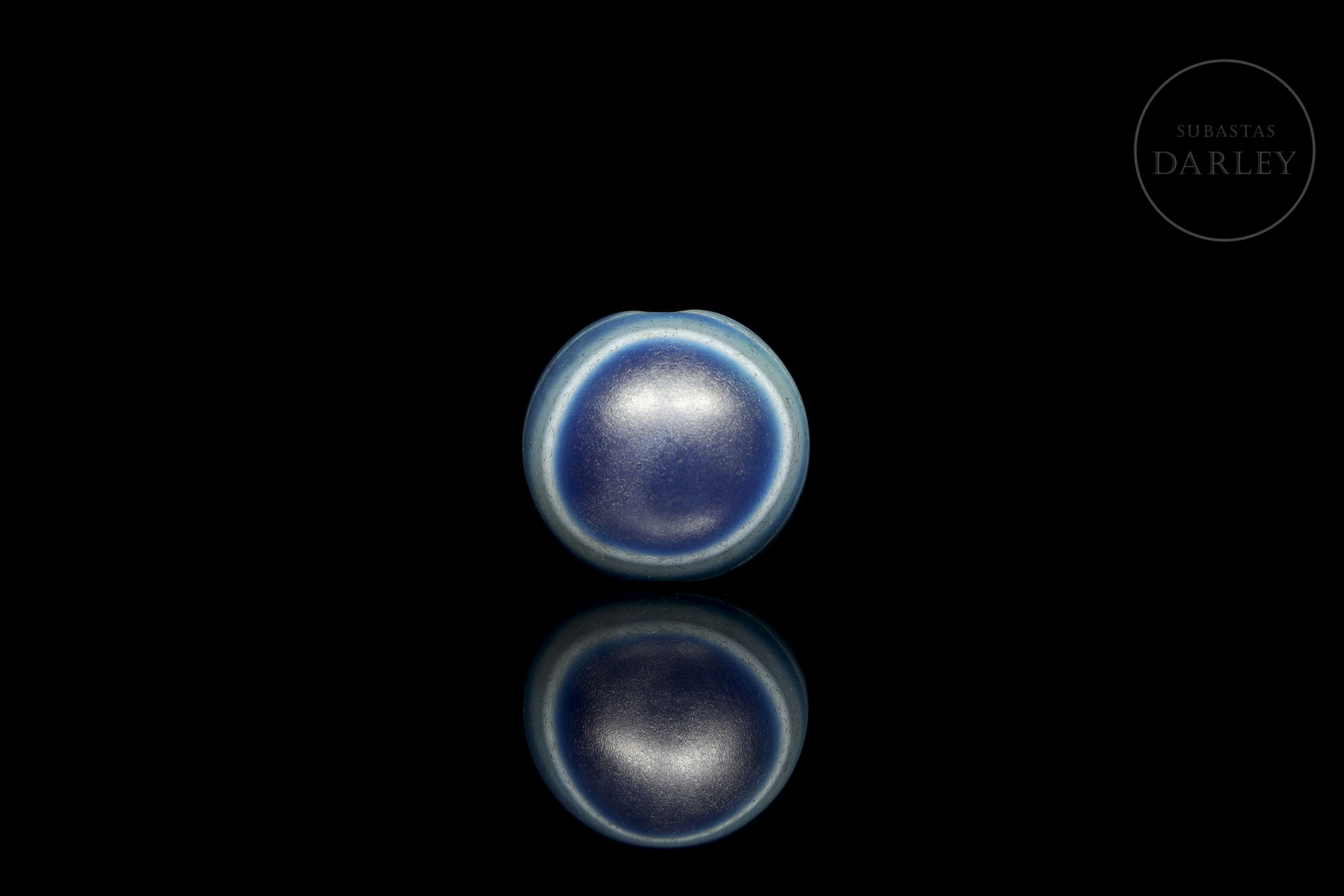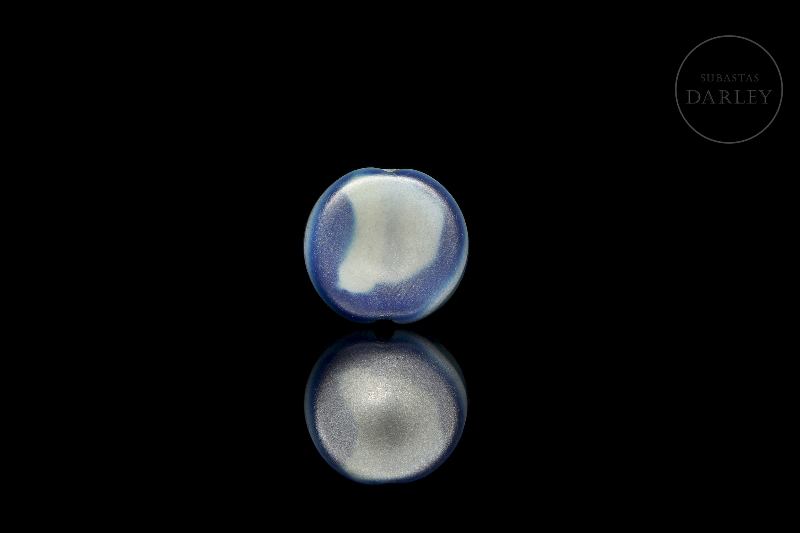 Dzi ‘Ban Zhu’ (板珠) bead, made of agate in an unusual blue-grey hue with concentric milky white bands forming the ritual image of the ‘Eye’. The piece has a convex circular shape with rounded edges and a transverse perforation. The natural stratification of the agate has been used to create an effect of depth. Liao dynasty (916–1125) or later.