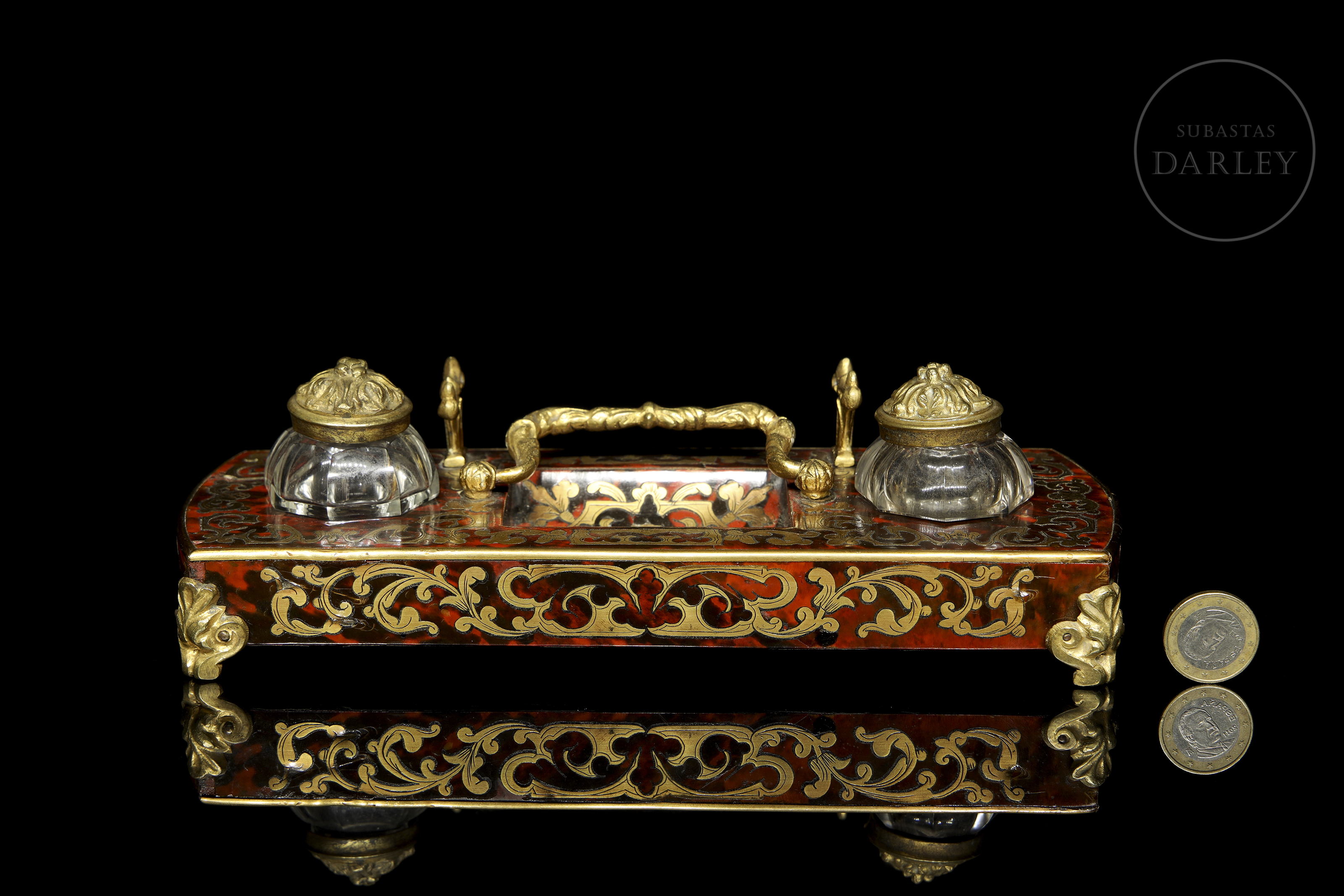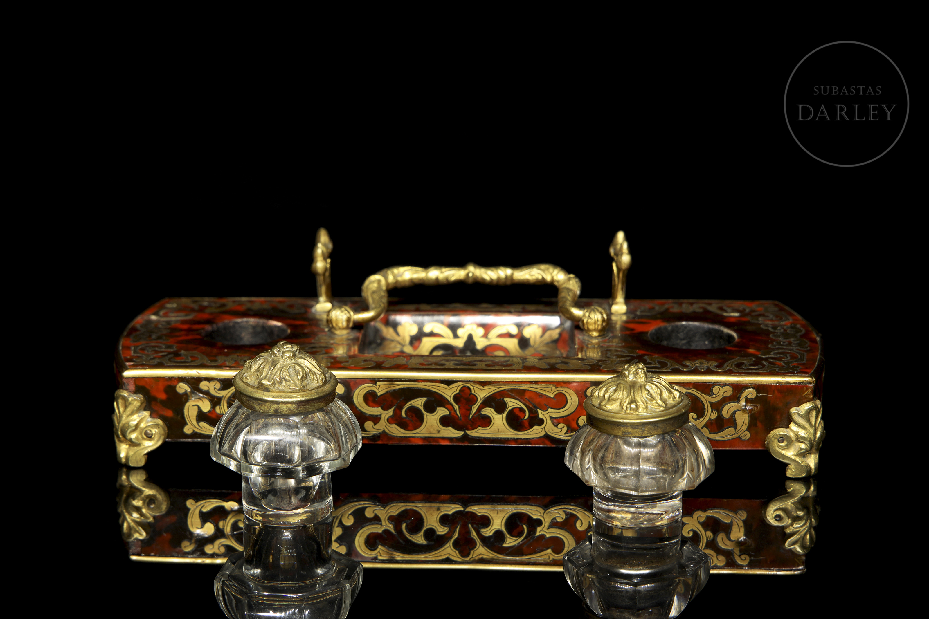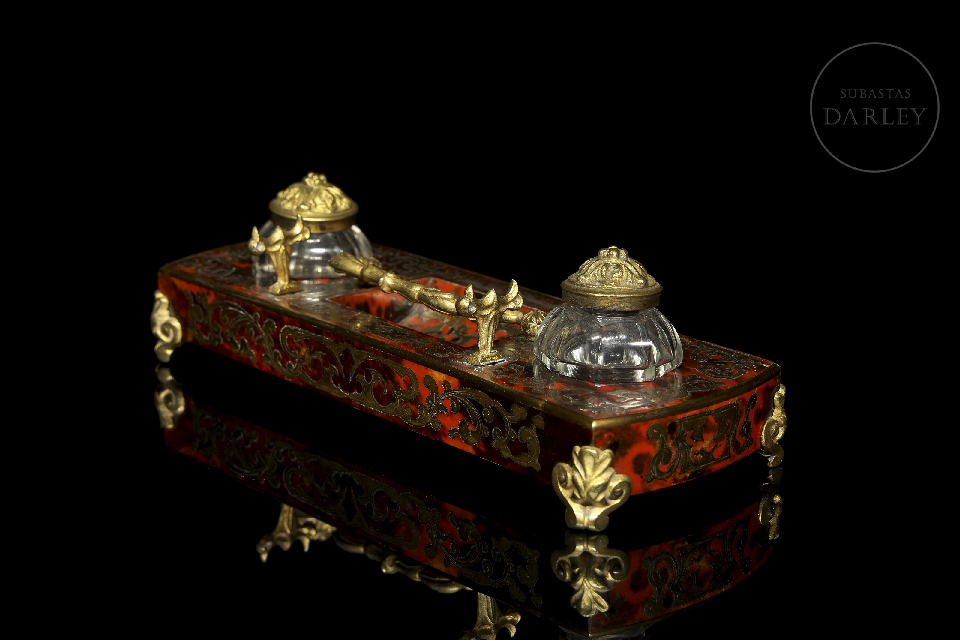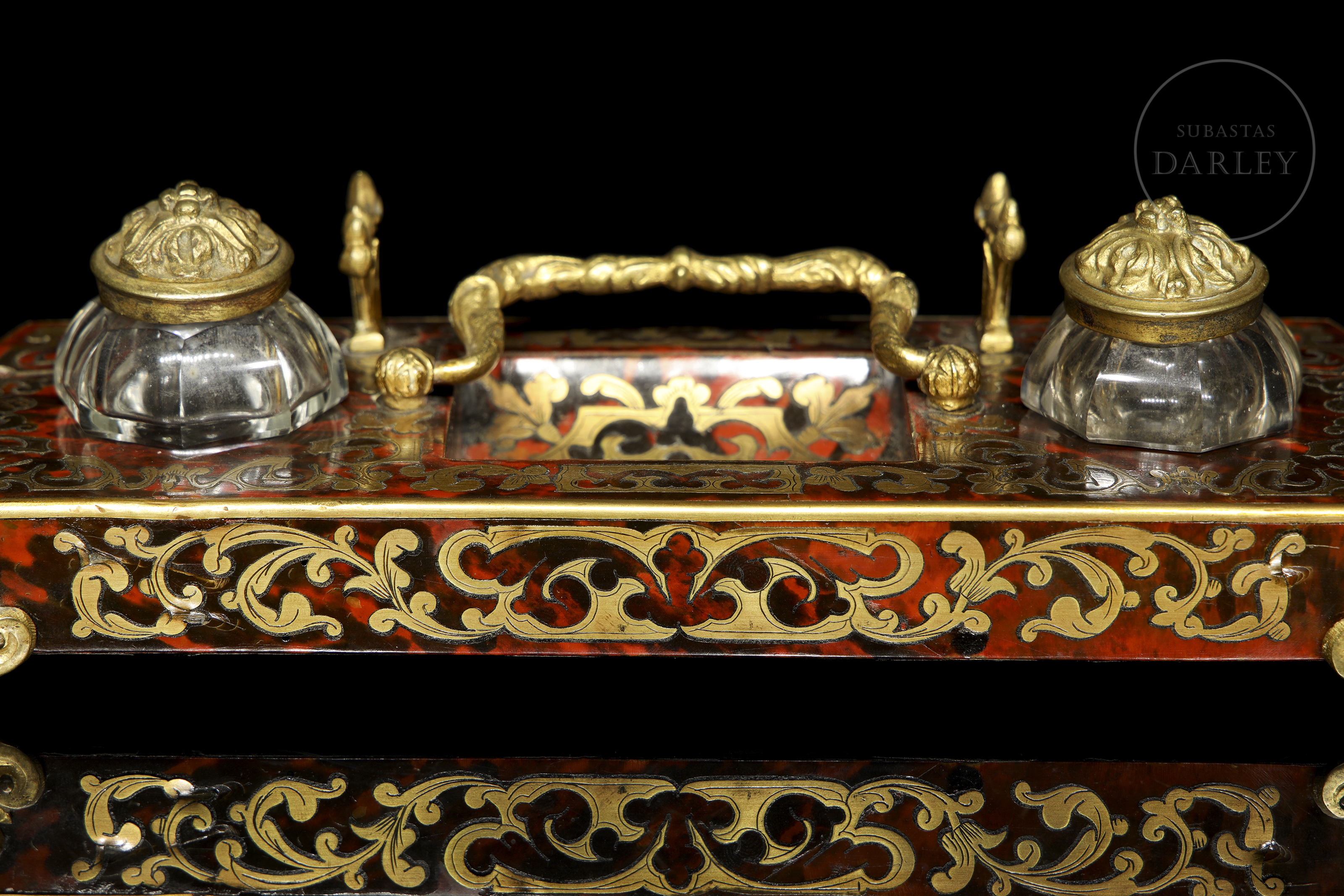 Rectangular tortoiseshell inkwell in Boulle marquetry decorated with scrolls of foliage and lambrequins of gem-set metal leaf. It has a gilt-bronze handle in the centre and four gilt-bronze legs. It has a nib holder on the back. In good condition, with slight wear due to age.