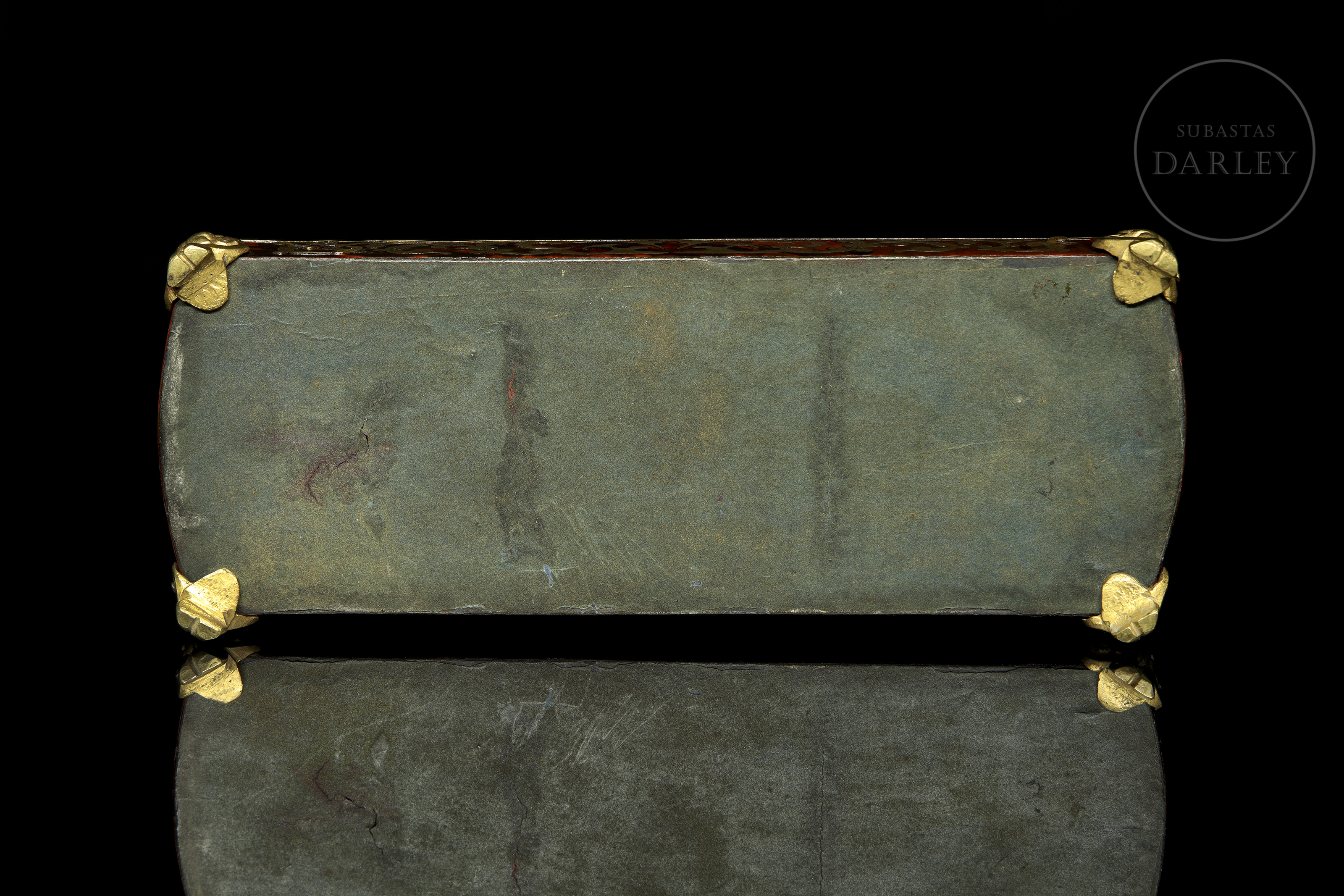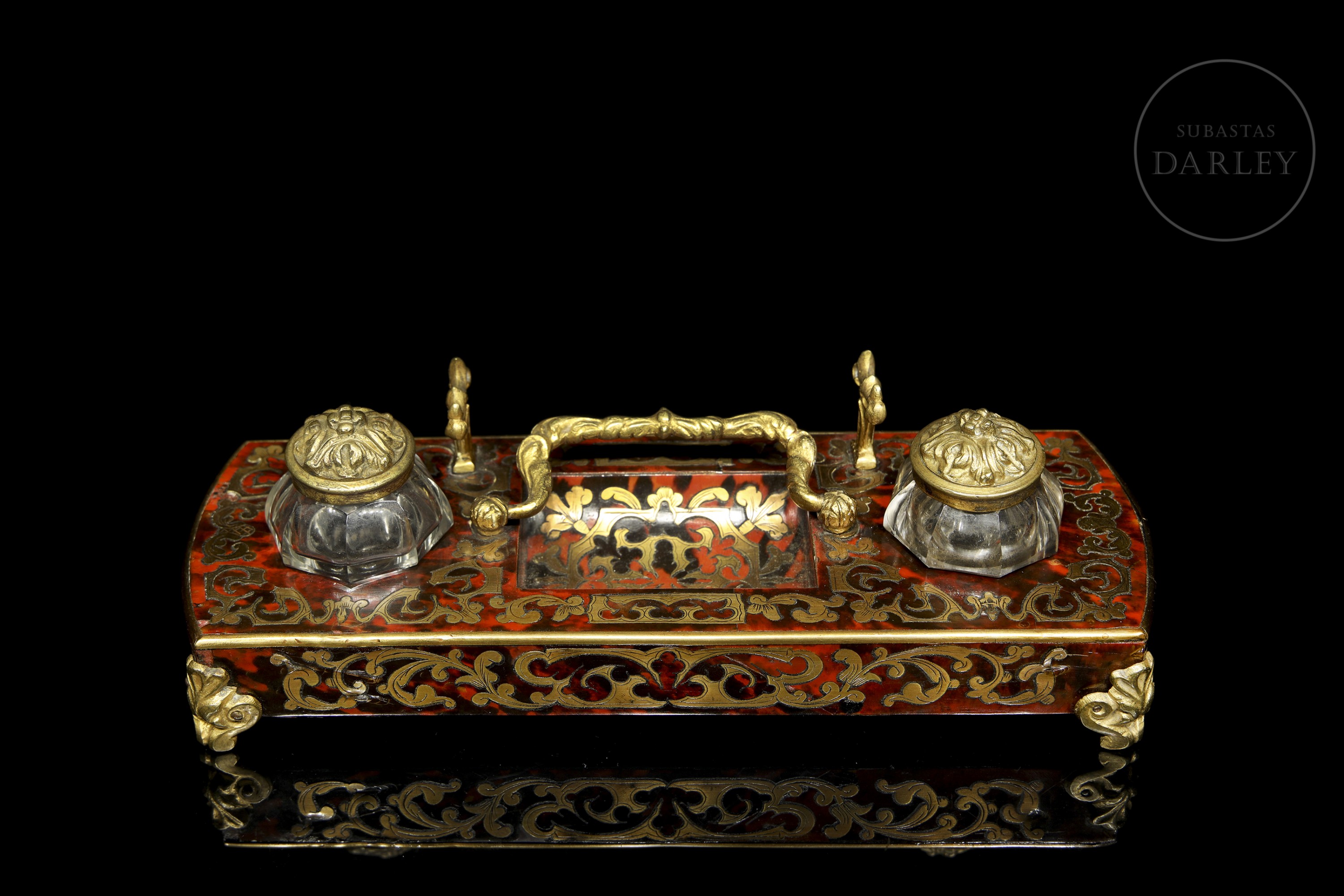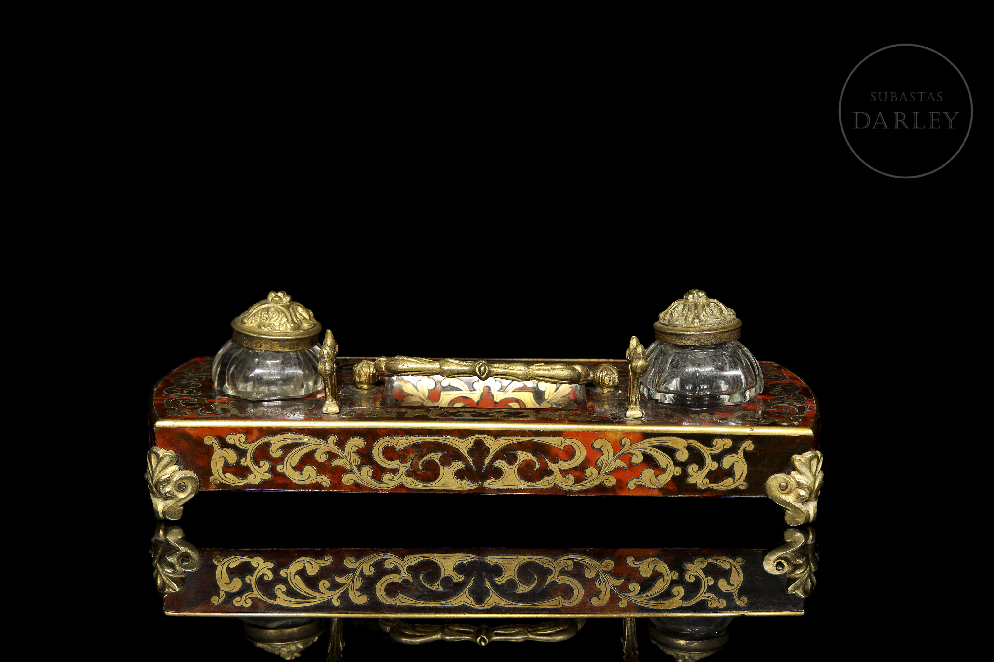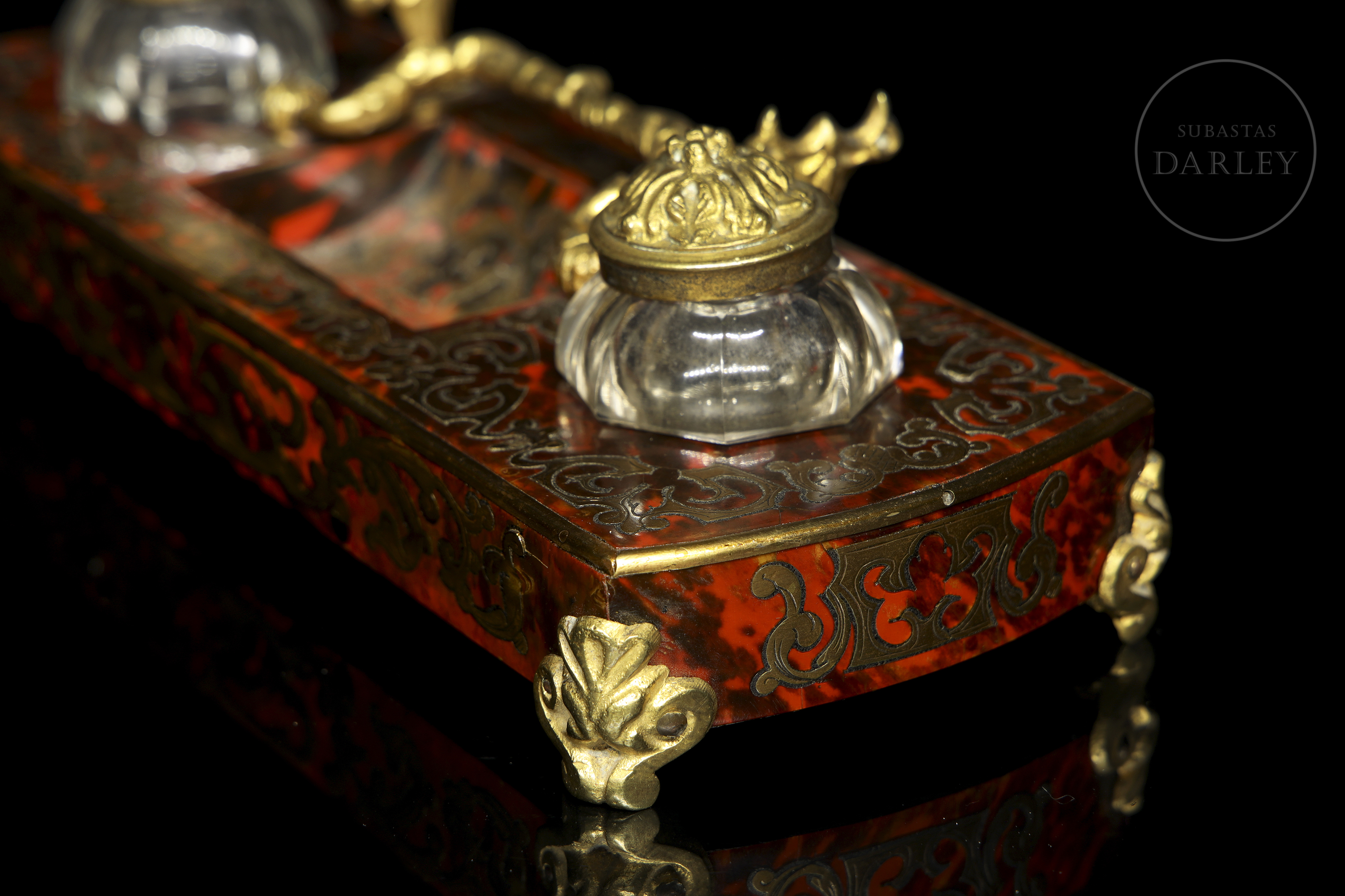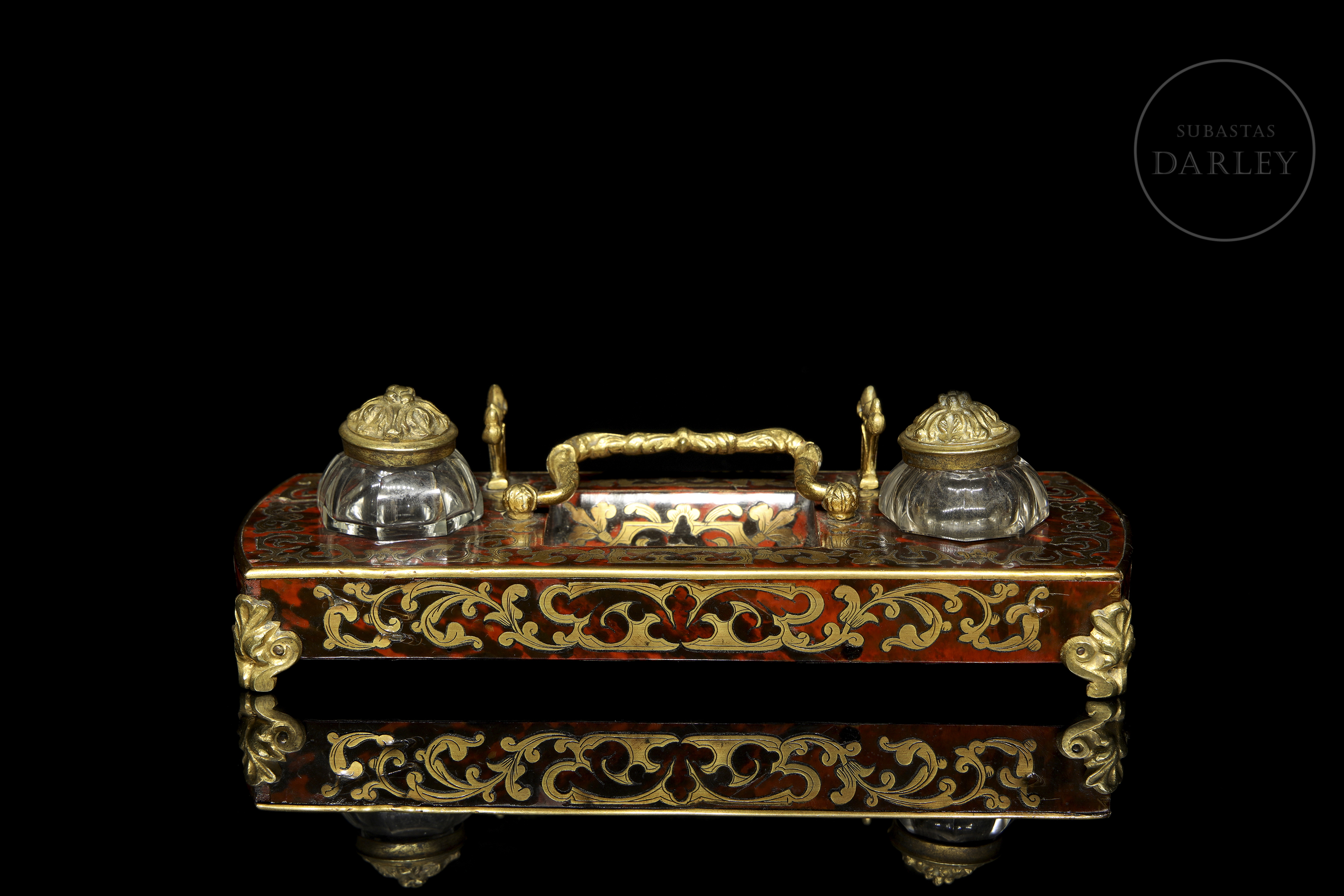 Rectangular tortoiseshell inkwell in Boulle marquetry decorated with scrolls of foliage and lambrequins of gem-set metal leaf. It has a gilt-bronze handle in the centre and four gilt-bronze legs. It has a nib holder on the back. In good condition, with slight wear due to age.