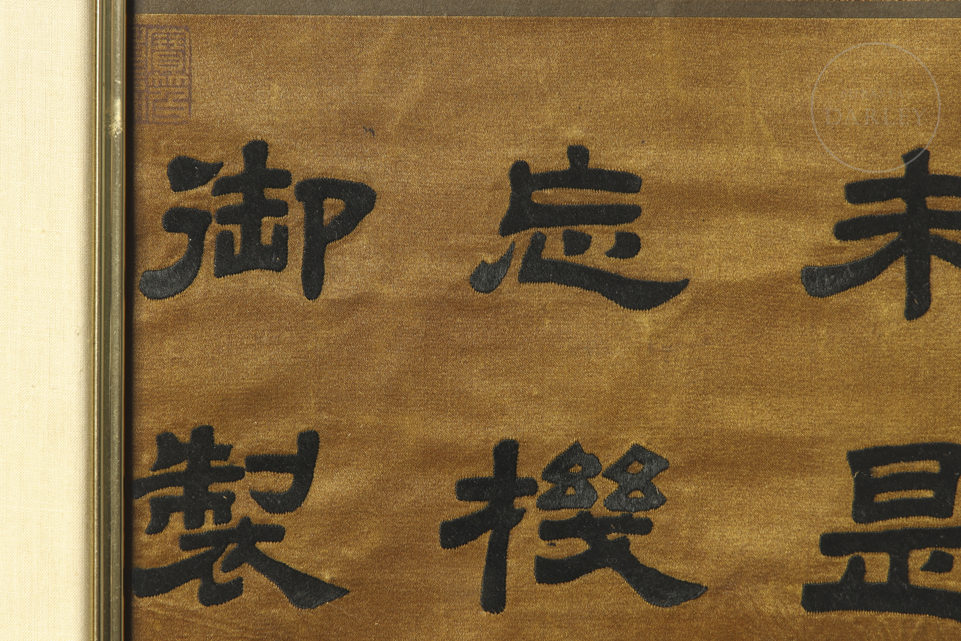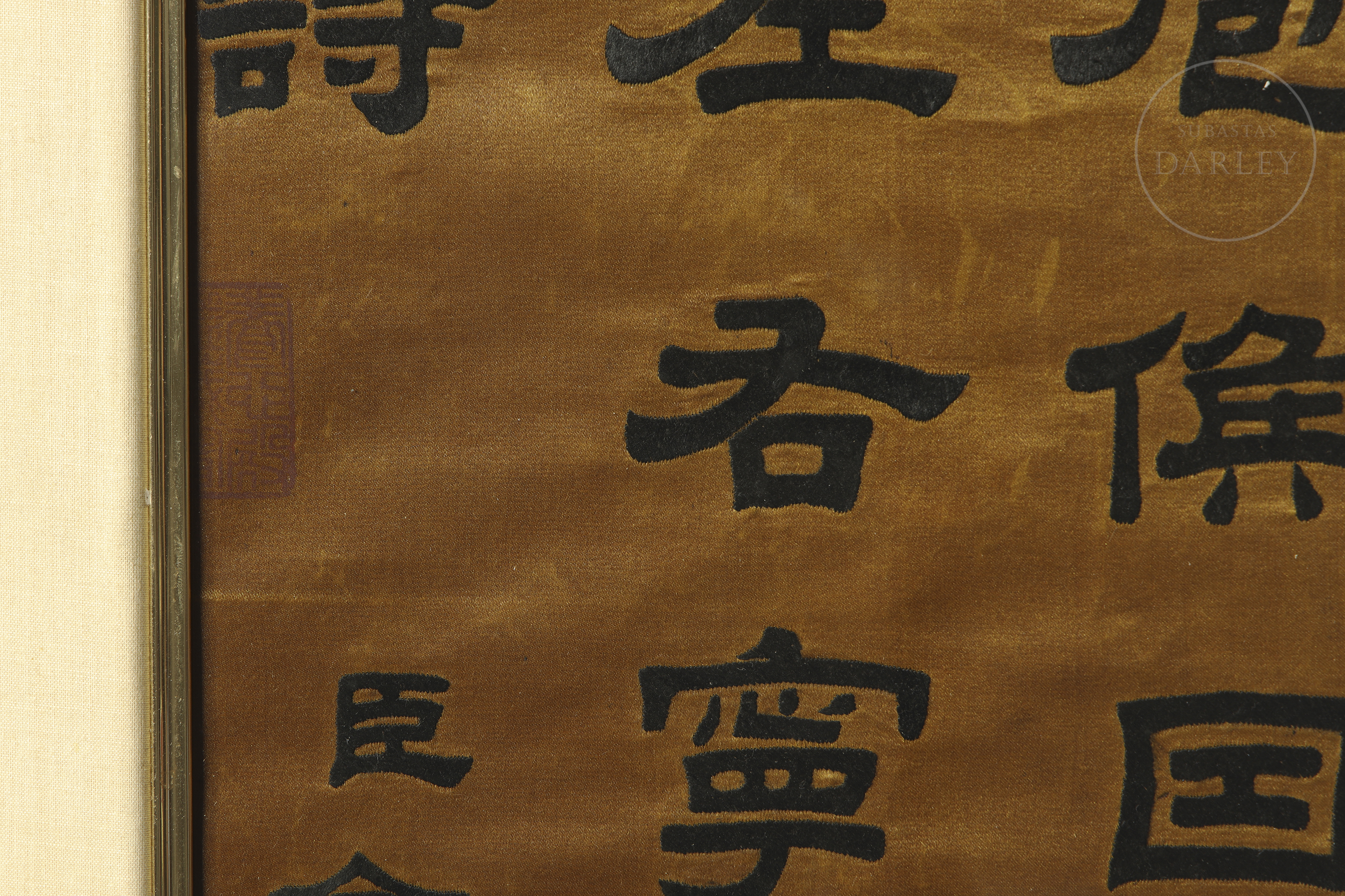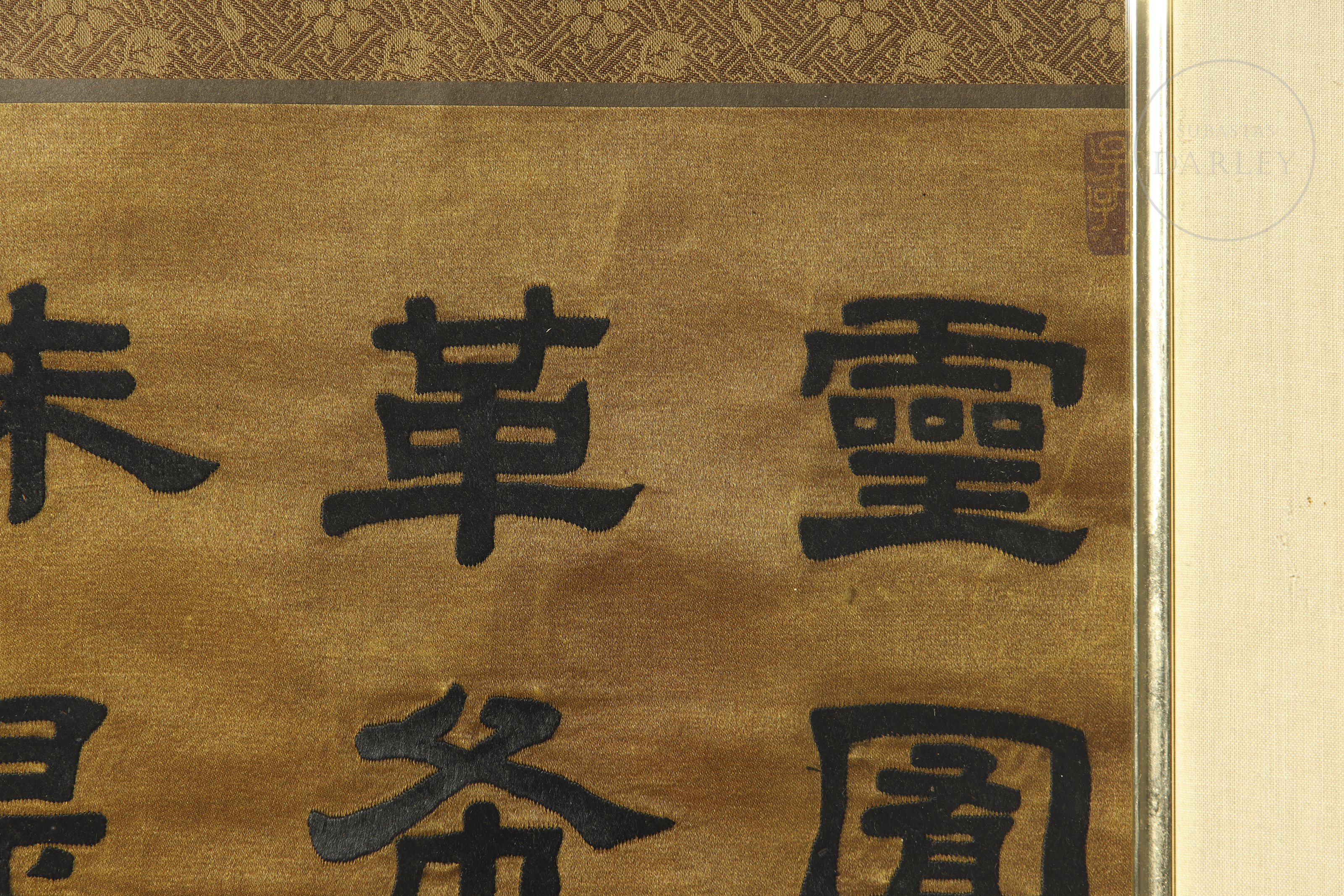 Calligraphy and embroidered seals on ochre-toned silk with brocade frame.
